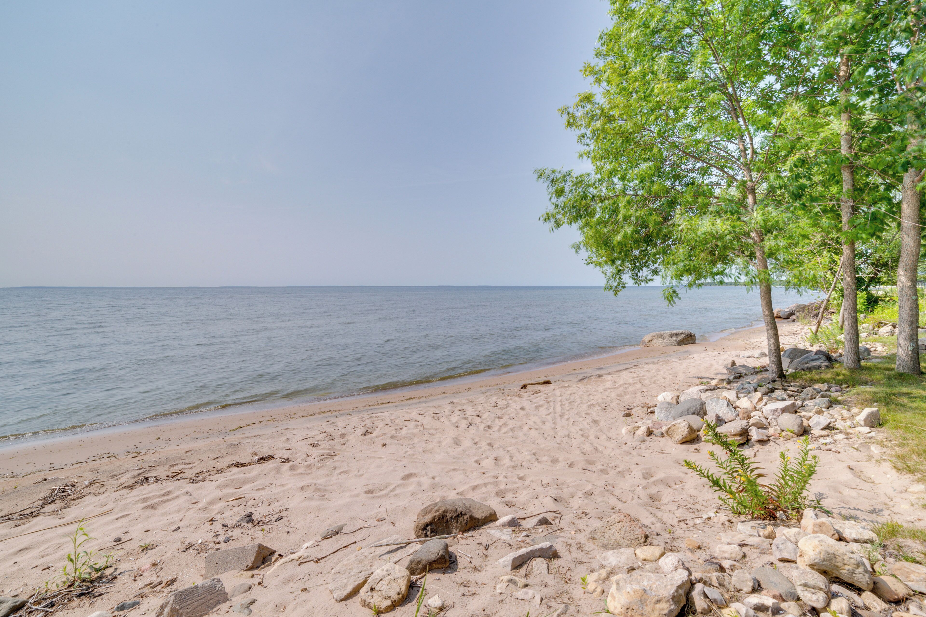 Waterfront Lake Michigan Retreat w/ Beach! Spectacular sunrises over Lake Michigan await you at this 3-bedroom, 1-bathroom cabin. This Stephenson, MI, vacation rental offers a classic lake cabin feel with its exposed ceiling beams, cedar plank walls, and a beach just steps away from the deck. You’ll find gorgeous lake views from the living room windows and the sound of the water lapping at the sho...