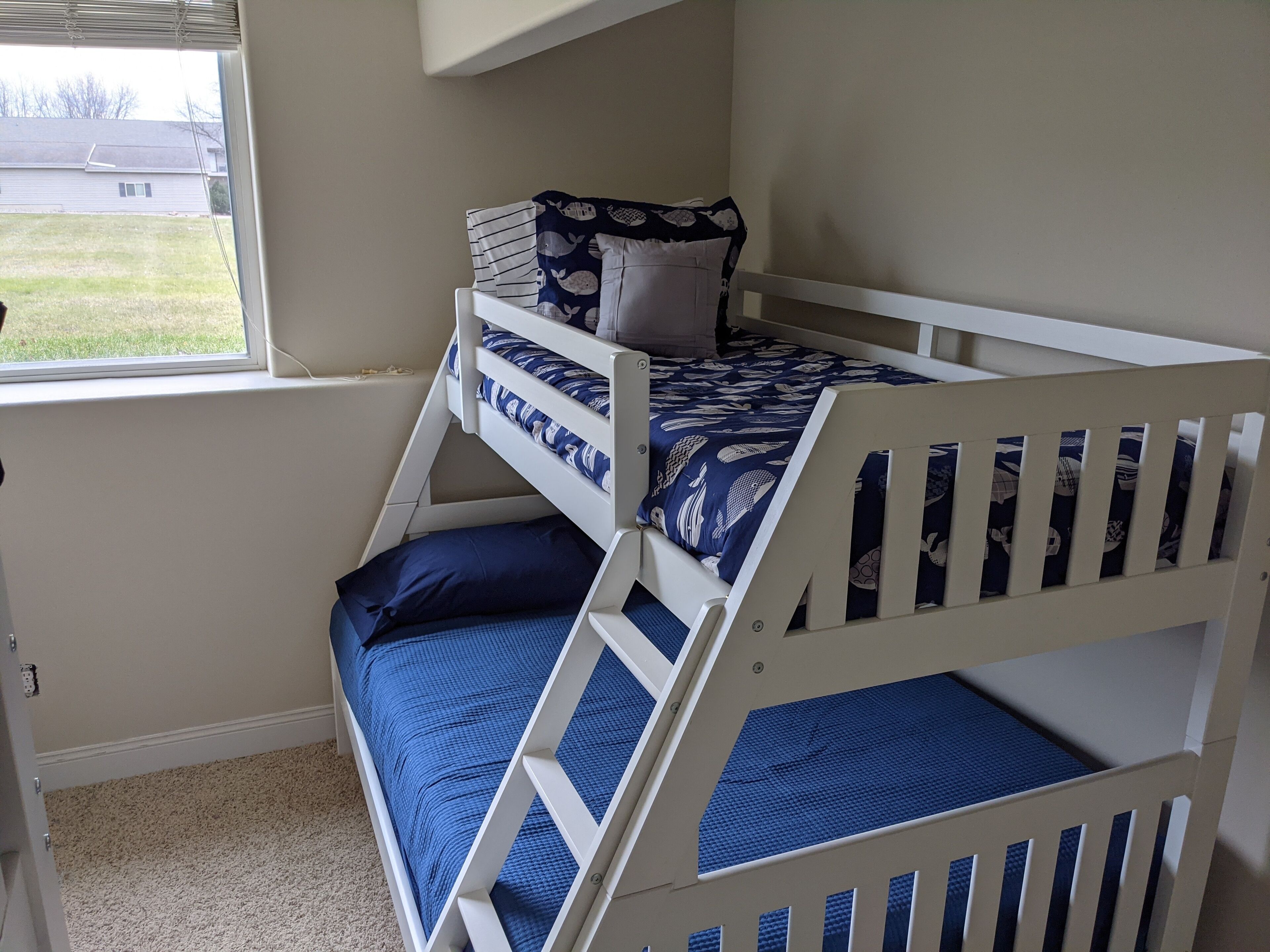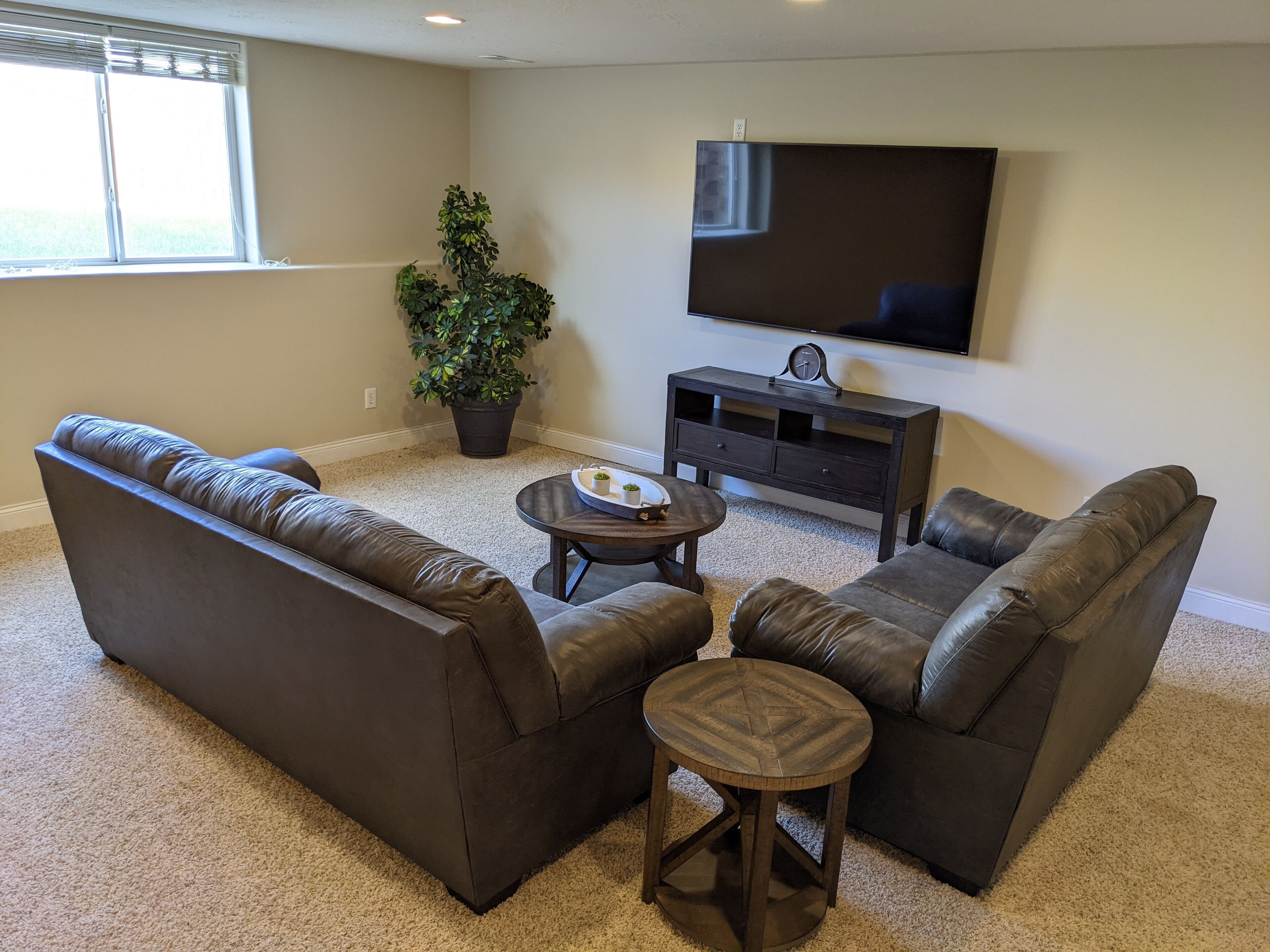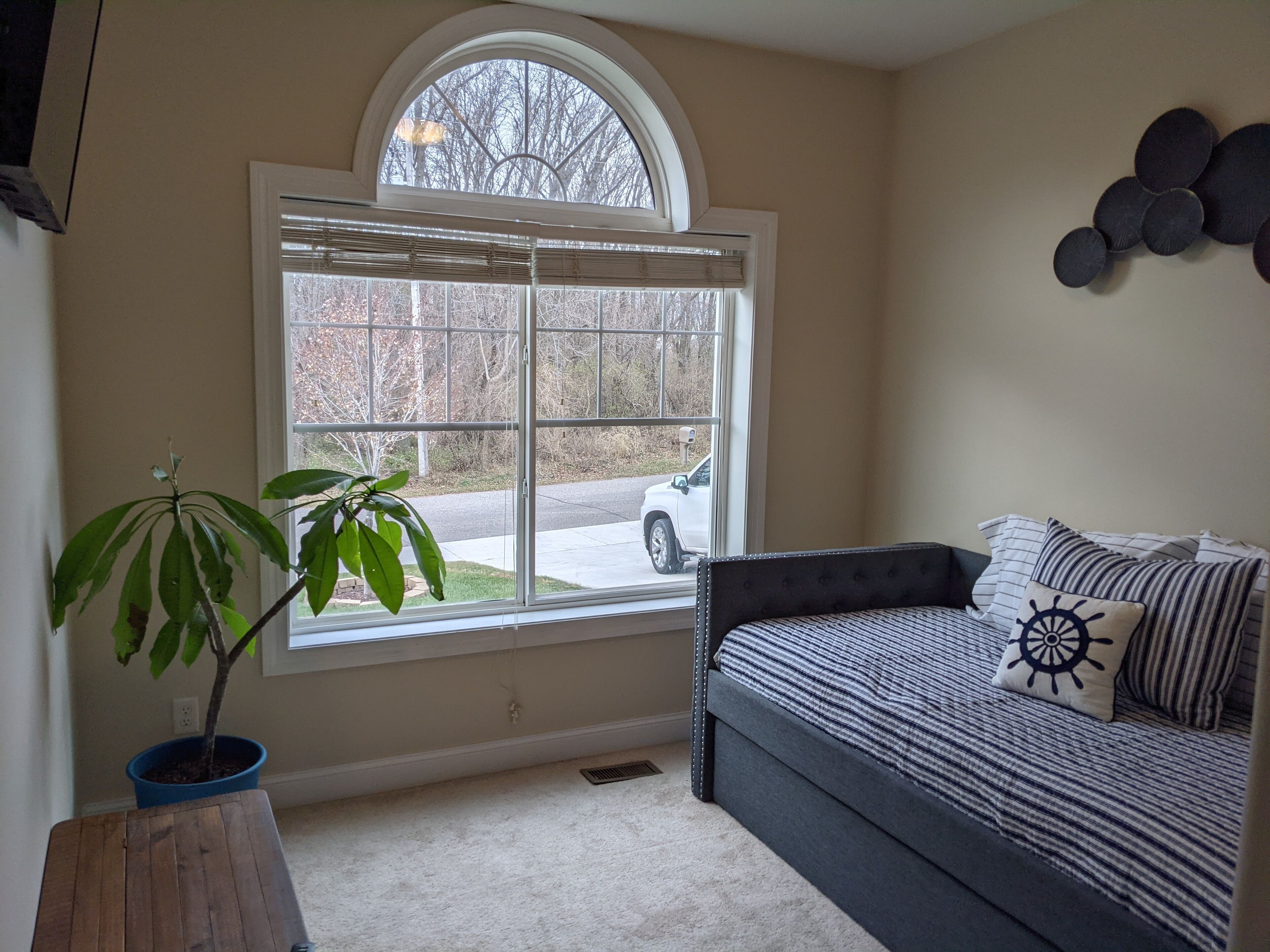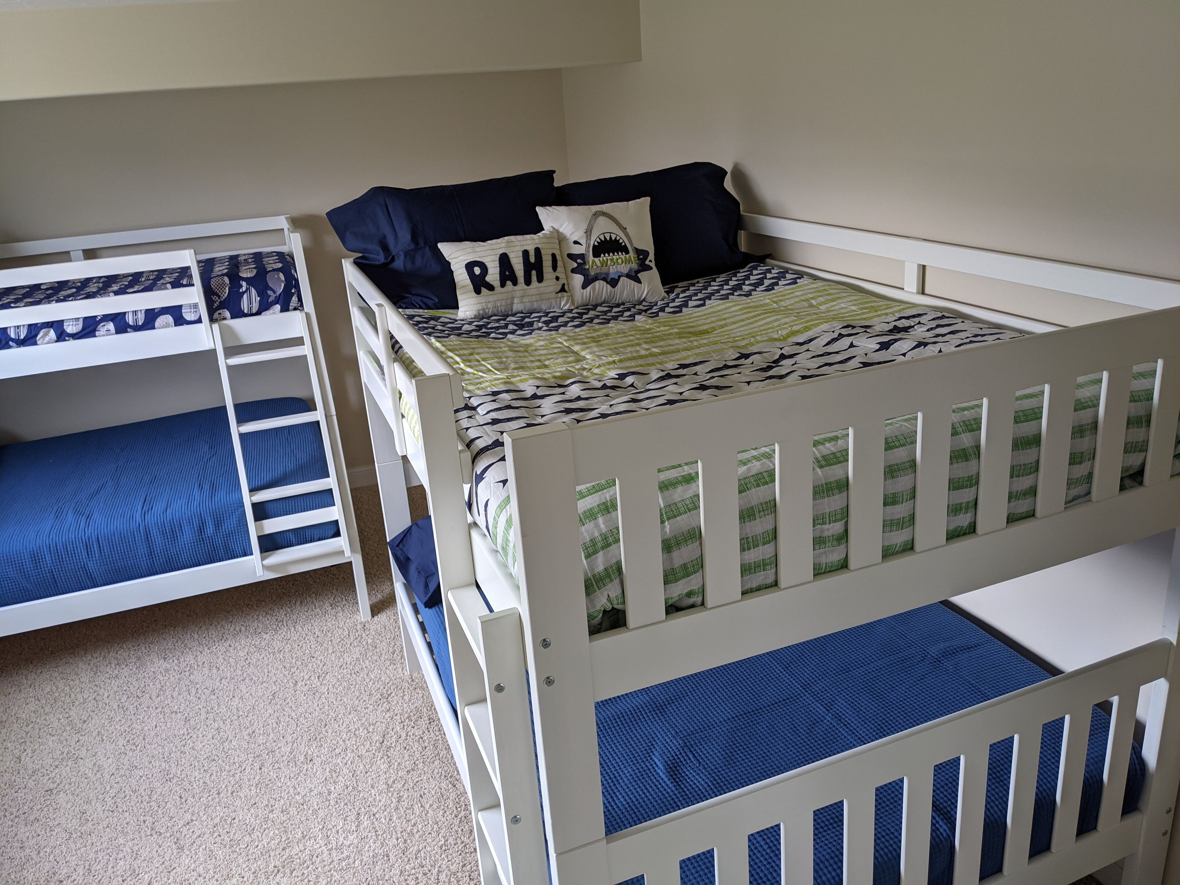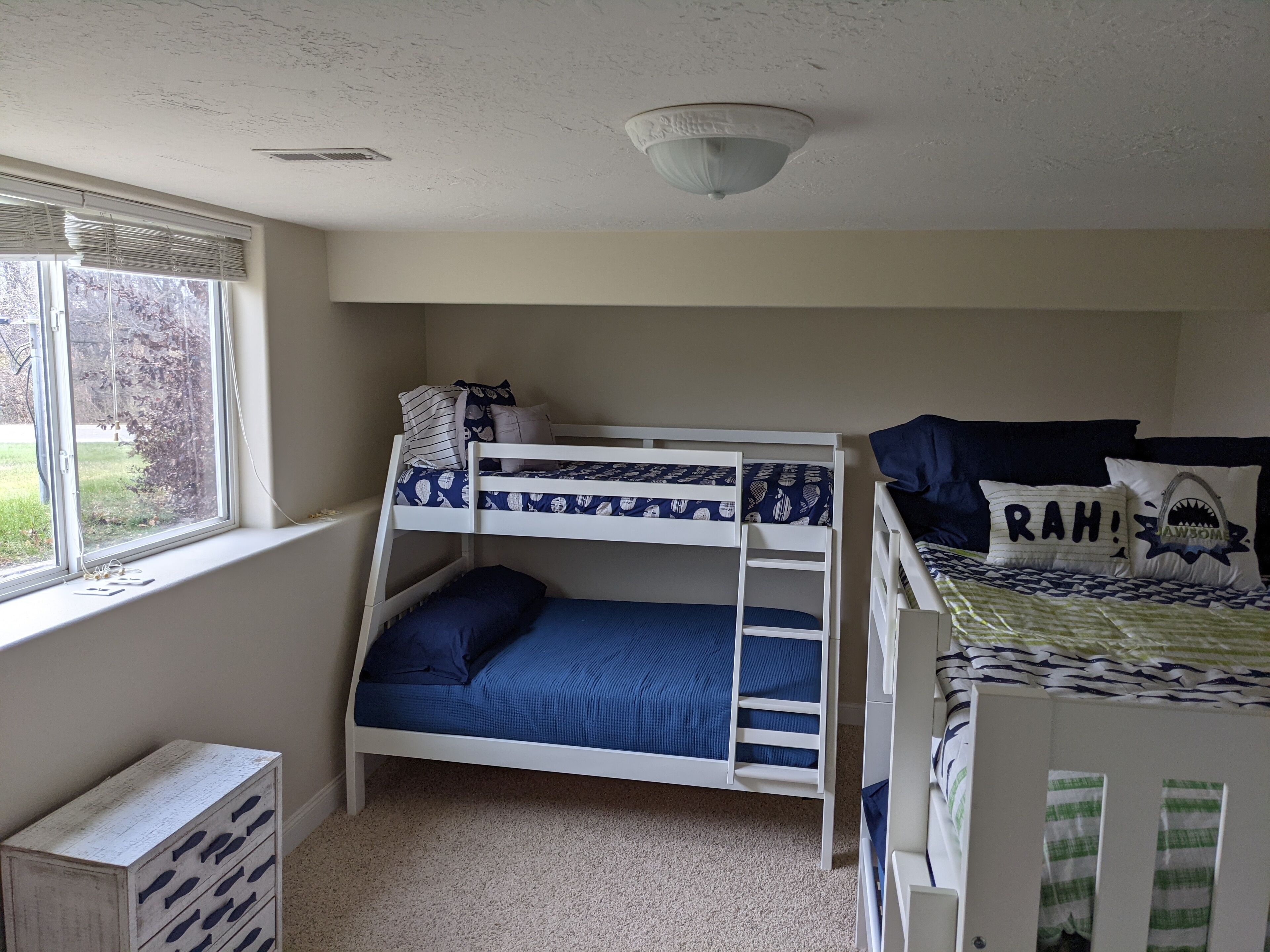 Large Family Home Large family home situated along the entrance to Emerson Bay State Park. Completely re-furnished (2005 built) home with new flooring, all new furniture, beds and décor. Lightning fast wireless internet with brand new 75" Roku T.V.s upstairs and down. Flat screen T.V.'s in the bedrooms as well. Fenced in backyard for guest privacy with two charcoal grills. For your safety and ours, there is a Google Nest Video Doorbell and is the only camera on the premises. Master bedroom (king bed) includes master bath with double sinks and jacuzzi tub with walk-in closet and private bathroom with shower. Second upper level bedroom has a queen bed with huge closet and dresser with nightstand. Third upper level bedroom has a day bed with trundle and also a closet. Lower level features another bedroom with King bed and large closet. Fifth bedroom in lower level features two bunk beds with three full beds and one twin. Both upper and lower level family rooms include couch and loveseat along with coffee & end tables. Large kitchen island and nice dining table allow for entertainment as well as a dedicated office perfect for catching up with work back home or even for kids to play board games. Located in a newer development with many new homes being built.Located on the west side of West Lake Okoboji, this property includes direct access to the Iowa Great Lakes Bike trail as it runs along the property frontage. No need to drive to a trailhead, just hop on your bike and you are on your way!Lake access - State Park is one block down the street via bike/walking trail. Take your doggie on a beautiful nature walk into the state park, send the kiddos down to the beach, bring your boat to launch for a day on the water. Ice Fishing? This the perfect location for access to the highly sought after Emerson Bay Bluegill action!