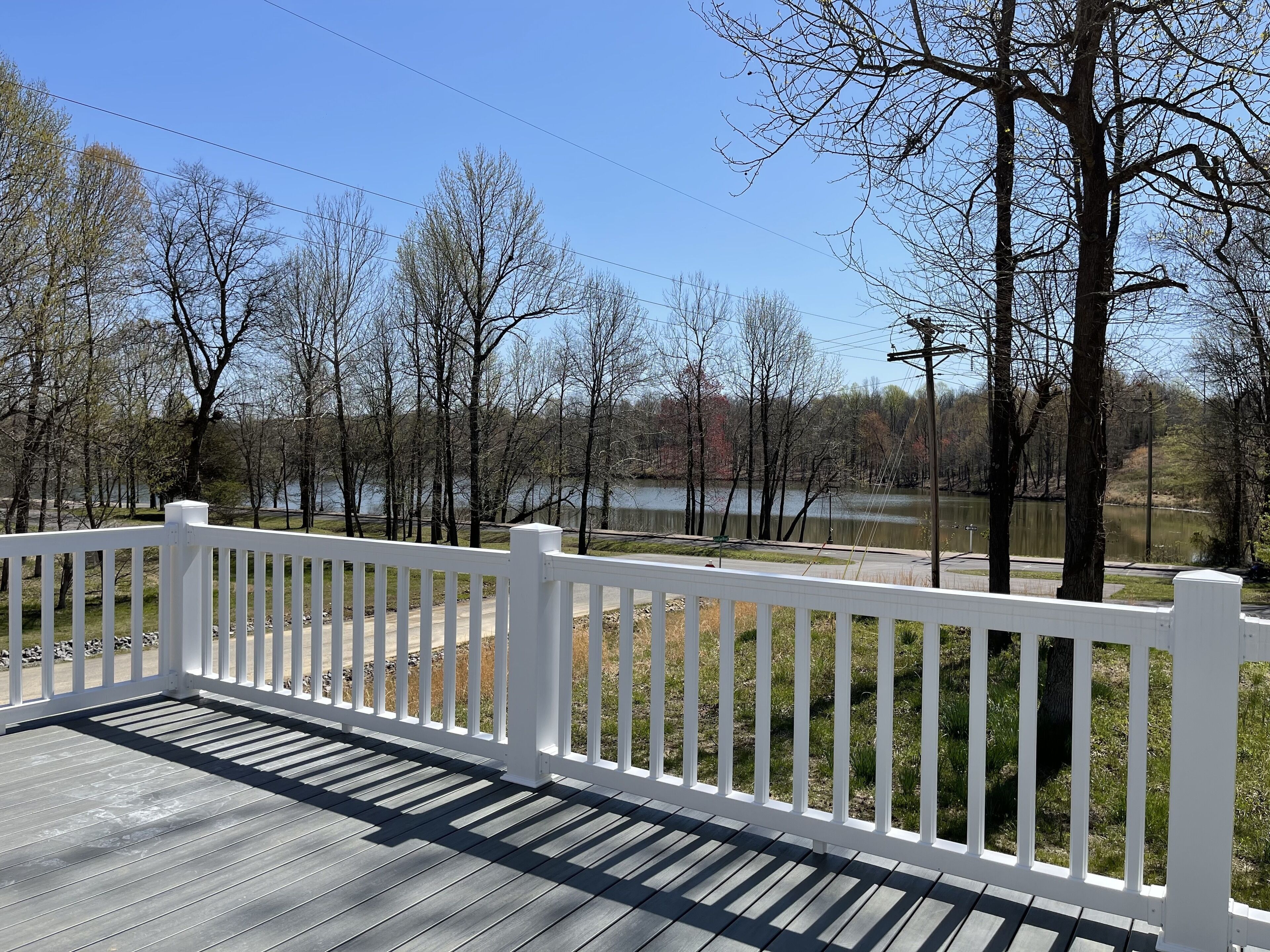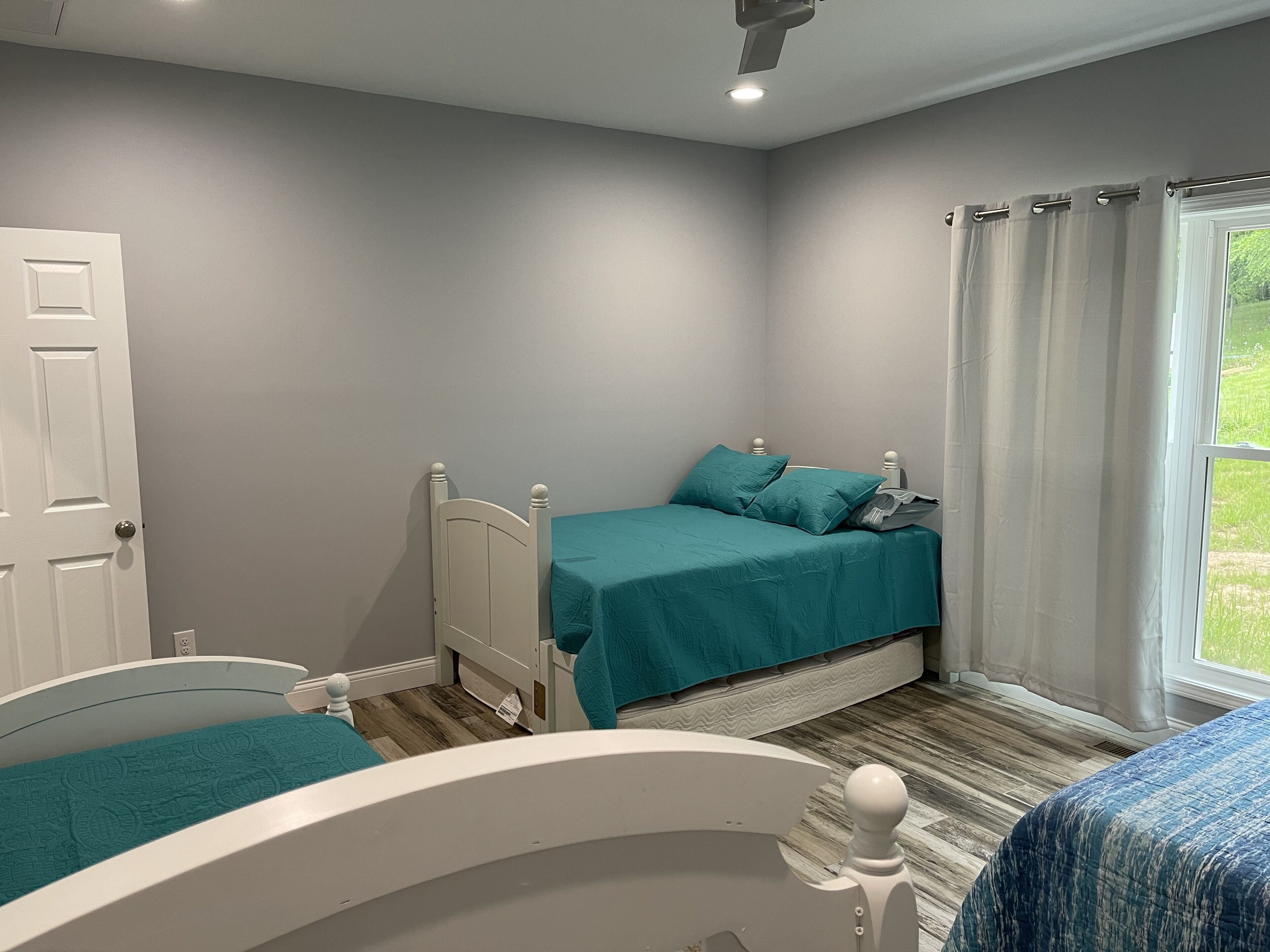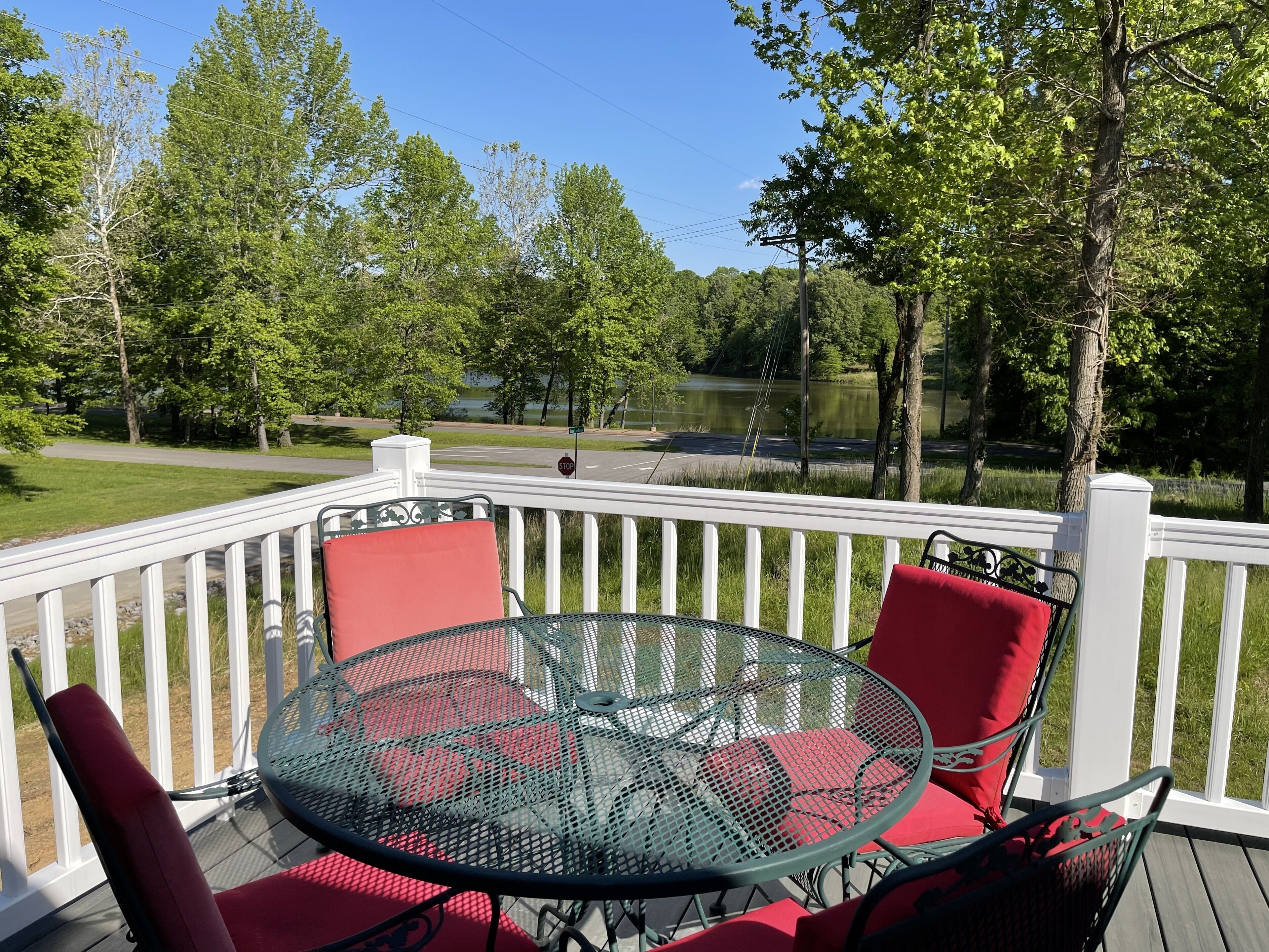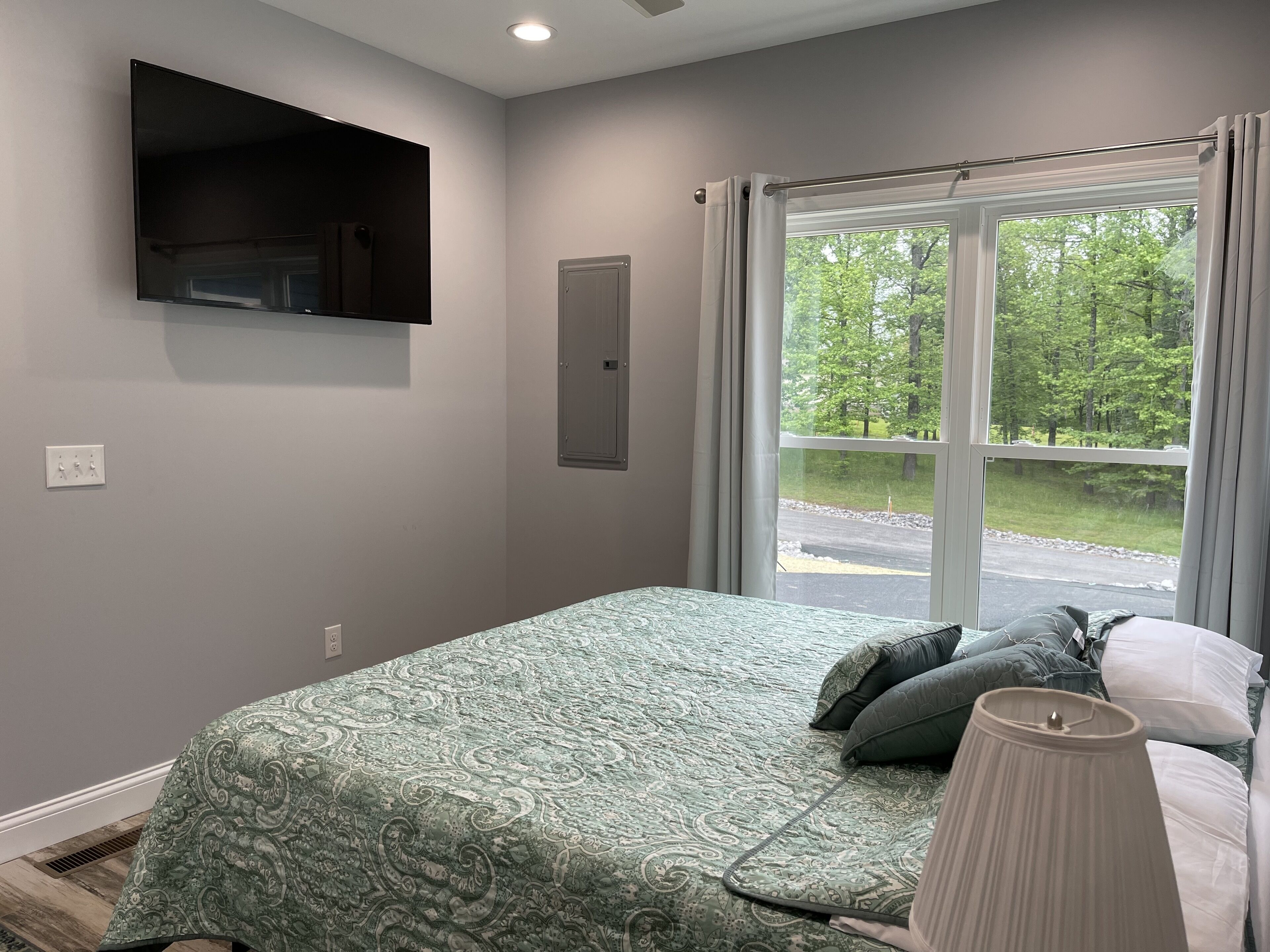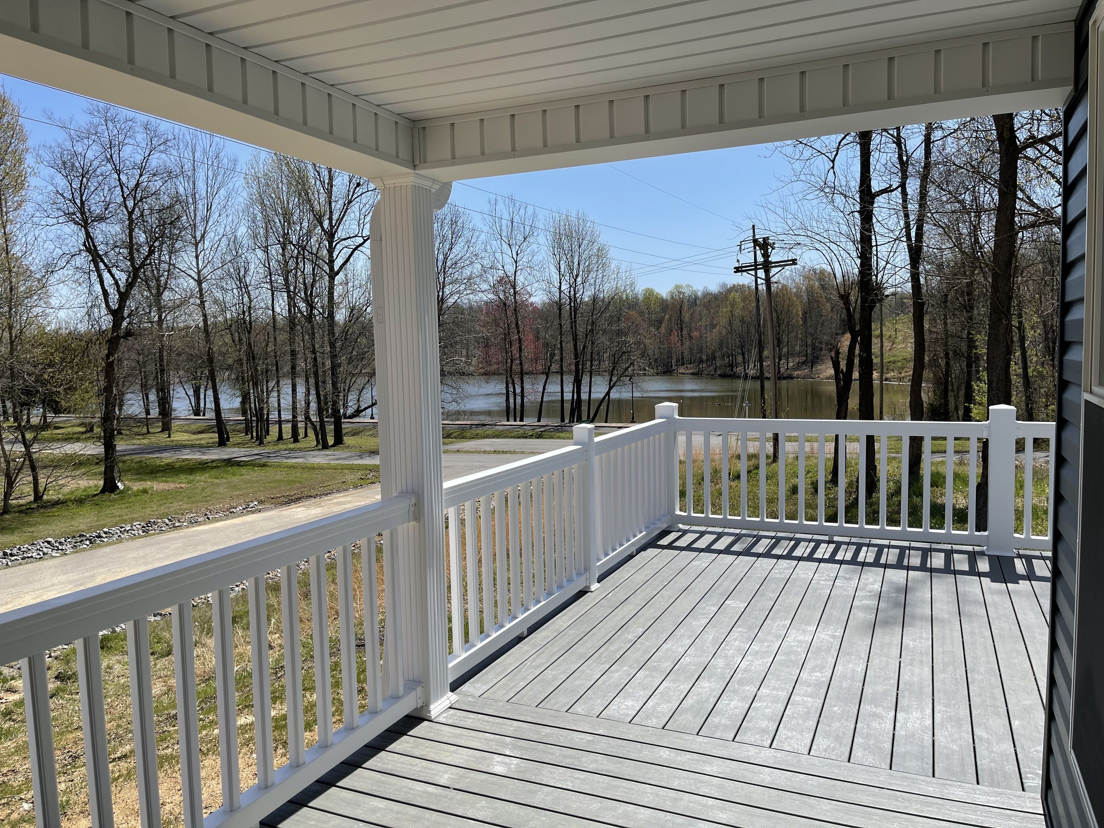 Built in 2021 - 5 BR/4 BA Lakefront in Grand Rivers -The Only City on Both Lakes This new lakefront cottage constructed in 2021 is on a small bluff with year round views of Kentucky-Barkley Lake in a private wooded setting in the quaint Little Lake Village subdivision in downtown Grand Rivers. The one-level cottage is finished in high quality, coastal cottage architectural style and has many upgrades including 6 foot tall Pella windows, porcelain tile that looks like wood and 9 to 13 foot ceilings in all rooms. The lakehouse borders Little Lake Park and is naturally connected to the lake and surrounding woods through an 800 square foot outdoor sun deck and covered porch all with composite decking and white railing overlooking the lake. The lakehouse is perfect for 4 couples plus 8 kids or 5 couples having 3 bedrooms that are en suites with king beds and their own private full bath room. The 4th bedroom has a king bed and shares a common hall full bath while the the 5th bedroom is great for kids and has 1 queen, 2 full and 2 single beds. Modern amenities include unlimited AT&T U-verse Internet Wi-Fi with speeds up to 30 Mbps, 6 wall-mounted 4K TVs (75" / 55") with free YouTube Live TV, Netflix, Amazon Prime, Disney+, HBO Max, Hulu, ESPN+, washer and dryer, a fully-equipped kitchen/750-sq.-ft. great room with 13 foot vaulted ceilings and 10 different 6 foot tall Pella windows overlooking the lake and dimmable LED can lighting in all rooms.The large master bedroom suite has a separate shower and tub and double vanity sink and walk-in closet / separate ventilated crib room. Porcelain tile that looks like weathered wood is in every inch of all interior floors and is thorougly cleaned and sanitized between each stay.This is a perfect location for a large family getaway, vacation with several families, retreat, business trip, fishermen and boaters. There is a very large driveway with a pull-through semi-circle drive perfect for vehicles and boat trailers near the street that can accommodate over 10 vehicles and / or boats and has multiple outdoor electric hook-ups to charge boat batteries.The owner has 2 other lakehouses with nearly identical floor plans 100 yards away (VRBO #242128 and #1035898) and can be rented in conjunction with this listing and can jointly accommodate up to 50 people for very large gatherings.Picturesque Grand Rivers: Grand Rivers is located between 218,000-acre Kentucky Lake and Lake Barkley, the nation's largest man-made body of water. In 2009, Grand Rivers was named the 8th best small town in the South by Southern Living Magazine. The main entrance to 180,000 acre Land Between the Lakes National Recreation Area with 500 miles of hiking and biking trails is 1 mile from the lakehouse.The cottage overlooks the Grand Rivers Walking Trail which runs under a large canopy of old growth hardwood beside the back part of Green Turtle Bay on Lake Barkley, which the locals refer to as Little Lake. Adjacent Little Lake Park offers a newly constructed children’s playground, free Saturday night concerts in the summer with live bands, and periodic outdoor festivals and car shows. November through early January, Grand Rivers is at its best with its festival of lights that extends to the lakehouse along Little Lake Park as well as Horse drawn carriage rides and of course Santa at Patti's!The cottage is a short walk to everything in Grand Rivers including Green Turtle Bay Marina & Lighthouse Landing Sailboat Marina (where motor boat, jet ski and sailboat rentals are available), Patti’s 1880s Settlement, T Lawson's Pub, Thirsty Turtle Tavern, Craig's Dairy Dream, Cabin Pizza, the Branson-style Badget Village Playhouse Theater, Village Market & Café grocery store, Village Liquors, antique and other retail stores, mini-golf, rock-wall climbing and much more.Downtown Grand Rivers, KY – 1 minute or a 1/3 of a mile walkLand Between the Lakes National Recreation Area – 3 minutes, 1 mile (180,000 acres of hiking, biking and walking trails, planetarium, bison and elk range, Homeplace, etc.)Paducah, KY – 30 minutes, 27 milesEvansville, IN - 1.5 hours, 100 milesNashville, TN – 1.5 hours, 115 milesCape Girardeau, MO – 1.5 hours, 92 milesMemphis, TN – 3 hours, 190 milesSt. Louis, MO – 3 hours, 200 milesLouisville, KY – 3 hours, 200 milesIndianapolis, IN – 4 hours, 275 milesChicago, IL – 6 hours, 398 miles