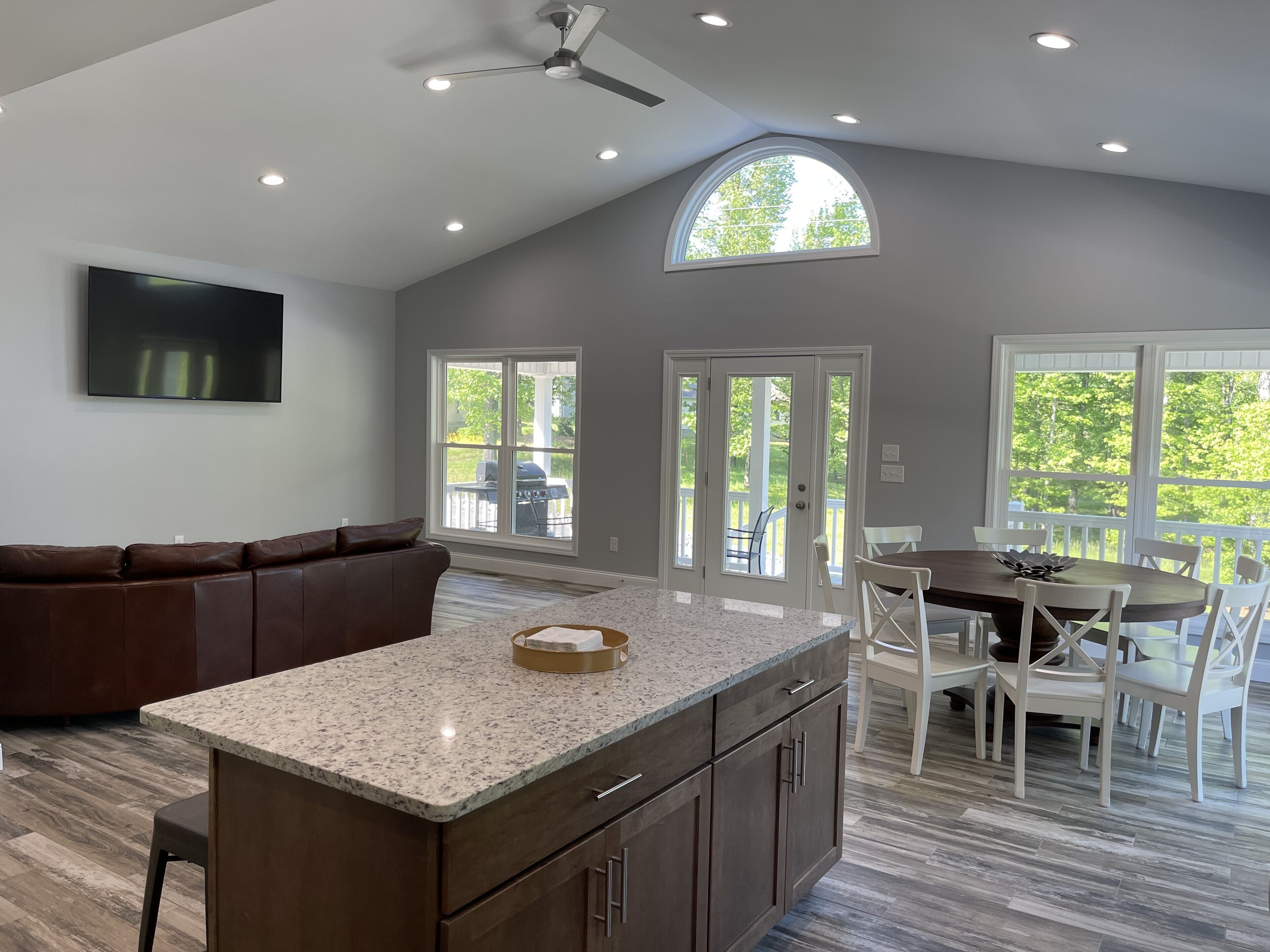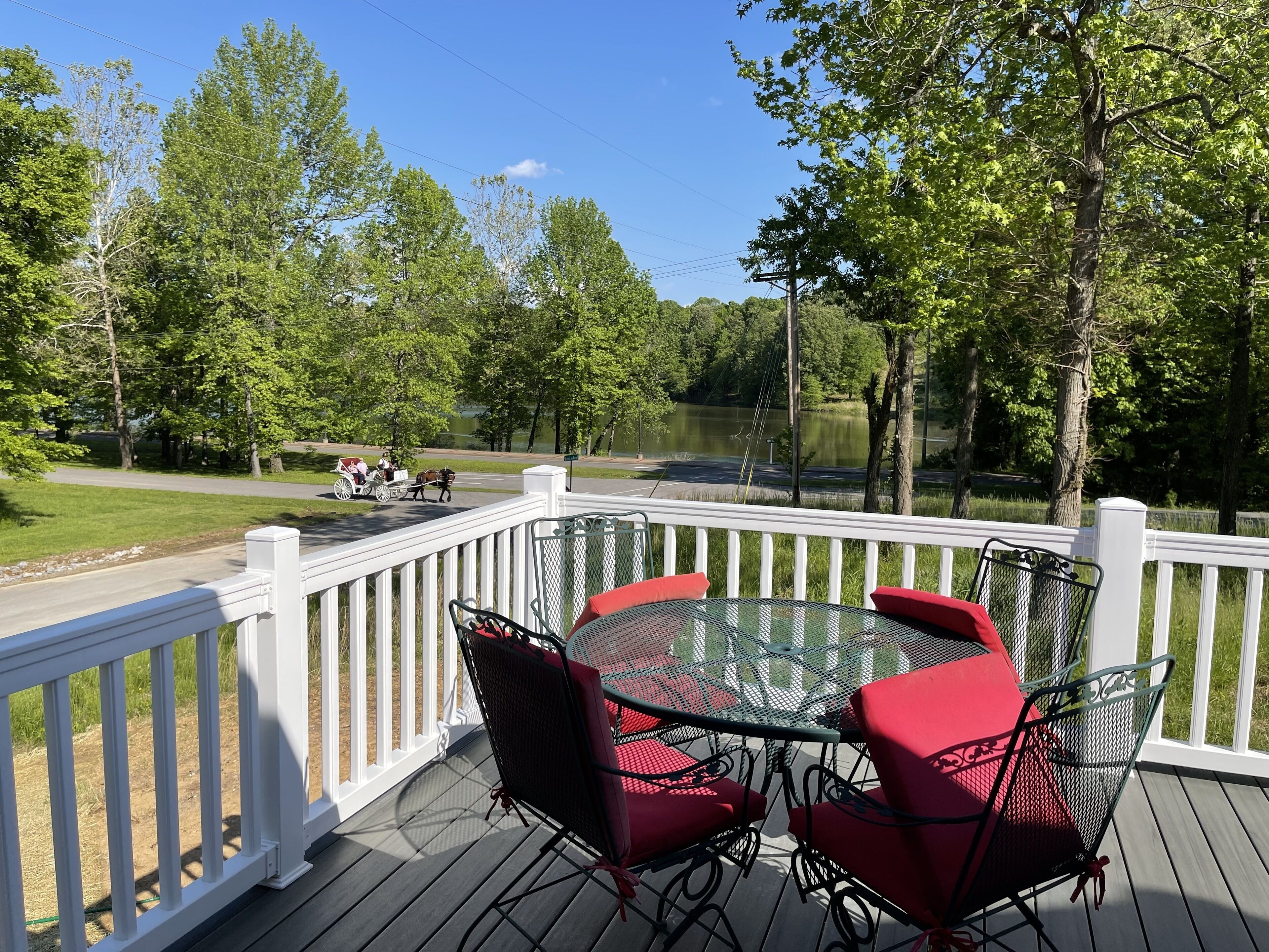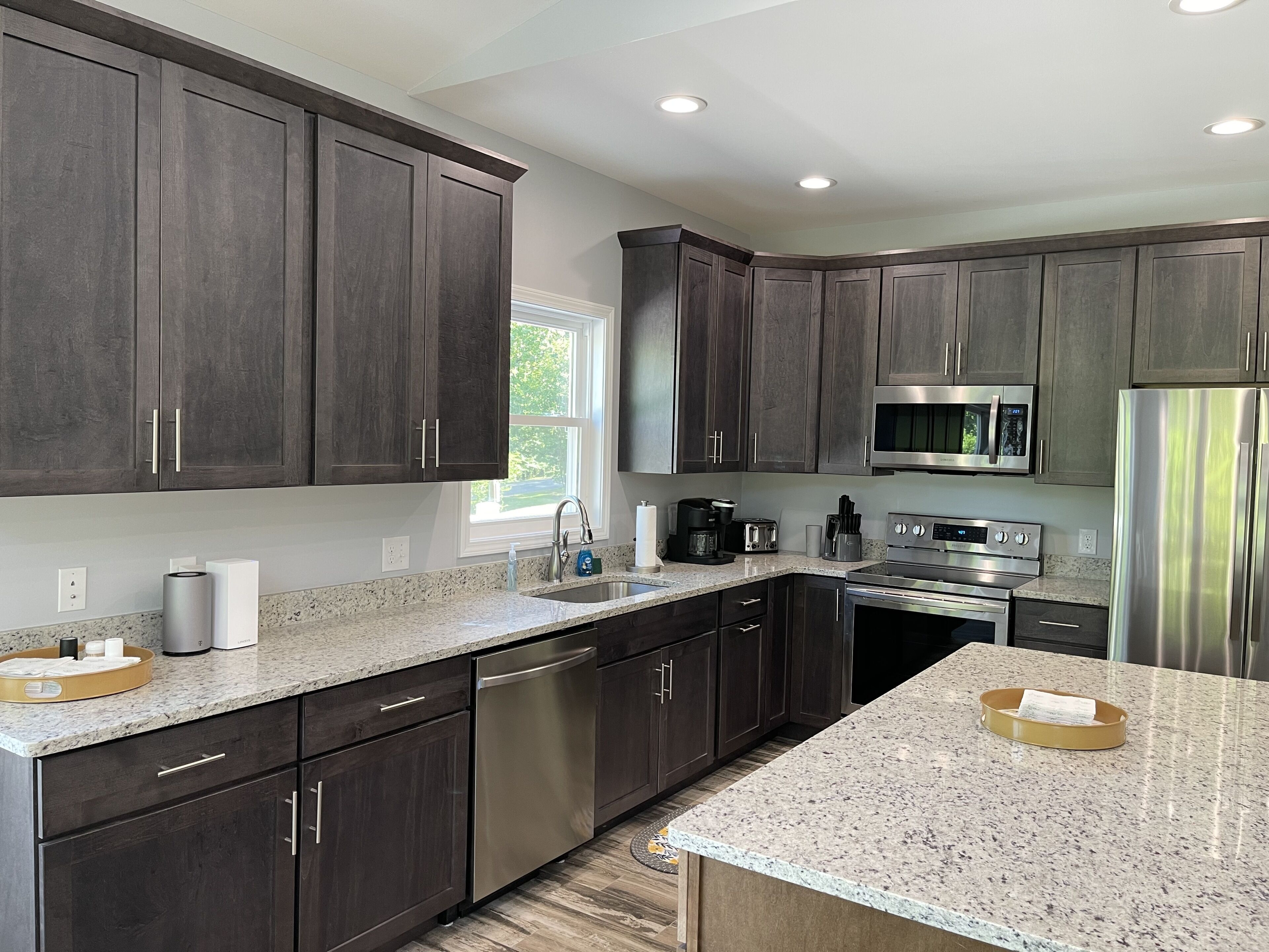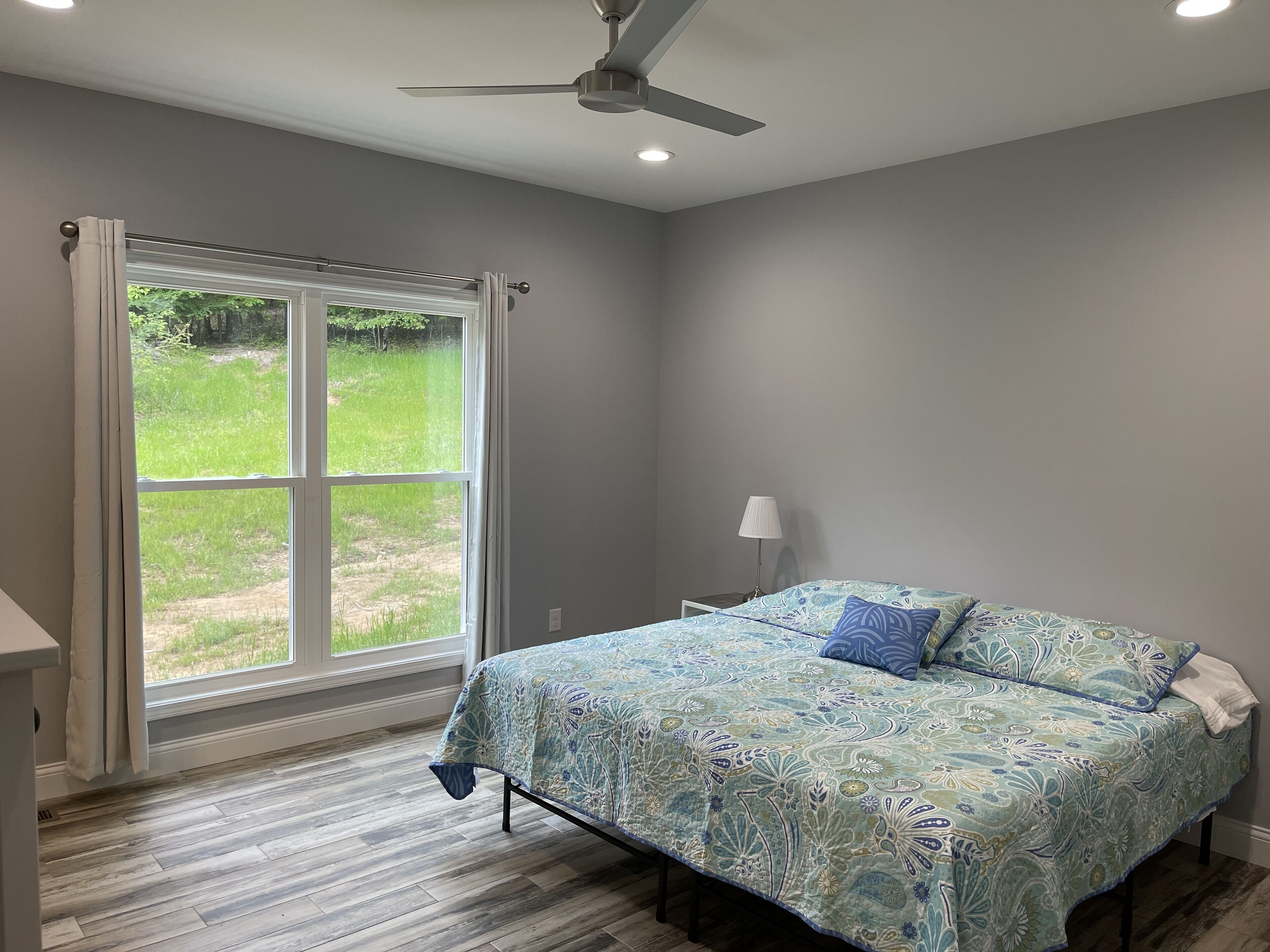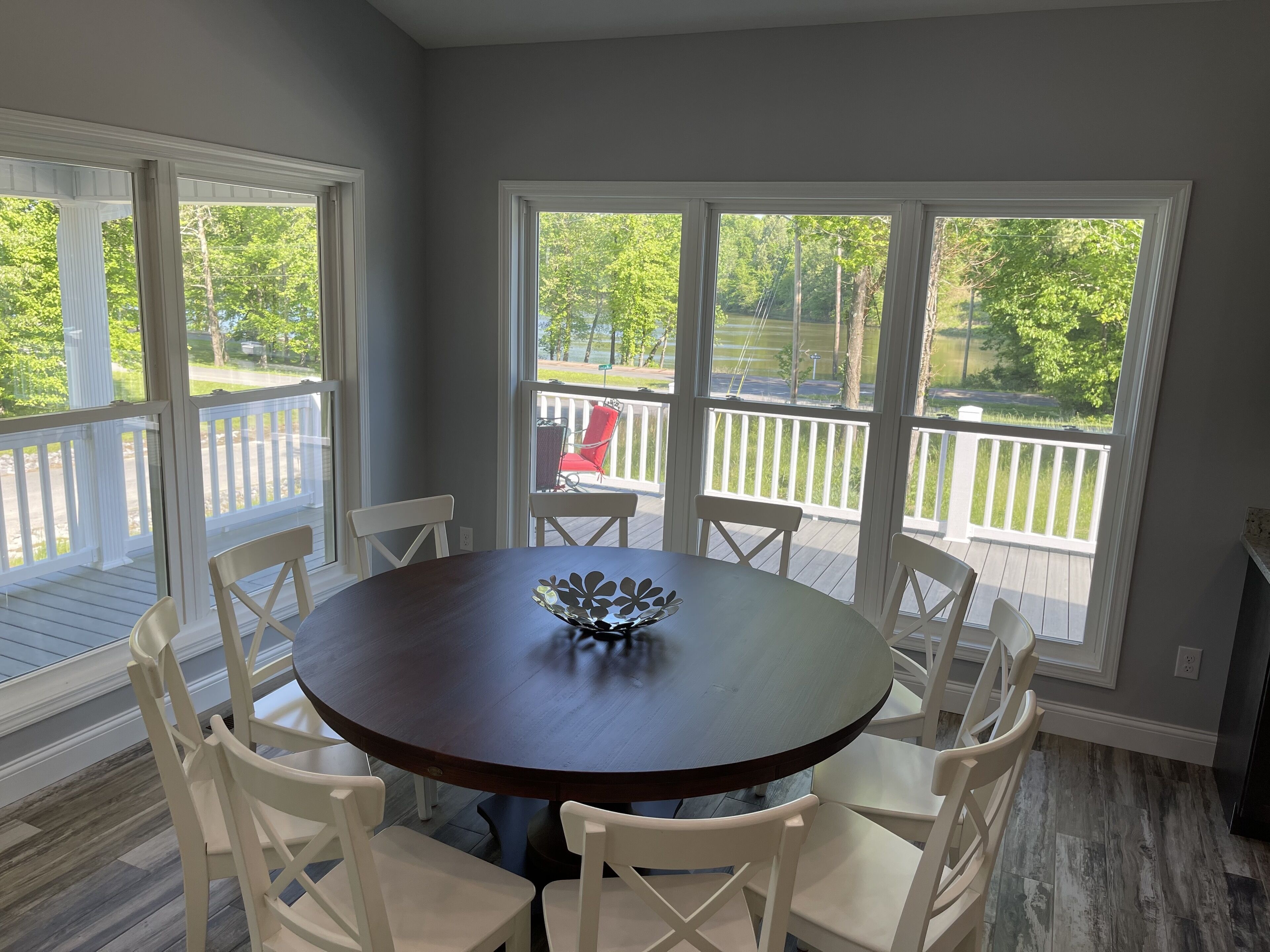 Built in 2021 - 5 BR/4 BA Lakefront in Grand Rivers -The Only City on Both Lakes This new lakefront cottage constructed in 2021 is on a small bluff with year round views of Kentucky-Barkley Lake in a private wooded setting in the quaint Little Lake Village subdivision in downtown Grand Rivers. The one-level cottage is finished in high quality, coastal cottage architectural style and has many upgrades including 6 foot tall Pella windows, porcelain tile that looks like wood and 9 to 13 foot ceilings in all rooms. The lakehouse borders Little Lake Park and is naturally connected to the lake and surrounding woods through an 800 square foot outdoor sun deck and covered porch all with composite decking and white railing overlooking the lake. The lakehouse is perfect for 4 couples plus 8 kids or 5 couples having 3 bedrooms that are en suites with king beds and their own private full bath room. The 4th bedroom has a king bed and shares a common hall full bath while the the 5th bedroom is great for kids and has 1 queen, 2 full and 2 single beds. Modern amenities include unlimited AT&T U-verse Internet Wi-Fi with speeds up to 30 Mbps, 6 wall-mounted 4K TVs (75" / 55") with free YouTube Live TV, Netflix, Amazon Prime, Disney+, HBO Max, Hulu, ESPN+, washer and dryer, a fully-equipped kitchen/750-sq.-ft. great room with 13 foot vaulted ceilings and 10 different 6 foot tall Pella windows overlooking the lake and dimmable LED can lighting in all rooms.The large master bedroom suite has a separate shower and tub and double vanity sink and walk-in closet / separate ventilated crib room. Porcelain tile that looks like weathered wood is in every inch of all interior floors and is thorougly cleaned and sanitized between each stay.This is a perfect location for a large family getaway, vacation with several families, retreat, business trip, fishermen and boaters. There is a very large driveway with a pull-through semi-circle drive perfect for vehicles and boat trailers near the street that can accommodate over 10 vehicles and / or boats and has multiple outdoor electric hook-ups to charge boat batteries.The owner has 2 other lakehouses with nearly identical floor plans 100 yards away (VRBO #242128 and #1035898) and can be rented in conjunction with this listing and can jointly accommodate up to 50 people for very large gatherings.Picturesque Grand Rivers: Grand Rivers is located between 218,000-acre Kentucky Lake and Lake Barkley, the nation's largest man-made body of water. In 2009, Grand Rivers was named the 8th best small town in the South by Southern Living Magazine. The main entrance to 180,000 acre Land Between the Lakes National Recreation Area with 500 miles of hiking and biking trails is 1 mile from the lakehouse.The cottage overlooks the Grand Rivers Walking Trail which runs under a large canopy of old growth hardwood beside the back part of Green Turtle Bay on Lake Barkley, which the locals refer to as Little Lake. Adjacent Little Lake Park offers a newly constructed children’s playground, free Saturday night concerts in the summer with live bands, and periodic outdoor festivals and car shows. November through early January, Grand Rivers is at its best with its festival of lights that extends to the lakehouse along Little Lake Park as well as Horse drawn carriage rides and of course Santa at Patti's!The cottage is a short walk to everything in Grand Rivers including Green Turtle Bay Marina & Lighthouse Landing Sailboat Marina (where motor boat, jet ski and sailboat rentals are available), Patti’s 1880s Settlement, T Lawson's Pub, Thirsty Turtle Tavern, Craig's Dairy Dream, Cabin Pizza, the Branson-style Badget Village Playhouse Theater, Village Market & Café grocery store, Village Liquors, antique and other retail stores, mini-golf, rock-wall climbing and much more.Downtown Grand Rivers, KY – 1 minute or a 1/3 of a mile walkLand Between the Lakes National Recreation Area – 3 minutes, 1 mile (180,000 acres of hiking, biking and walking trails, planetarium, bison and elk range, Homeplace, etc.)Paducah, KY – 30 minutes, 27 milesEvansville, IN - 1.5 hours, 100 milesNashville, TN – 1.5 hours, 115 milesCape Girardeau, MO – 1.5 hours, 92 milesMemphis, TN – 3 hours, 190 milesSt. Louis, MO – 3 hours, 200 milesLouisville, KY – 3 hours, 200 milesIndianapolis, IN – 4 hours, 275 milesChicago, IL – 6 hours, 398 miles