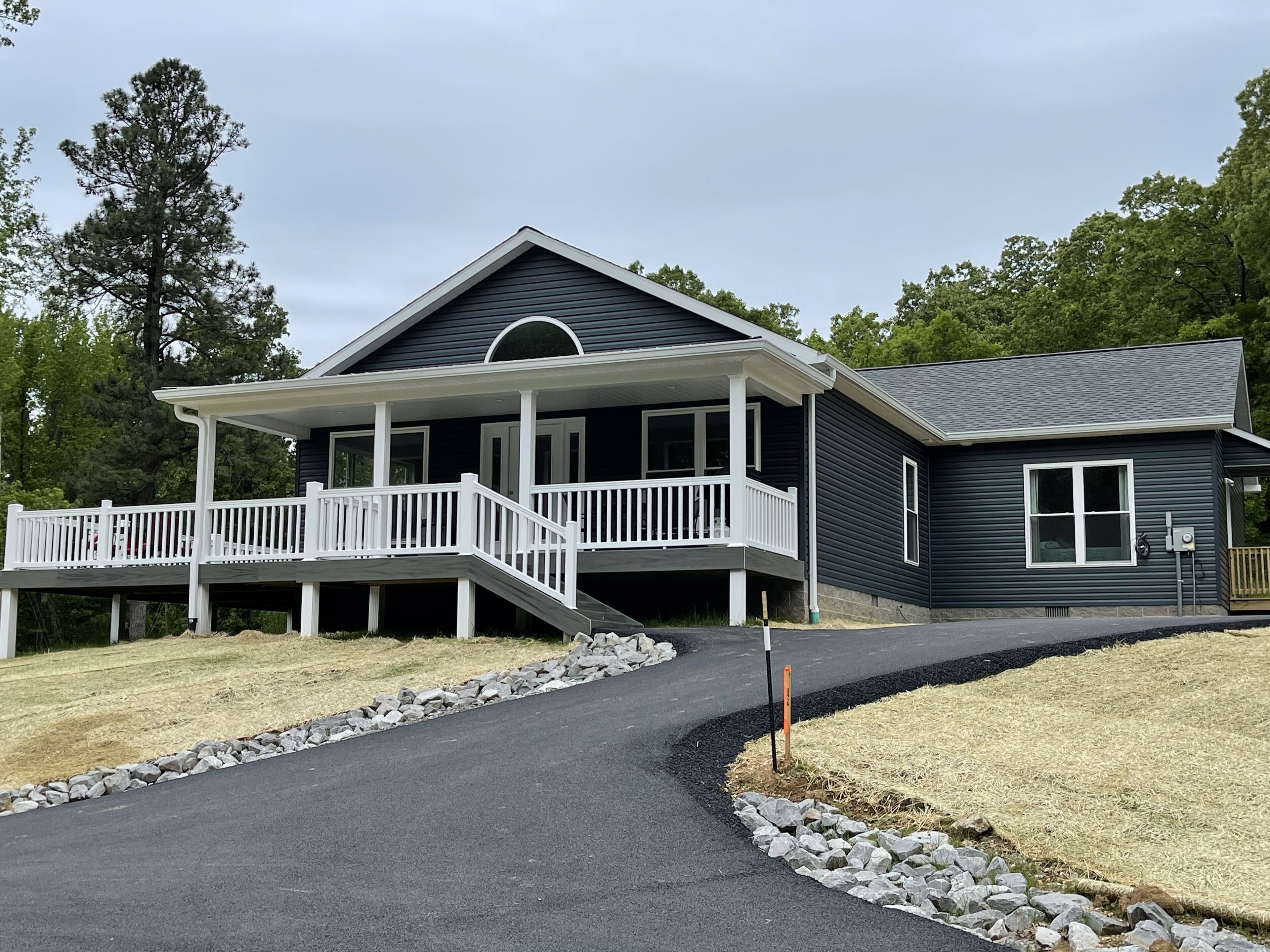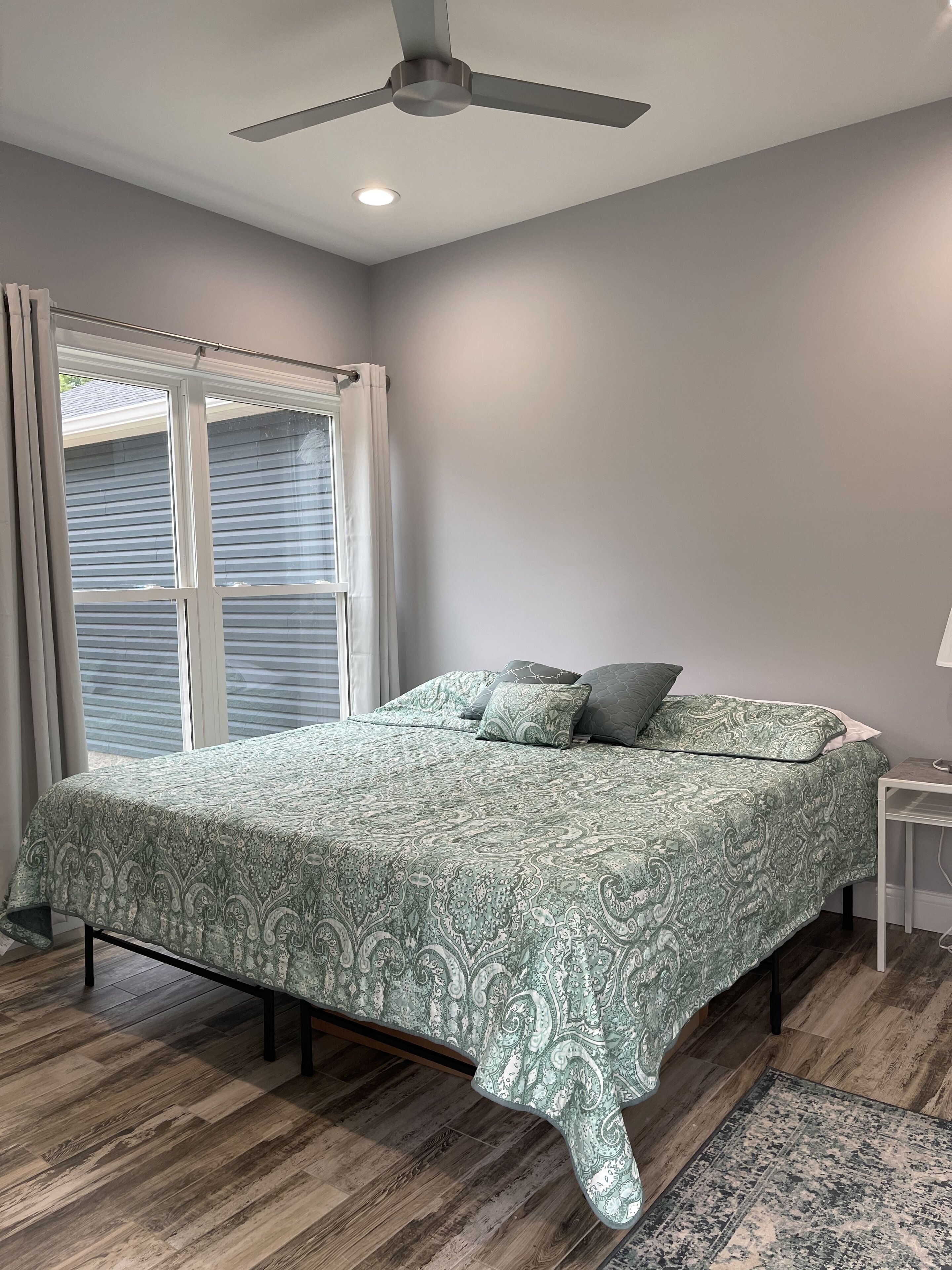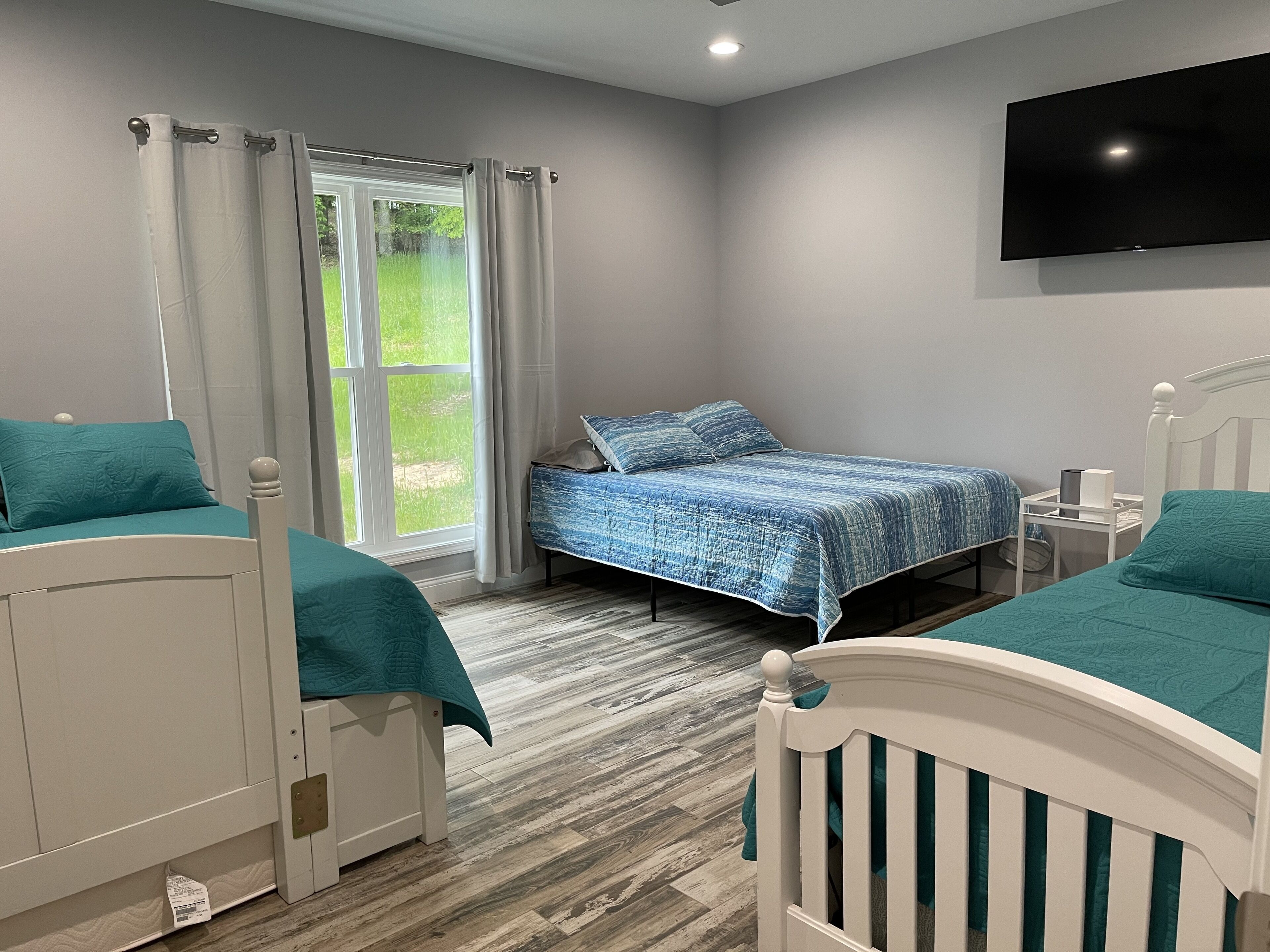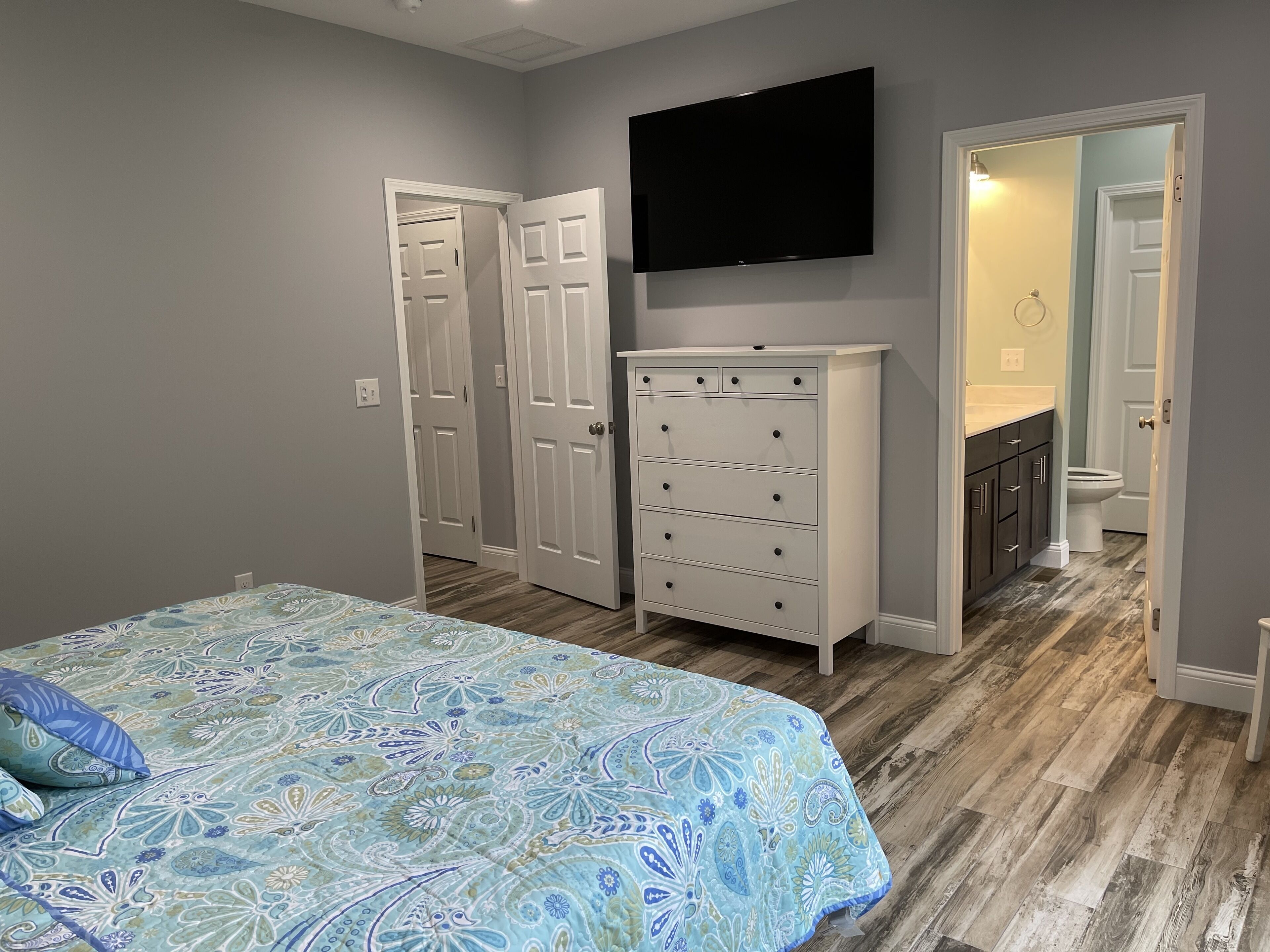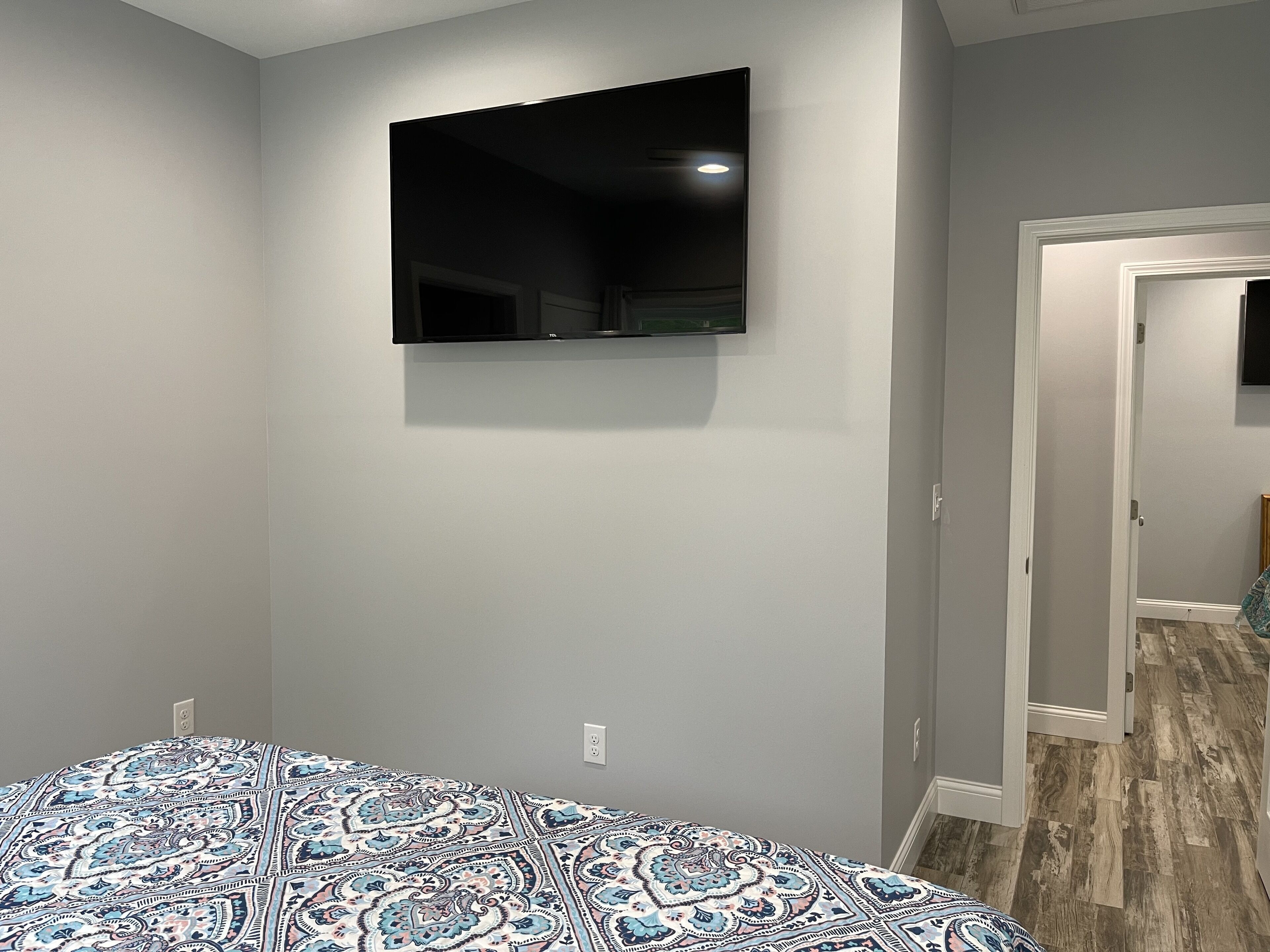 Built in 2021 - 5 BR/4 BA Lakefront in Grand Rivers -The Only City on Both Lakes This new lakefront cottage constructed in 2021 is on a small bluff with year round views of Kentucky-Barkley Lake in a private wooded setting in the quaint Little Lake Village subdivision in downtown Grand Rivers. The one-level cottage is finished in high quality, coastal cottage architectural style and has many upgrades including 6 foot tall Pella windows, porcelain tile that looks like wood and 9 to 13 foot ceilings in all rooms. The lakehouse borders Little Lake Park and is naturally connected to the lake and surrounding woods through an 800 square foot outdoor sun deck and covered porch all with composite decking and white railing overlooking the lake. The lakehouse is perfect for 4 couples plus 8 kids or 5 couples having 3 bedrooms that are en suites with king beds and their own private full bath room. The 4th bedroom has a king bed and shares a common hall full bath while the the 5th bedroom is great for kids and has 1 queen, 2 full and 2 single beds. Modern amenities include unlimited AT&T U-verse Internet Wi-Fi with speeds up to 30 Mbps, 6 wall-mounted 4K TVs (75" / 55") with free YouTube Live TV, Netflix, Amazon Prime, Disney+, HBO Max, Hulu, ESPN+, washer and dryer, a fully-equipped kitchen/750-sq.-ft. great room with 13 foot vaulted ceilings and 10 different 6 foot tall Pella windows overlooking the lake and dimmable LED can lighting in all rooms.The large master bedroom suite has a separate shower and tub and double vanity sink and walk-in closet / separate ventilated crib room. Porcelain tile that looks like weathered wood is in every inch of all interior floors and is thorougly cleaned and sanitized between each stay.This is a perfect location for a large family getaway, vacation with several families, retreat, business trip, fishermen and boaters. There is a very large driveway with a pull-through semi-circle drive perfect for vehicles and boat trailers near the street that can accommodate over 10 vehicles and / or boats and has multiple outdoor electric hook-ups to charge boat batteries.The owner has 2 other lakehouses with nearly identical floor plans 100 yards away (VRBO #242128 and #1035898) and can be rented in conjunction with this listing and can jointly accommodate up to 50 people for very large gatherings.Picturesque Grand Rivers: Grand Rivers is located between 218,000-acre Kentucky Lake and Lake Barkley, the nation's largest man-made body of water. In 2009, Grand Rivers was named the 8th best small town in the South by Southern Living Magazine. The main entrance to 180,000 acre Land Between the Lakes National Recreation Area with 500 miles of hiking and biking trails is 1 mile from the lakehouse.The cottage overlooks the Grand Rivers Walking Trail which runs under a large canopy of old growth hardwood beside the back part of Green Turtle Bay on Lake Barkley, which the locals refer to as Little Lake. Adjacent Little Lake Park offers a newly constructed children’s playground, free Saturday night concerts in the summer with live bands, and periodic outdoor festivals and car shows. November through early January, Grand Rivers is at its best with its festival of lights that extends to the lakehouse along Little Lake Park as well as Horse drawn carriage rides and of course Santa at Patti's!The cottage is a short walk to everything in Grand Rivers including Green Turtle Bay Marina & Lighthouse Landing Sailboat Marina (where motor boat, jet ski and sailboat rentals are available), Patti’s 1880s Settlement, T Lawson's Pub, Thirsty Turtle Tavern, Craig's Dairy Dream, Cabin Pizza, the Branson-style Badget Village Playhouse Theater, Village Market & Café grocery store, Village Liquors, antique and other retail stores, mini-golf, rock-wall climbing and much more.Downtown Grand Rivers, KY – 1 minute or a 1/3 of a mile walkLand Between the Lakes National Recreation Area – 3 minutes, 1 mile (180,000 acres of hiking, biking and walking trails, planetarium, bison and elk range, Homeplace, etc.)Paducah, KY – 30 minutes, 27 milesEvansville, IN - 1.5 hours, 100 milesNashville, TN – 1.5 hours, 115 milesCape Girardeau, MO – 1.5 hours, 92 milesMemphis, TN – 3 hours, 190 milesSt. Louis, MO – 3 hours, 200 milesLouisville, KY – 3 hours, 200 milesIndianapolis, IN – 4 hours, 275 milesChicago, IL – 6 hours, 398 miles