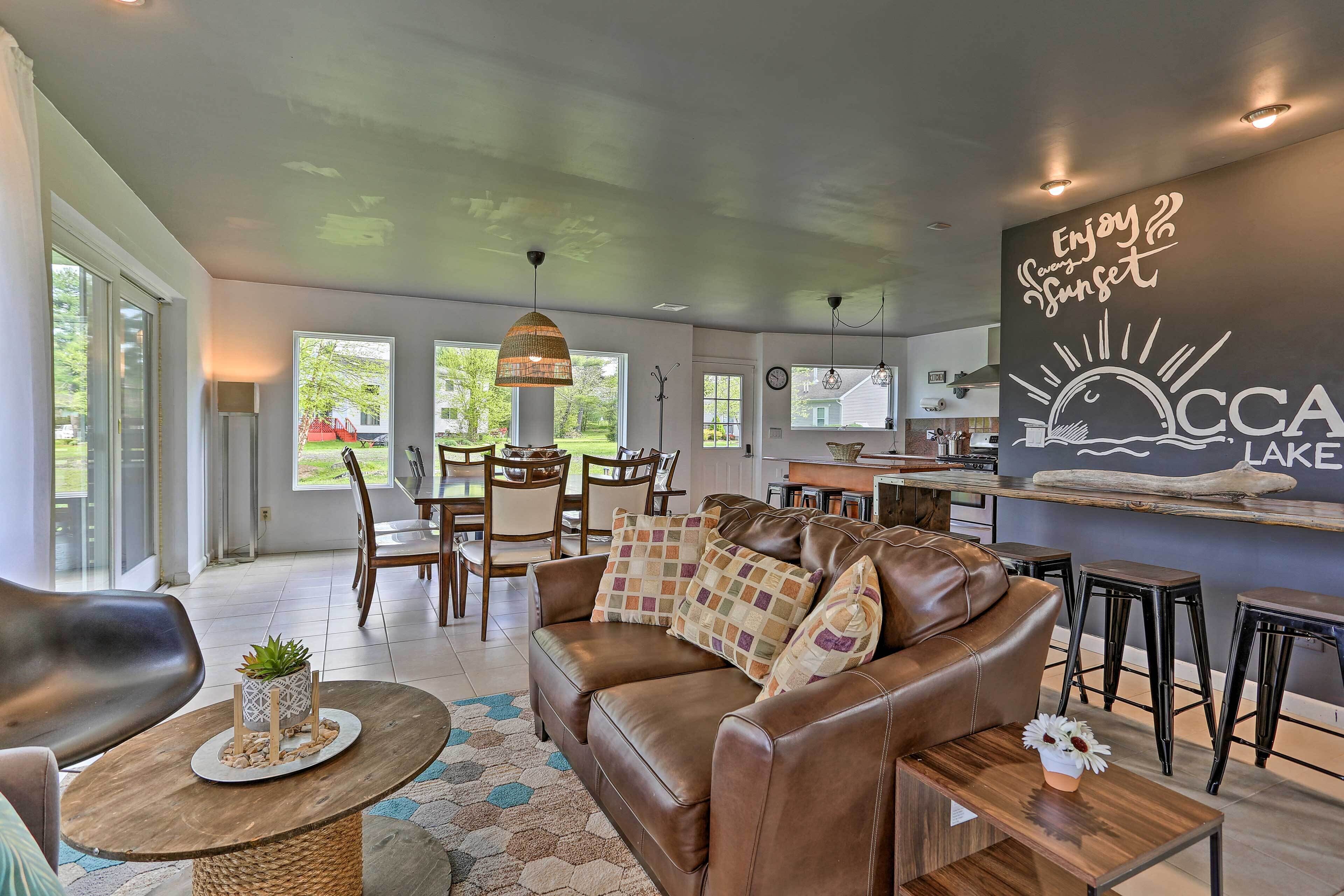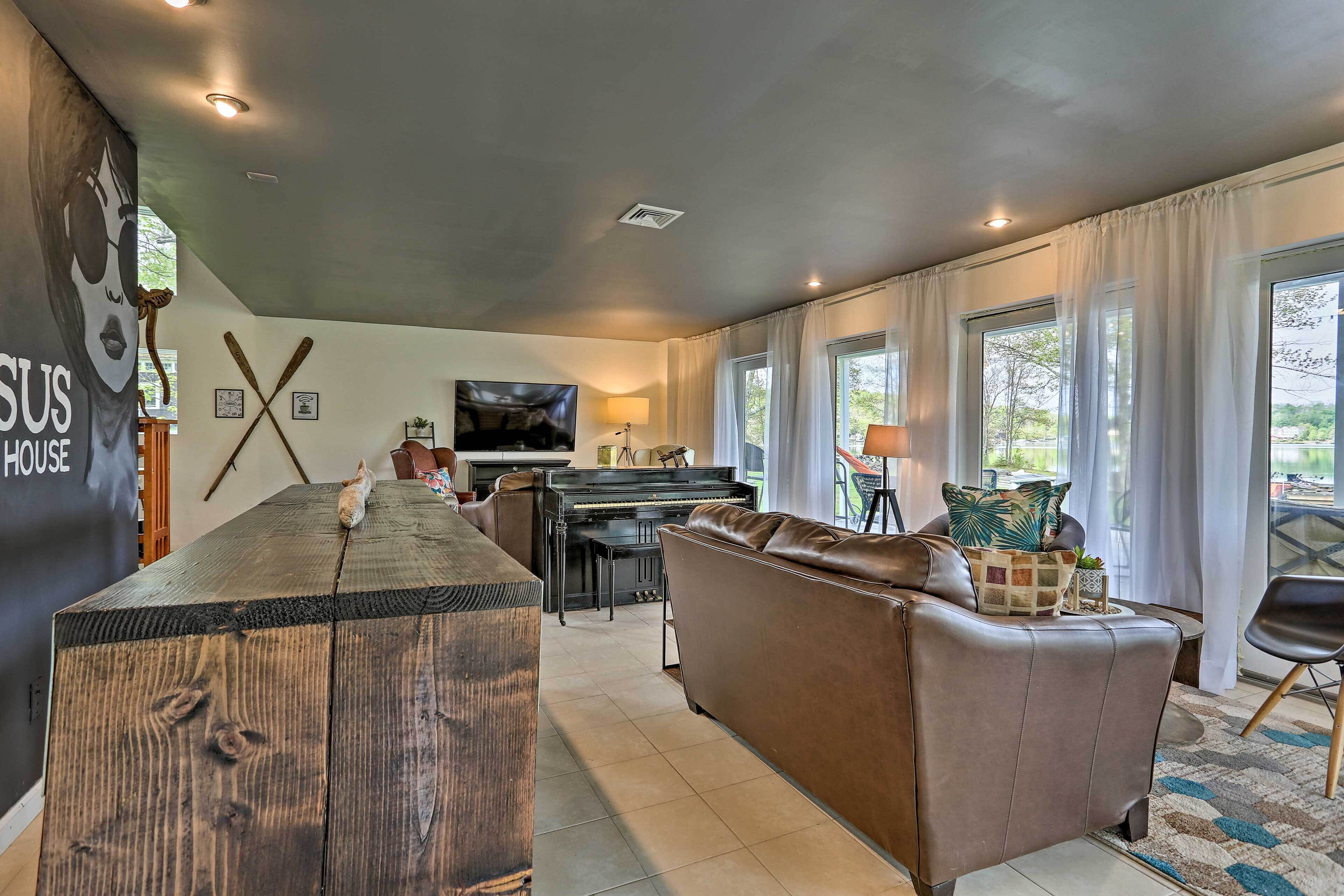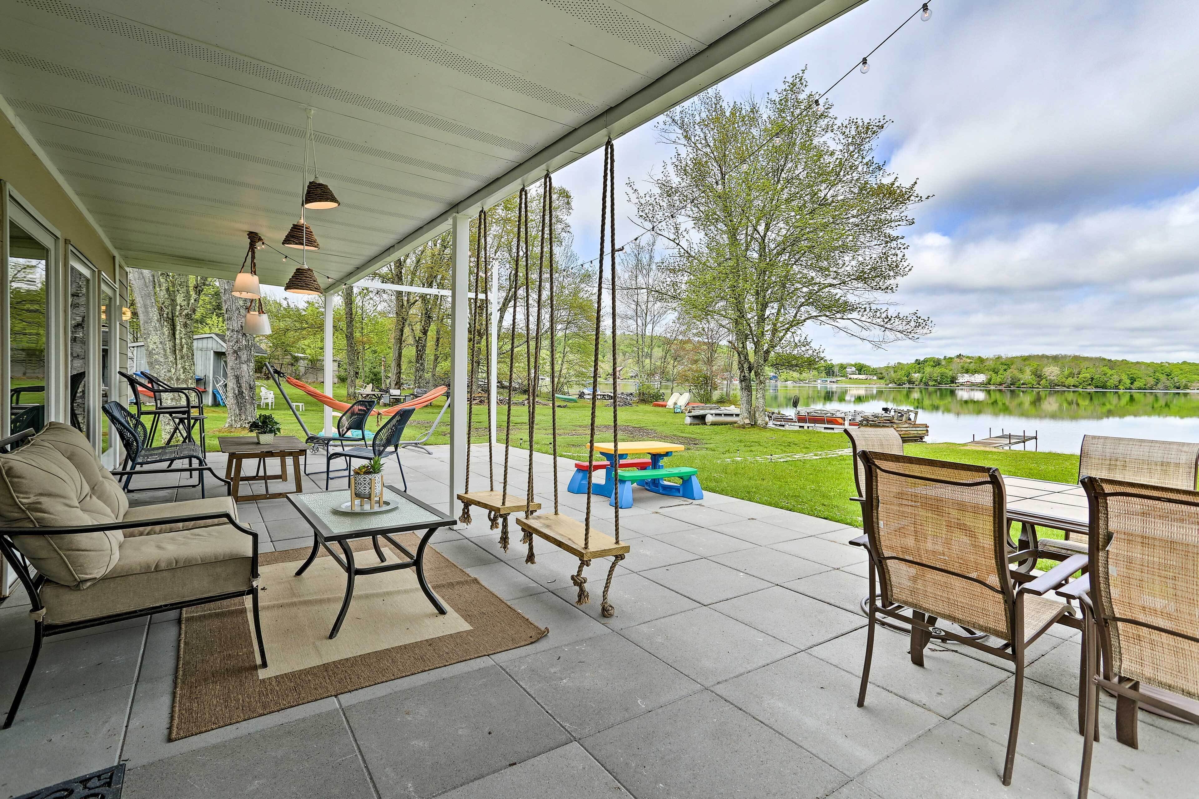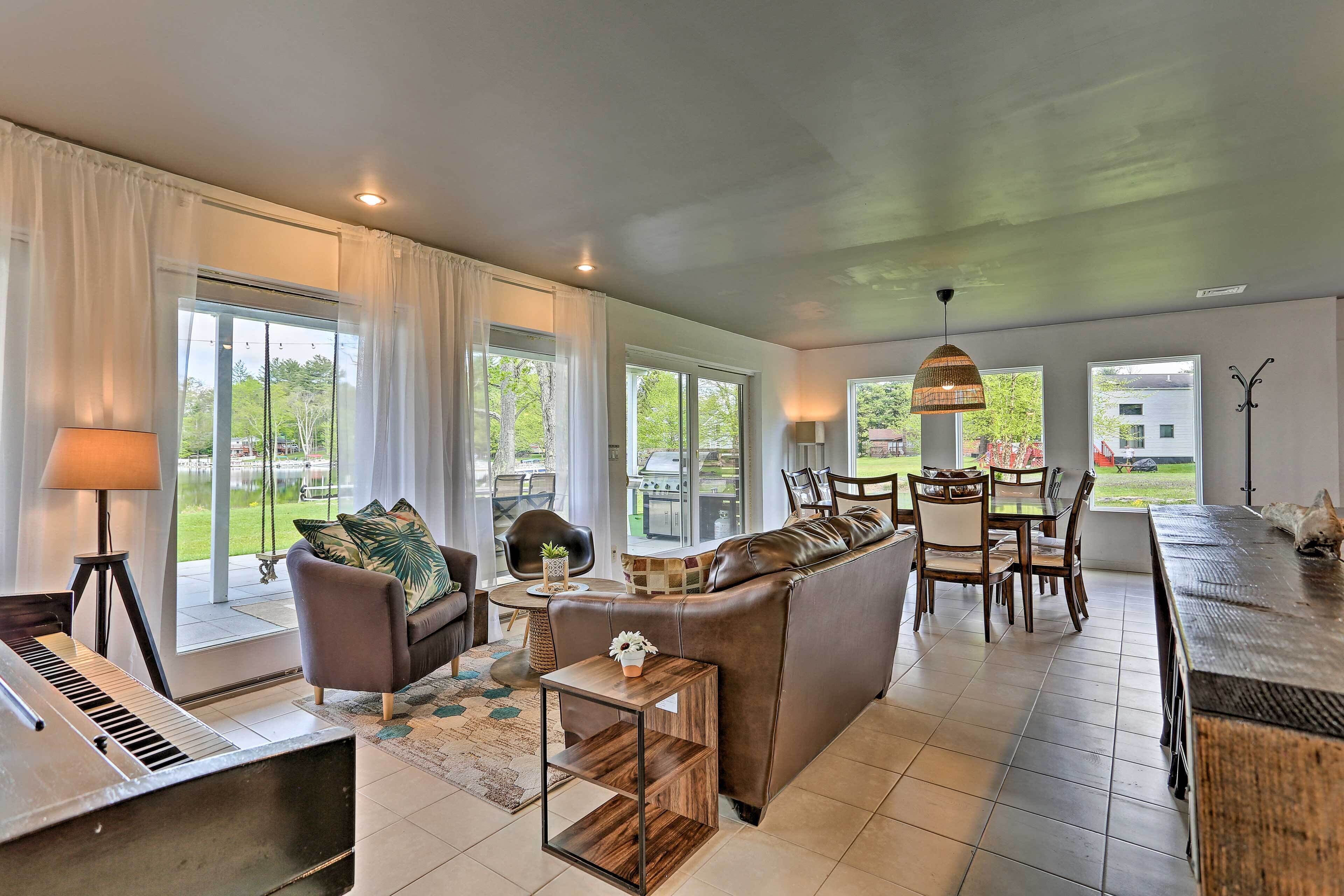 Luxe Lakefront Family Cottage: Private Beach, Dock Family-friendly fun abounds in the Catskills region of Upstate New York, where you’ll find this spectacular lakefront cottage! Boasting 8 bedrooms, 4 baths, a game room, gourmet kitchen, and fantastic outdoor space, this luxe vacation rental is the ideal home base for your large-group retreat. Choose to spend your days paddling the shores of White Lake and swimming off the private dock or drive 4 miles to explore the Bethel Woods Center for the Arts - home to the iconic 1969 Woodstock Festival!-- THE PROPERTY --Direct Lake Access | Outdoor Entertainment Space | 2 Bedroom Suites | 2,750 Sq FtThis Catskills cottage offers ample entertaining space both inside and out plus all the modern essentials of home, so you can seamlessly host your next family reunion, friend-group gathering, or peaceful Upstate retreat!Bedroom Suite 1: King Bed | Bedroom Suite 2: Queen Bed | Bedroom 3: 2 Full Beds | Bedroom 4: Twin Bed | Bedroom 5: Twin Bed | Bedroom 6: Full Bed | Bedroom 7: Twin Bunk Bed | Bedroom 8: Queen Bed | Game Room: Sleeper Sofa | Additional Sleeping: Pack 'n PlayOUTDOOR LIVING: Paved patio w/ dining table, gas grill, lounge area, hammock, hanging swings & lights, spacious lawn w/ private lake frontage, swimming/boating dockINDOOR LIVING: Open floor plan, high vaulted ceilings, Smart TV, fireplace, high-top bar, ample seating, foosball table, ping pong table, board games, decorative piano, dining tableKITCHEN: Cooking basics & spices, full-sized fridge, stove/oven, dishwasher, microwave, drip coffee maker, toaster, island countertopGENERAL: Free WiFi, central A/C & heat, washer & dryer, fresh linens, bath & beach towels, toiletries, hair dryersSUITABILITY: Step-free entry, bed/bath on first floor, grab rails in bathroom/shower, kids toysPARKING: Driveway (8 vehicles)-- THE LOCATION --WHITE LAKE (on-site): Boating, fishing, swimming, kayaking, canoeing, paddleboarding, Gene’s Boats (279 feet), Kauneonga Lake Boat Launch (0.6 miles), Benji & Jakes Pizza Restaurant (0.7 miles)OUTDOOR ACTIVITY: Lake Superior State Park (4.1 miles), Walnut Mountain Park (9.7 miles), Holiday Mountain Ski & Fun (13.2 miles), Upper Delaware Scenic and Recreational River (19.3 miles)ATTRACTIONS: Museum at Bethel Woods (3.9 miles), Bethel Woods Center for the Arts (4.0 miles), Resorts World Casino Catskills (12.2 miles), Costa’s Family Fun Park (31.3 miles)AIRPORT: New York Stewart International Airport (51.8 miles)-- REST EASY WITH US --Evolve makes it easy to find and book properties you'll never want to leave. You can relax knowing that our properties will always be ready for you and that we'll answer the phone 24/7. Even better, if anything is off about your stay, we'll make it right. You can count on our homes and our people to make you feel welcome — because we know what vacation means to you.-- POLICIES --- No smoking- No pets allowed- No events, parties, or large gatherings- Must be at least 25 years old to book- Additional fees and taxes may apply- Photo ID may be required upon check-in- NOTE: Your safety matters. This property features 4 exterior security cameras, located at each corner of the house, all facing outward. They do not look into interior spaces- NOTE: We care about your safety when entering the water. Parental supervision as well as the use of life jackets is strongly recommended for children and adults that choose to swim in the deep lake. Guests enter at their own risk