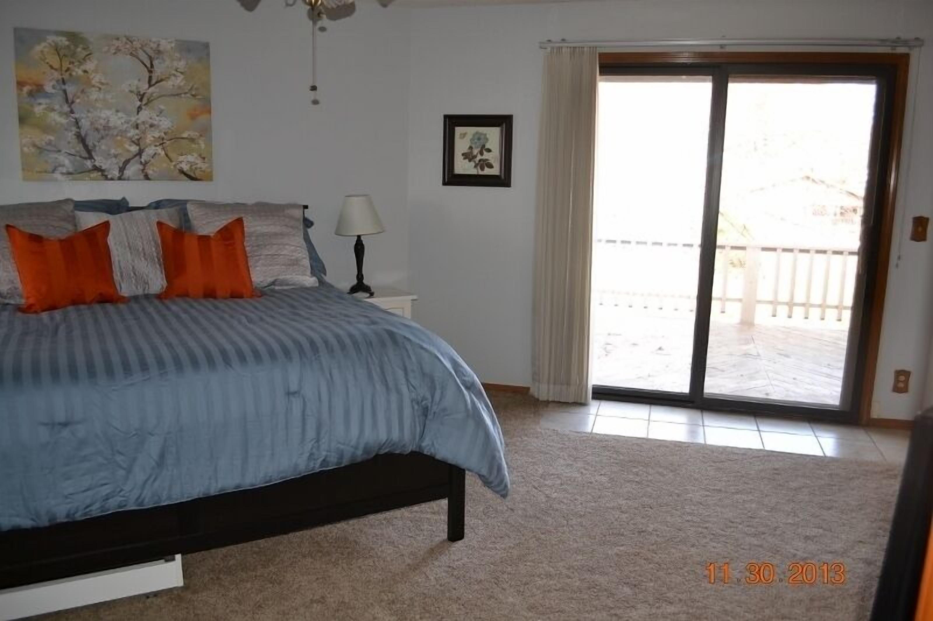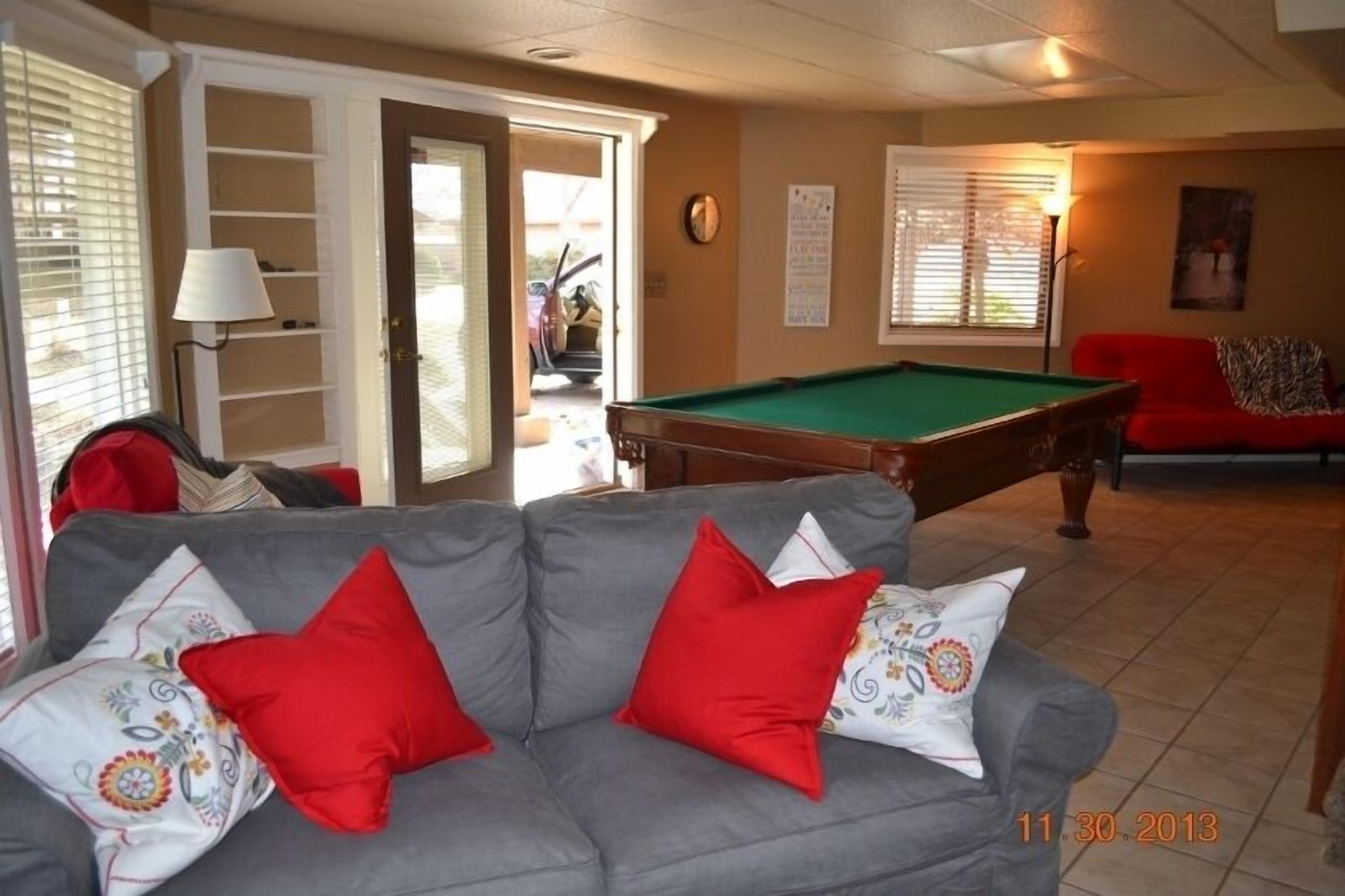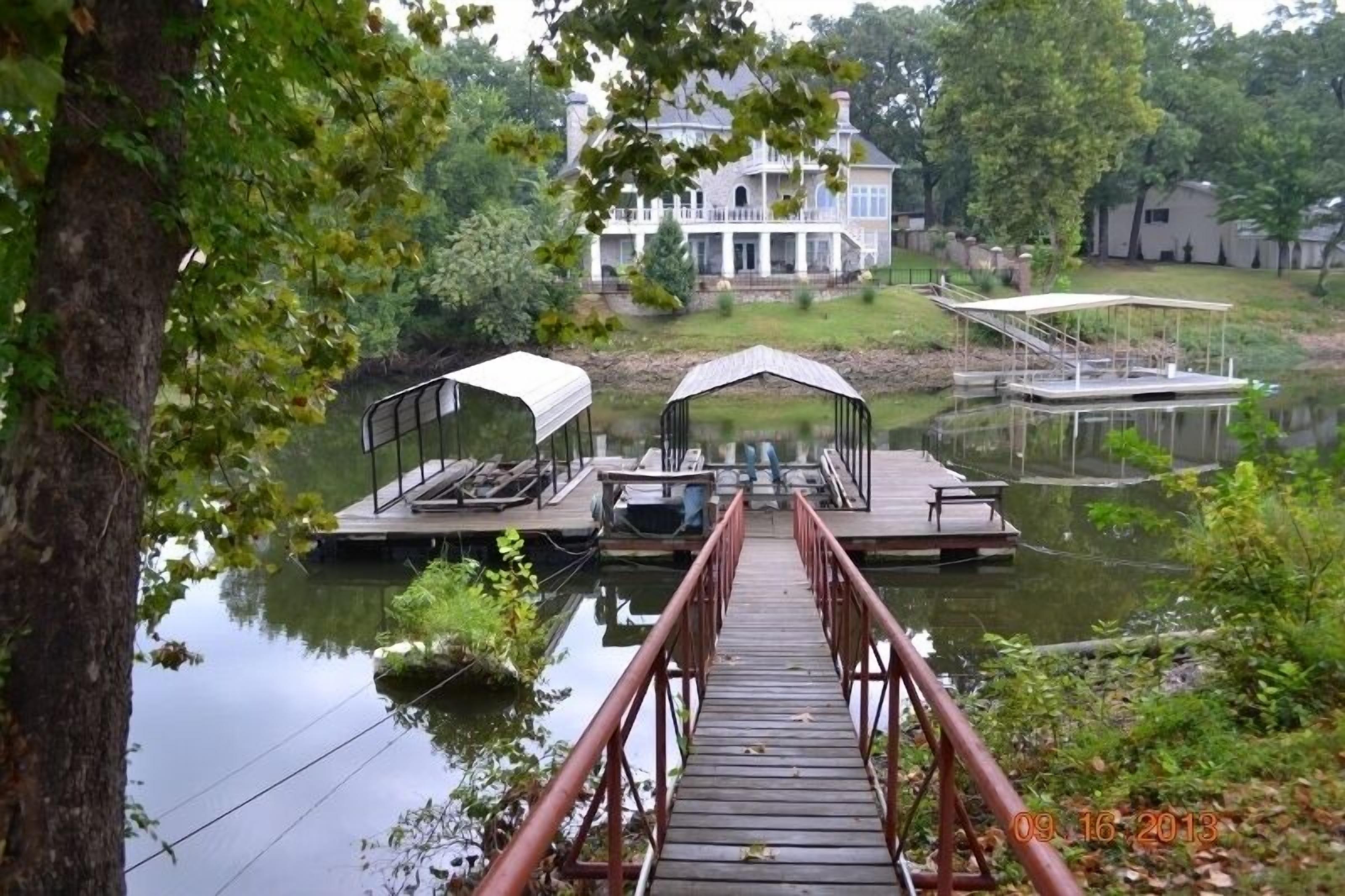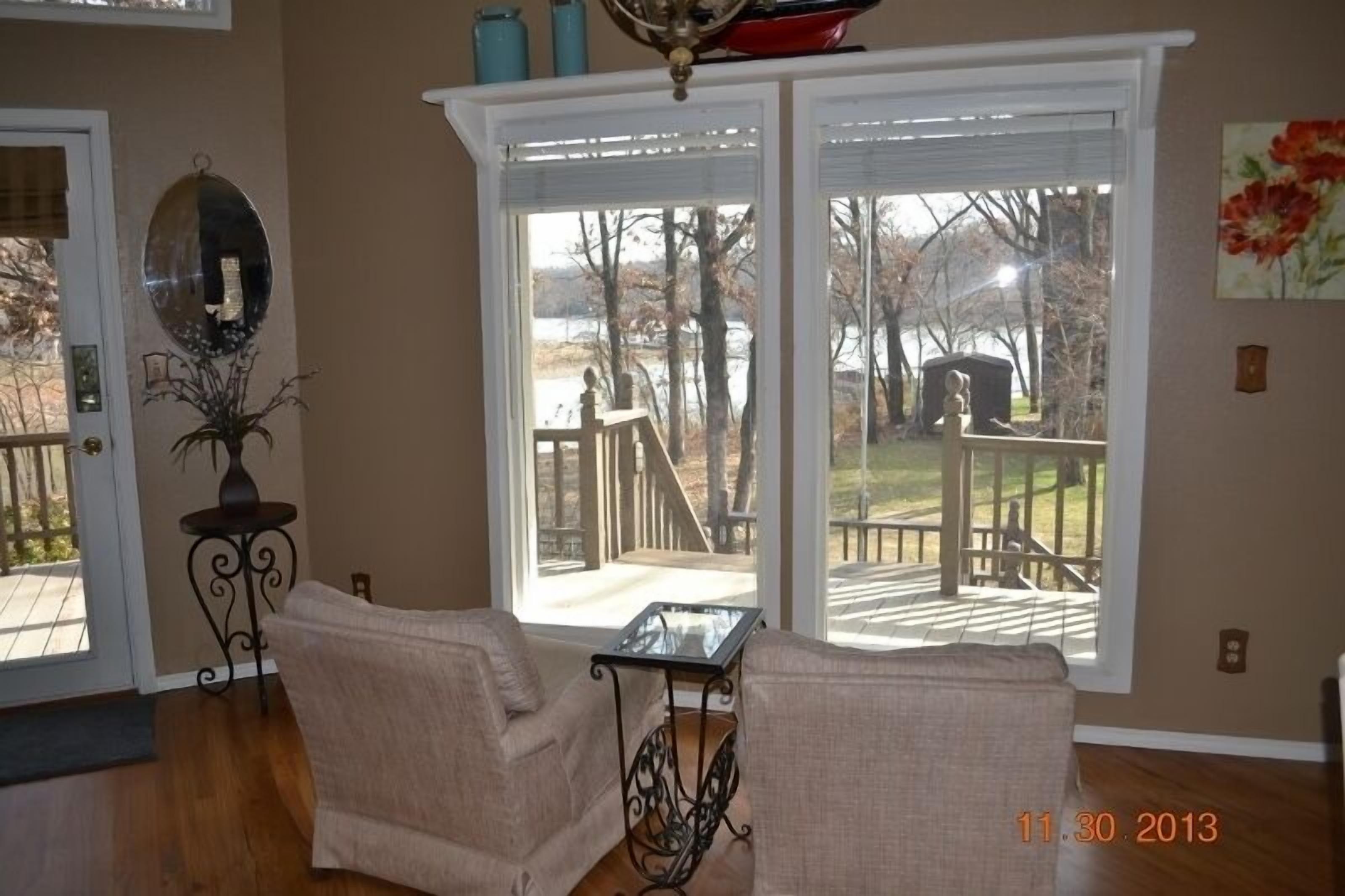 Family-Friendly Lakefront Home w/ Large Yard & Boat Dock-Sleeps 14+kids under 6 City of Grove VRH Permit 15-202. Freshly updated, cozy and friendly 5 bedroom 4.5 bathroom lakefront home. This beautiful home is on a large lot with parking available for 5-6 cars. Perfect large yard for family games of volleyball and badminton with a gentle slope to the water. Basketball hoop and outdoor ping pong table are included for guest use. Massive deck area outside of kitchen with picnic tables and separate sitting area with gorgeous lake views. There is a grill available on the downstairs patio. Right across from the downstairs patio is a shed to store all of your water toys and fishing gear. Easy access lighted boat dock with fish cleaning station and one slip available to all renters, second slip available with prior arrangements. Swim dock with ladder and cleats to tie off an additional boat or jet ski. Picture yourself entering from the expansive deck through double glass doors into a large living room with vaulted ceilings and huge windows all around. There is plenty of seating for you and your family or friends to enjoy a movie night on a smart tv (dvd library available) or just a casual evening in front of the fireplace. The dining area easily seats 12, with additional seating in the breakfast nook. Wonderful kitchen with granite countertops and all the necessary conveniences, including dishes and cookware. The pantry area provides additional food storage. Convenient half bath located off of the upstairs hallway. Also, there is an inviting master bedroom with a king bed and a large 3/4 bath and private deck. In addition to the master bedroom there is a cozy suite above the garage just across a covered breezeway. There is a queen bed and a twin size day bed as well as a full bathroom. It is the perfect space for someone who is looking for a little quiet time. Head downstairs to another family room with a tv entertainment area and pool table. Downstairs you will find 3 more bedrooms, each with their own unique decor. As well as 2 full bathrooms. Off of the family room is a large laundry room with brand new, multi-function washer and dryer, and an additional refrigerator. Our home is 5-10 minutes away from Super Wal-mart and all of the other conveniences offered in Grove. Including the Sports Center on Main street, several restaurants, liquor stores, gas stations, marinas, and grocery stores. It is truly an ideal location both by water and by car.