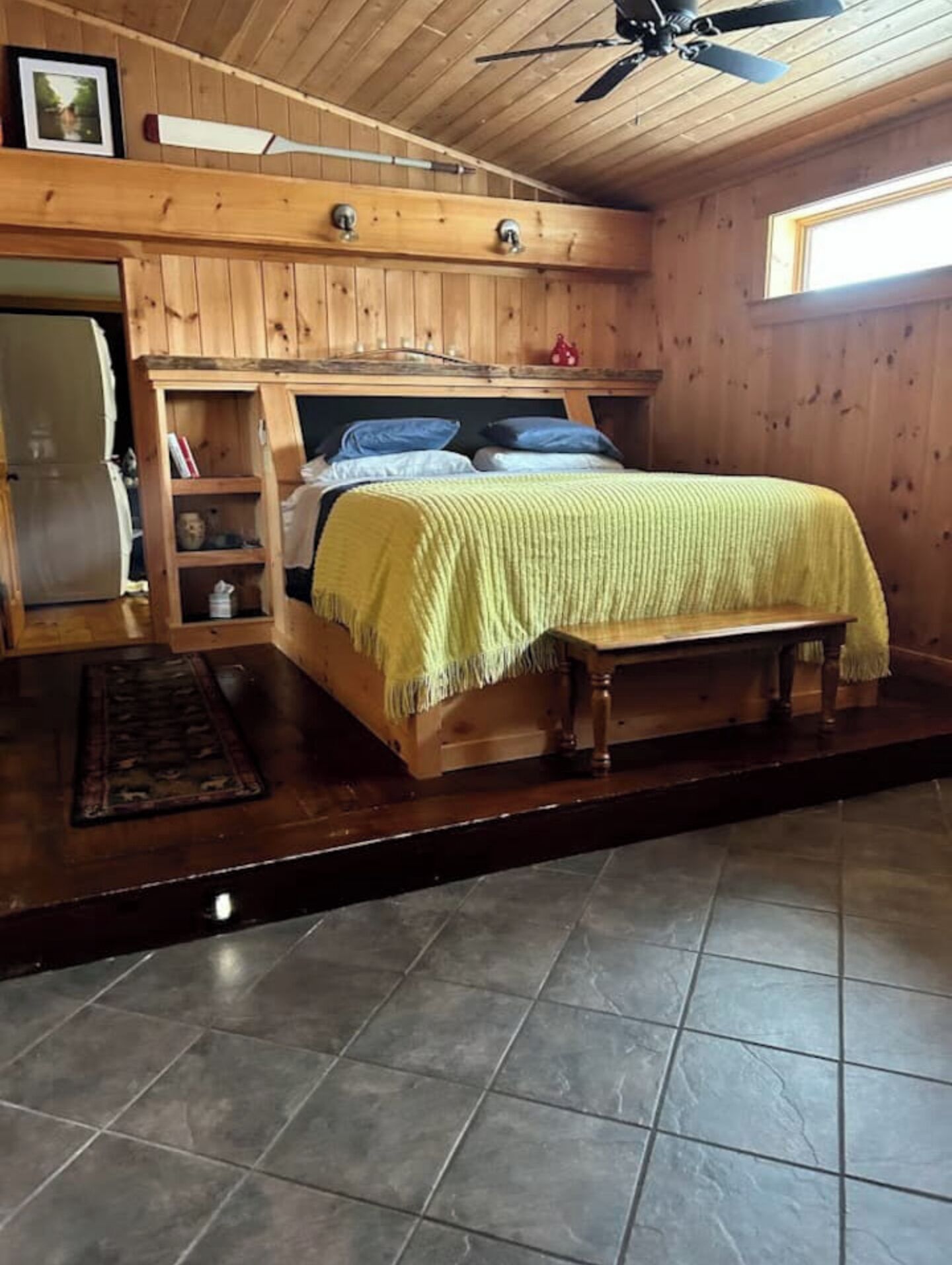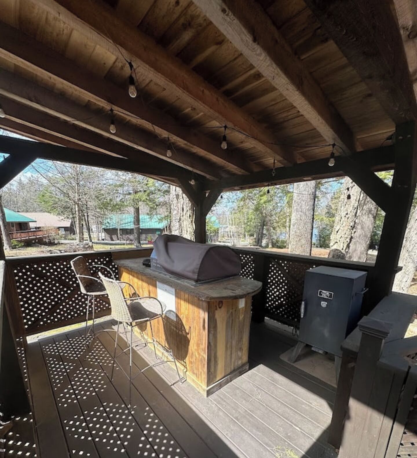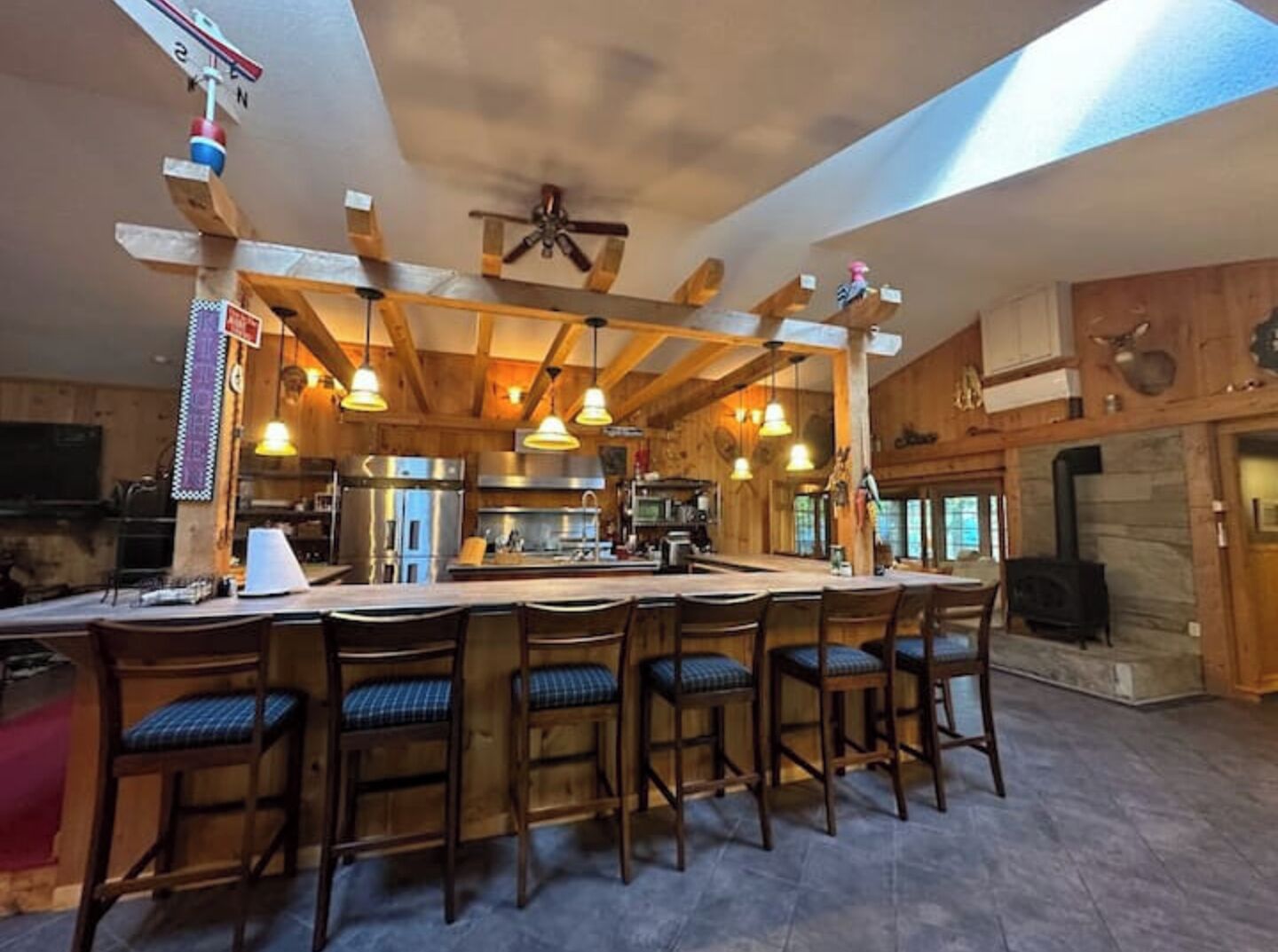 Luxury Embden Lodge Located on pristine Embden Pond, this home is perfect for your whole family (or two). The home has 4 bedrooms plus a loft and three season porch which sleeps up to 14 people. The chef's kitchen is the focal point of the home with seating for 10 around the counter plus two dining tables. There are two sitting areas in the home with large screen TVs and a large porch. Outdoors, there is a deck with bar area and grill as well as a wood fire pit. There is also a boat slip available.