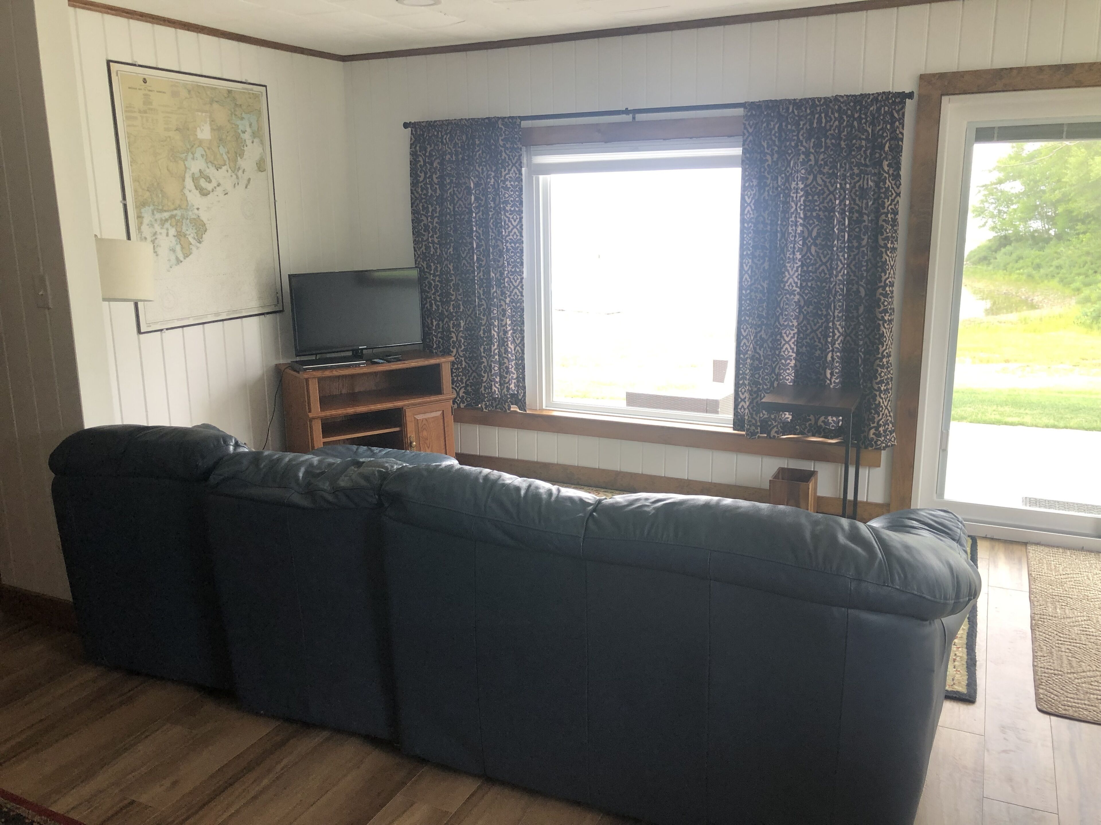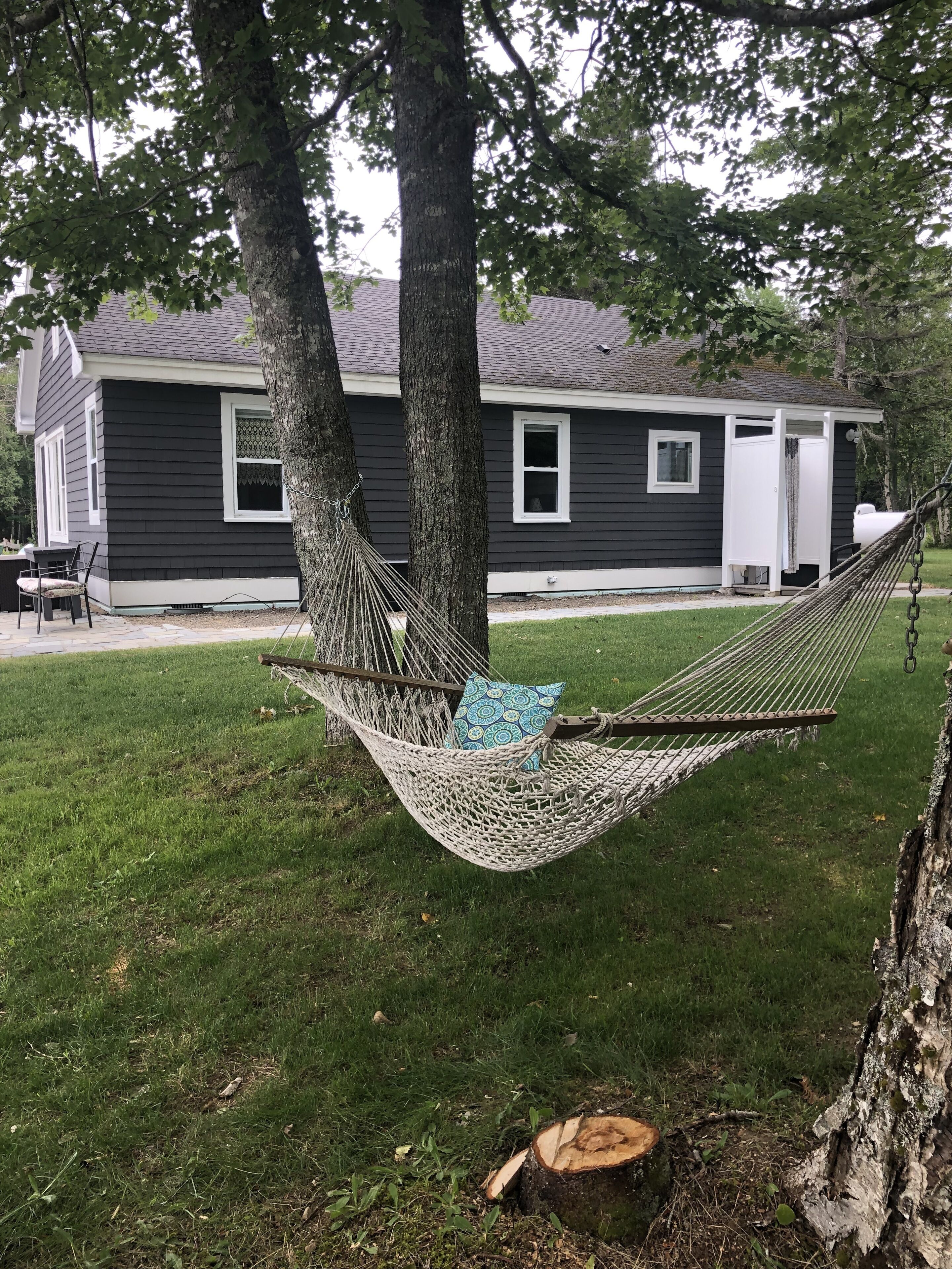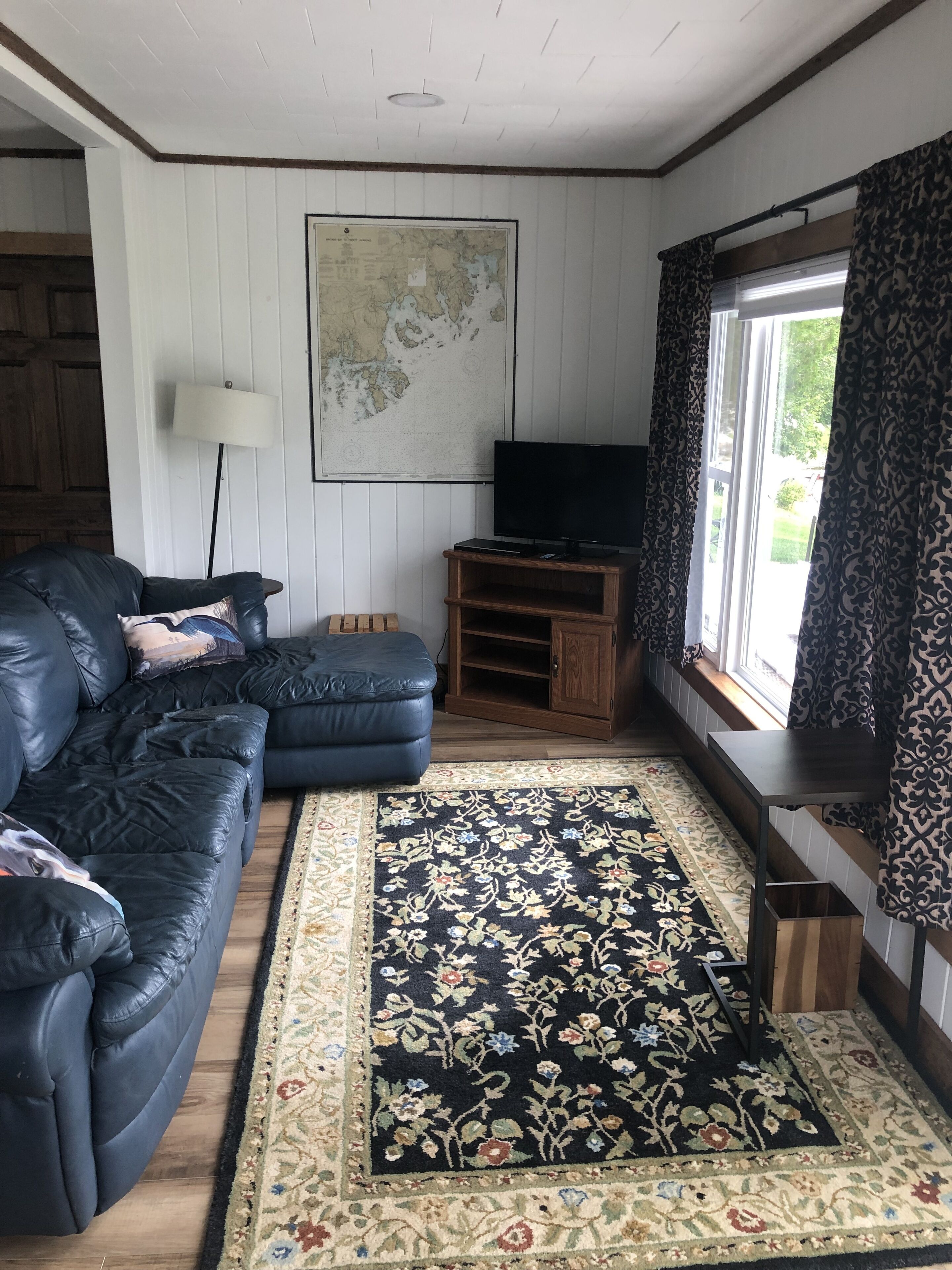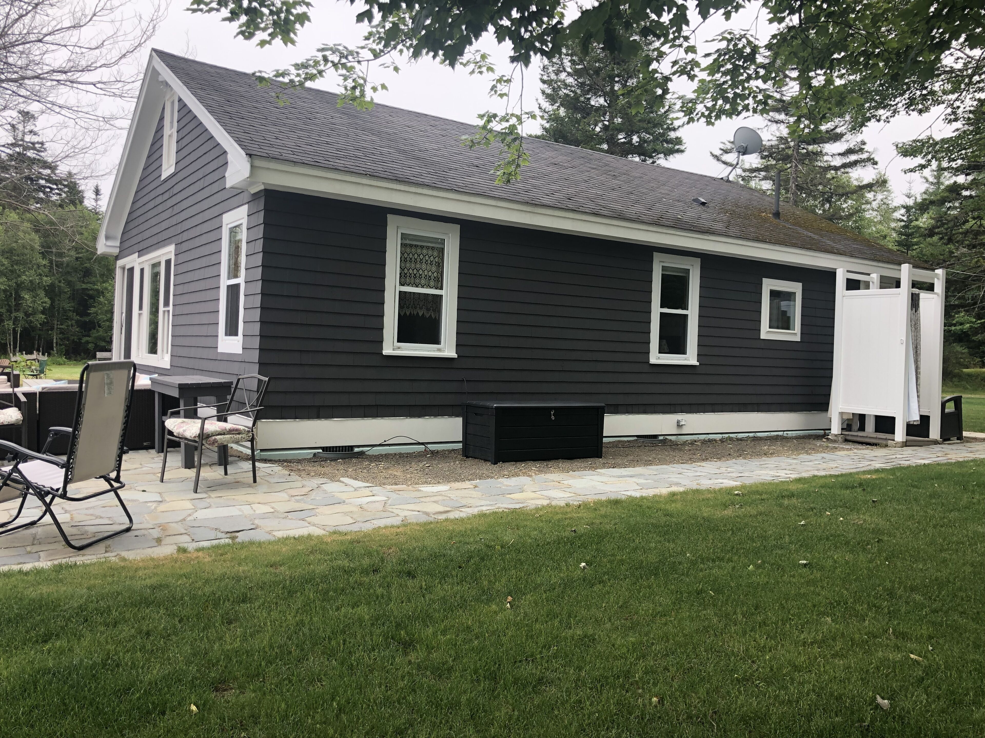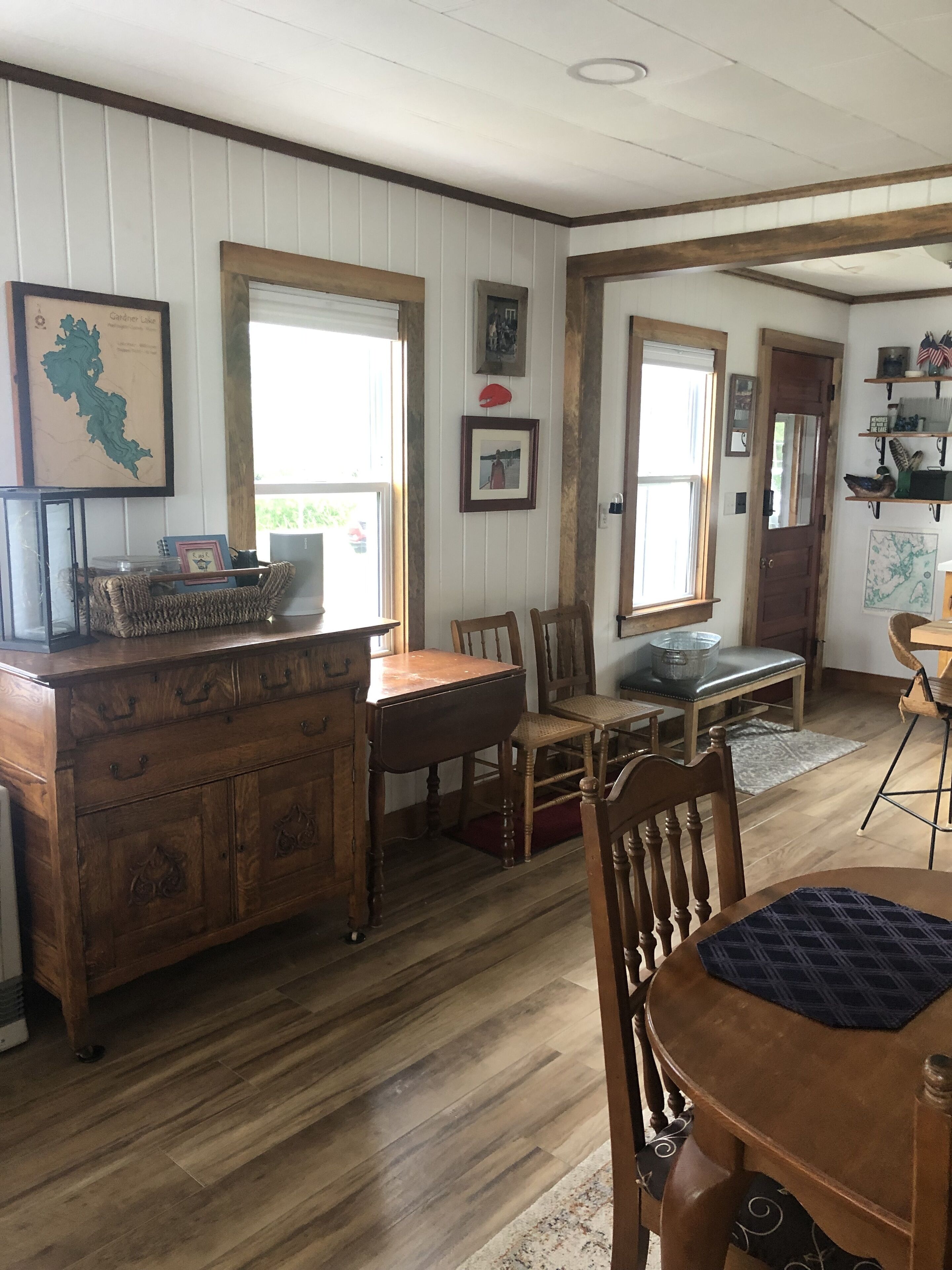 Down East Maine: Gardner Lake Living - Sunshine Lane Charming renovated four season camp a stones throw away from the water. Private peninsula and a sandy beach with lots of frontage. Outdoor shower, patio area, and large lawn. Large open living space, new bathroom, new flooring, kitchen island. Enjoy view from living room through oversized window and sliding glass door overlooking the water and patio area. Take in the sunrise or watch the numerous wildlife in the area (Loons, Eagles, Osprey to name a few) with a fresh cup of coffee from the cabin kitchen, living room or patio area. Camp is close to Route 1 and is close to town but offers privacy on over 2 acres. Supplemental RV utilities (50 Amp service) is available for an extra fee. 2 Bedrooms, one with full sized bed and second bedroom with two twin beds, and a couch with pull out bed to accommodate occupants.