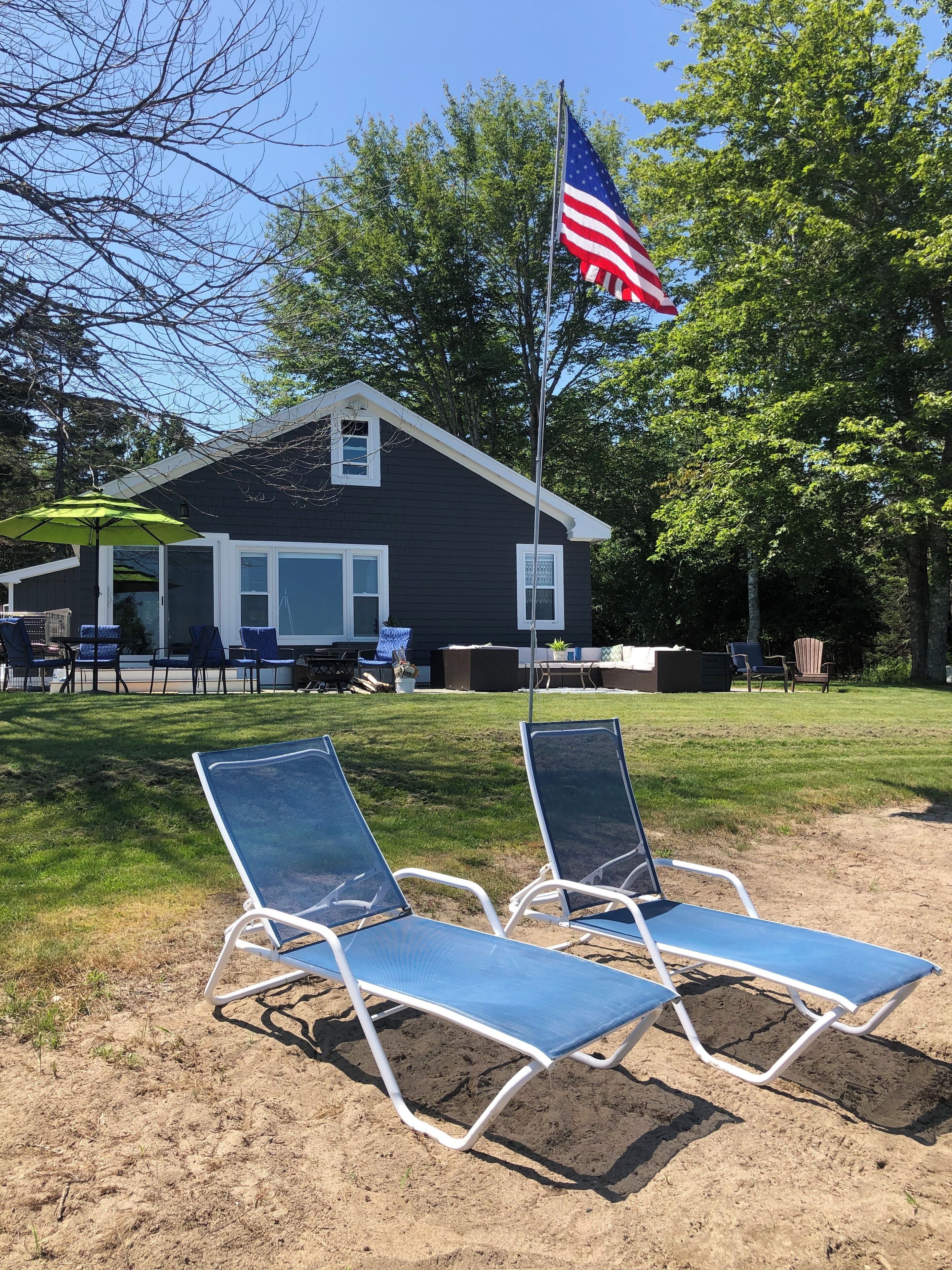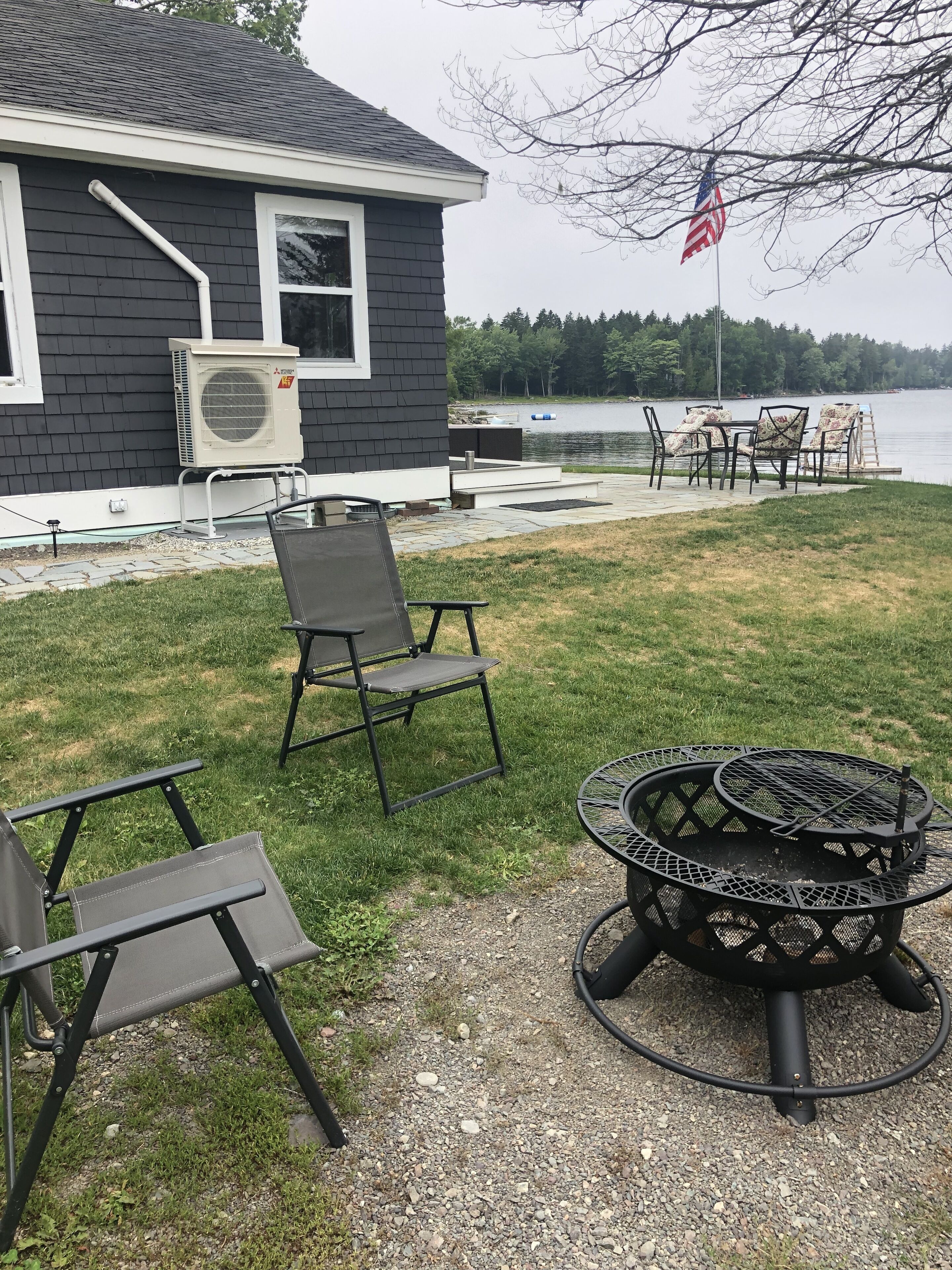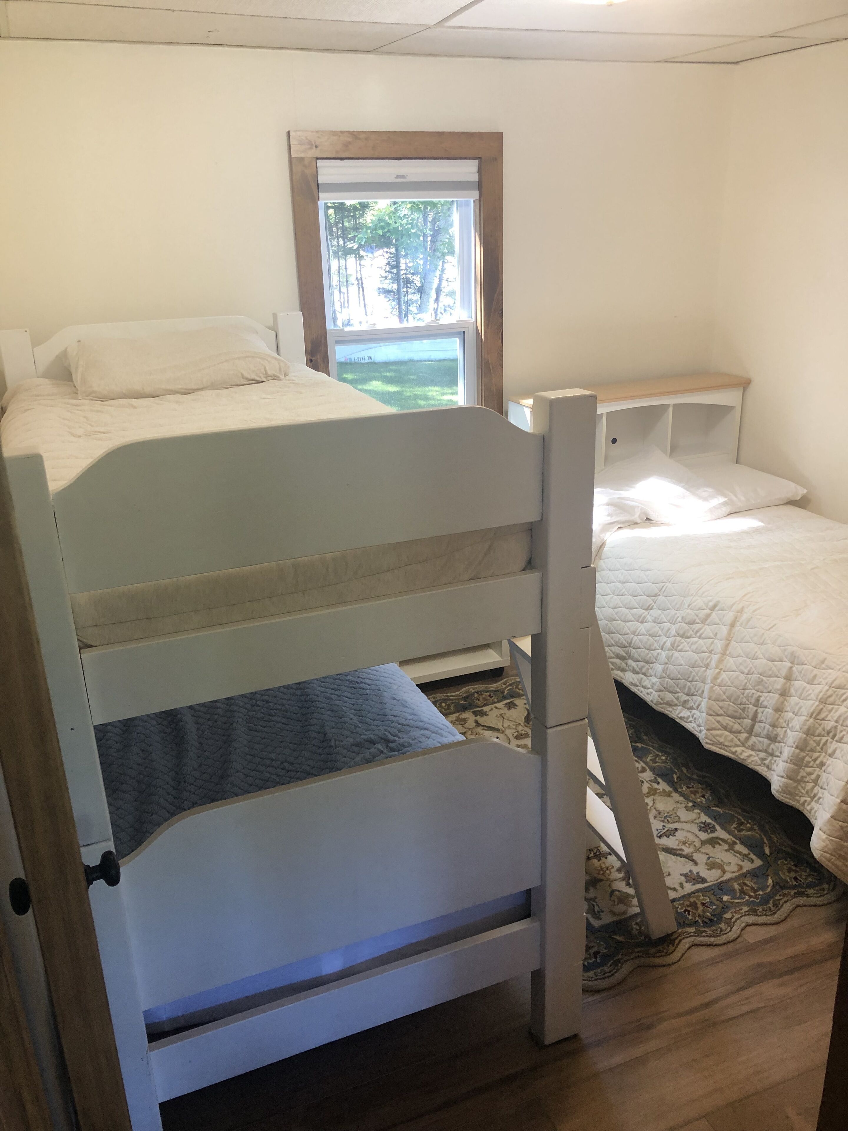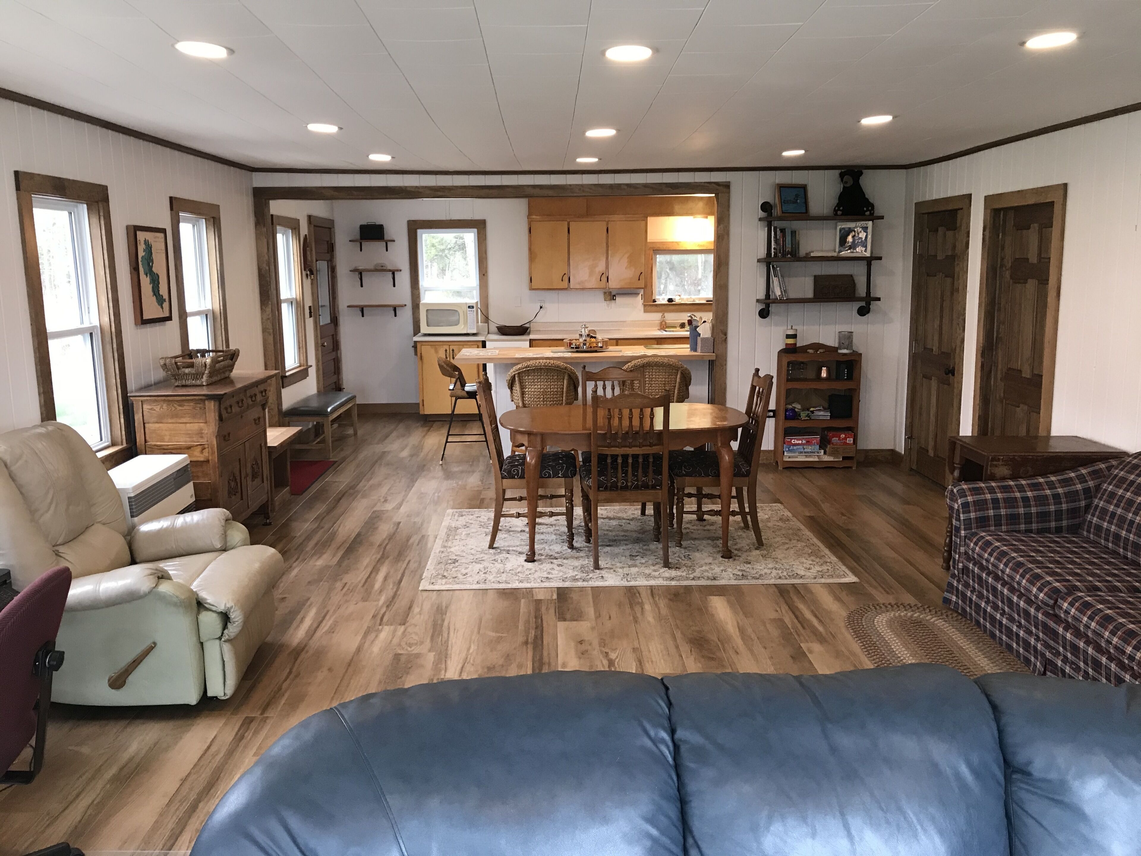 Down East Maine: Gardner Lake Living - Sunshine Lane Charming renovated four season camp a stones throw away from the water. Private peninsula and a sandy beach with lots of frontage. Outdoor shower, patio area, and large lawn. Large open living space, new bathroom, new flooring, kitchen island. Enjoy view from living room through oversized window and sliding glass door overlooking the water and patio area. Take in the sunrise or watch the numerous wildlife in the area (Loons, Eagles, Osprey to name a few) with a fresh cup of coffee from the cabin kitchen, living room or patio area. Camp is close to Route 1 and is close to town but offers privacy on over 2 acres. Supplemental RV utilities (50 Amp service) is available for an extra fee. 2 Bedrooms, one with full sized bed and second bedroom with two twin beds, and a couch with pull out bed to accommodate occupants.