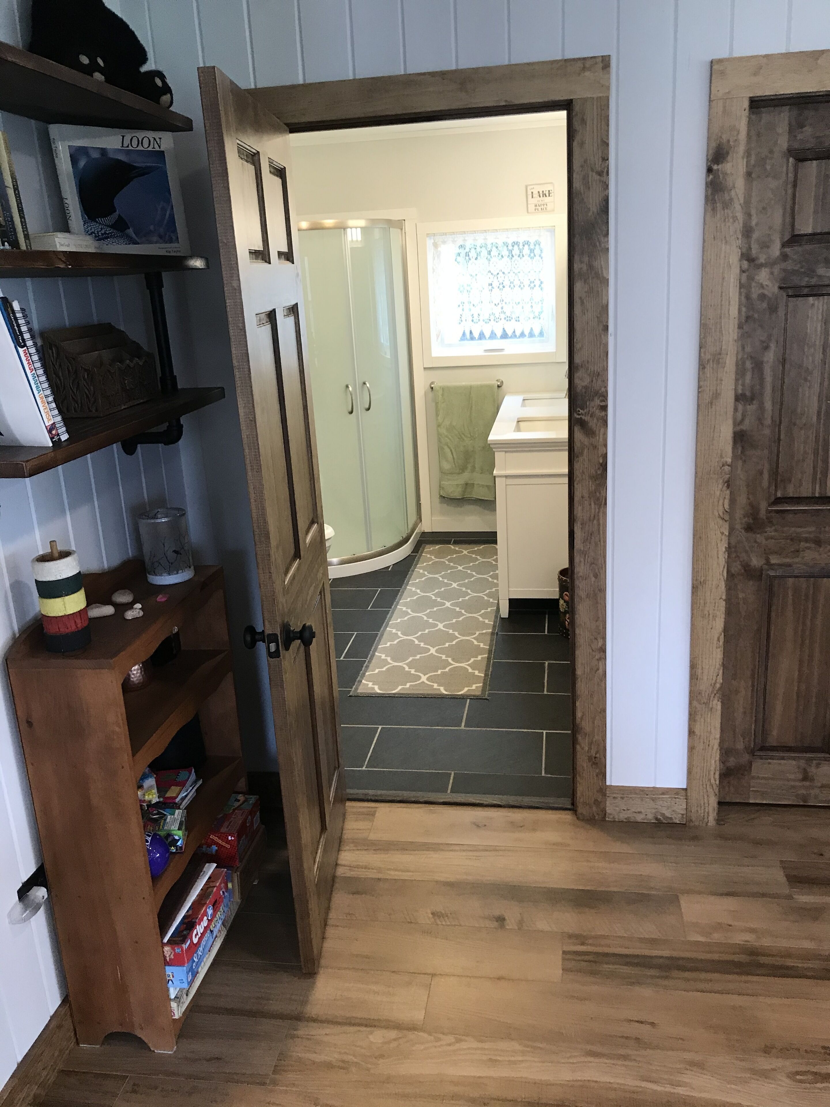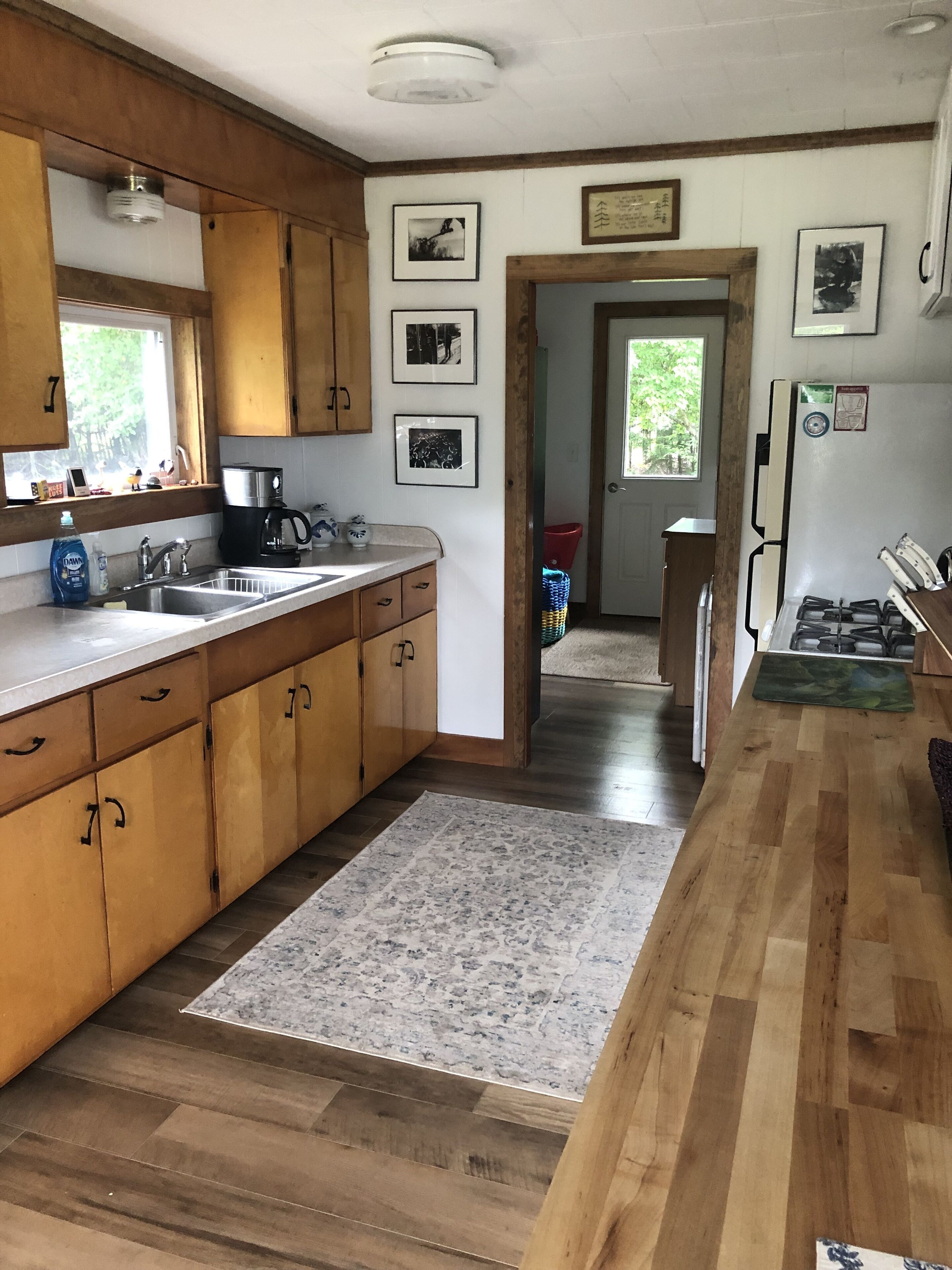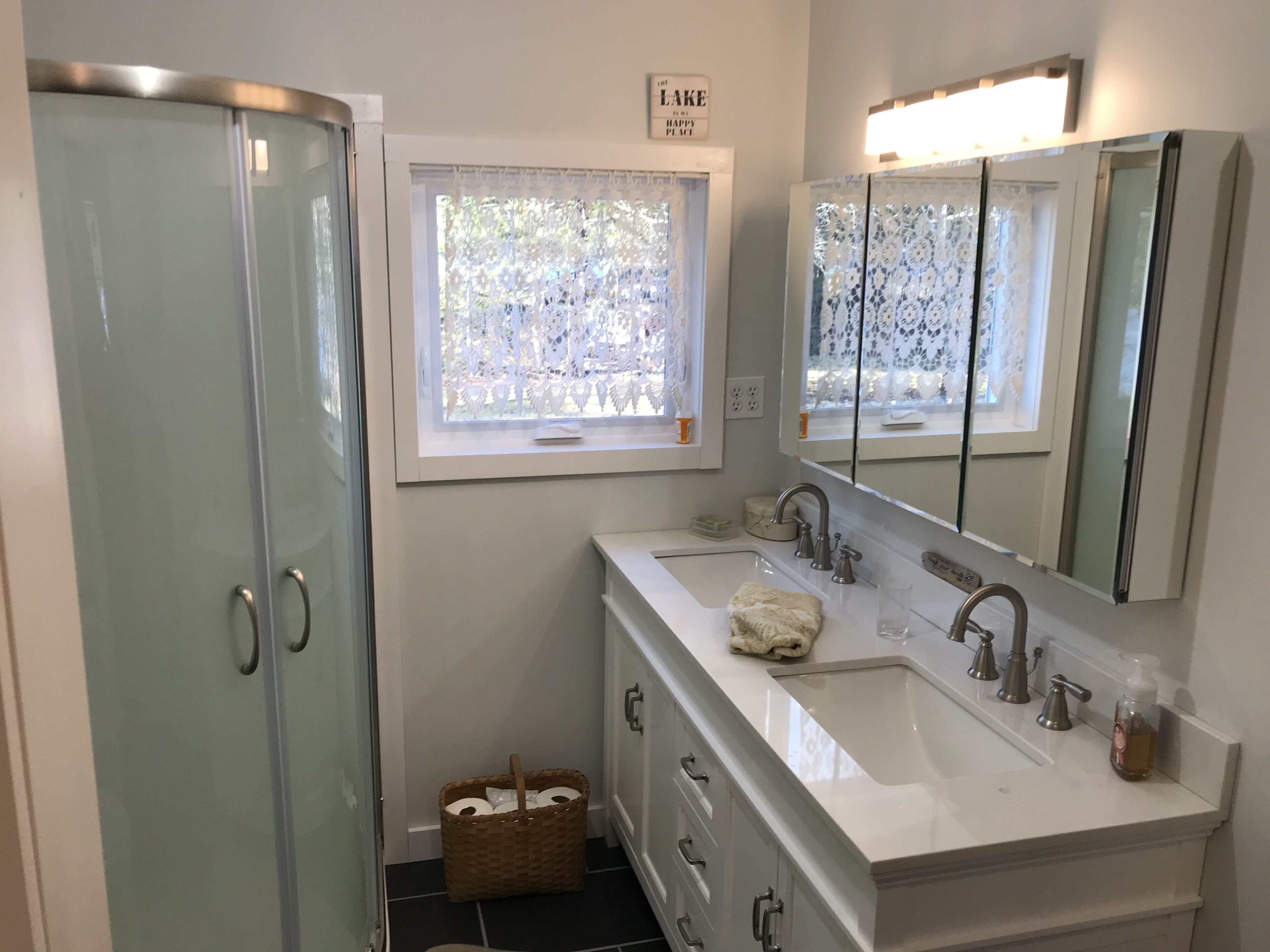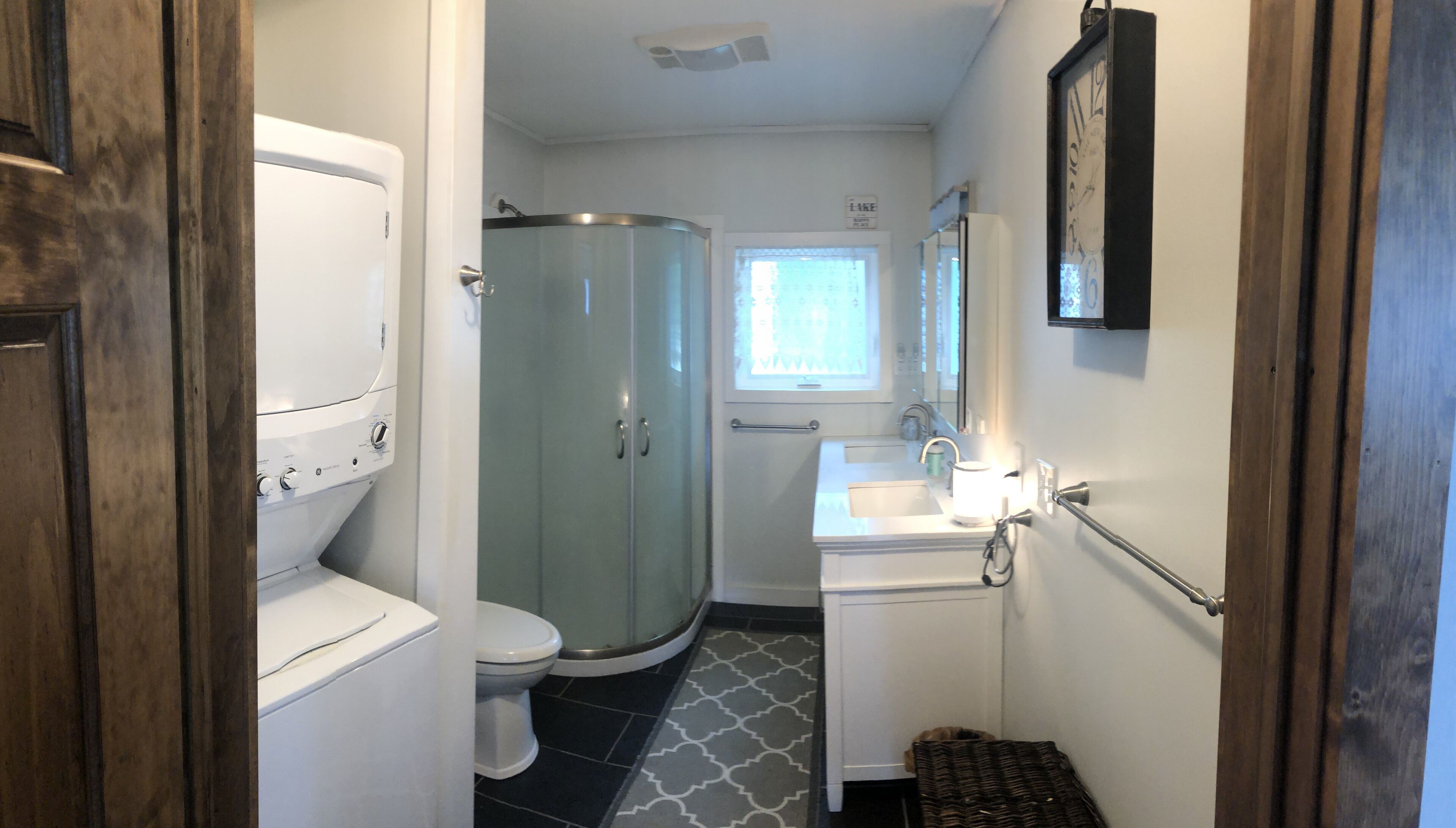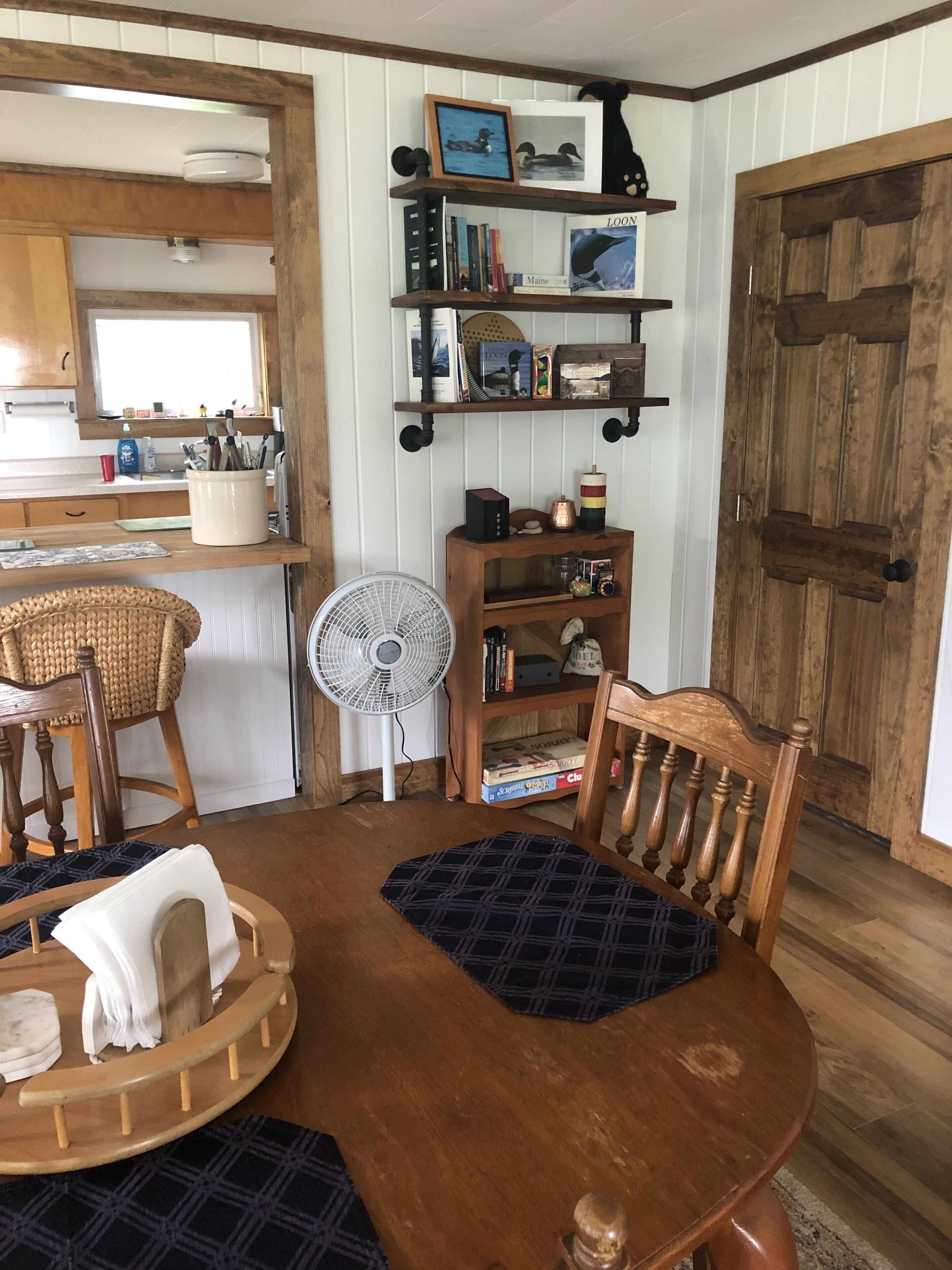 Down East Maine: Gardner Lake Living - Sunshine Lane Charming renovated four season camp a stones throw away from the water. Private peninsula and a sandy beach with lots of frontage. Outdoor shower, patio area, and large lawn. Large open living space, new bathroom, new flooring, kitchen island. Enjoy view from living room through oversized window and sliding glass door overlooking the water and patio area. Take in the sunrise or watch the numerous wildlife in the area (Loons, Eagles, Osprey to name a few) with a fresh cup of coffee from the cabin kitchen, living room or patio area. Camp is close to Route 1 and is close to town but offers privacy on over 2 acres. Supplemental RV utilities (50 Amp service) is available for an extra fee. 2 Bedrooms, one with full sized bed and second bedroom with two twin beds, and a couch with pull out bed to accommodate occupants.