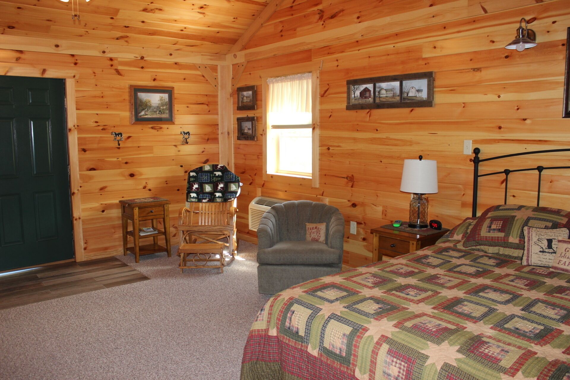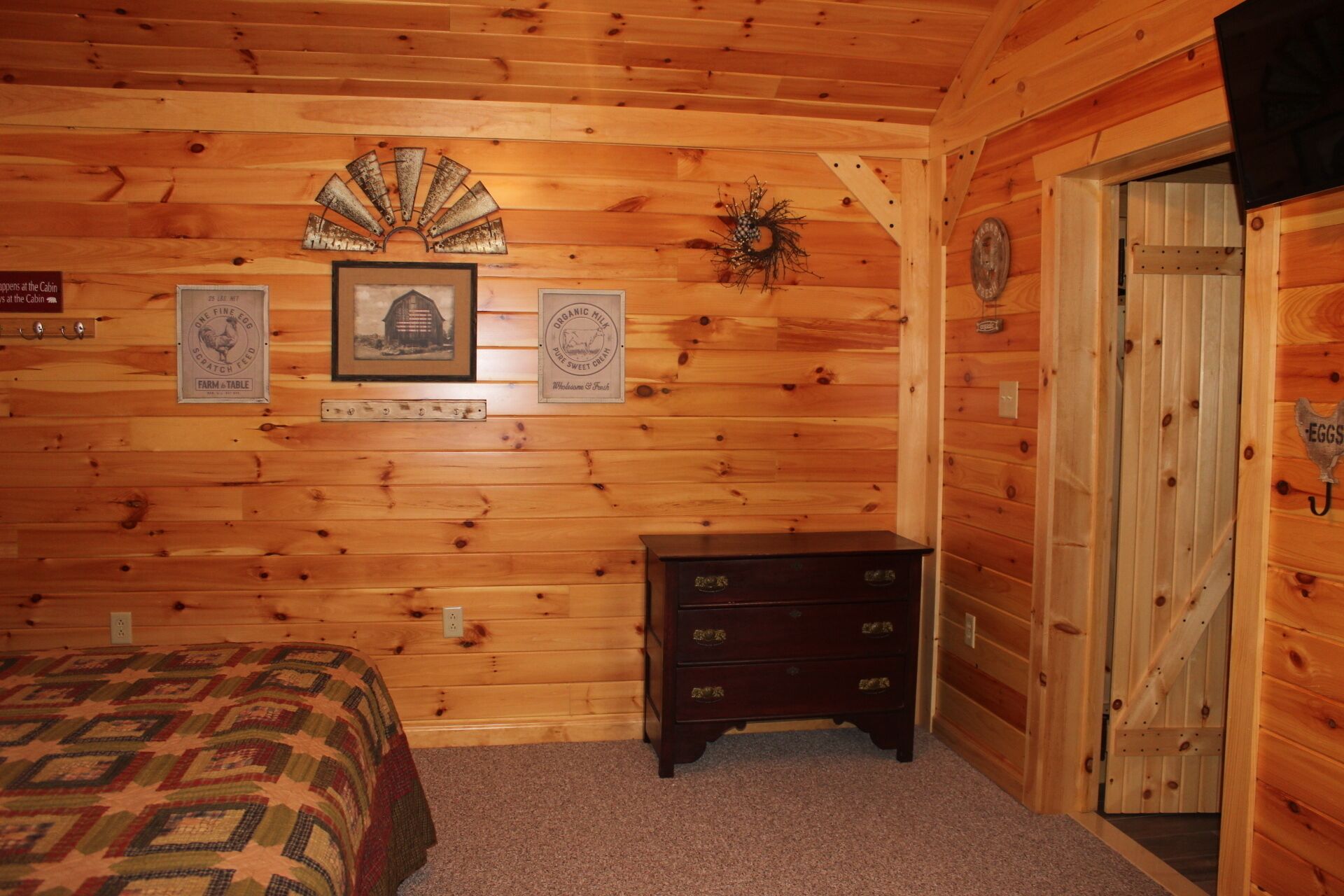 1/2 of a double cabin with one king sized bed (sleeps 2) Reconnect with nature at this unforgettable escape. Unplug yourself, leave your stress behind and immerse yourself in unparalleled relaxation. This is where the true love of camping meets a comfortable bed at the end of the day. Enjoy watching the stars from your private patio. Stay in a clean and cozy luxury cabin in Western Maryland with private parking surrounded by relaxing mountain country views. Located within 2 hours of DC, Baltimore and Pittsburgh, this is a perfect weekend getaway. This knotty pine log cabin unit is 1/2 of a double cabin. It has one king-sized bed, a rocking chair and a swivel comfy chair. This luxury log cabin features a casual knotty pine interior with a cathedral ceiling, contemporary air conditioning and heating, ceiling fan, a dining area, kitchenette, dish network television, and private bathroom. The cabin also has a small refrigerator, coffee maker, coffee condiments, and microwave. Our modern private bathrooms have a large size stand-up shower (no bathtub). Each cabin has a private front porch with Maryland mountain views that is perfect for relaxing, as well as your own private parking area beside each cabin. For those that cannot do without the internet, we also provide free wireless internet service. The 7C's cabins are surrounded by Maryland State Parks and outdoor recreation areas such as Rocky Gap State Park where you can enjoy Lake Habeeb, hiking and biking trails or Green Ridge State Forest with hiking trails, rafting on Fifteen Mile Creek, hunting and fishing. With easy on and off access to I-68, 7C's Lodging is also a great home base for touring the mountains of Allegany County by motorcycle or ATV. The cabins are just a short drive to Cumberland MD where you can find local restaurants and visit popular Western Maryland attractions, ride the historic Western Maryland Railroad or take in entertainment and games of chance at The Rocky Gap Casino. The property has 7 cabins. Please inquire about reserving multiple cabins for getting friends and family together. Guest access -Self check in and check out -Private entrance and parking -Private patio Free Wifi access Check in: 3PM Check out: 11AM Check out instructions: Turn all the lights and heating/AC unit off Drop the trash at the big dumpster Lock the doorÂ