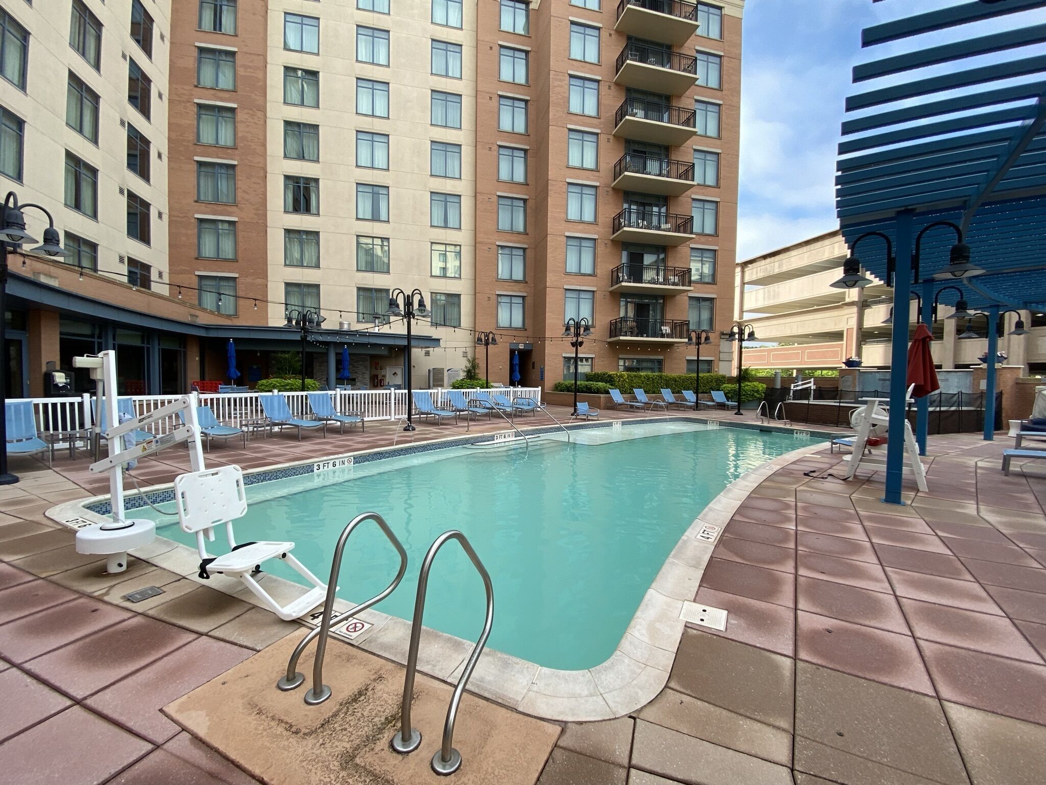Comfortable Club Wyndham National Harbor, 2 Bedroom Deluxe Suite This is a full-service resort. Your check-in procedures will model that of a hotel and your room number will be assigned during check in.EXPERIENCE LUXURY.Offering the best hospitality, Club Wyndham National Harbor focuses on the ideas of luxury, pleasure, enjoyment and experiences for the family to feel right at home. Home to an impressive marina, National Harbor is a gateway to all your waterfront thrills, like sightseeing cruises, boating excursions and fishing tours with Segway of National Harbor and Onboard Washington DC Tours. For here at this countryside paradise, there's never a dull moment!Approximately 1,052 square feet, this spacious Two- Bedroom Deluxe Suite features 1 King Bed in the master bedroom, 2 Double Beds in the guest bedroom, 1 Queen Sleeper Sofa in the living room including a kitchen, and 2 bathrooms. Maximum of 8 occupants. Additional amenities include: Ceiling Fan, Hairdryer, In Room Safe, DVD Player, Stereo, Television, Wi-Fi Internet Access and Jetted Tub.The person checking in must be 21 years of age (or older). With this notion, please prepare a VALID ID and credit card in your name. A $100 Pre-Authorization from any major credit card upon checking in is required. After purchase you will receive an email confirmation showing your name on the reservation as the guest checking in within 14 days of check in date. However, if you would like to change the name of the person checking in after you have provided this information, there will be a $99.00 name change fee. Any damages will be charge upon check-out.The check- in time is 4 p.m. and check out time is 10 a.m. The nearest airport to Club Wyndham National Harbor is Ronald Reagan National Airport which is 4.97 miles by car respectively.Hence, if you have any concerns, our office hours are always open 24 hours respond to your requests. For here at Club Wyndham National Harbor, we ensure that your stay is comfortable and well-served to your satisfaction.*** WiFi Policy ***The modern traveler will certainly appreciate the complimentary high speed Wi-Fi access throughout the resort.*** Parking Policy ***Self parking is available at the St. George Parking Garage located offsite adjacent to the resort for $20 per day. Parking facility is not affiliated with the resort. Parking rates subject to change without notice.*** Pet Policy ***No pets allowed.*** Smoking Policy ***No smoking inside including electronic cigarettes, unless if it's in a designated area.*** Housekeeping Policy ***Daily housekeeping is not included and may be added for an additional fee.*** Other Notes ***This resort offers Braille signage (i.e. elevators, room numbers), handicap parking, first floor access ramps, and a portable pool lift.In addition, this resort may offer rooms with these special needs features:Some units include lever h angles on all doors, visual doorbells, visual fire alarm, visual phone alert, counter-height microwave, front control stove or range, roll-under bathroom sink, roll-under kitchen sink, roll-in shower, handheld shower head, grab bars in shower, grab bars in tub, grab bars around toilet, front door wide-angle wheelchair height peephole, and Braille signage for room numbers.*** Helpful Hints ***Complimentary shuttle service from National Harbor to Old Town Metro has been discontinued.Some amenities/activities are seasonal and available at an additional charge.Each guest floor also has a shared laundry facility.