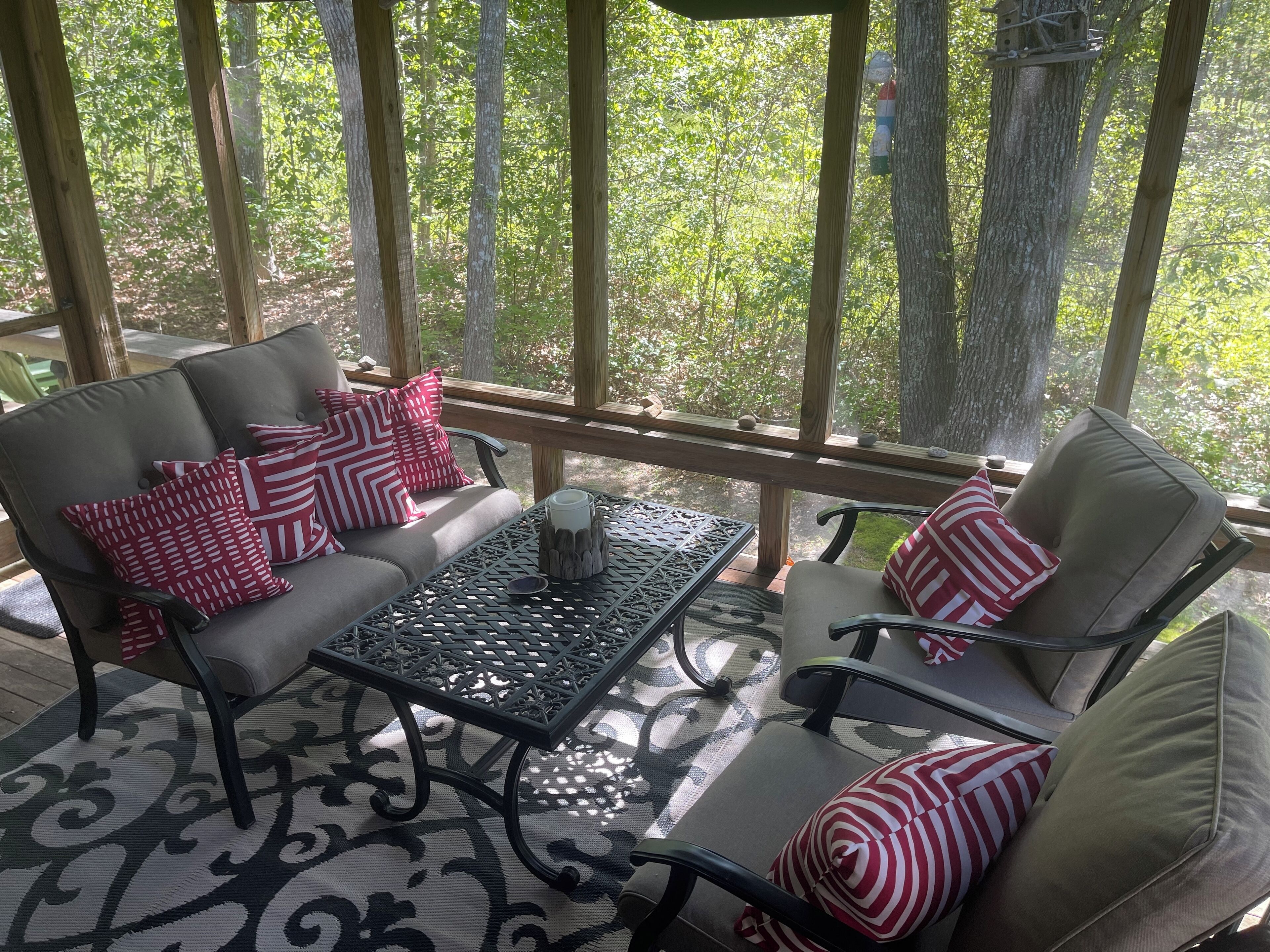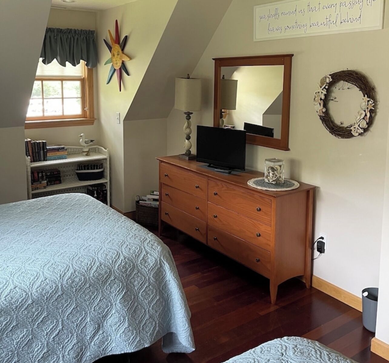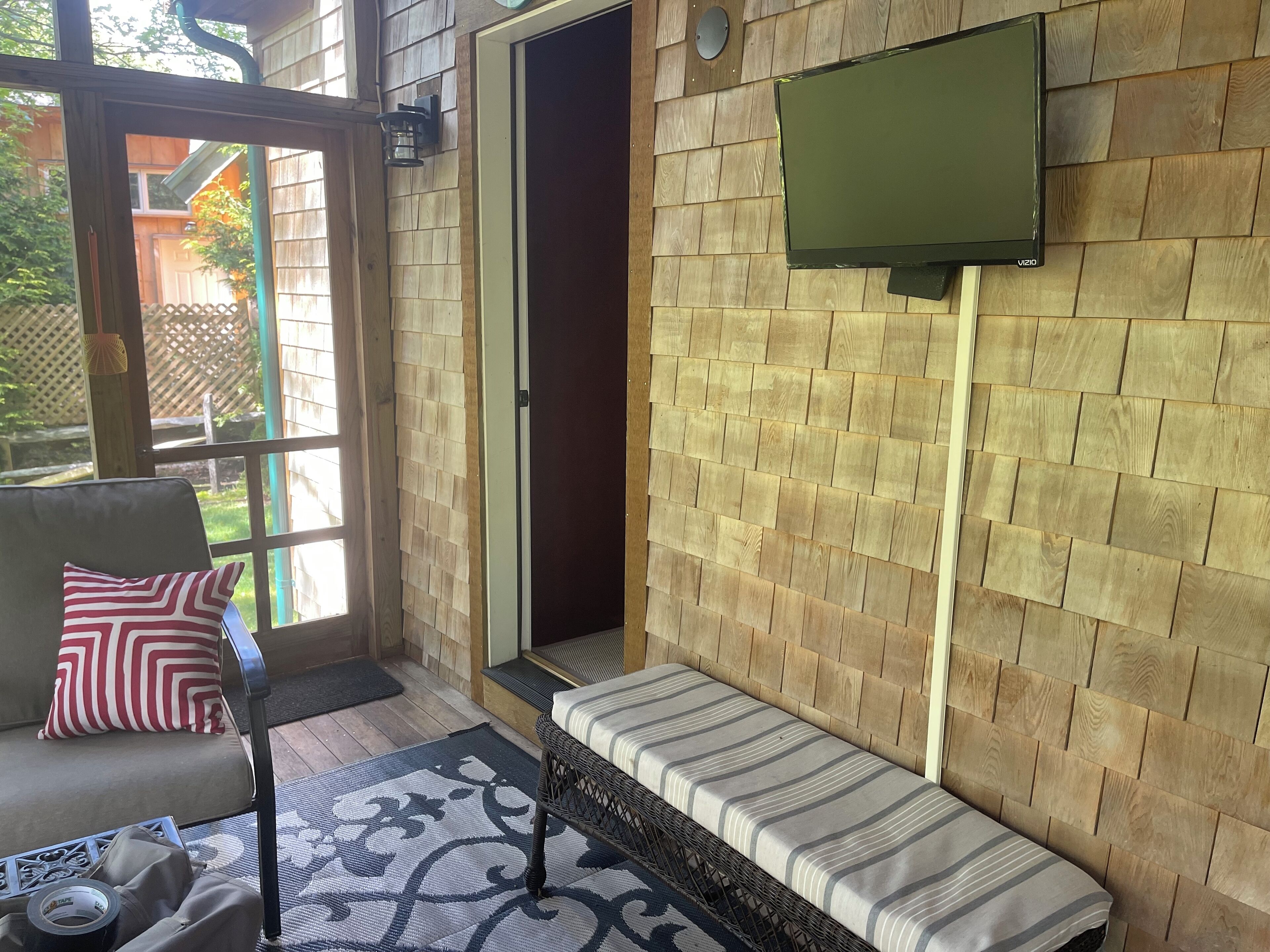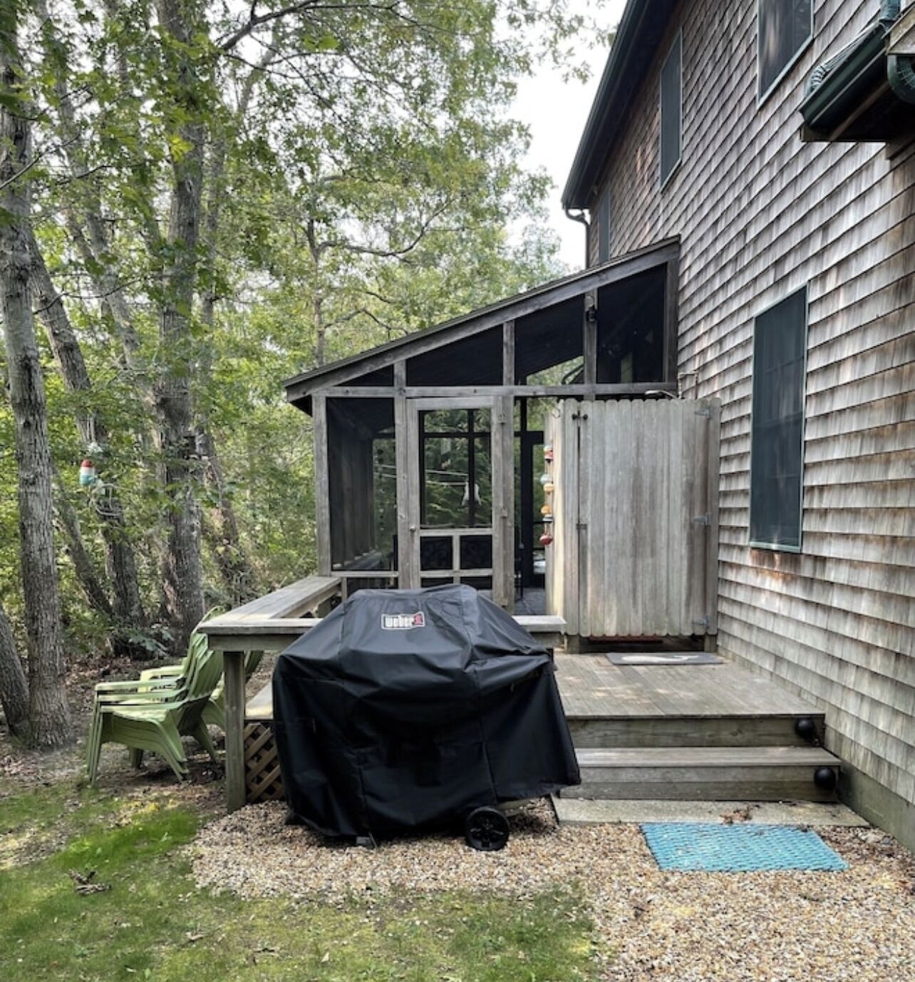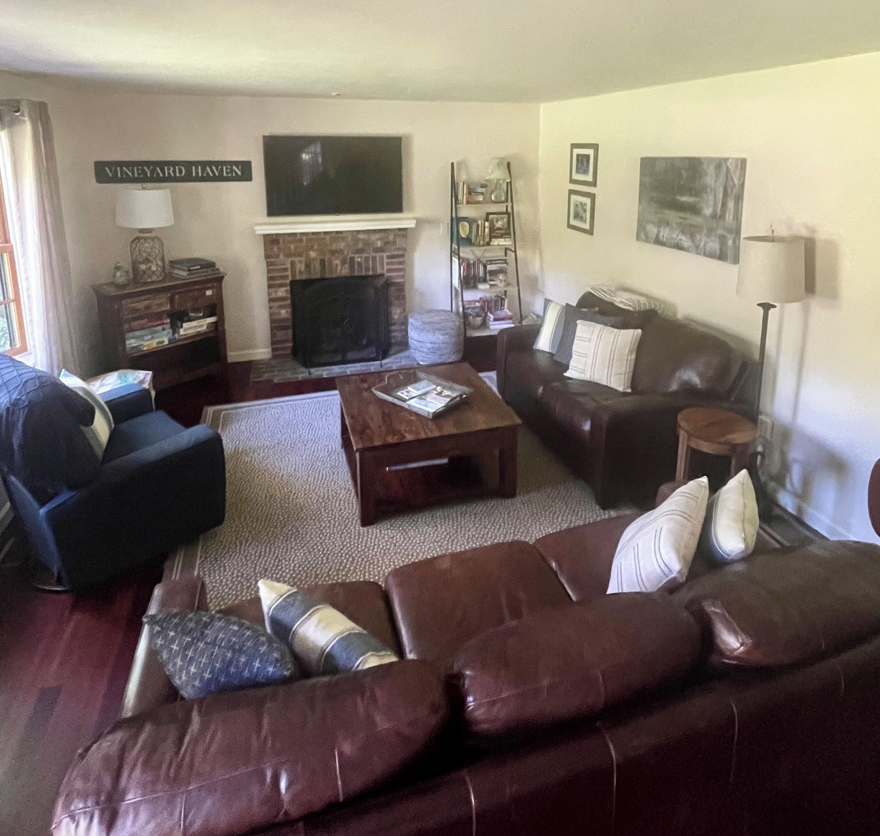 Vineyard Haven, Close to town and Lake Tashmoo Beautiful home located at the end of cul de sac in a quiet residential neighborhood. Nicely furnished interior with central air and heat, bedroom ceiling fans and hardwood floors throughout.First floor: full kitchen with bar seating for 3, dining area with seating for 6, living room, bathroom w/ shower, bedroom (queen bed).Second floor: full bath and 2 bedrooms (king bed, 2 double beds). Private shaded yard (0.3 acres) with a benched fire pit (wood included) and plenty of room for yard games. Also outdoors is a picnic table, small benched deck, gas grill and outdoor shower. Enjoy morning coffee and evenings on a furnished screened-in porch w/ ceiling fan and television.Additional amenities: Infant Pack ‘n Play/sheets, child gate, luggage racks, indoor games (adult and kids), books (adult and kids), outdoor kids games and corn hole, beach towels, beach chairs (6), beach umbrella, bodyboards.