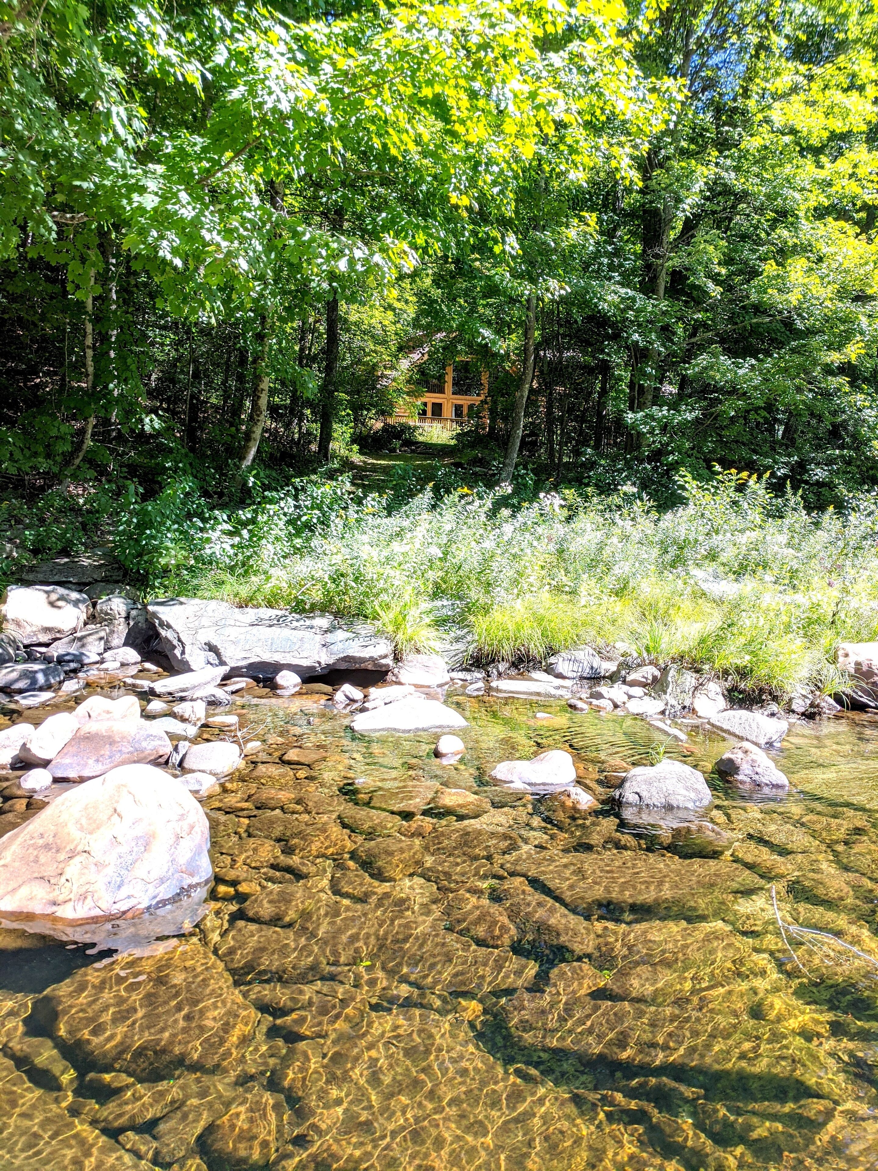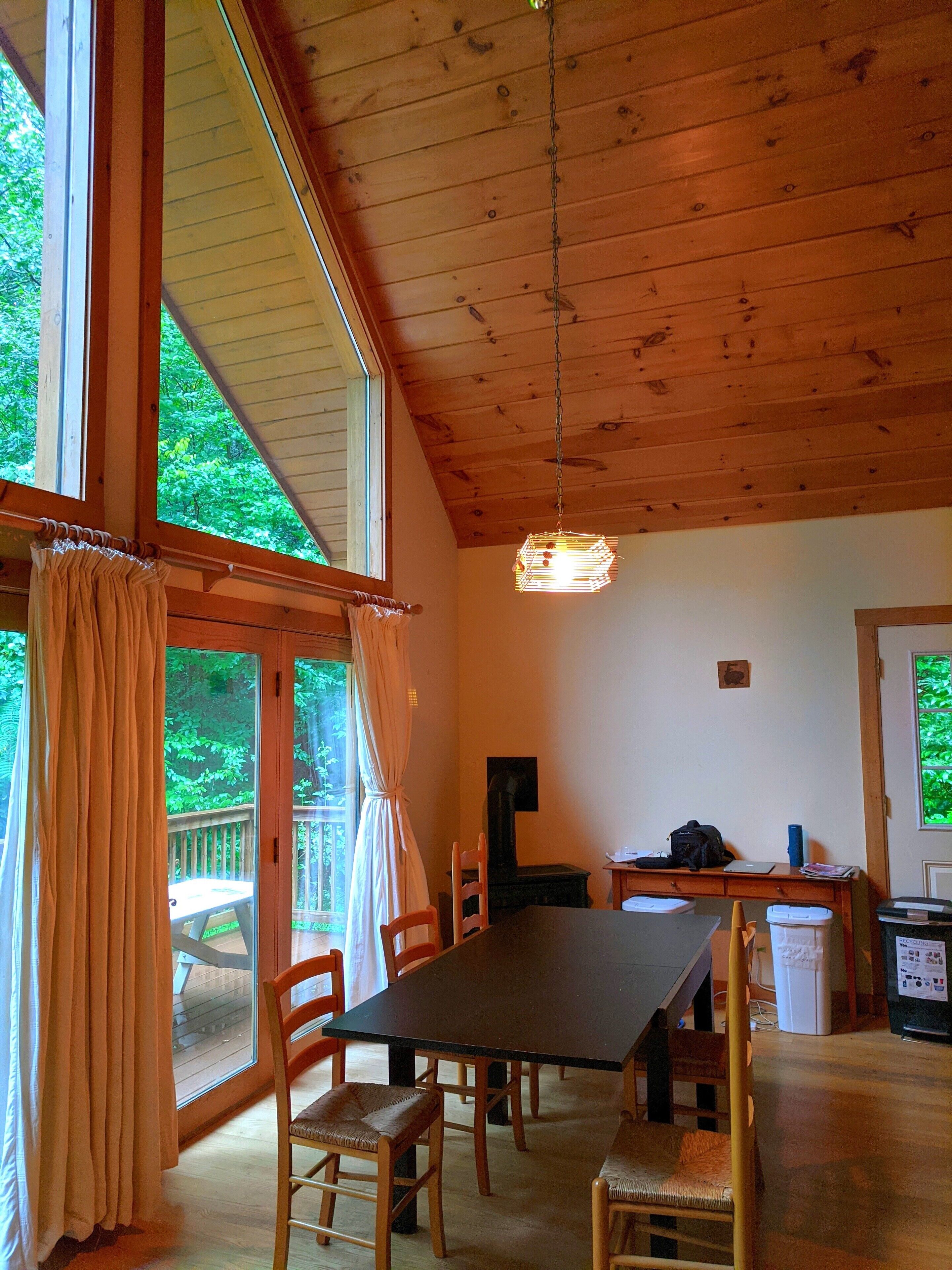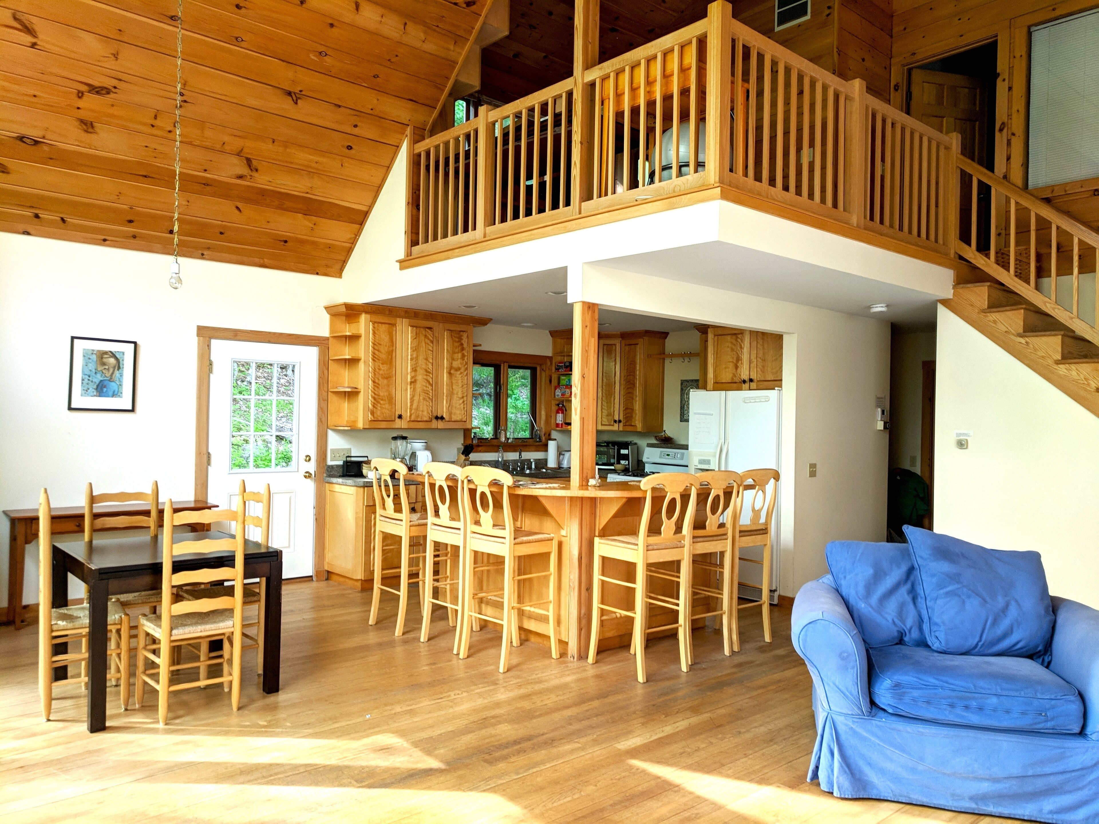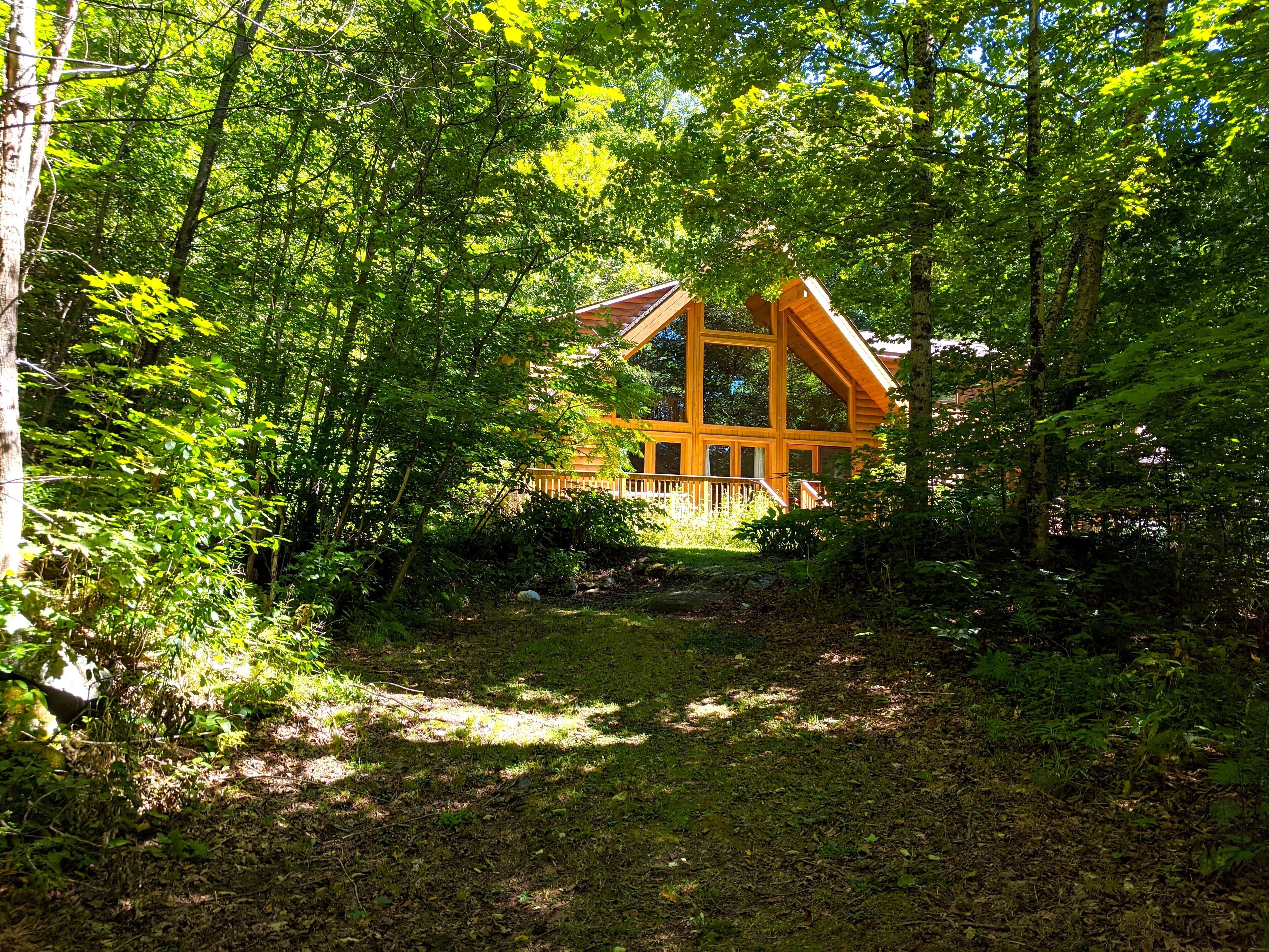 Beautiful 3BR river view, huge glass wall Log House -2200 sq/ft Sunny, specious log house on the river. The home has beautiful forest and river views through huge glass wall which is from 1st floor to 2nd floor ceiling facing towards south. Quiet and peaceful nature around including 44 acre of private forest and 1000 ft of river. Enjoy delicious water from the well, coziness inside and wildness outside of the house. There are 1 master bedroom, 1,5 bathroom and reading/working space upstairs with beautiful view of river and forest. Sunny living/dining/ kitchen, 2 bedrooms and 1 bathroom are down stairs. We have fiber optic cable installed for fast wifi internet connection. You are welcome to use any kitchen equipments including dishwasher, pots and pans, refrigerator, coffee maker, etc. Laundry washer/dryer room is available, too.Please take off your shoes and use slippers that we provide. No smoking, No pet, No party in the property. We hope your stay will be comfortable and relax. Please let us know if you have any questions.