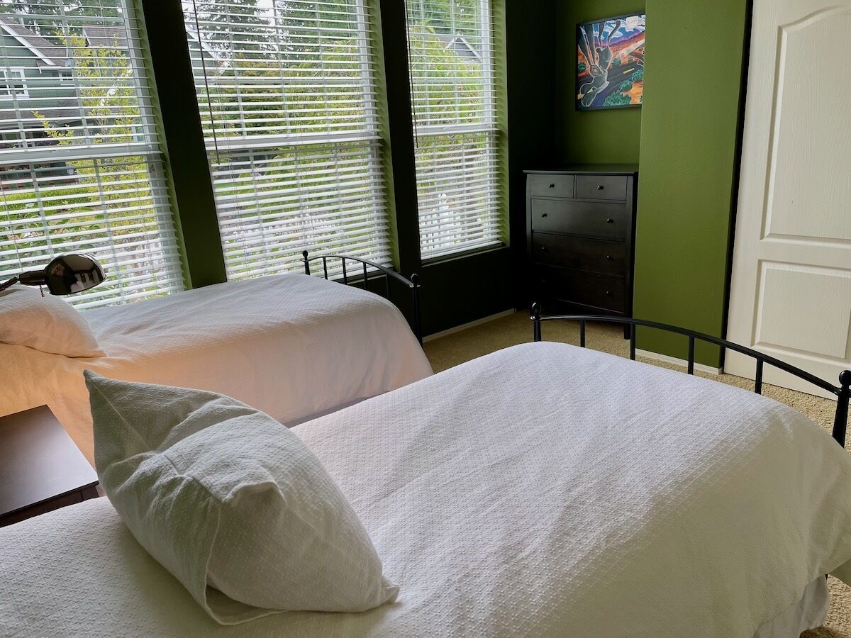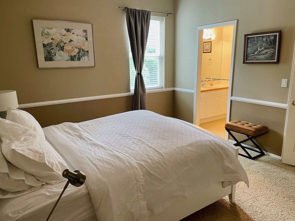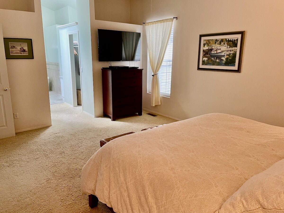 Jewel of Geneva: Tranquil Retreat with Deck and Home Office Discover tranquility in one of Bellingham's safest and quietest neighborhoods. Nestled on a serene dead-end street, this single-story retreat offers unparalleled peace and privacy. Enjoy proximity to Whatcom Lake, where glimpses of serene waters greet you from the kitchen window without the disturbance of passing traffic noise.Sought after for its single-story design, this home ensures ease of movement with no stairs to navigate. The master bedroom boasts a luxurious king-size bed, a flat-screen TV, and an ensuite bathroom complete with a soaking tub, shower, and double sinks. A queen bed graces the second bedroom, while the third bedroom offers twin beds—perfect for families or guests.Experience ultimate comfort with Egyptian cotton bedding and down comforters, ensuring restful nights throughout your stay. Stay productive in the equipped office, featuring a computer screen, printer, and a cozy couch facing the tranquil backyard—ideal for quiet reflection or focused work.Step outside to the large deck, accessible from the living room, master bedroom, and office. Bask in the serene surroundings as you enjoy al fresco dining, morning coffee, or simply unwind amidst the natural beauty of the Pacific Northwest.Additional amenities include a two-car garage and a spacious fenced yard, perfect for outdoor relaxation and play. With landlord approval, pets are welcome to join your retreat. Book your stay for a minimum of two weeks up to one year, with monthly rates available for extended stays. Experience the epitome of comfort and convenience in beautiful Bellingham.