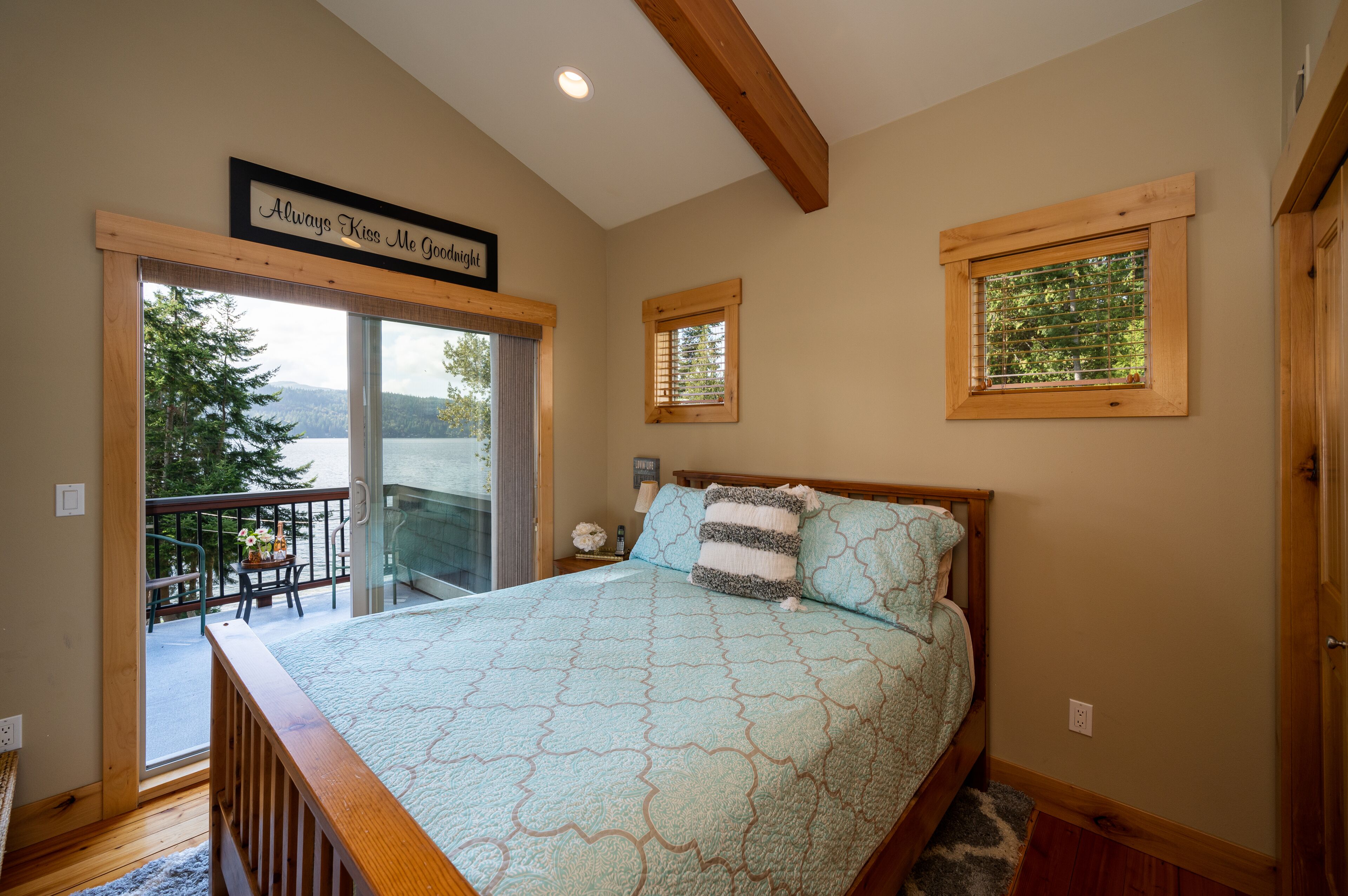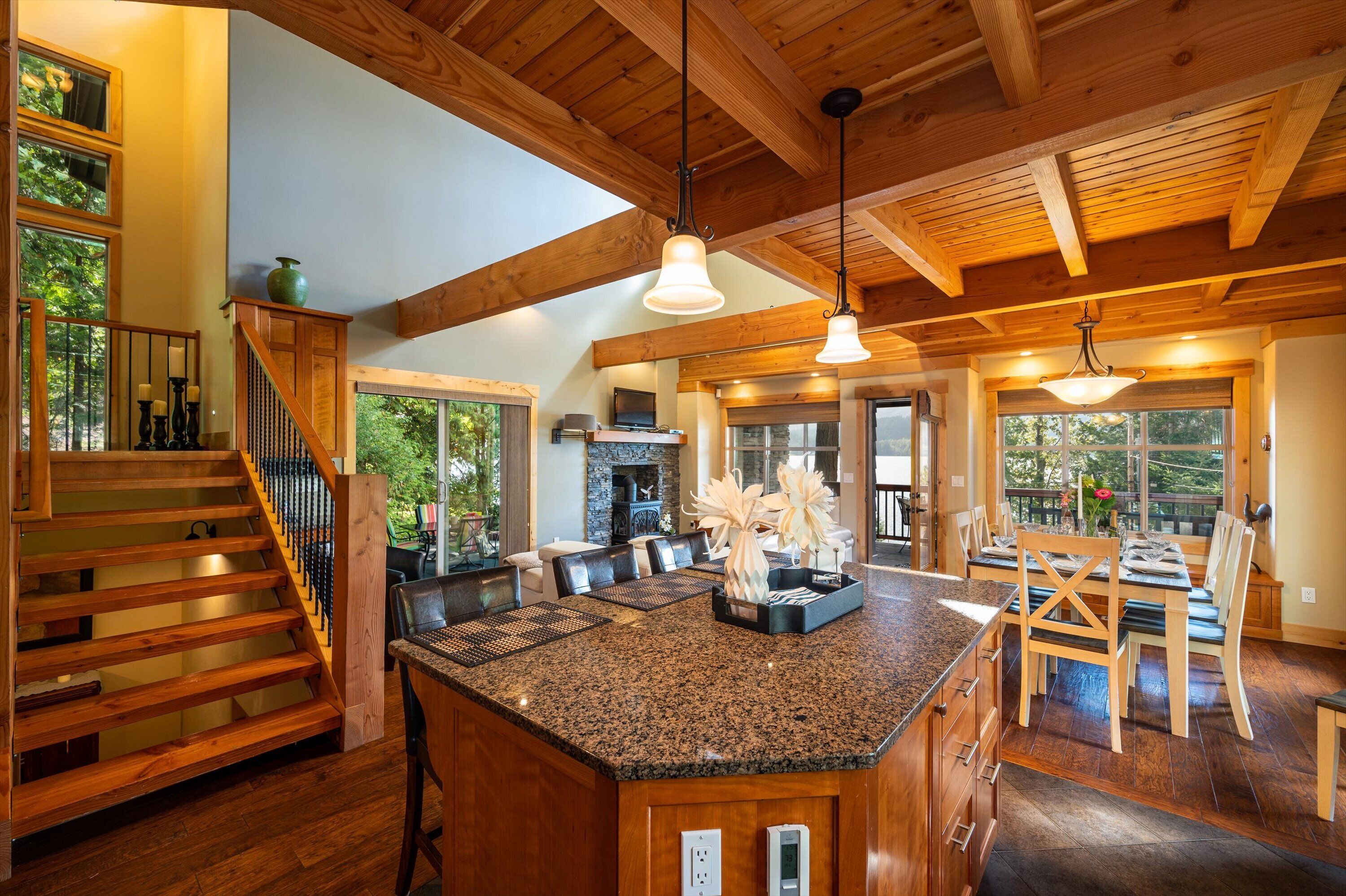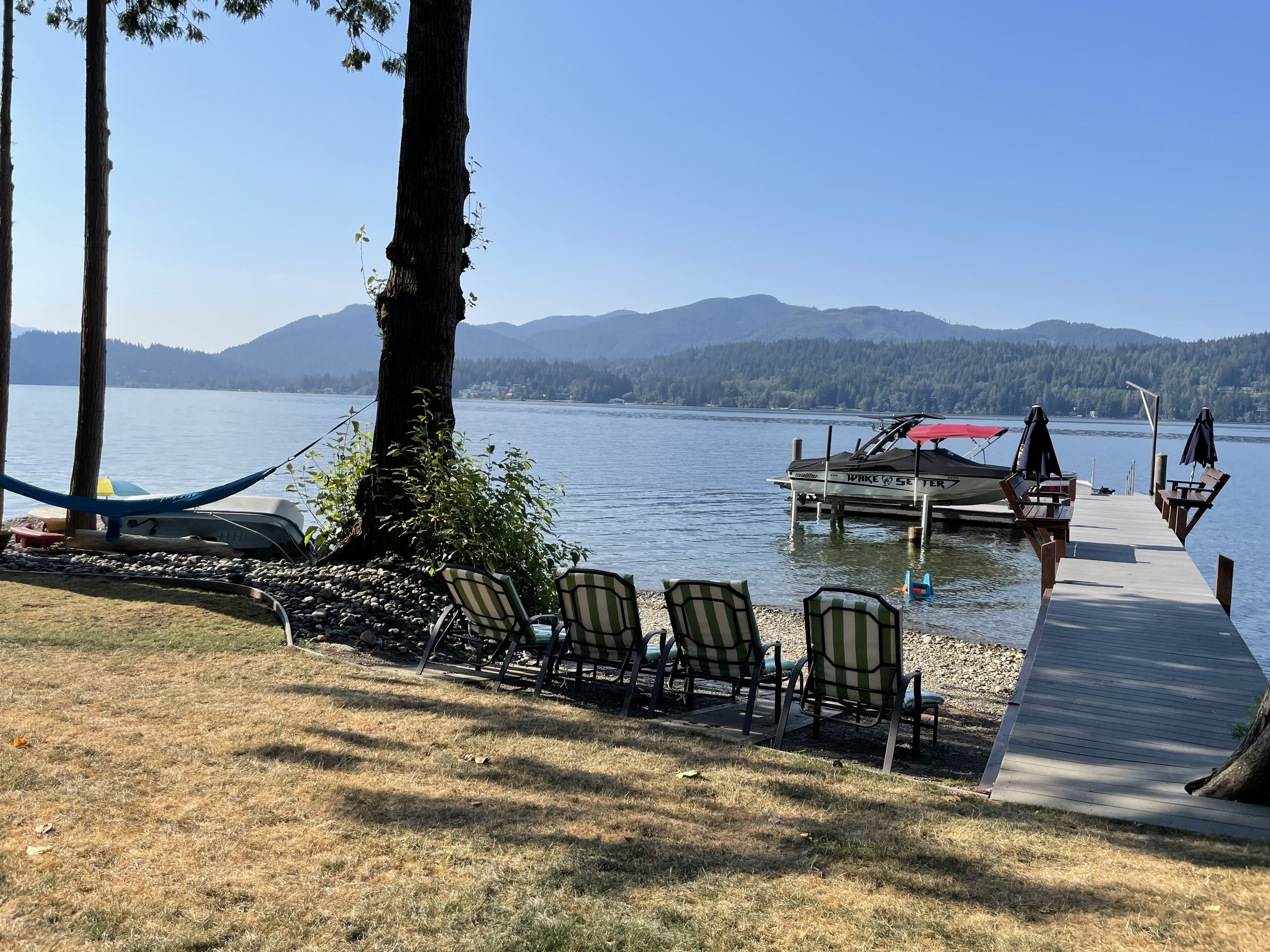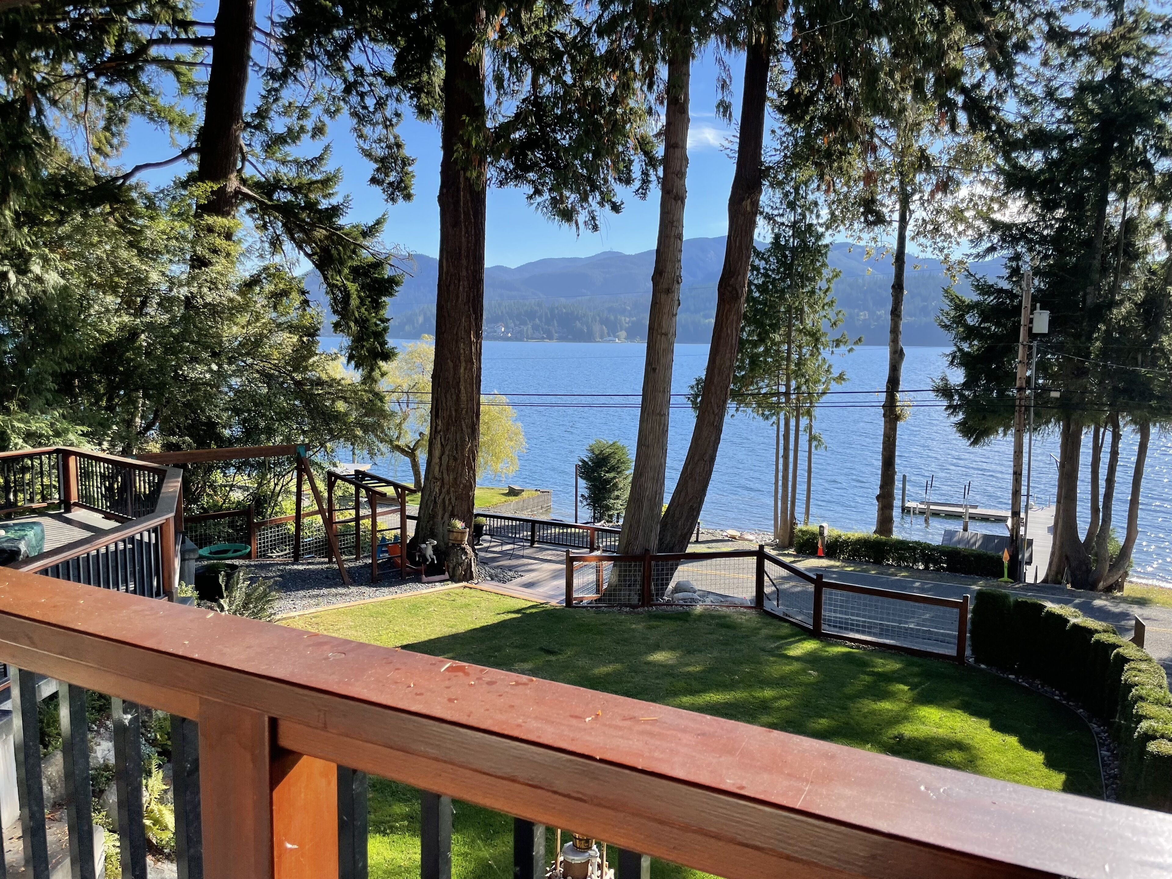 Lake Whatcom Water Front/3 Acres/Kayak/Boards/Wood Fireplace Summary:-When thinking about a getaway, it's not just our great home/expansive covered door deck with wood fireplace/3 acres/lake. Bring your fishing rods (we have old ones), and fish for bass off the dock in the evening/bring or bikes or hiking shoes, one mile past the house is Lake Whatcom Park, with a 3 mile long plus back lake trail, or hike Chantrel Trail, up the side of mountain....- During Prime Summer Months: July 1 to September 1: 7 day stays and typically run Friday to Friday, unless we have fill in days, see calendar, or send message.- Pricing is based on 3-night stays, for 2-night stays add $200.00.Note: During high volume times, 3 nights only, no 2 night stays- Pricing is also based on maximum of 6 people. Add $50.00 per night per person. House fits 6 adults comfortably plus children, under 12 years.- Day time guests, typically add $25.00 extra ie: grandma and grandpa visiting for the day. - No Loud or Party Groups. Guest over 35 years. Require names and ages of guests, plus sometimes ID. Quiet time: 10:00 PM.- Pets: $50.00 per night each, restricted to main floor only. No pets in beds or on furniture. No large or vicious dogs.Lake Whatcom Waterfront - 3 Scenic Acres - Creek - Walking Trail2480 Sq. Ft. 3 Bedroom, Loft and Lower-Level Games Room Luxury CabinOver 200 Five Star Reviews - Ideal Family DestinationLarge/loud groups are not permitted. Quiet time: 10:00 PM.Rates change with season.Cross Road to Private Swim Beach. Safe Shallow Water. Dive off the Dock or fish for bass, remember your fishing license.2 Paddle Boards and 2 Kayaks Cabin:1) 2480 sq. ft. 'like new two level and bright walk out basement plan.2) Covered Entertainment Size deck: 25-foot x 13 Foot, wood fireplace, barbeque, roast marshmallows3) Lower-Level Expansive Open Patio with Hot Tub and gas fire table. (Fire table for summer months)2) Home is architecturally designed with fir beams, doors, casings, millwork, vaulted and double height ceilings, open staircase.3) Built with top-of-the-line construction and quality products including oak hardwood flooring and granite counters.4) Set up for families: baby gate, 2 play pens, 1 highchair, outdoor play center/swing set.Main Floor:1) Great room open to gourmet kitchen and lake views.2) Stainless appliances including electric flat top stove, convection microwave, fridge, plus 2nd wine/drink fridge3) Kitchen is fully stocked, table clothes, serving dishes, glass platters, punch bowl, pots, pans, frying pans, turkey pan and platter, automatic coffee pot, tea pots, toaster, outdoor gas barbeque.4) Laundry or Mud Room: sink, cabinets, washer/dryer, iron and board.5) #1 Bathroom: walk in shower, blow dryer. Note: 3 full baths in total, one of each floor.Upper Level:1) #1 bedroom: queen size bed, sundeck with best lake views in home2) #2 bedroom: queen size bed, walk in closet3) Cheater door to main 5-piece bath with tub shower and double shower heads, blow dryer4) Loft: queen mattress, lake views. Access by ladder off back bedroom. Ideal for mature kids and use at your own risk.Lower Level:1) Games and media room walk out to front patio, garden and lake views.2) Pool table, Bar and sink.4) #3 bedroom: 1 Double + 1 Twin Bed. 5) Sectional with pull out double bed, plus twin mattress for floor5) Bathroom: 3 piece includes walk in shower, blow dryer.Electronics:1) 2 flat screen tv’s with full movie channels: great room and lower games room.2) Wi-Fi: wireless and internet hook up in lower-level games room3) Great room stereo with speakers, plus outdoor speakers.4) Phones on main and lower level, free long-distance calls to Canada and USA.Heat, Air Conditioning and Hot Water on Demand:1) Heat pump, air conditioning and furnace.2) Propane fireplaces: main floor great room and games room for winter months Location and Activities:1) Sought after location on Lake Whatcom offering sunshine from dawn to dusk, including evening sunsets.2) Private beach, new dock and float, for boats to tie up. Protected area with shallow water between beach and dock for kids to play. Fishing poles at home for fishing off dock. Most catch bass.3) Quiet side of lake, ideal for water skiing, boarding or tubing in front of home.4) 2 double kayaks, 2 paddle boards. Beach is lit up at night.5) 3 acre parcel of land with nature walks, creek running through property. Evening lights to brighten up property.6) Plenty of parking, 3 spots behind home, 3 spots at street level, room for RV too.7) Beach is 25 feet front door. Cross Road. We like it with the kids, "The front yard is fenced with gates, so the kids can play in yard and on swing set, volleyball or more, or we all cross the road and go to beach together."8) No through street with Lake Whatcom Park, 1 mile south of house, 3-mile lake trail and waterfall, or hike up Chantrell Trail.9) Freeway: 14 minutes, quick and easy to I-5 Sunset or Lakeview Exits10) Shopping/Boat Launch/Corner Store: 8 minutes to the most northern tip of lake: Britton Road, corner store and day park to launch boat, then another 7 minutes to Bellingham Shopping.11) Fork Restaurant: 1 mile north of house. Fine dining, people from Vancouver and US take the time to enjoy the lake drive to this restaurant at Y Road. Great takeout pizza12) Mt Baker: 60 minutes to Mt. Baker with quick easy access to Mt. Baker Hwy. Families like to book to get 1 day of skiing in, then go shopping or visit with family.13) Western Washington University: 25 minutes. We get a lot of parents booking at graduation parties and holiday weekends for their families.14) Skagit Casino: 30 minutes for an evening of fun..15) Burlington Outlet Centers: 40 minutes.Keywords: lake front, lake view, south/west sun, dock, luxury home, luxury cabin, boating, sailing, fishing, Mt. baker, RV Parking, Private Boat Dock, fine dining, wedding, banquet, casinos, biking, walks, lake trails, water falls, paddle boat, kayaks, paddle board