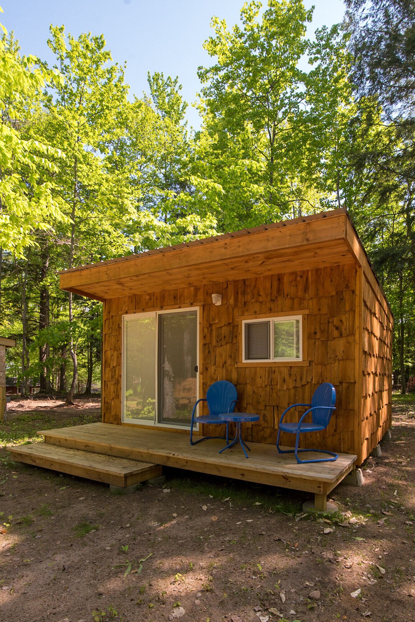 Rustic bungalow located within a campground Very unique bungalows located in a campground on lakefront property. Bungalows have a very open floor plan with no rooms or interior walls. You walk in to a queen bed and a set of full size bunk beds. Also included is electricity, a mini fridge and table. Outside the bungalow you will find a fire pit, picnic table and a small charcoal grill. There is no running water in the cabin and the BATHROOMS ARE LOCATED A SHORT DISTANCE AWAY (25 feet) within the campground and include warm showers and flushing toilets. Drinkable water also located at the campground. At just under 200 square feet, bungalows are very cute and cozy. Built in 2020. Perfect way to get away on a budget. Bungalows and bathrooms are heated and open year-round. There is a camp store onsite with all your camping essentials including firewood, fire starter, ice cream, ice, soft drinks, snacks, coffee, pizza, camping gear and so much more. Please note, store is not open in the winter.Bring your own pillows, blankets, linens and towels. There is also no kitchen, so you would need to bring all your own food preparation needs. There is a charcoal grill. On site is great fishing with pontoon boat rentals available. Kayak, canoe and stand up paddle boards also available for rent. 1/4 mile to snowmobile and ORV trails. Great lake for ice fishing.
