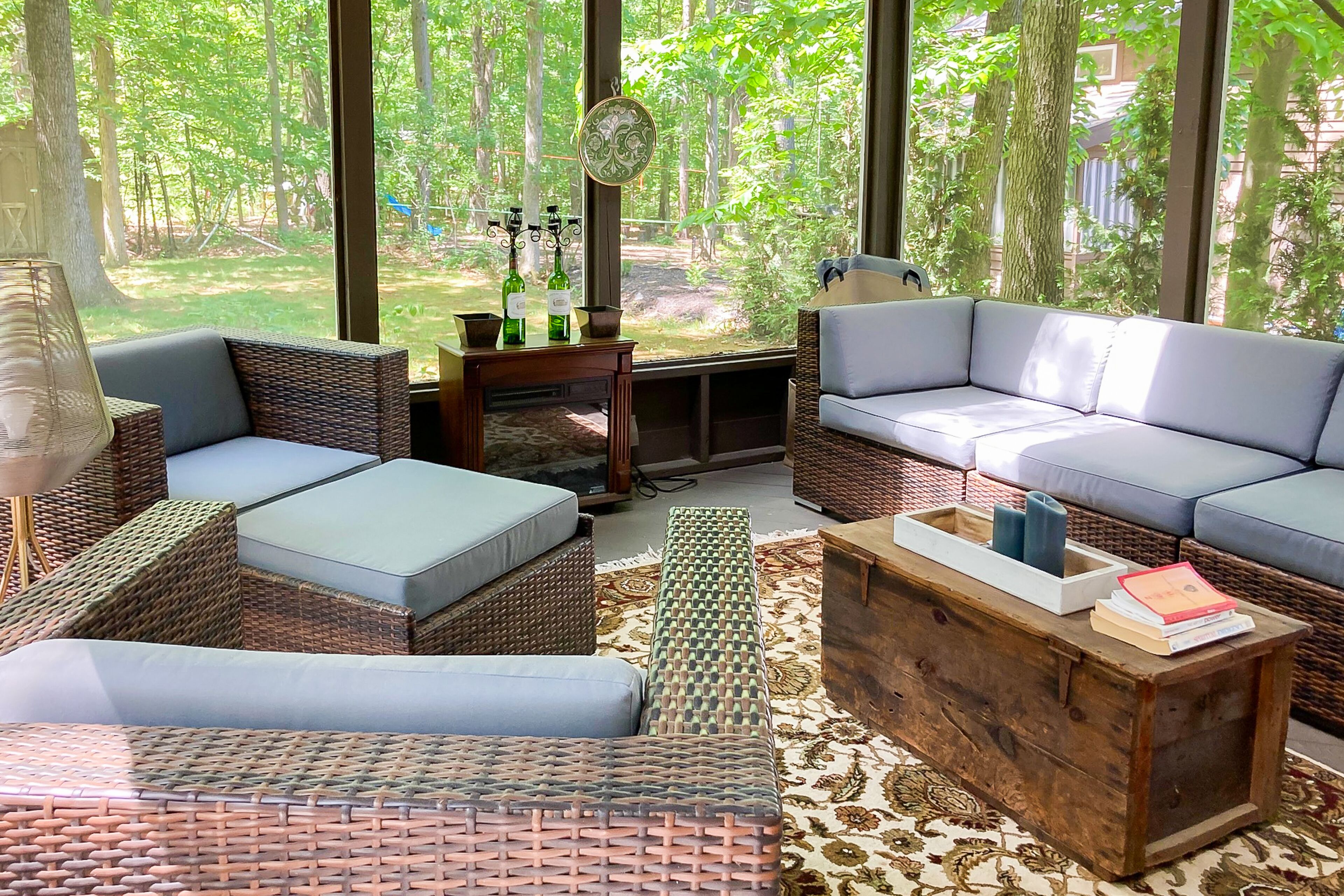 Bright cottage near beach with fast WiFi, washer/dryer, central AC & firepit Charlie's On ComancheOur calendar is updated in real-time & our nightly rates are accurately displayed. Simply enter your desired dates and click 'Book Now!'Set at the corner of two quiet roads, this cottage holds everything you need for a getaway for work or play. The beach is less than a mile away, while downtown New Buffalo offers various shopping and dining experiences. Two levels of comfortable spaces await at this lovely home - the screened porch may become your favorite spot to relax! Unwind next to the firepit in chilly weather, or cool down in the central air conditioning on sunny days. The cottage's open layout allows plenty of natural light to come inside. Amenities include a gas grill, a private washer/dryer, and incredibly fast WiFi to help with your remote work projects. The full kitchen features full-size appliances and equipment enough for enjoying delicious meals together. The richly decorated space allows for comfortable wind-downs and long conversations. A calm and peaceful holiday awaits you. THINGS TO KNOWStreaming is available using your own accounts.Many neighborhood beaches are closed due to the high water level in Lake Michigan. Please research the Michiana beach situation before booking.The metal spiral staircase is safe for guest use but may require monitoring with younger children (it is not suitable for play).Guests must travel by car to reach this cottage.The outdoor spaces and the three-seasons room may not be available or maintained during winter months. This property is managed by Vacasa Michigan LLC.Parking notes: There is free parking available for 3 vehicles.Security camera details: One Nest surveillance camera is installed on the home's front door, facing the driveway.Damage waiver: The total cost of your reservation for this Property includes a nightly damage waiver fee, plus tax if applicable (the “Damage Waiver”). (A discount may be applied for stays of 28 nights or longer, if permitted.) The Damage Waiver covers you for up to $3,000 of accidental damage to the Property or its contents (such as furniture, fixtures, and appliances) as long as you report the incident to the host prior to checking out. The Damage Waiver fee eliminates the need for a traditional security deposit.More information can be downloaded from the "Rental Agreement" on the checkout page.Due to local laws or HOA requirements, guests must be at least 25 years of age to book. Guests under 25 must be accompanied by a parent or legal guardian for the duration of the reservation.