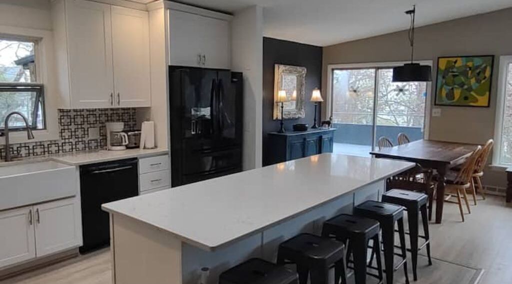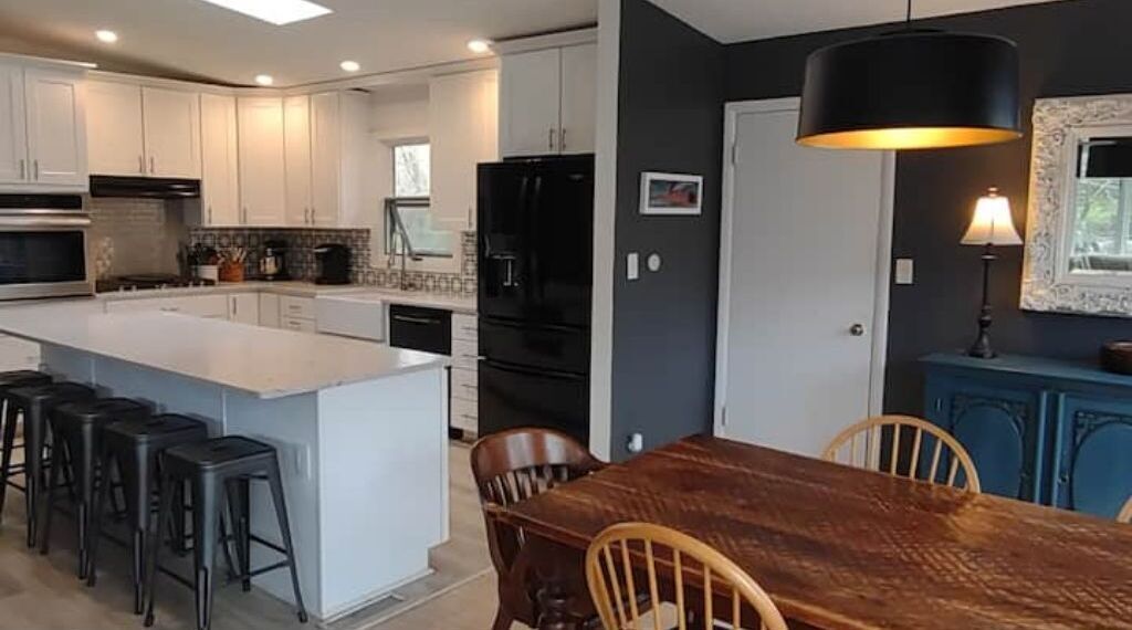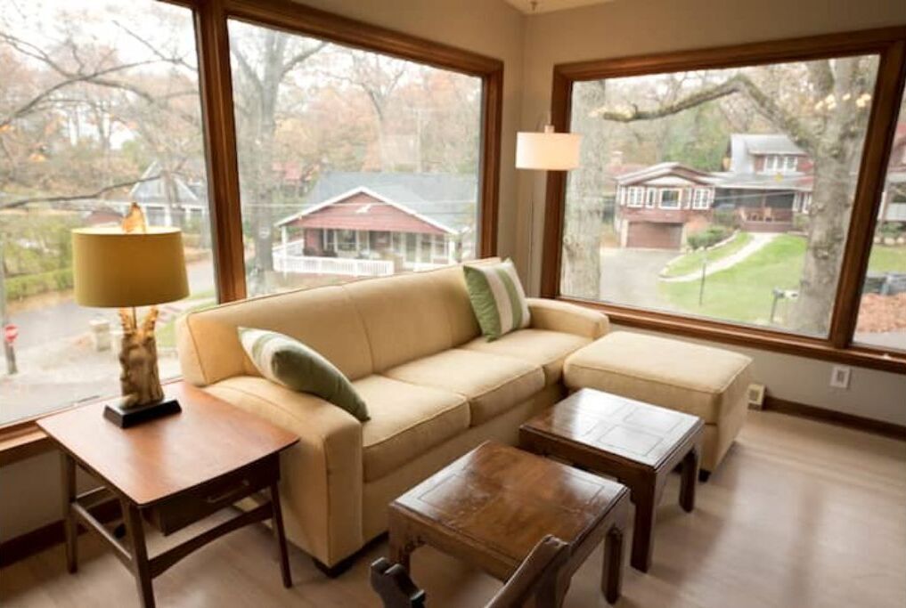 Michiana Living - One Block to Beach The house is one block to the beach stop 41 1/2 and is located in the quaint Village of Michiana. This mid century modern home with floor to ceiling windows in the living and dining room creates a spectacular panoramic view. The open floor plan allows for families to gather in the Kitchen, Living and Dining rooms with ample space and also enjoy the screened i...