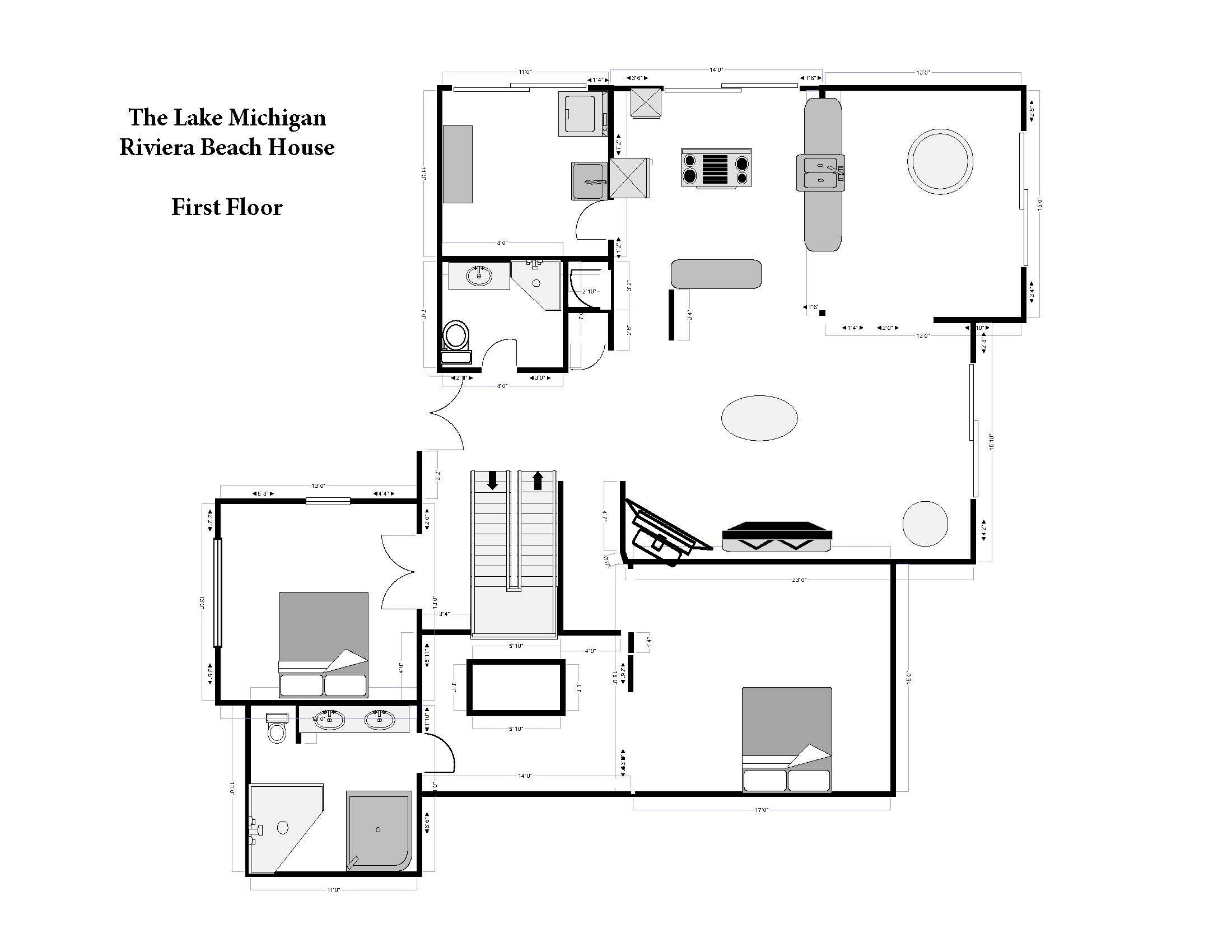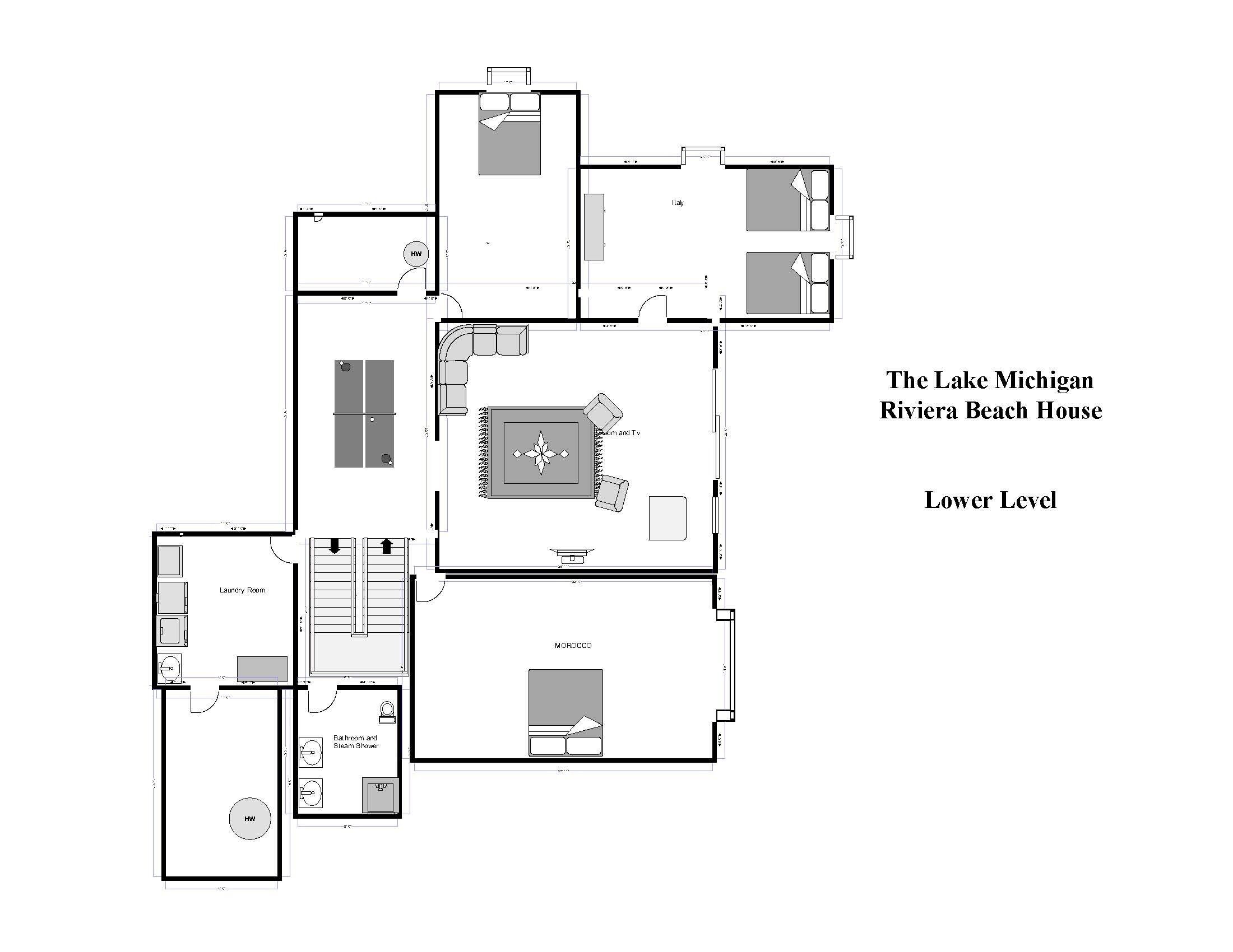Lake Michigan Beach House Meets Riviera Flair—Just 4 Minutes To The Beach! This freshly decorated 5,400-square-foot home feels even larger than it is—with over-sized windows and high ceilings—making it perfect for groups of all kinds. Modern conveniences abound, and unique décor, such as “vintage” Riviera travel posters, transport you to a truly relaxing time and place.As you enter from the front hall, you will see a cathedral-ceiling great room, with its grand gas fireplace. This versatile living space also has a TV and game table for those cozy nights when you just want to relax. Expansive spill-out spaces, such as the front porch, the screened porch, and the dining room and great room deck, to name a few, provide areas of respite among the crowd when needed.Cooking and dining are a breeze with the spacious, fully stocked kitchen with sub-zero fridge and counter seating for 3—plus, a new grill just steps away. The kitchen opens to the dining room that seats 10. The great room table seats 8, the screened porch table seats 12—and there’s even a large dining/game table in the sunny lower level—in case the kids/teens want their own space.The Lookout is the top-level of the Riviera, and it is the ideal spot for pre-dinner refreshments. This loft space comes equipped with a bar, mini-fridge, and sink, and sliding glass doors open to a large deck with comfortable seating. We see tales of many beautiful sunsets in your future! The Lookout also offers a high-end queen pullout couch and sitting area with an overhead fan, making this the perfect place to keep cool while enjoying the view.Seven gracious bedrooms with authentic accents whisk you away to exciting Riviera destinations in Spain, Greece, Portugal, Morocco, Italy, France, and, of course, Monaco. Large bedrooms with lux linens, European style, and abundant closet space elevate your experience and allow for genuine relaxation.Full of light and windows, the lower level of The Riviera has a large central living space with a sectional sofa, a 57” TV, and an additional stone gas-fired fireplace. With its ping-pong table and large game table, it is great for family fun. Sliding glass doors open out to the backyard and fire pit area—perfect for roasting marshmallows and unwinding once the stars come out! Deer can be seen moseying around the backyard, often at dawn and dusk. The lower level bathroom has two sinks/vanities, a private washroom area, and a steam shower. Two laundry rooms—one off the kitchen and one on the lower level (with 2 washers and 2 dryers!) are offered for your convenience.This spectacular home promises a unique vacation experience. With central AC, heat, and fireplaces—it’s a great escape for all seasons’ adventures: summer beach fun, autumn colors, winter snow falls, and spring winery tours! We only have a few rules: no pets, no smoking, and ALWAYS have fun! So make it happen! Book your stay now at The Lake Michigan Riviera Beach House!7 Bedrooms + Loft , 4 BathroomsSpain (master)King1st floor2 chairs, dresser, nightstands, alcove with crib & changing tableWalk-in closetMaster bath with shower & JacuzziGreeceQueen1st floorChair, dresser, mirror, bench, nightstandsCloset & new bath across hallFranceKing2nd floorArt deco vanity, bench, nightstandsLarge closet Bath in hallMonaco2 Full Beds2nd floorChair, vanity, nightstandLarge double closet Bath in hallPortugalKingLower level w/large windowDresser, bench, nightstandsWalk-in closet Bath in hallMoroccoKingLower level w/large windowBrass bed, table, 2 chairs, nightstandsCloset Bath in hallItalyTwo Queen BedsLower level w/2 large windowsBookshelf, luggage rack, nightstandWalk-in closet Bath in hallQUICK HOUSE/VILLAGE RULES:-Maximum of 16 guests, with a guest defined as anyone over 2 years old according to Village Ordinance-NO smoking-NO fireworks on private or public property (i.e the beach)-NO pets-Enforced neighborhood quiet hours are from 10:00p.m. – 8:00a.m.-Parking is limited to 6 vehicles: with 4 cars in the driveway, 2 cars on the parking turn, and NO cars allowed on the streetUPON CHECK-OUT:-Put all garbage in garbage cans/bins on street in front of the house-Put all recycling in marked recycling receptacle on street in front of the house-Put all USED towels in the laundry rooms