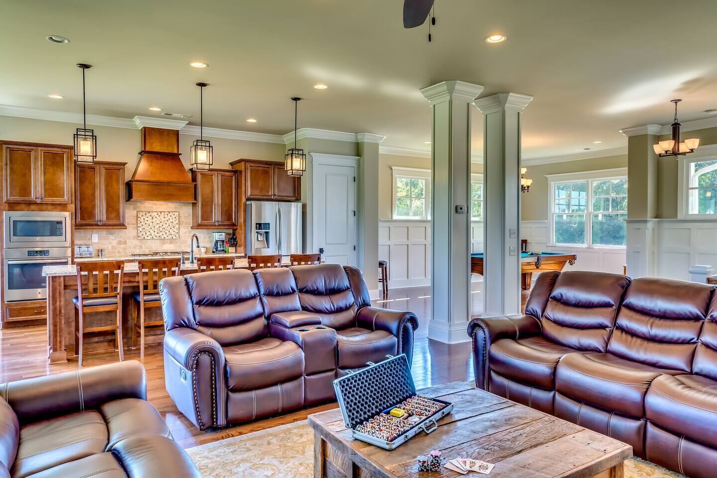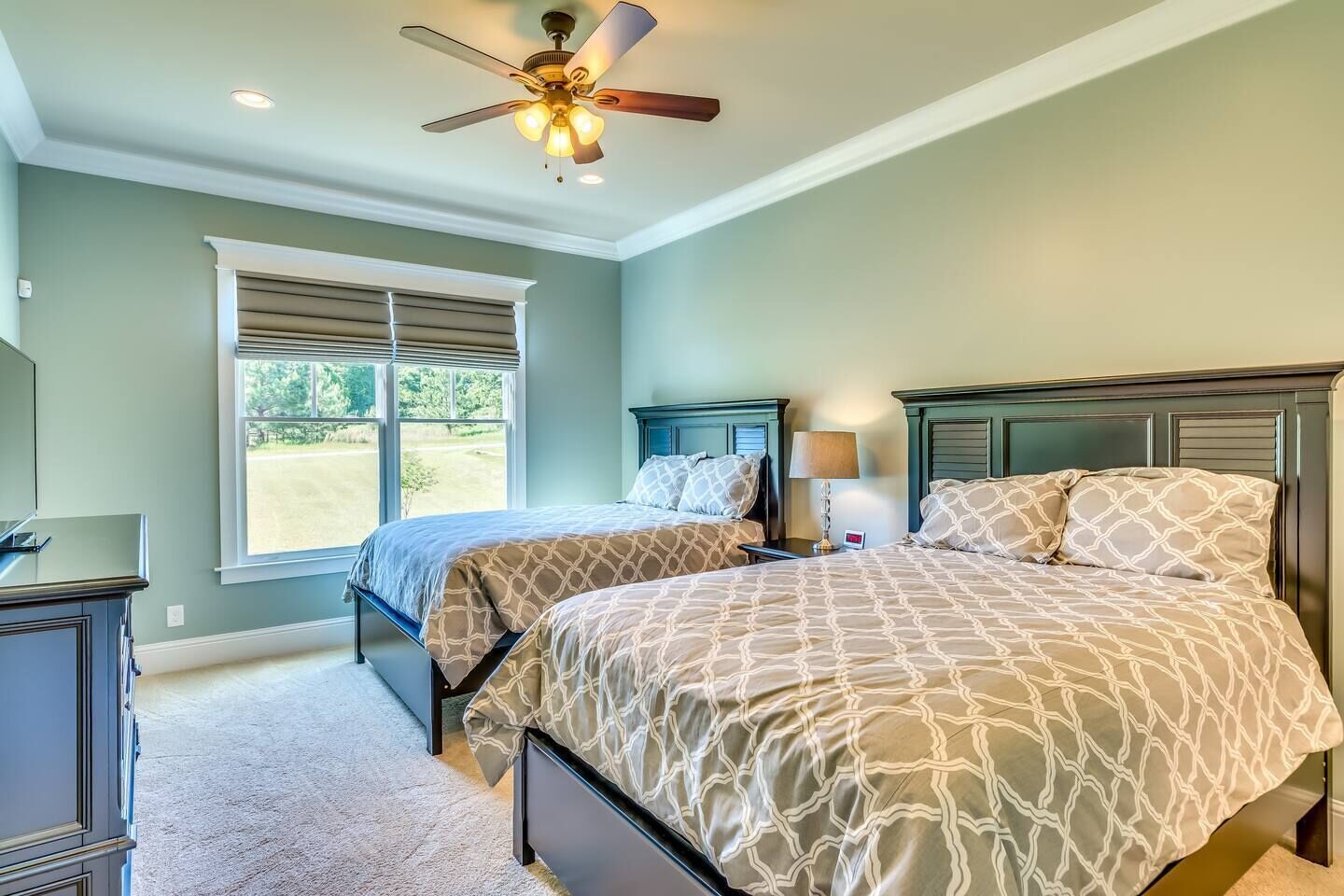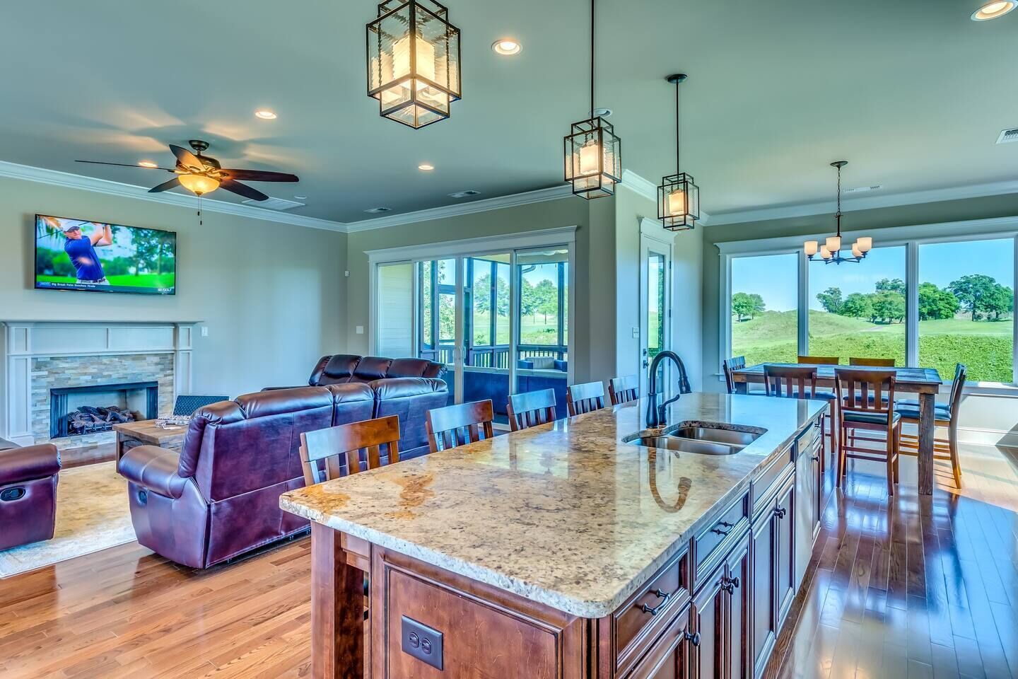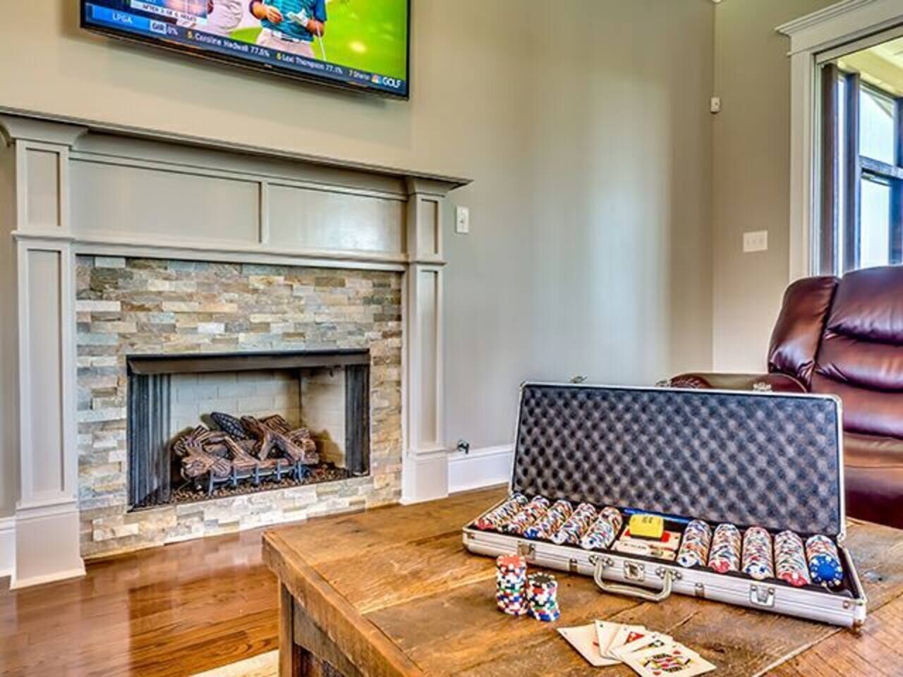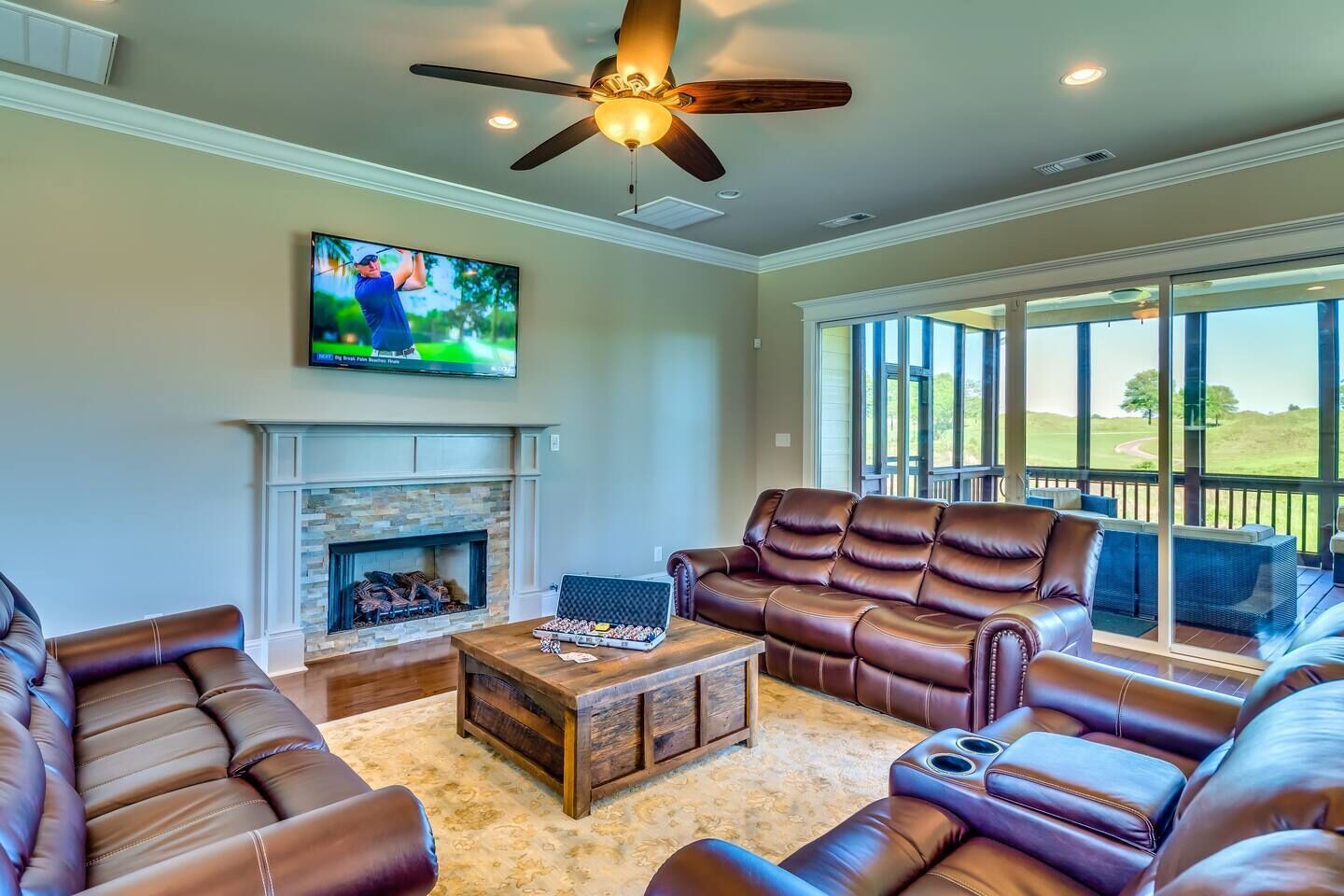 2nd House Built For Groups - 4 Suites, 8 Beds, WOW Our home was designed and built specifically for groups. The wide open floor-plan allows everyone to be together and socialize. Relax on the sofa, play pool, or enjoy the view with your favorite beverage! The location is very private, but only 2 miles from shops and restaurants. Amenities include 4 Master Suites (8 queen beds), 4.5 Baths, HUGE "Great Room", Pool Table, 5 HDTV's and Concierge Services. The views from our screened porch are spectacular! Our 2 Oster Golf Houses have a total of 16 queen beds and are right next to each other, with a putting green between them. The Hogan house pricing is based on 8 guests, but we allow up to 12. Each additional guest is $125 plus tax, per night. (Note: the fireplace is inoperable)