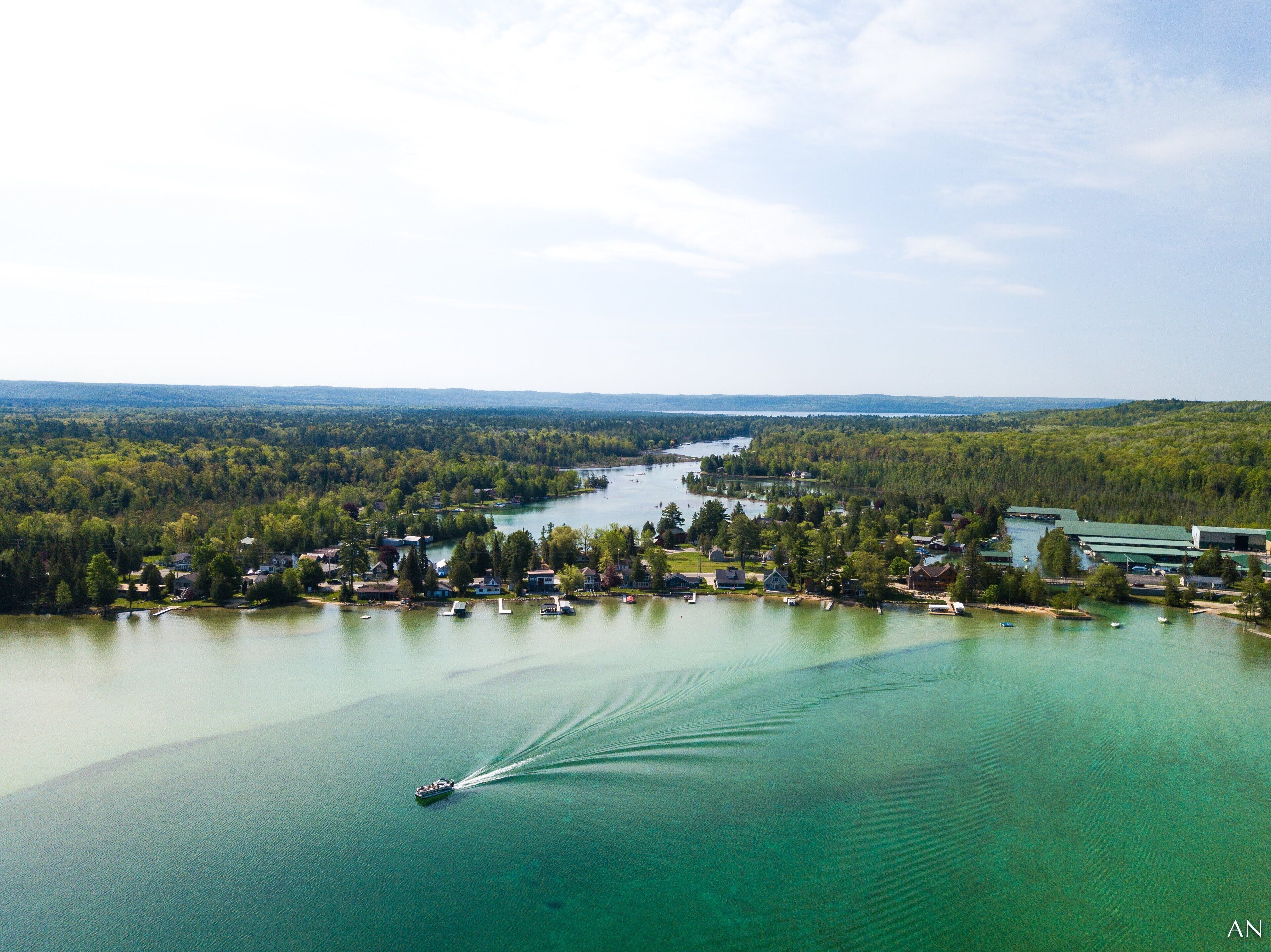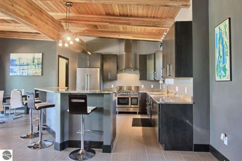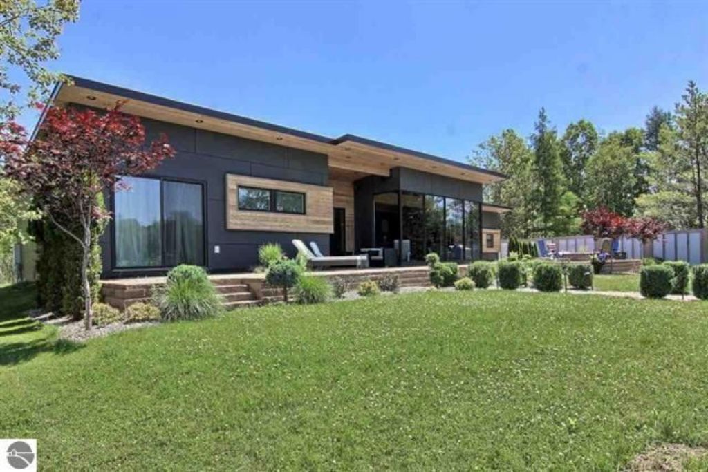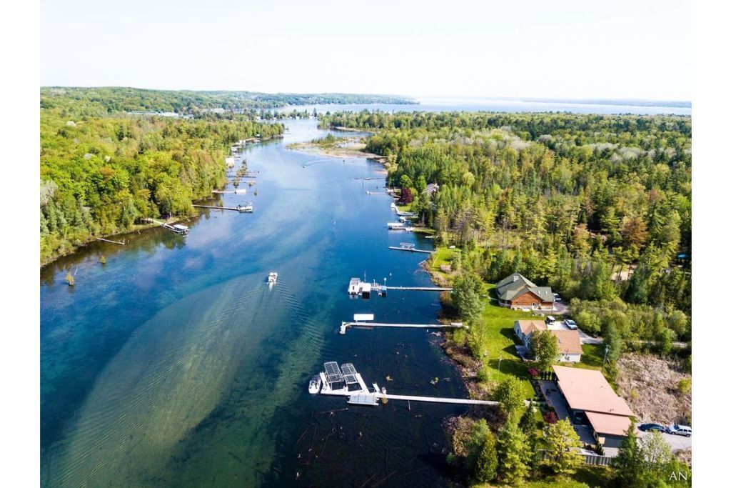 EXPERIENCE TORCH LAKE -TORCH RIVER AMAZING CONTEMP. ESCAPE “TRACE” -DOCK, HOTTUB This 2011 custom contemporary home was featured in the home design magazine “Houzz” for its architectural design. Floor to ceiling windows display unobstructed expansive views of the river, natural landscape and abundant wildlife.Open floor plan with vaulted wood ceilings provides spacious accommodationsKitchen featur...
