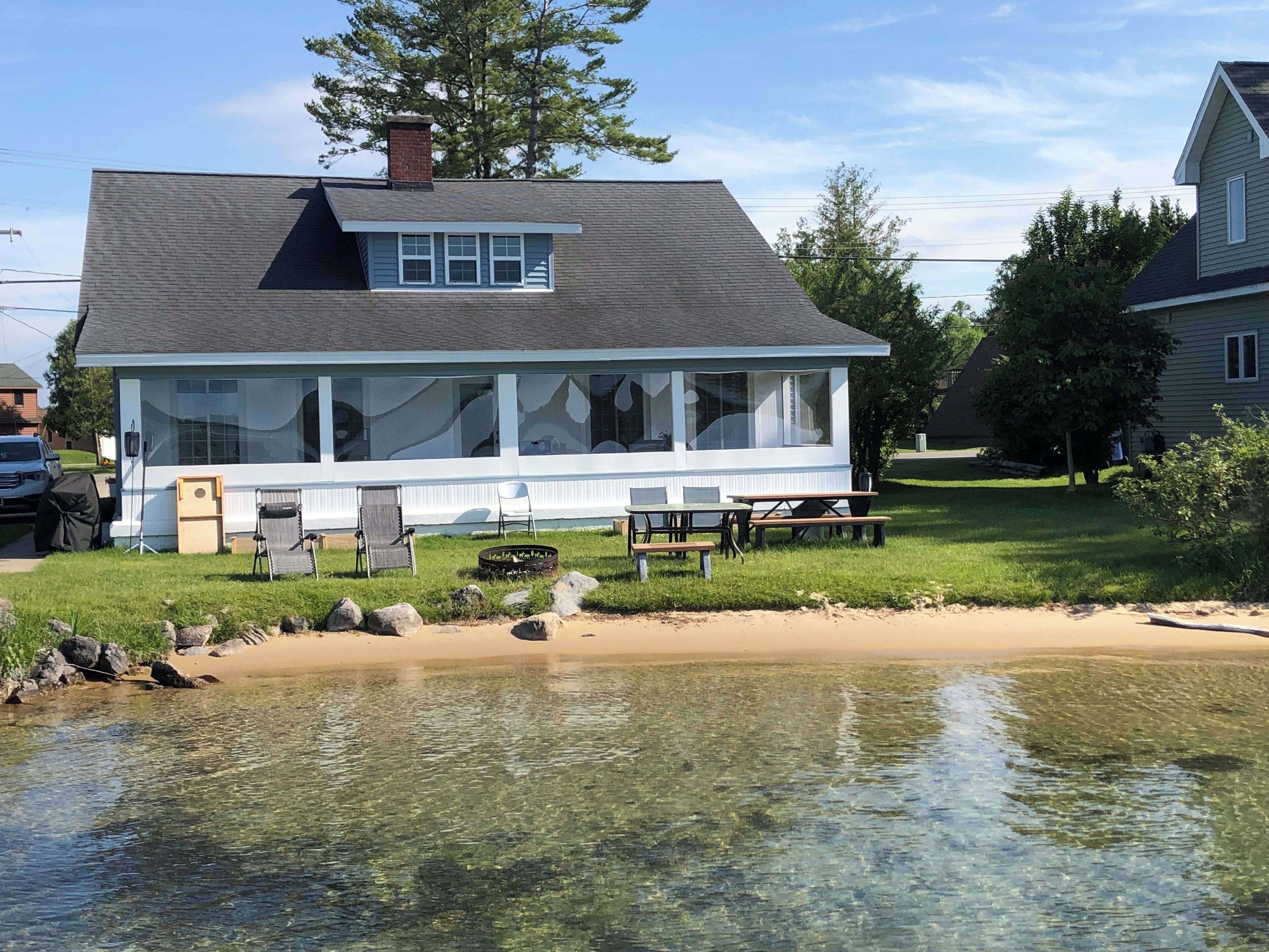 Torch Lake Oasis: Serene Views & Waterfront Bliss Await! Welcome to your Torch Lake haven! Our 3BR/1BA home sits on a pristine 70ft of waterfront, offering the perfect mix of relaxation and adventure.Your Lakeside EscapeDive into comfort with our sunroom, showcasing stunning lake views—ideal for serene mornings or tranquil evenings. Enjoy modern amenities: high-speed WiFi, AC, fully equipped kitchen, and an ice maker for your convenience.Sleeping Solutions for AllOur space is optimized for families and groups: a futon, love seat-bed, twin bunk bed with trundle, full and queen mattresses, plus two queen air mattresses and a sectional couch to ensure everyone has a cozy spot.Outdoor Fun Begins HereYour backyard is Torch Lake's clear waters. With a private dock and mooring buoy, access to water activities is effortless. The sand bar, a short walk away, is perfect for socializing and sunbathing.Memorable Moments AwaitWhether it's lakeside relaxation, boating adventures, or quality time with loved ones, our home is your backdrop for unforgettable memories. The beauty of Torch Lake, combined with our home's charm, offers a unique escape.Book Your Torch Lake GetawayExperience the tranquility and beauty of Torch Lake. Our home isn't just a stay—it's where moments become cherished memories. Don't let this escape slip away. Book now for a blend of nature's beauty and homey comfort. Your adventure at Torch Lake awaits!