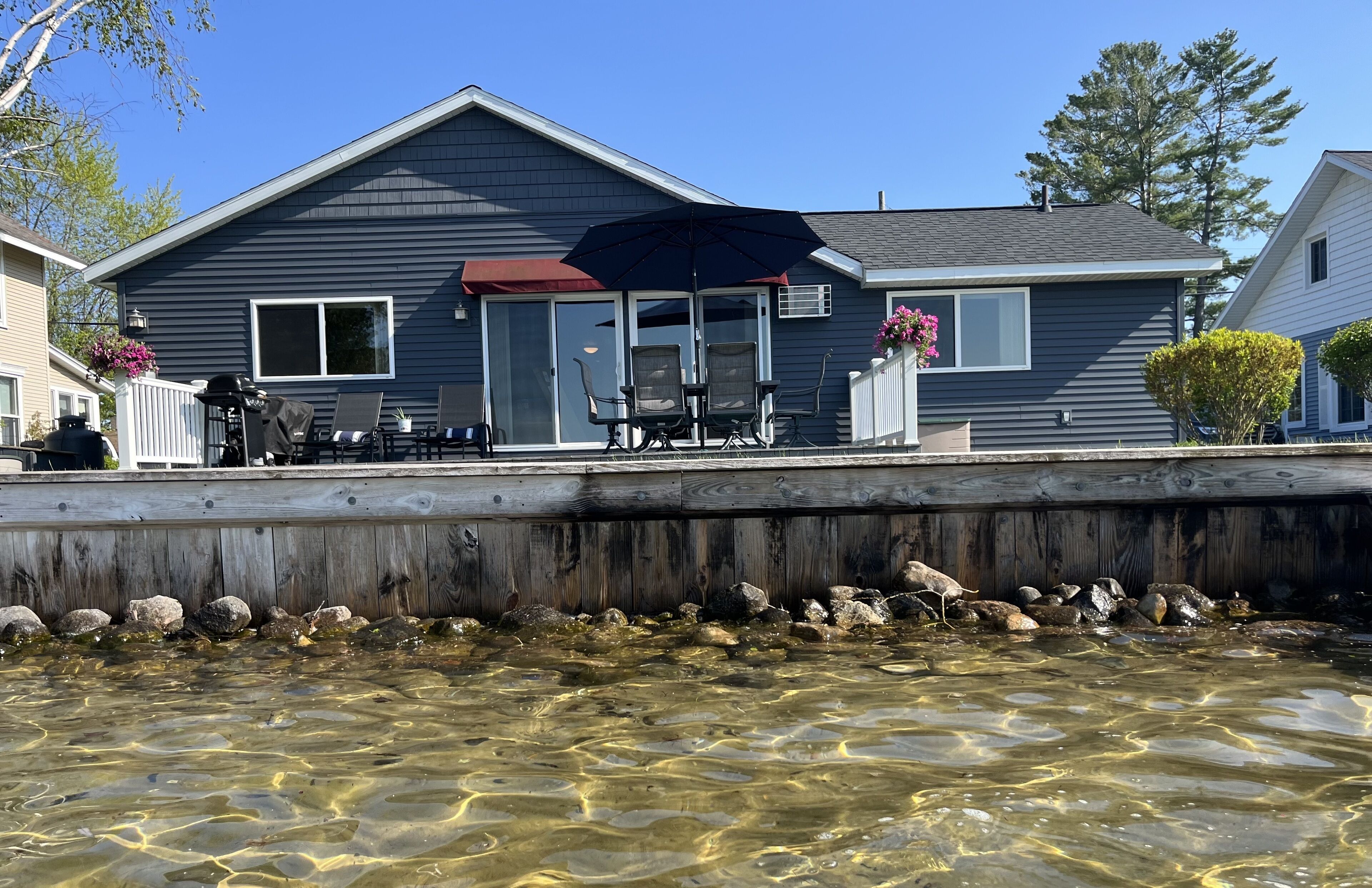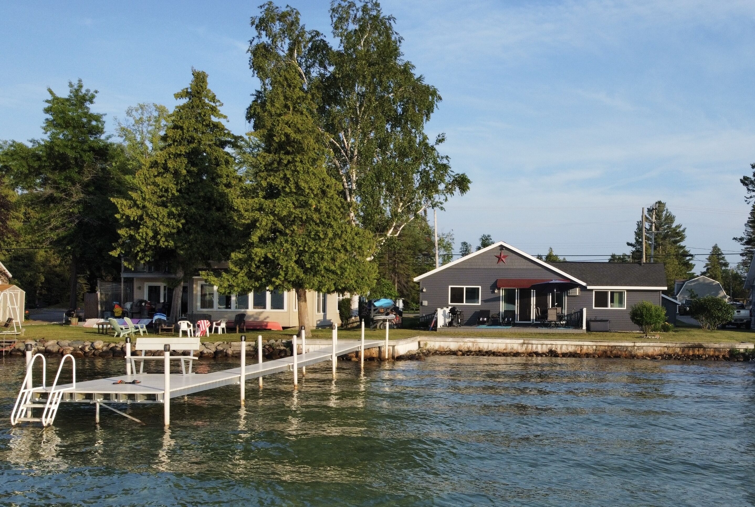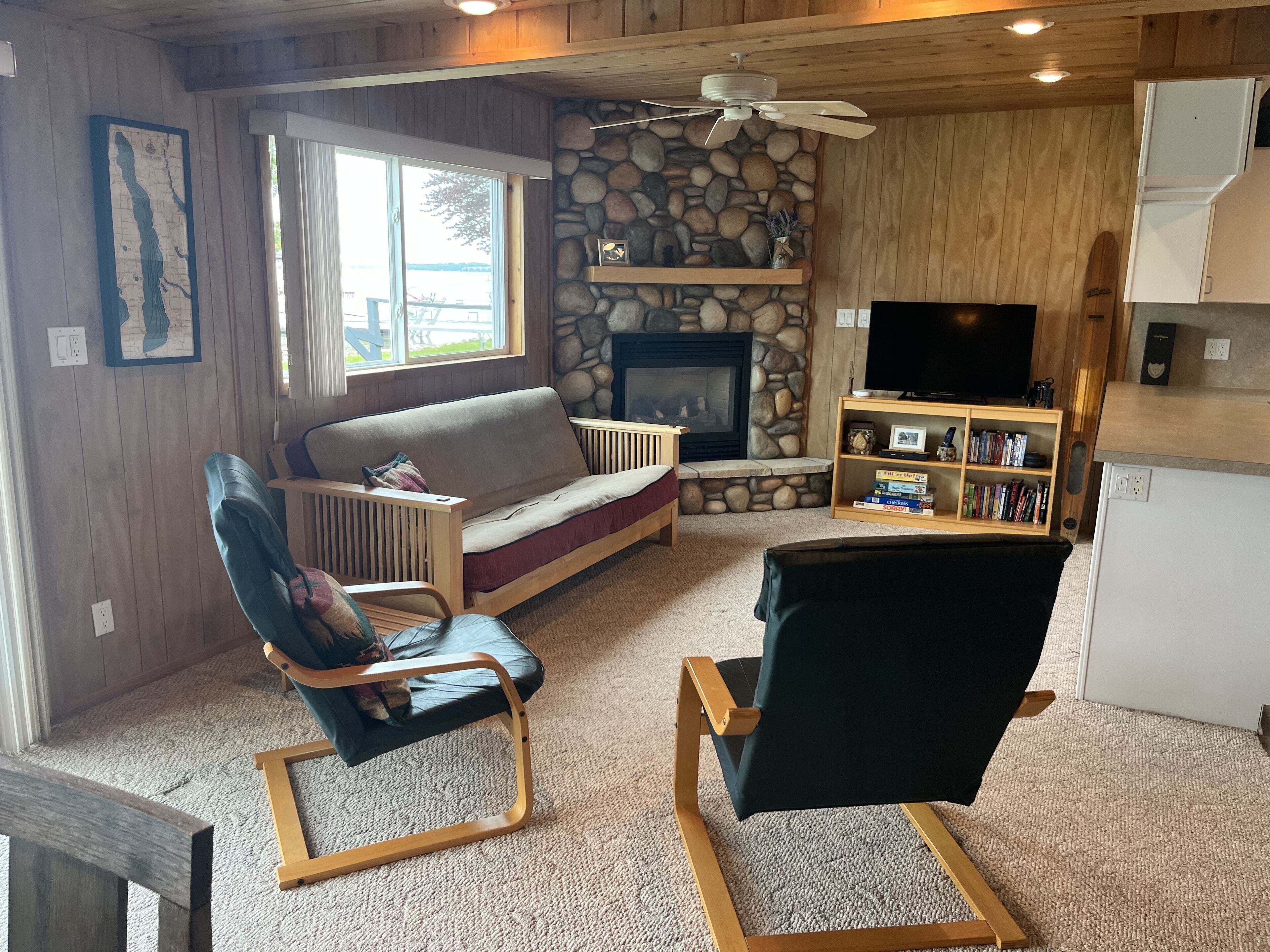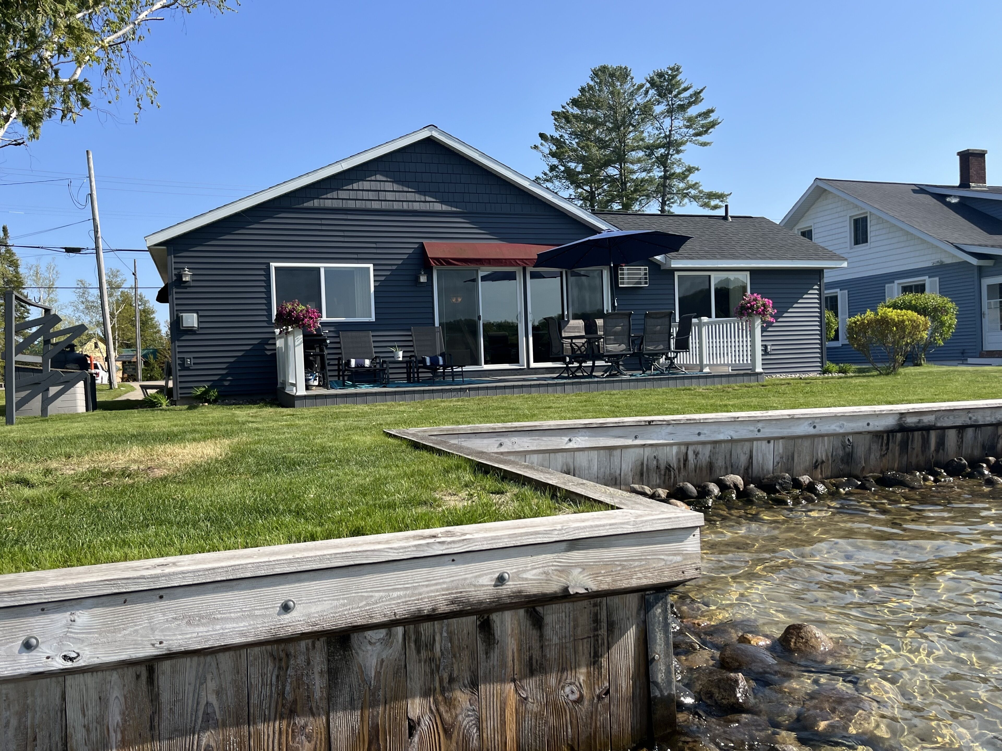 Torch Lake Sandbar Escape Four seasons of fun on one of the world's most beautiful lakes. Lakefront property located within walking distance to the famous Torch Lake sandbar. Wineries, breweries, skiing, fishing, and golf nearby! Come to the ultimate family vacation destination.Master suite overlooking the water has a king bed, large closet, and private half bathroom. Another bedroom has a twin bunk bed with festive up north decor. The third bedroom has a twin daybed with a trundle, as well as a full size bed. The living room and dining areas have gorgeous water views with large windows and walk out doors to the patio. It's a great place to play games and watch the sunrise. There is a natural stone fireplace (gas operated) for cool nights in the Fall, Winter, and Spring. The new patio has comfortable lounge chairs and a dining table with umbrella. There is also a gas grill and Blackstone flat top grill available. Kayaks are available for rent for an additional fee. There is a dock available Memorial Day weekend until October 1st. The dock extend about 40 feet and has a swim platform. You can tie a boat at the end. The boat launch and marina are a 5 minute walk from the property. Crystal clear water off the house is also accessible from the seawall steps of off the end of the swimming platform on the dock. Due to the close proximity to the Torch Lake Sandbar, you can walk to the Sandbar from the end of the dock.