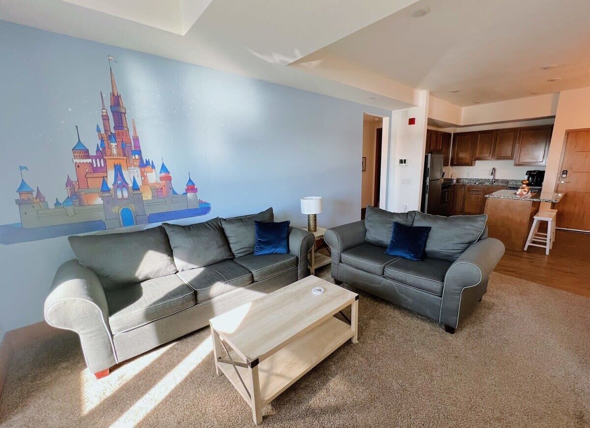 Disney themed castle apartment Summary:Experience comfort and convenience at The Grand Castle apartments, just 10 mins from downtown Grand Rapids, MI. Enjoy fully furnished units with fast WiFi, smart TVs, in-unit laundry, and access to fantastic community amenities including an outdoor pool during Summer months, game room, fitness center, theater room, and a whimsical Beauty & the Beast library for kids.The Space:Guests will arrive to a fully stocked kitchen with island and 2 stools, open living space, a comfortable workspace, 3 bedrooms, and 2 private bathrooms. This apartment features a fully-equipped kitchen, in-unit laundry, lightning-fast WiFi, smart TVs, and complete privacy throughout your stay. Additionally, there is no need to worry about expensive parking fees - This location offers free parking for two cars in the attached garage and additional free parking in the parking lot. **Special discounts for extended stays! Enjoy 15% off for weekly stays (7+ nights) and 30% off for monthly stays (30+ nights). Contact us for more information.Guest Access:This property offers a range of amenities to make your stay as comfortable as possible, including an on-site fitness center, game room, theatre room, library, and vending machines. During the summer months, guests can also enjoy our outdoor pool, which is open from Memorial Weekend-Labor Day. You have around-the-clock access to your space through our custom-coded keypad deadbolt locks. To ensure your safety, all of our properties are equipped with Ring video doorbell cameras and noise decibel measuring devices inside the unit (Please note: Devices do not have recording features).The Neighborhood:Grandville, Michigan, is a picturesque suburban enclave renowned for its family-friendly ambiance. Nestled in the southwestern part of the state, it comprises a mix of housing options, from cozy single-family homes to modern apartments and townhouses. With its top-notch schools and a commitment to safety, the neighborhood is a magnet for families with children. Nature enthusiasts will appreciate the well-kept parks like Millennium Park and Wedgewood Park, offering lush green spaces and recreational opportunities. Grandville's diverse culinary and retail scene, including the sprawling RiverTown Crossings mall, ensures residents have access to a wide array of dining and shopping experiences. What truly sets Grandville apart is its tight-knit community spirit, fostered by frequent local events, festivals, and active community organizations, making it a cherished place to call home.Getting Around:In Grandville, transportation options include cars, public transportation, bicycles, walking, and taxi/ride-sharing services. Major roads like I-196, M-11, and M-37 connect the city, offering car rentals at the airport and local agencies. The Rapid provides public bus service within Grandville and the metropolitan area, with schedules available online or through an app. Biking is facilitated by bike-friendly routes and rentals, while walking is encouraged with sidewalks and crosswalks. Taxis, Uber, and Lyft are also accessible for convenient travel without a personal vehicle.Other Things to Note:A non-refundable damage waiver is included in your total cost as it covers more than just minor wear and tear. For reservations longer than 30 nights, a refundable security deposit will also be required. Please note that this does not apply to Airbnb reservation.• For extension special offers, please reach out to us. Weekly and monthly discounts will be applied automatically when you select your dates: • 15% off of 7 days stay or more • 30% off of 30 day stay or moreEnjoy a complimentary starter kit of guest supplies, including coffee, dishwasher pods, trash bags, paper towels, and toilet paper. Additional supplies are the guests responsibility.• For cancellations, please check the cancellation policy on your booking platform. Please note that even if you are eligible for a full refund, a 4% credit card processing fee will be deducted. This policy does not apply to Airbnb reservations.Interaction with Guests:While we respect our guests' privacy, we are always available to assist when needed. Mitten provides a dedicated guest communications team that operates 24/7, ready to handle mid-stay turnovers upon request and promptly address any unexpected maintenance issues.