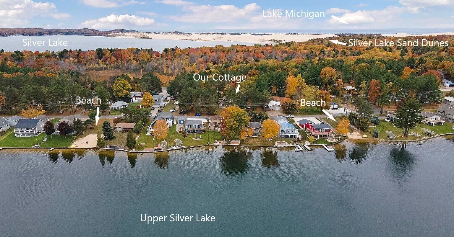 New Listing! Sleeps 10. Across from Upper Silver Lake Our cottage has 3 bedrooms and will sleep 10! It has a long driveway for trailers and dune toys, and BONUS, it's right across the street from Upper Silver Lake - with access to two private association beaches only steps away! Cruise around on the dunes, enjoy time in town playing games and riding go-carts, and take the kayaks out on Upper Sil...