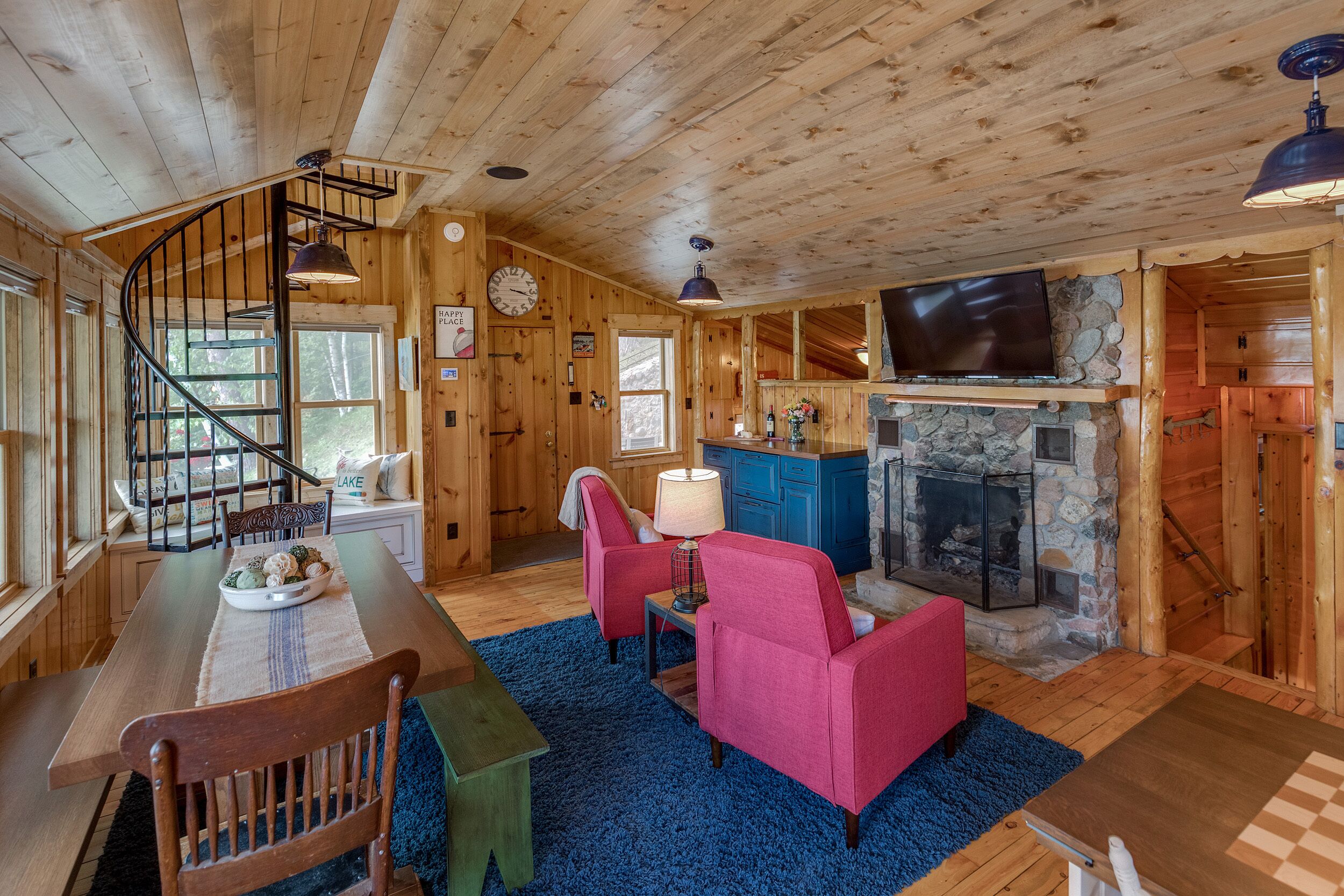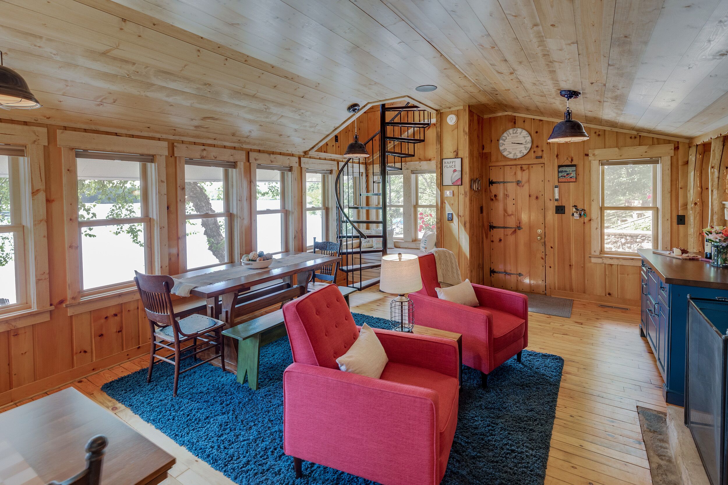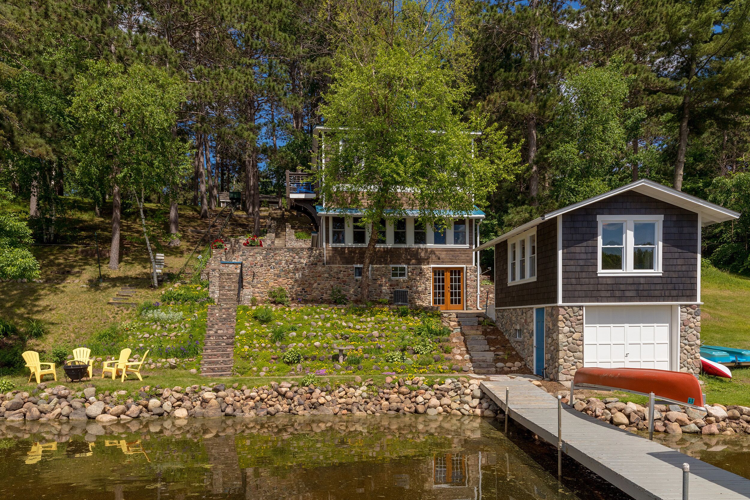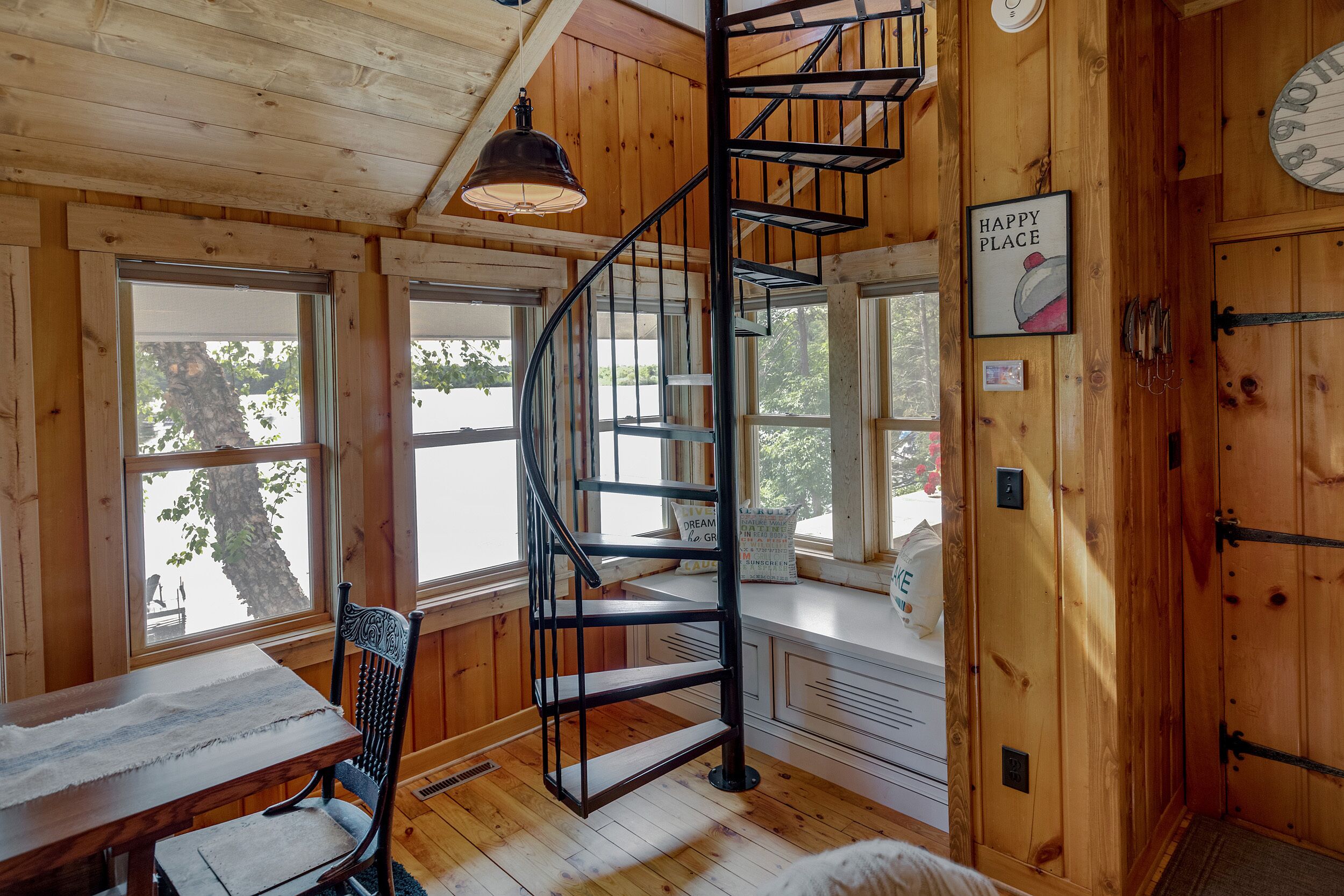 Quaint Cabin on Sibley Lake PONTOON INCLUDED thru mid-October. Look no further if a true Minnesota cabin experience is what you're after. Once you arrive, the path to the "Stairway to Heaven" will quickly make you realize why you made the trek Up North. This 1940’s cabin was fully renovated in the winter of 2018 and is essentially brand new inside and out, but the charm of the original cabin has been maintained and is evident throughout. You get the true cabin feel as you enter the main level which combines the family room and dining area for an open, yet cozy feel. The wood-burning fireplace on the main level will warm you up quickly on those cooler nights (firewood included). Enjoy meals at the dining room table or grab a book and snuggle up in front of the fireplace or on the built-in bench; all while overlooking Brown's Bay. This level also includes a custom-made Murphy bed that converts to a game table for chess and checkers matches. The quaint kitchen packs all of the amenities you could need, including stainless steel appliances along with a double-drawer beverage fridge. The main level also includes a full bathroom with a walk-in tiled shower and additional storage.The excitement builds as you head up the spiral stairs to the master bedroom, your expectations will most definitely be met as you feel on top of the world all while overlooking Sibley Lake from every angle. You can head out onto the balcony to enjoy a morning cup of coffee or an evening glass of wine and take in amazing sunset views. The master bathroom has been fully remodeled to include a farmhouse sink, walk-in tiled shower with glass doors and jetted sprays. You will not want to get out of bed in the morning as you will wake up and want to take in all of the beauty that surrounds this room.As you head back down the spiral staircase, you will then head outside down the exterior staircase into the lower level of the house where you will find Bob’s bar, a perfect spot to hang out with your friends and family or sit and relax and enjoy a movie or game on the flat screen TV. This room also has a leather couch that pulls out into a queen-size bed to allow for additional sleeping space.As you head out of the lower level you will walk across the patio to the upper boat house. This will likely be the kids or maybe the parents favorite place to hang out as it will feel like their little getaway space. The boathouse has built-in bunk beds, along with a day bed for comfortable sleeping. You will feel like you are sleeping on the water as the boathouse is situated just steps away from the lakeshore. As you head out of the cabin, you are just steps away from the dock that is perfect for fishing, swimming, and relaxing. Head out for a cruise around the lake or to the sand bar on the 2019 Sylvan fish and cruise pontoon (rental of cabin includes the pontoon boat). Everyone loves a good campfire and s'mores, so the shoreline also boasts a firepit and Adirondack chairs to enjoy the fire and the lake views on those beautiful Minnesota summer evenings. Finally, the cedar sauna house and patio are a perfect place to begin or end your day. With beautiful views of Sibley Lake, relax and enjoy some quiet time away from all the hustle and bustle. For those that like to stay connected or to not miss the Wild, Twins, Vikings, United, or T-Wolves games, both the main and lower-level bar have high-definition TV’s with DirectTV or streaming with free fast Wi-Fi. This property is perfect for a family, or an extended family, or a couple’s getaway. Upon reservation confirmation you will receive a complete list of what to bring, so you are prepared for your time at the lake. Please feel free to inquire with any questions you may have and will promptly reply. We pride ourselves on maintaining our property and keep it in excellent condition, we are certain we will exceed your expectations in this regard. Since we also live across the lake from the cabin, should any questions or issues arise we can respond quickly.NOTE: There are a number of stairs on the property as you will see in the photos. We purchased the cabin from folks in their 90’s so we believe these stairs keep you young. There is a tram conveniently located to help bring supplies and luggage up and down and is available for use spring, summer, and fall (not winter due to snow). The tram is NOT available to transport people. NOTE: The pontoon is in the water, and use is included in the stated rental rates, from approximately mid-May to mid-October.NOTE: The main cabin includes a central air heating and cooling system. The bunkhouse includes a ductless split that provides both heat and cooling.