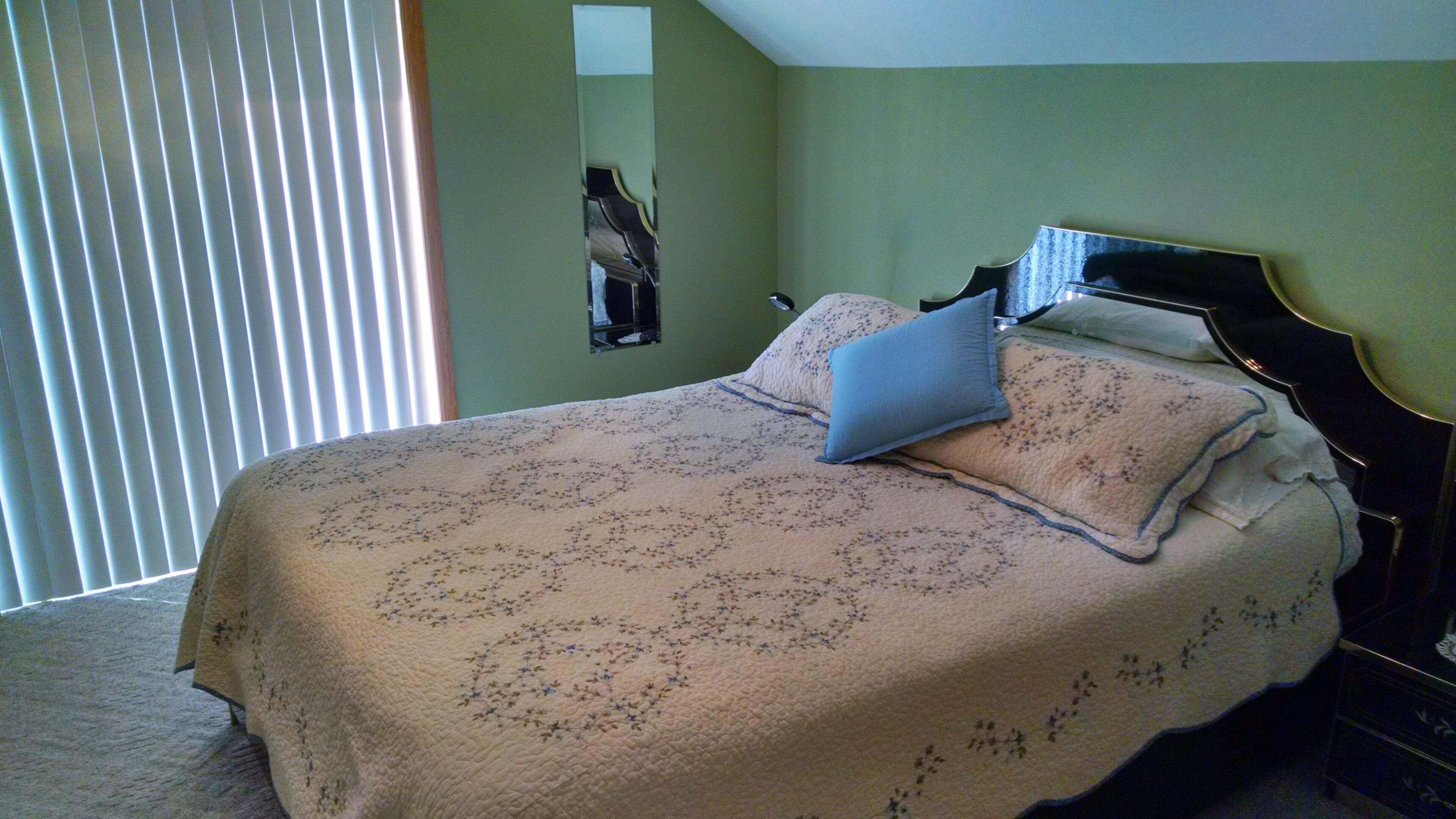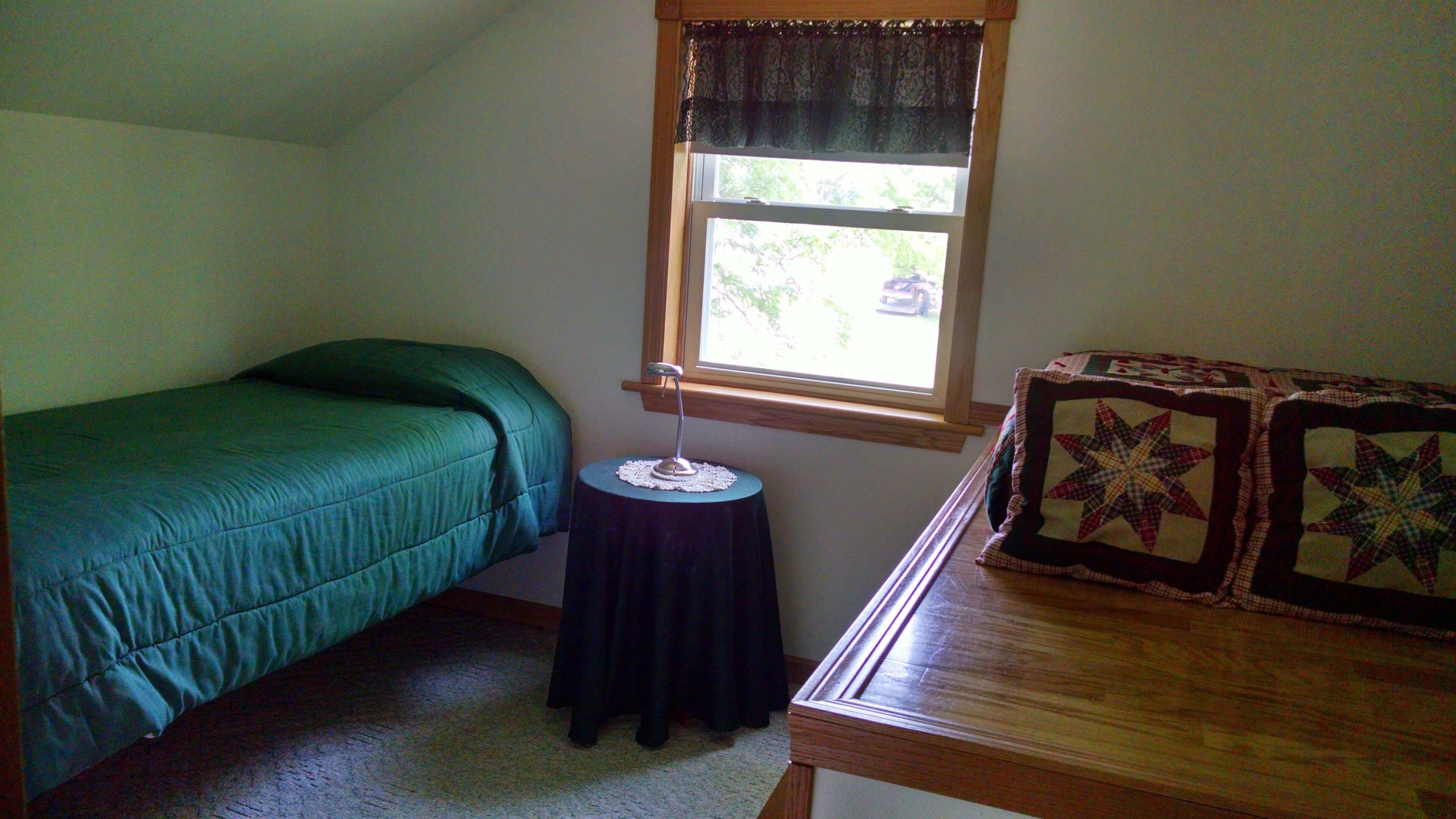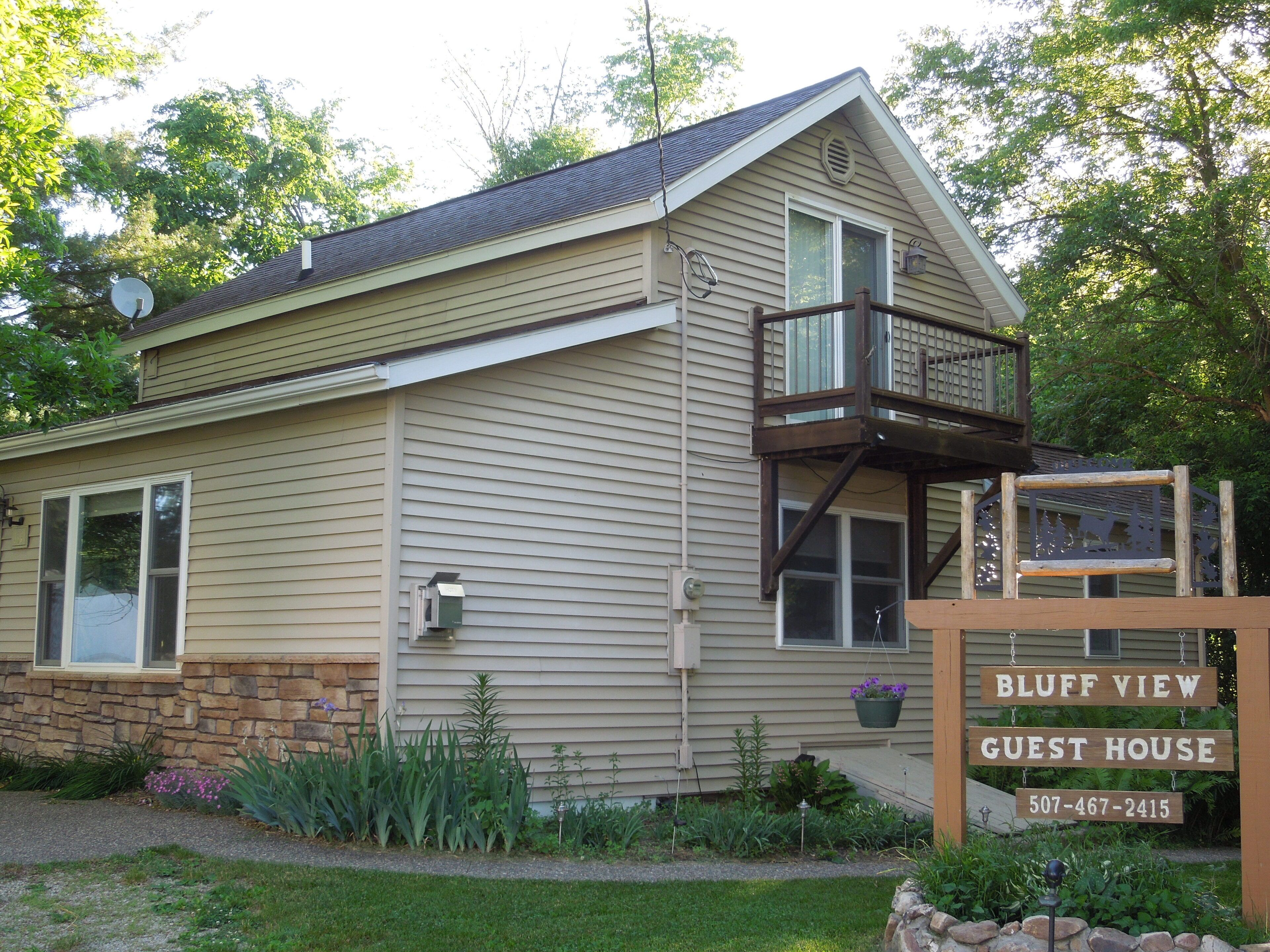 Bluff View Guest House This modern rental home provides privacy and comfort, with central air and fans. It includes two bedrooms, one with a queen bed and the other with two twin beds, along with a large great room, with a queen size memory foam mattress and a gas fireplace, plus a complete kitchen with dishes and dishwasher. The master bedroom has a walkout balcony; and, there's a 12'X20' deck, with grill, off the kitchen. Stepping down there's a decorative patio, with chimnea, which also provides a secluded, scenic view to enjoy the company of family and friends.