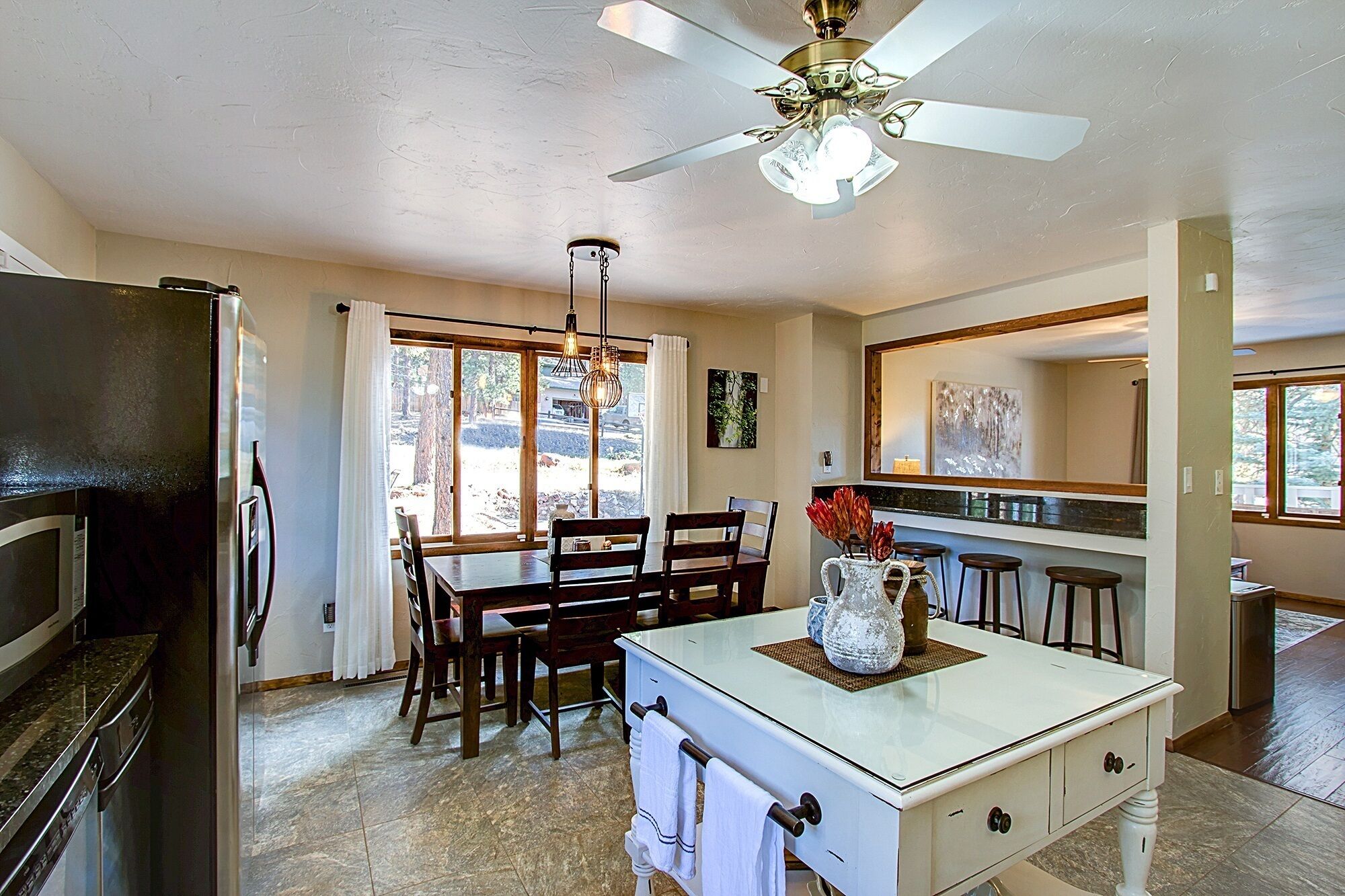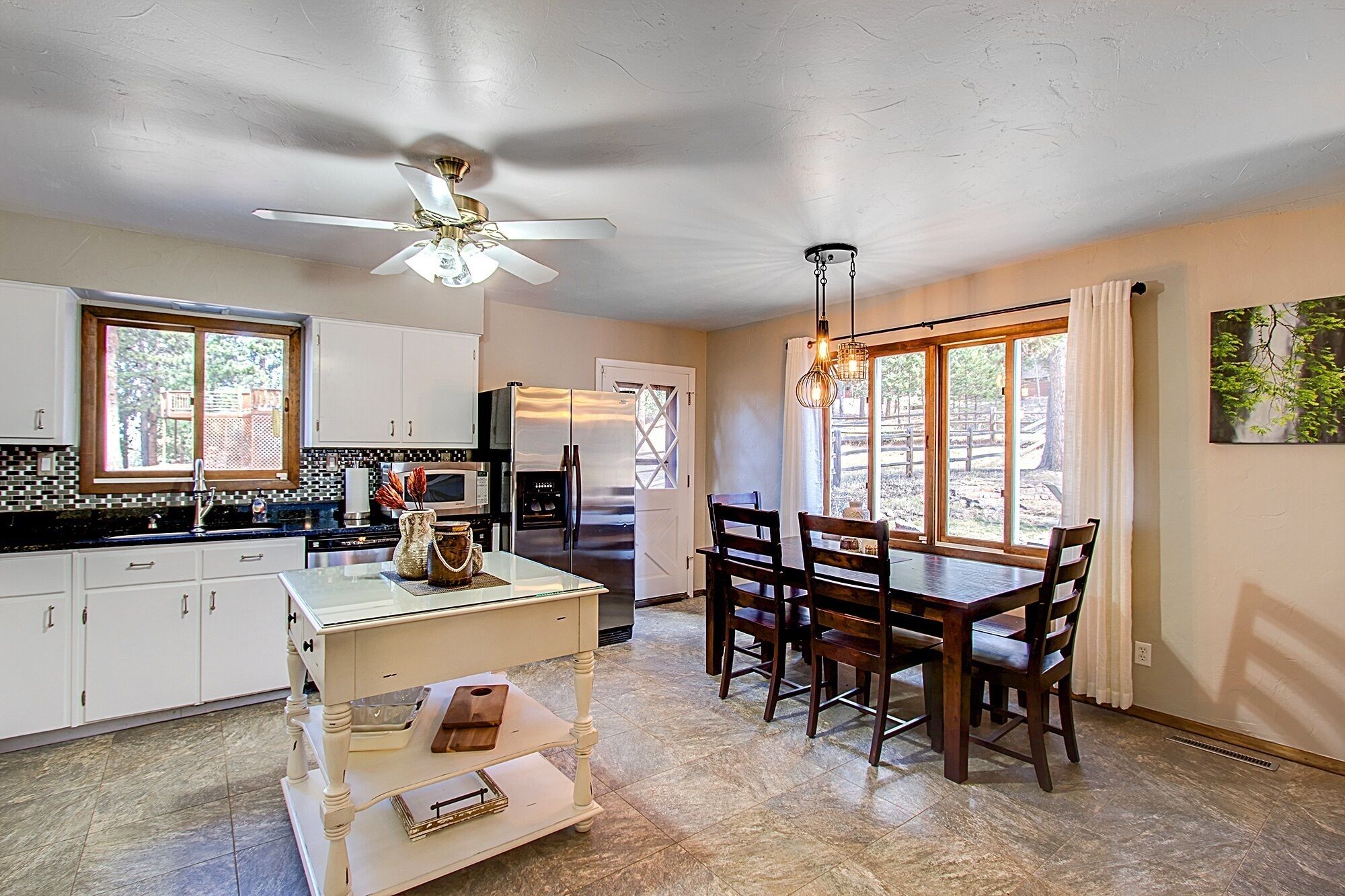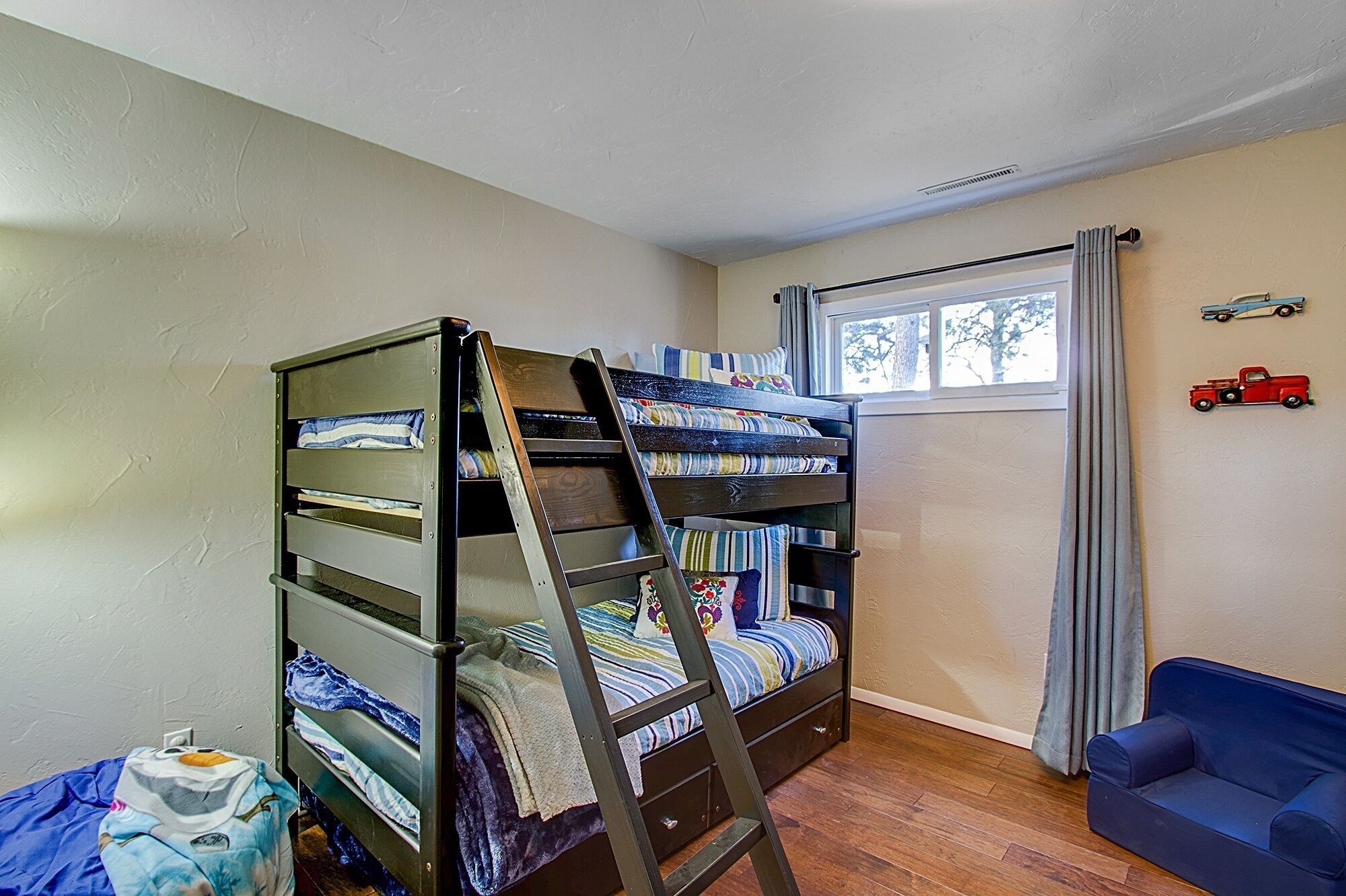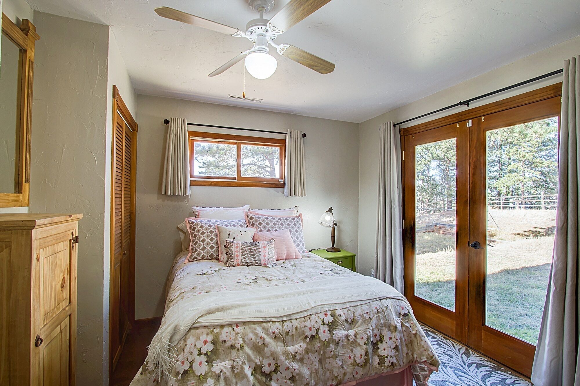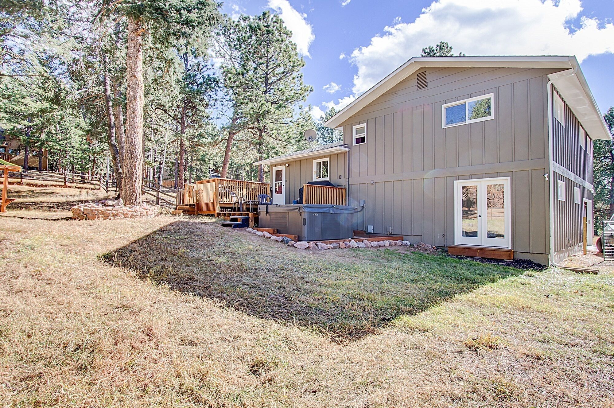 Quiet mountain homes for family gatherings This is a 5 Bedroom, 3 bath home on 1/2 acre in beautiful Woodland Park, CO. There is plenty of parking for at least 3 cars side by side and more if double parked. The yard is fully fenced and has a deck with a table that seats 6, (extra seating is available), a large Weber propane BBQ, a basket ball hoop, a volley ball/ badminton area and a young children's playset that includes swings and a slide and a hot tub that seats 8 for the entire family to enjoy the beautiful wooded surroundings. We do have a NO PETS, NO EXCEPTIONS policy. Please do not bring pets, several of our children and grand children are very allergic and your deposit will be forfeited should you ignore the no pet rule.*The home does NOT have air conditioning. It is usually not an issue except on the warmest of days because the house has a lot of shade from trees and there are celling fans in 4 of the bedrooms, the kitchen and the family room. There are 2 other large stand alone fans available to place where desired when and if ever needed. The basement is a large gathering place and is always cool.There is a pellet stove in the basement for DECORATION only! Feel free to adjust the thermostat to what ever temperature is desired during your stay.Security System: We have a security system that has camera's at each entry way to the home, the front door (a security doorbell), the back door (a security doorbell) and a set of French doors from the backyard to one of the bedrooms (a camera on the back of the house). A security code will be provided to you that disarms the system. There is audio capability with the 2 doorbells but not the camera at the French doors. The security system is primarily to ensure the security of the home during vacant periods. You can feel free to use it or not use it to secure the home and your belongings during your stay. The security camera on the back of the house is only to monitor access to the house at the glass French door. This camera may could be triggered to record activity in the area between the French doors and the hot tub depending on the size of the person and how close they are to the camera. This rarely occurs but to ensure you have complete privacy in the hot tub please be sure to use the hot tub cover lift as instructed in the house rules and the house book to take the hot tub cover up and off the hot tub. This creates a "wall" between the hot tub and the security camera and also provides privacy from the neighbor on that side of the property.