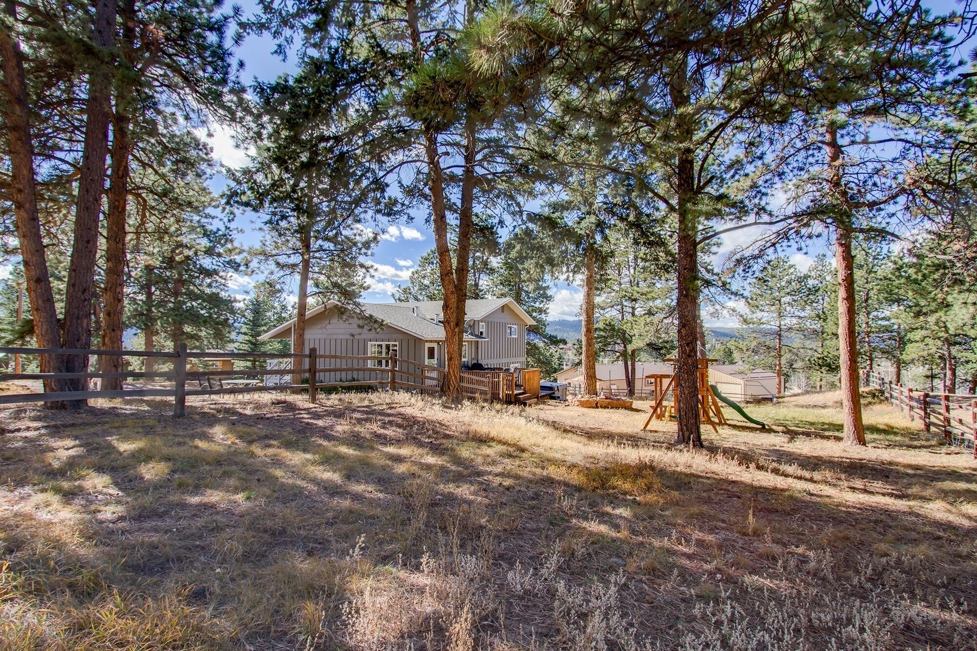 Quiet mountain homes for family gatherings This is a 5 Bedroom, 3 bath home on 1/2 acre in beautiful Woodland Park, CO. There is plenty of parking for at least 3 cars side by side and more if double parked. The yard is fully fenced and has a deck with a table that seats 6, (extra seating is available), a large Weber propane BBQ, a basket ball hoop, a volley ball/ badminton area and a young chil...