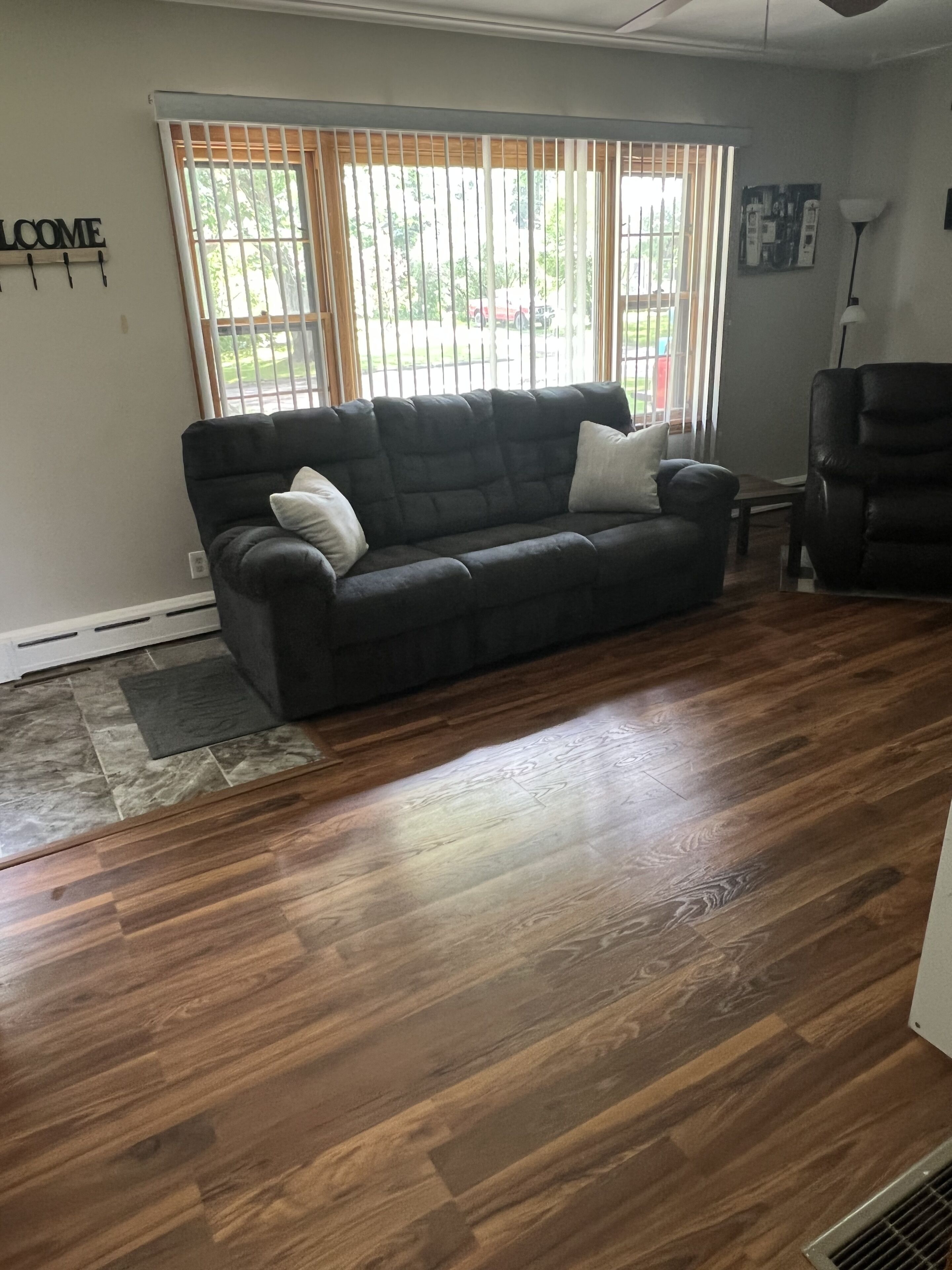 Comfy Residential And Freshly Updated Home on the Edge of Town! Relax with the whole family at this peaceful place to stay. 2-bedroom residential home in quiet neighborhood on the edge of town. Full upstairs bedroom, downstairs bedroom, bathroom on main floor and in basement. Living room with flat screen TV, couch, recliner, office room, kitchen, basement with full access to laundry, central air,...