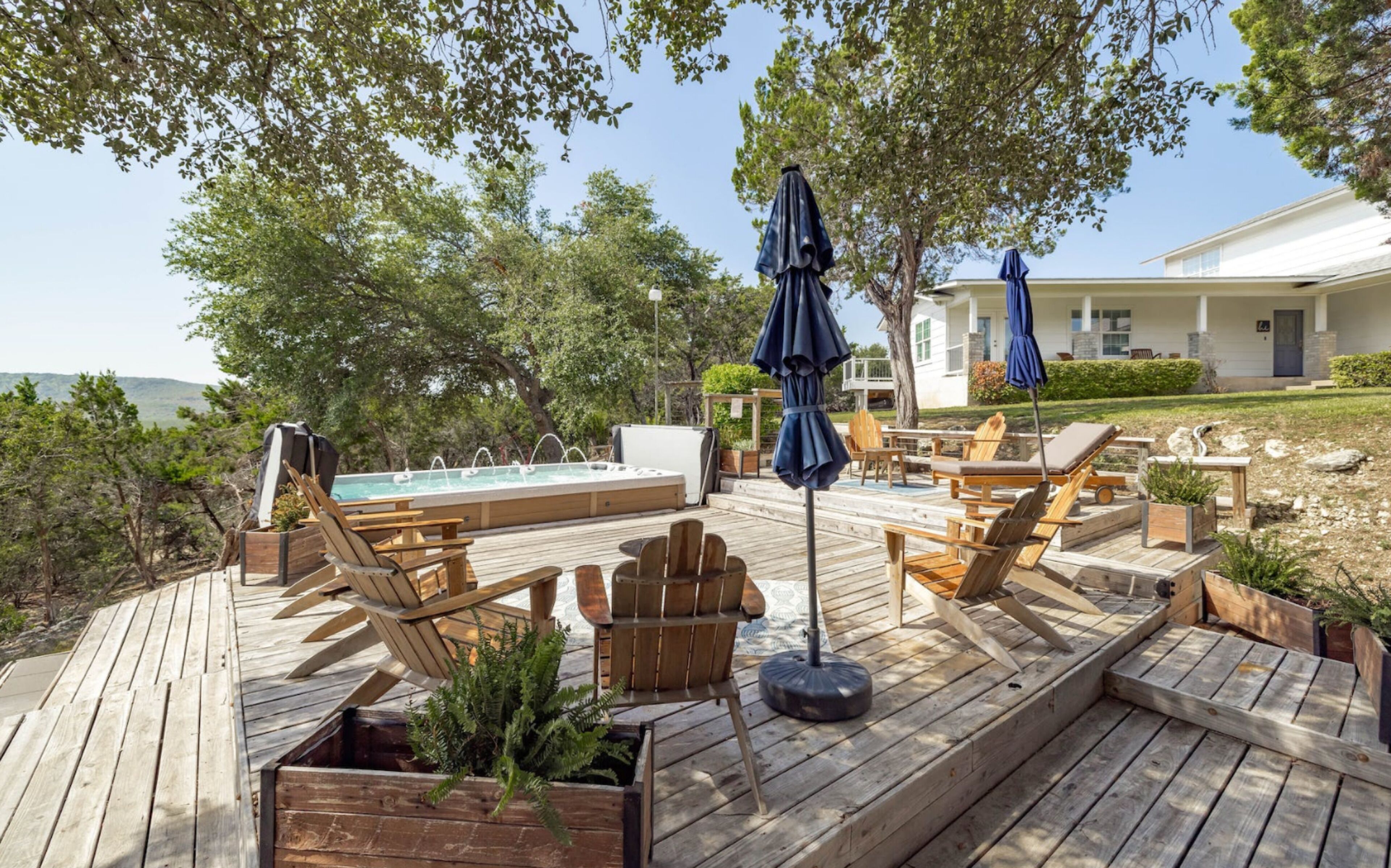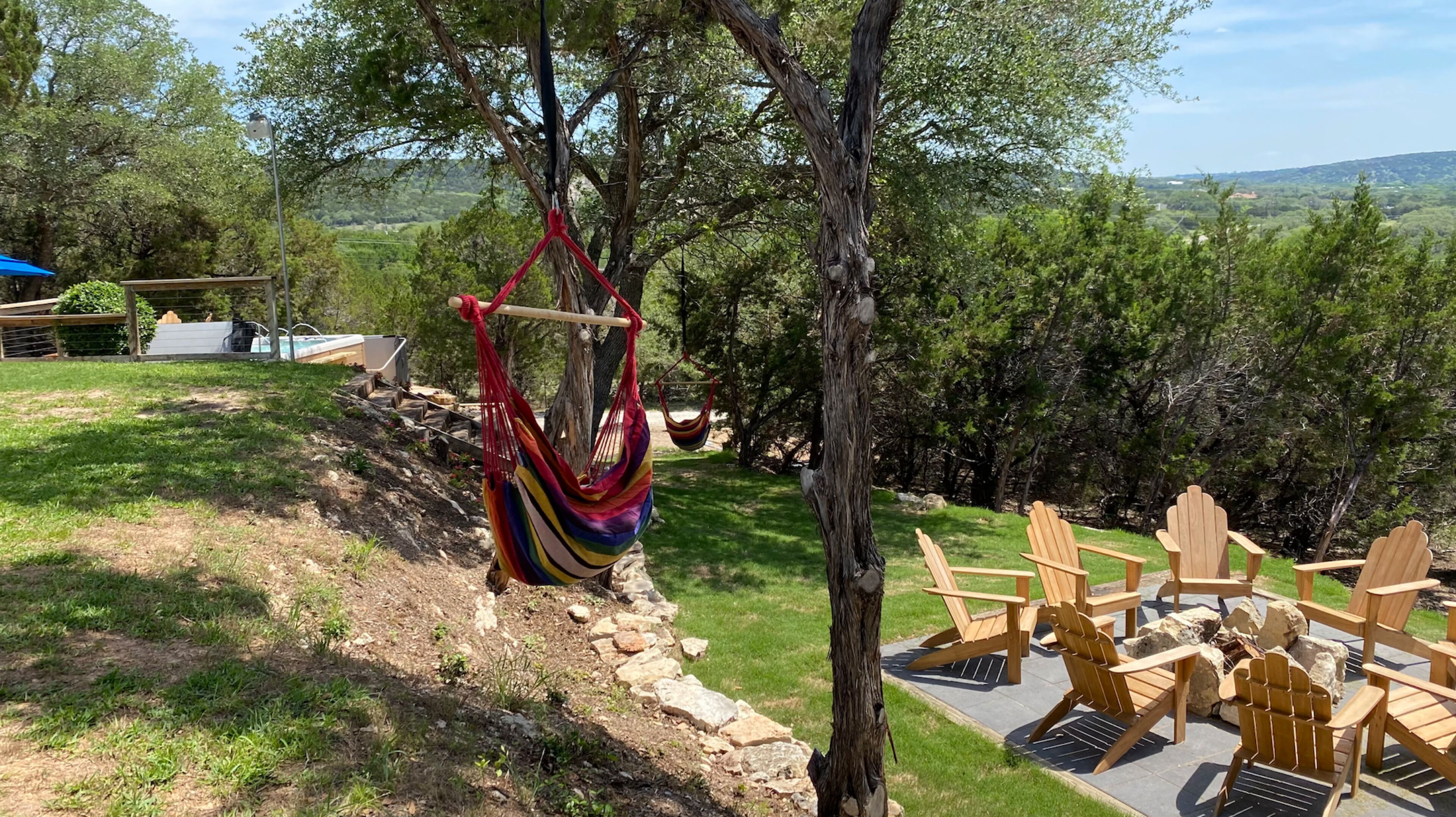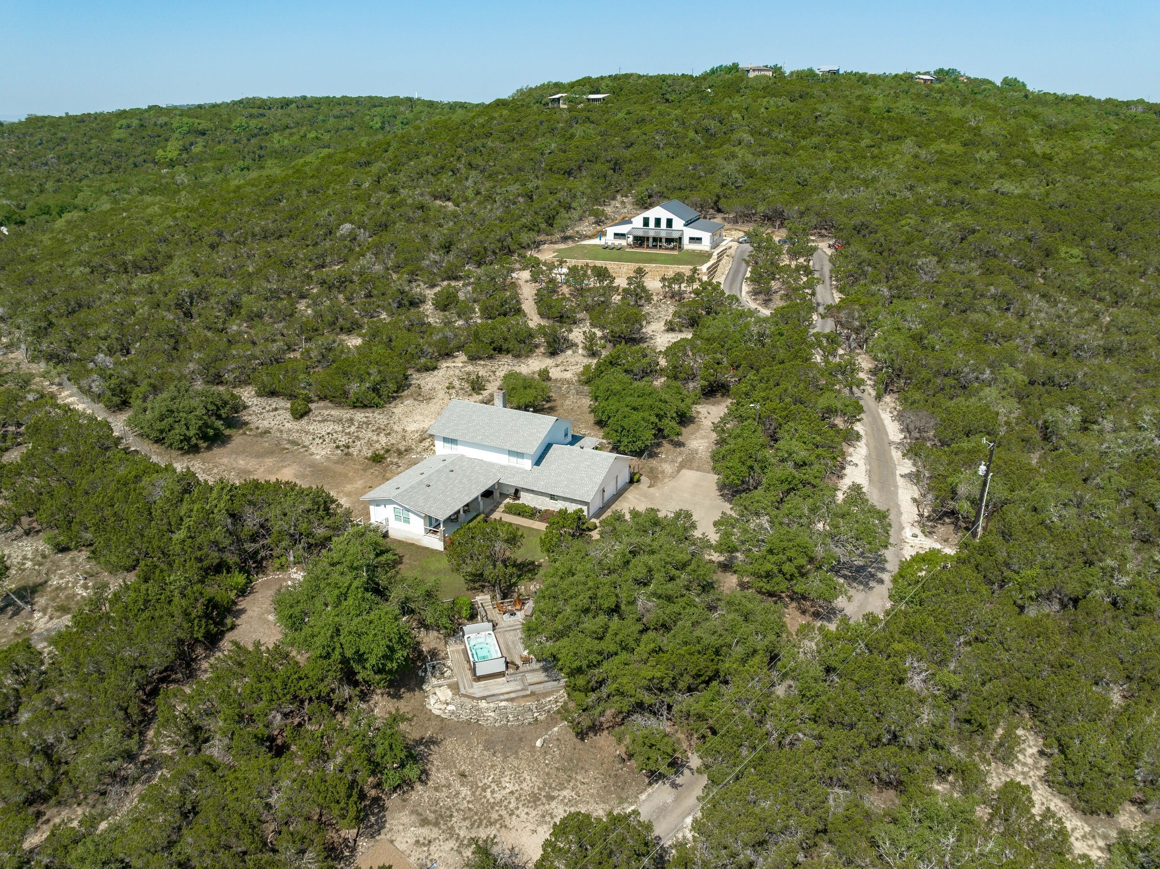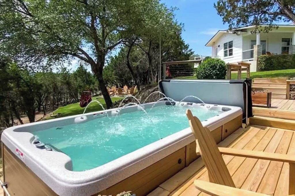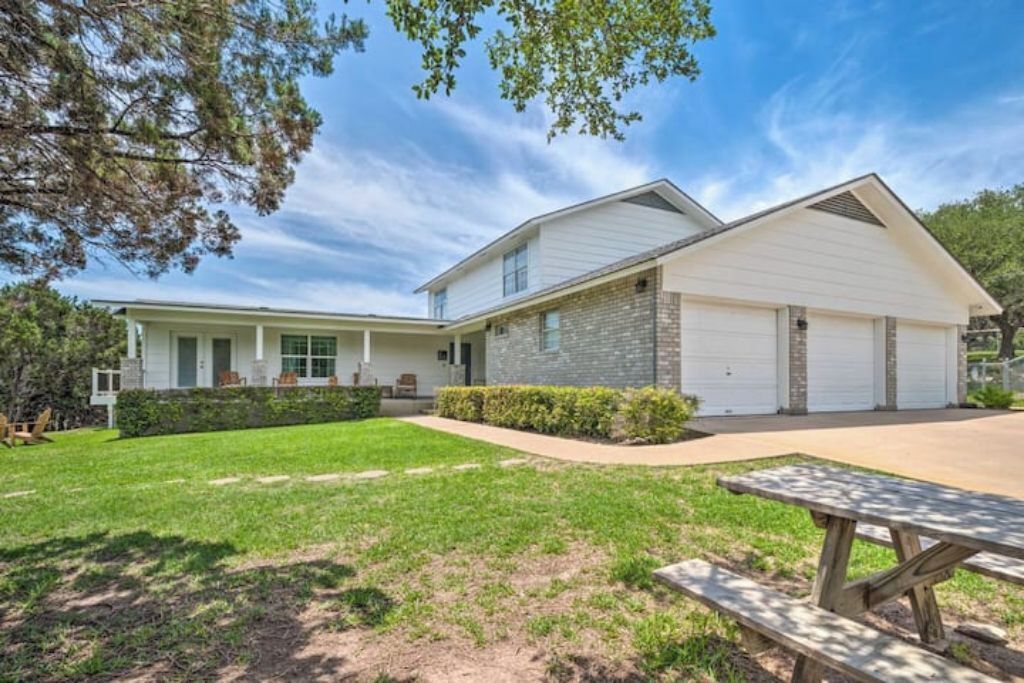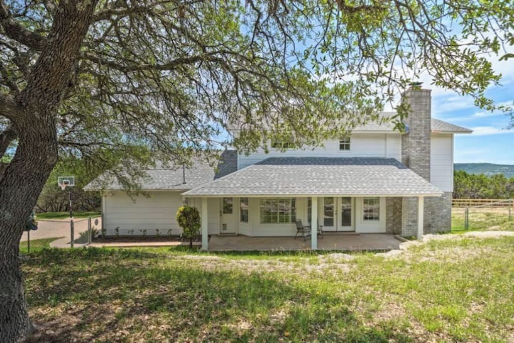 Surrounded by hills + xll spa + pool table + game room + two master rooms You're sure to fall in love with the Texas Hill Country's breathtaking scenery, abundant wildlife, and star-speckled nights when you stay at 'Falcon's Nest,’ a 4-bedroom, 3-bathroom vacation rental! Located on an 8-acre property, this 2-story house sits near the Colorado River and features a game room, modern furnishings, and a swim spa that overlooks the scenic landscape. This getaway is ideal for gathering with your loved ones and creating memories to share for years to come.The space8-Acre Property | Game Room | 2,800 sq ftBedroom 1: King Bed | Bedroom 2: King Bed, Full Bed | Bedroom 3: Full Bed | Bedroom 4: 2 Full Beds w/ Twin Trundle BedsBIRDWATCH: Peregrine Falcons, Prairie Falcons, Red-Tailed Hawks, Golden Eagles, Great Horned Owls, Barred OwlsOUTDOOR LIVING: Furnished deck w/ 10-person swim spa, bistro lighting, sun umbrella & views, front yard w/ picnic table, charcoal grill, 3 hammocks, tree swing chair, fire pit & seating, 2 covered patios w/ seating & rocking chairs, fenced backyard, basketball hoopINDOOR LIVING: 2 living areas, wood-burning fireplace, Smart TV, exercise bike, pool table & dartboard, dining table, modern furnishingsKITCHEN: Stainless steel appliances, dishwasher, fridge, oven, 4-burner stovetop, microwave, breakfast bar w/ seating, blender, Keurig coffee maker, tea kettle, toaster, cooking basics, dishware & flatwareGENERAL: Free WiFi (100 Mbps), keyless entry, central heating & A/C, washer/dryer, linens/towels, complimentary toiletries, beach chairs/towels, laundry detergent, trash bags & paper towelsFAQ: Stairs required to access, 4 exterior security cameras (facing out), other rental on-sitePARKING: Driveway (5 vehicles)PROPERTY: There are two completely separated homes on the 8 acres. Each with its own swim spa and exterior space. they are 250 feet away from each other.Guest accessYour host will provide app links to the gate and door.Other things to noteThis property has been listed for one year through a third-party site which doesn't allow us to 'take' our 5-star reviews when suspending the membership. You can see some of the reviews in the photos.