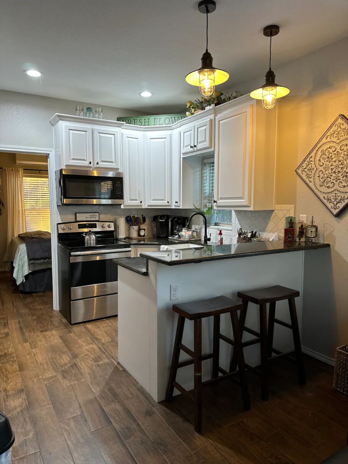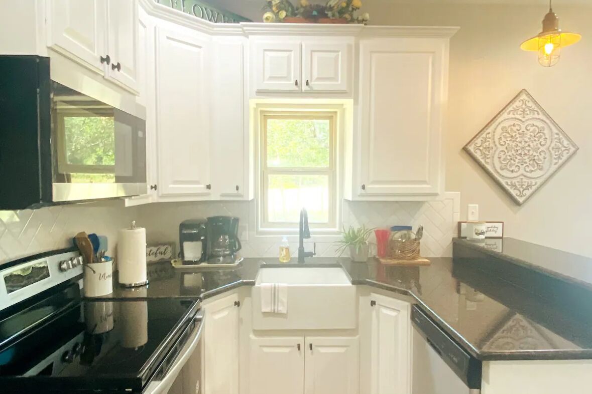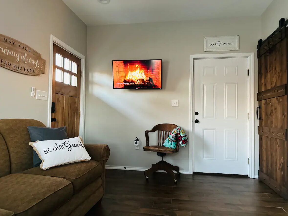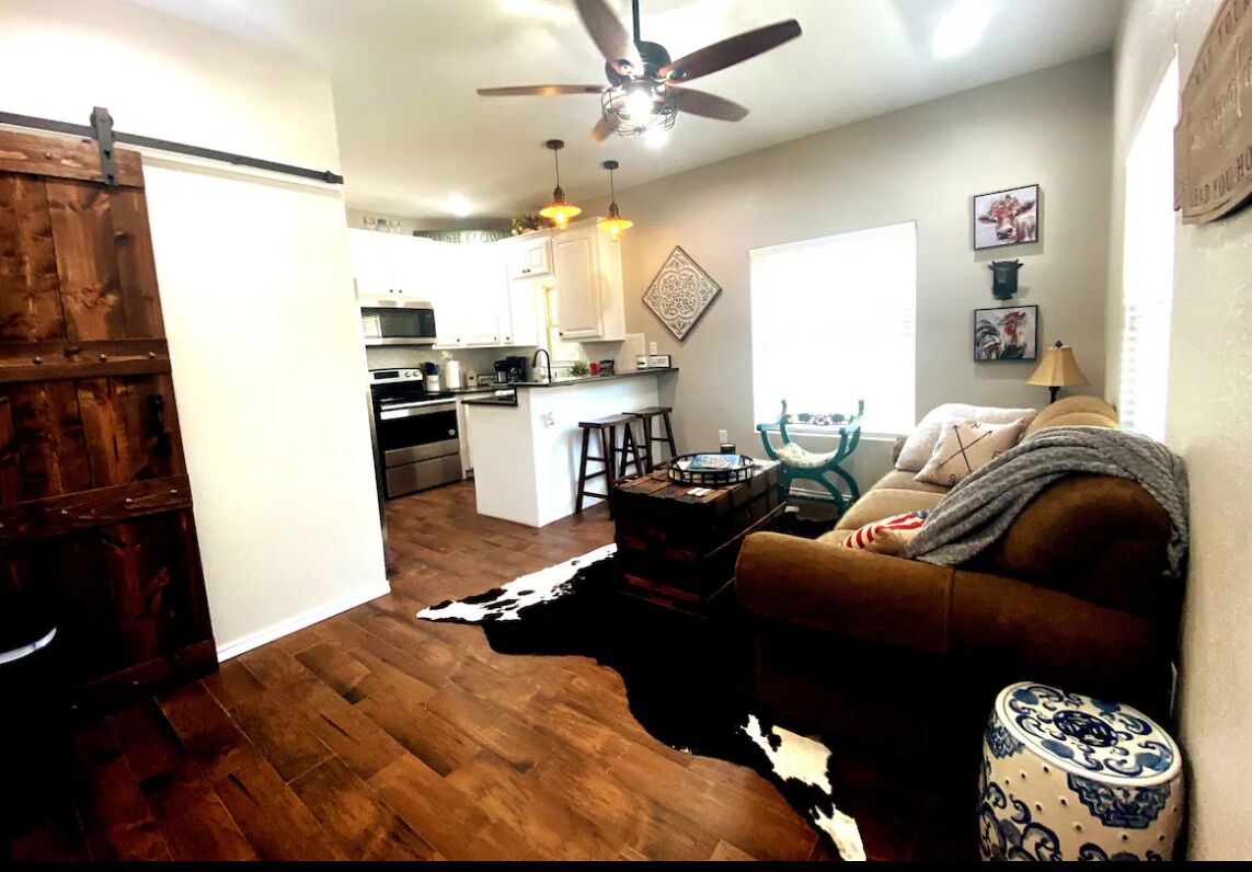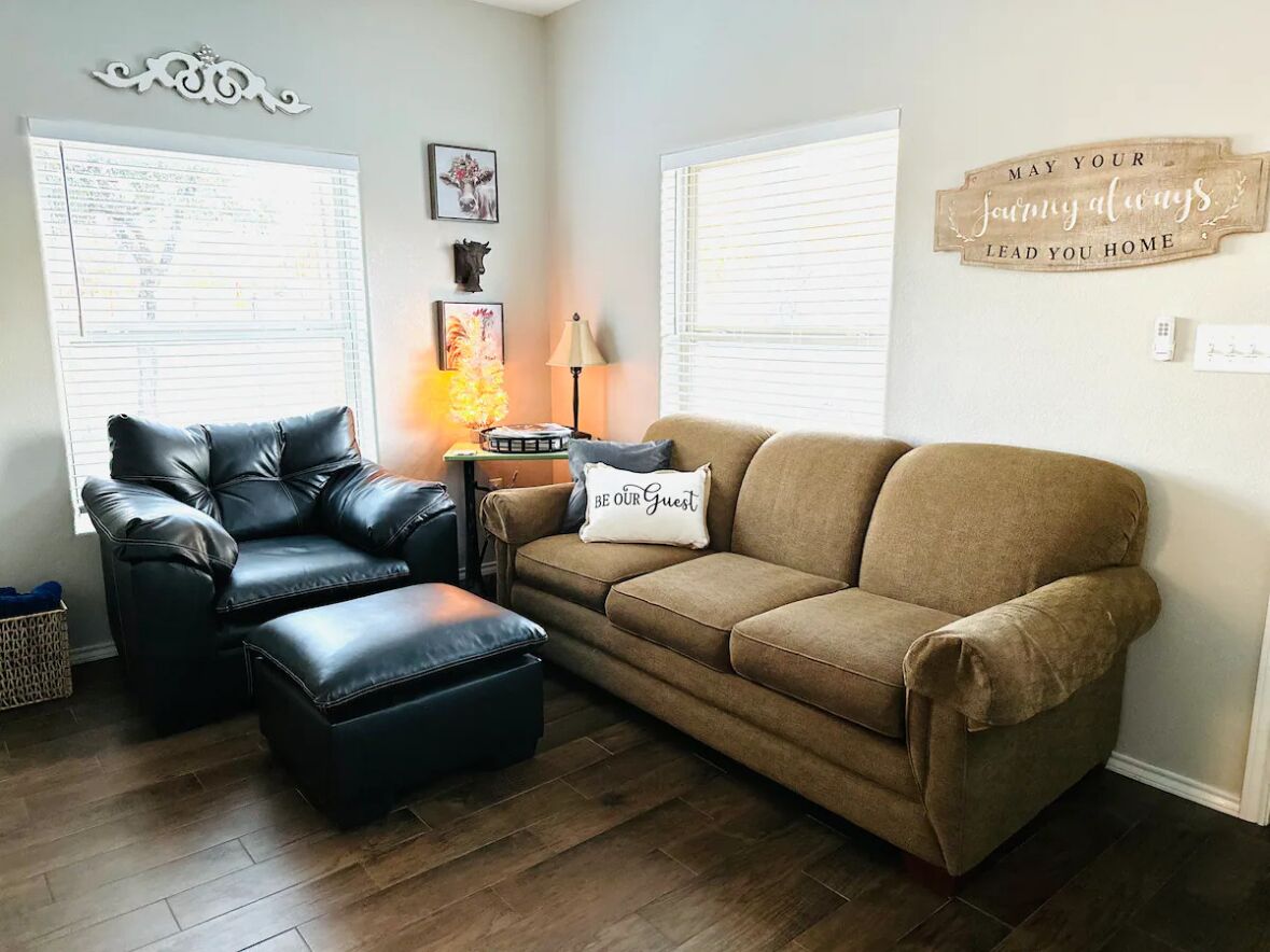 Lookout Guest House: One Bedroom Country Living 1055 The Lookout Guest Home: This new country guest house has a farmhouse design that offers a peaceful and clean at home feel. This guest home is located 15 minutes north of Stephenville and 50 minutes west of Ft. Worth.Kitchen: Fridge, microwave, coffee maker and basic condiments you will need for your stay.Bed: plush top with cozy linens. Roll aw...