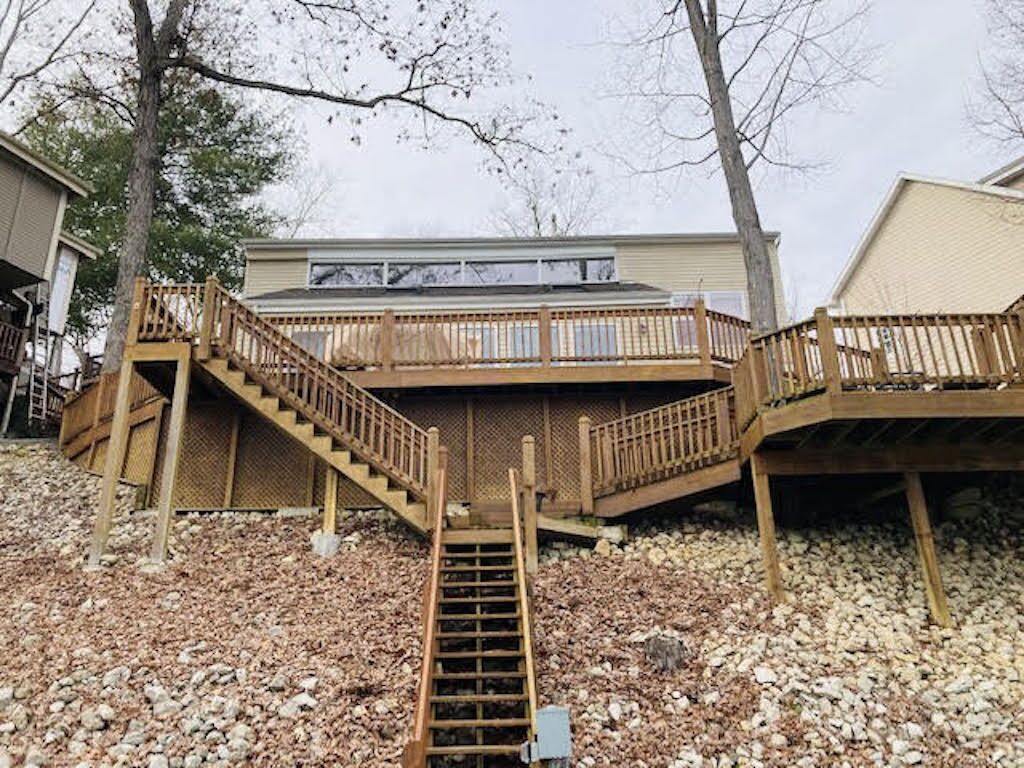 Charming Lake Front House with Main Channel View This 3 bedroom, 2 bath home is the perfect combination of cove protection with a big main channel view, a dream when it comes to a vacation rental! This home has flat parking for 5 vehicles, a newly installed dock, roll-up bar, swim platform with waterslide & 2000 square feet of lakefront decks. There are 3 large bedrooms (2 have a queen bed and 1...