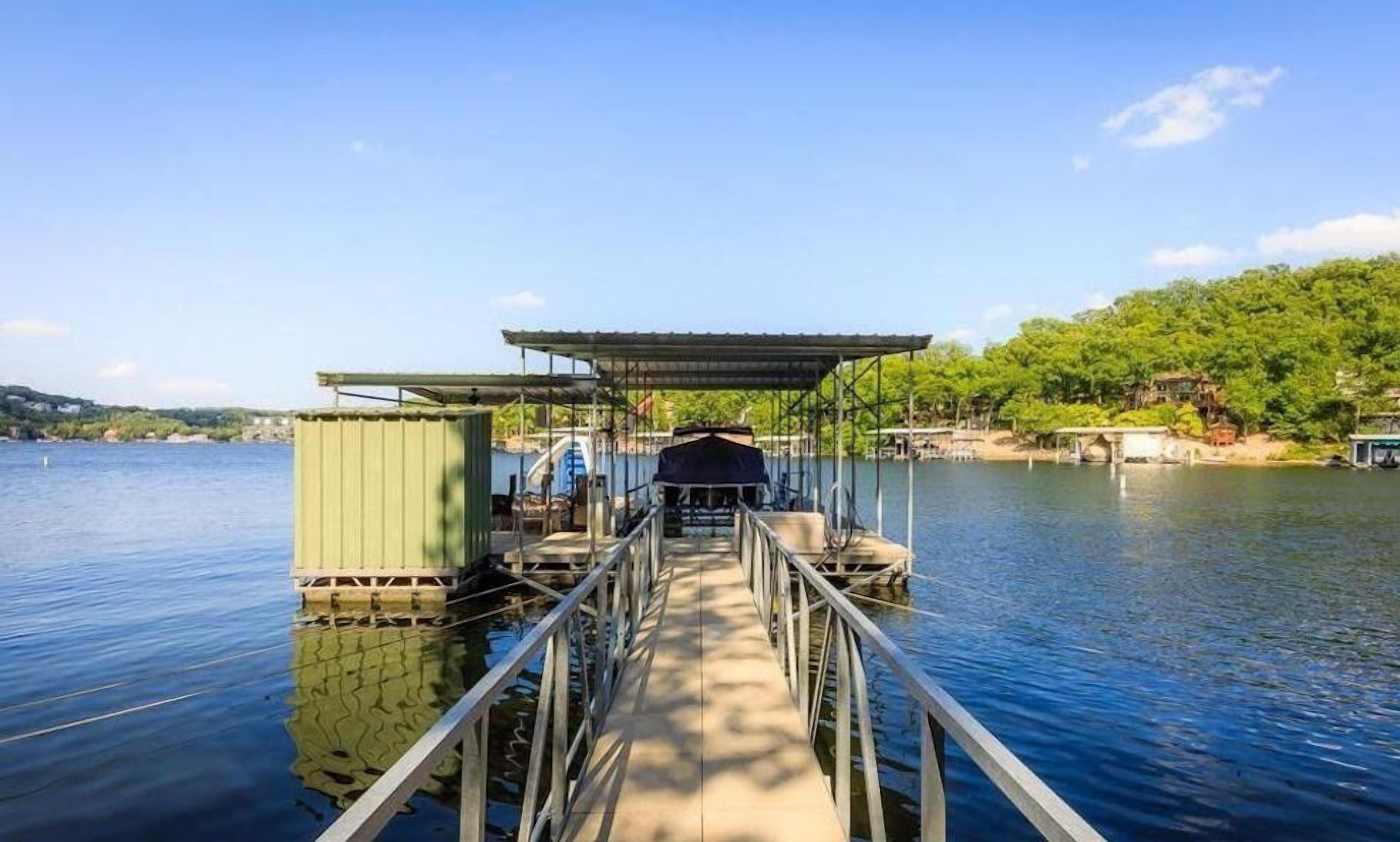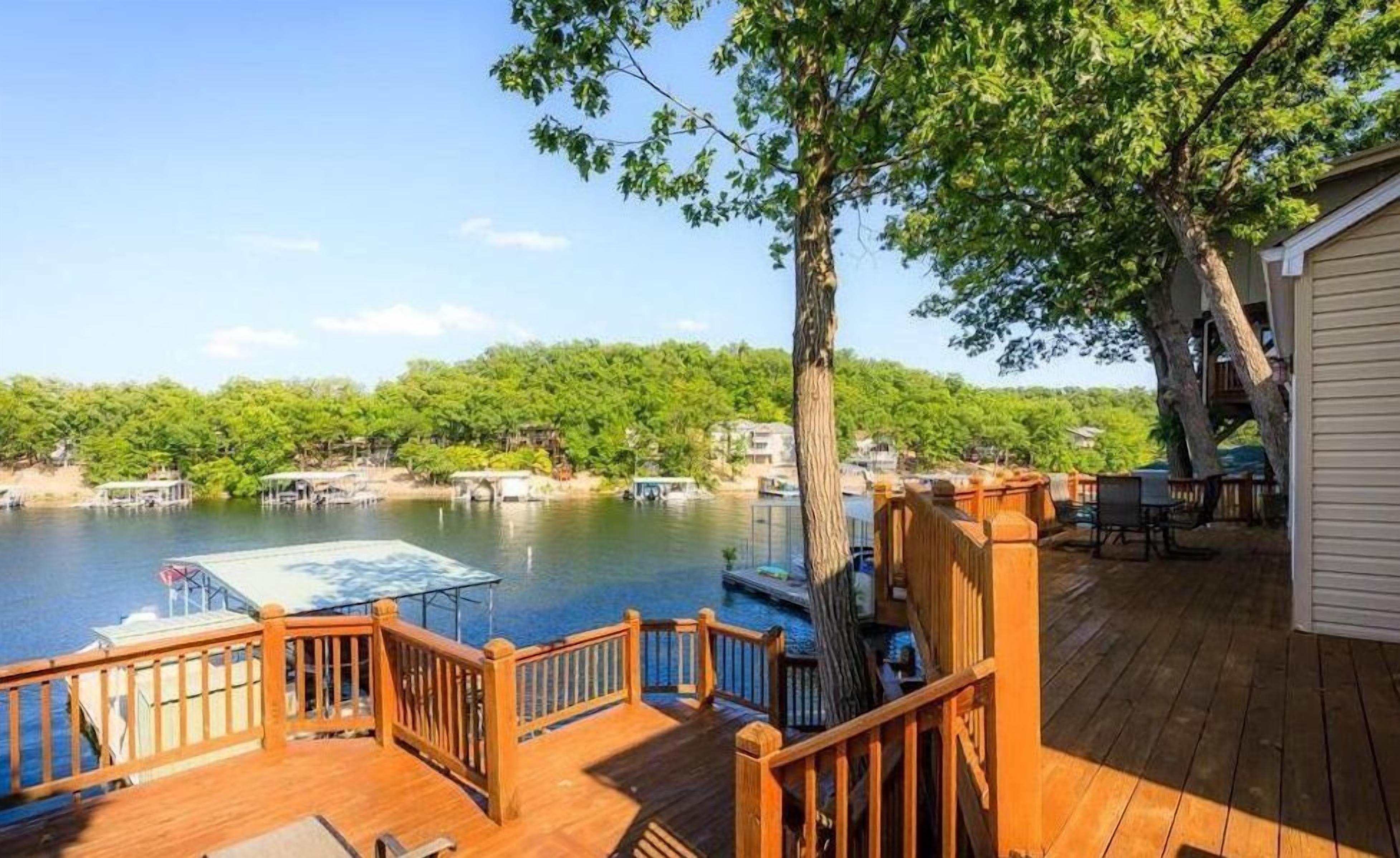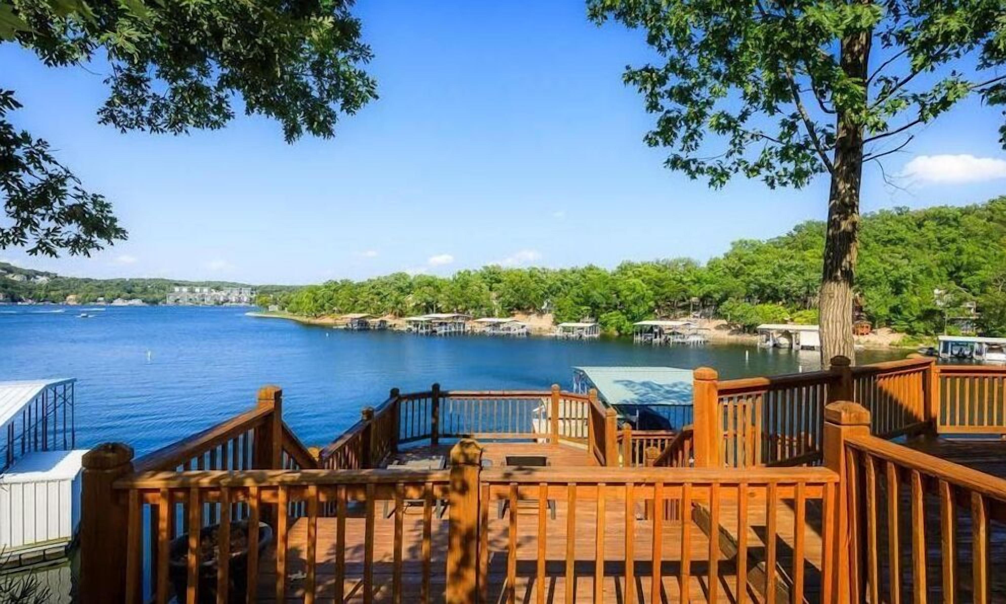 Charming Lake Front House with Main Channel View This 3 bedroom, 2 bath home is the perfect combination of cove protection with a big main channel view, a dream when it comes to a vacation rental! This home has flat parking for 5 vehicles, a newly installed dock, roll-up bar, swim platform with waterslide & 2000 square feet of lakefront decks. There are 3 large bedrooms (2 have a queen bed and 1 with 2 queens) 2 full bathrooms, vaulted ceilings in the living room, an updated kitchen with stainless steel appliances, updated flooring throughout & a bonus area with a desk. This home has it all and is located just a few minutes from the grocery store, the strip, and many fantastic lake area dining and conveniences!