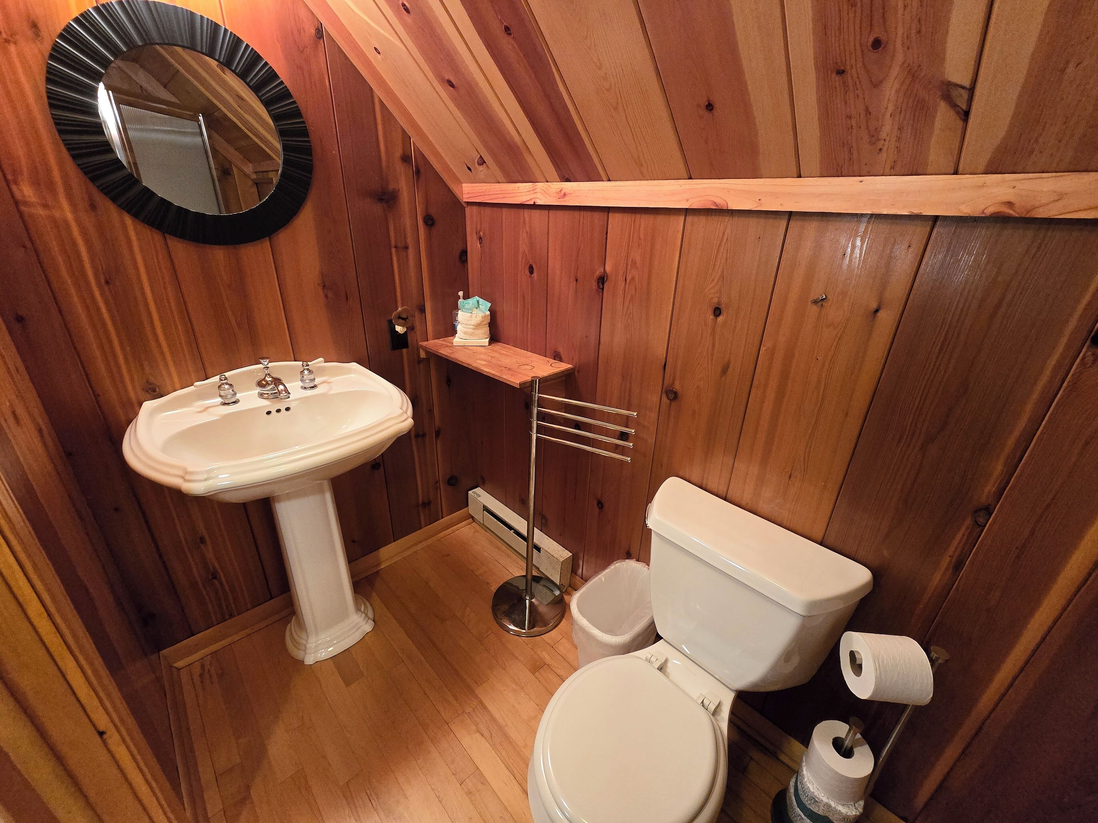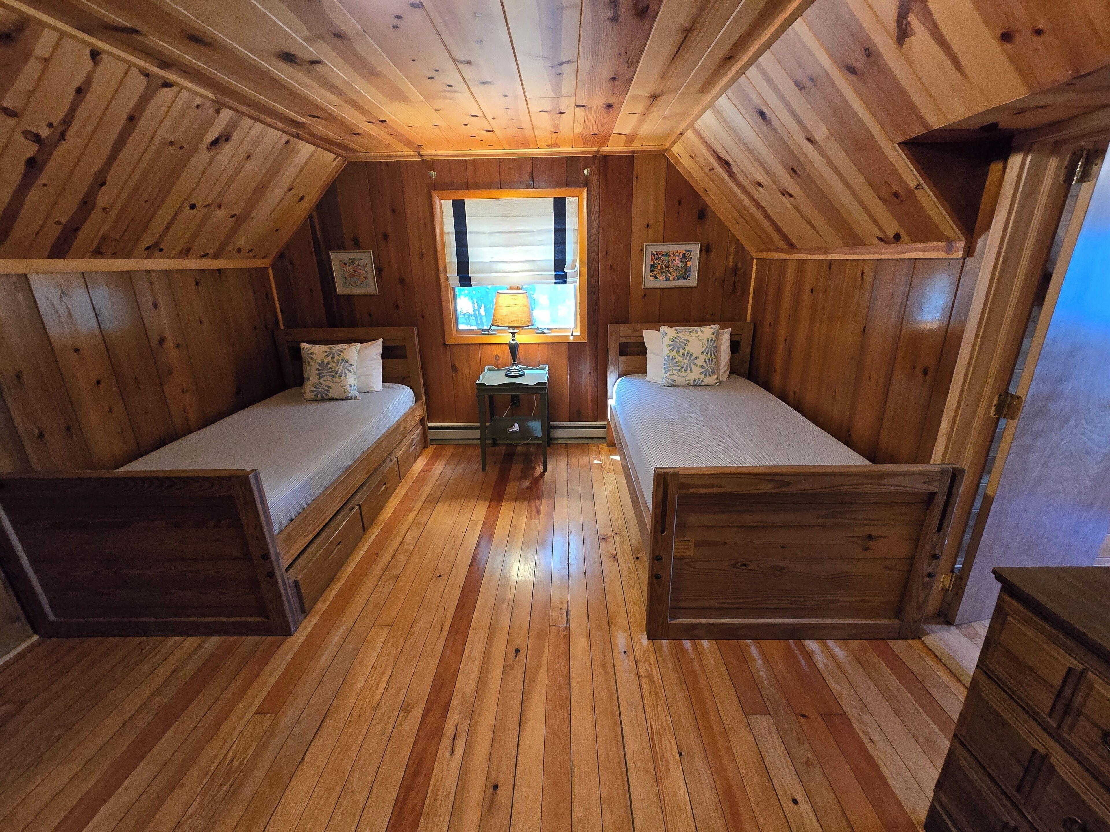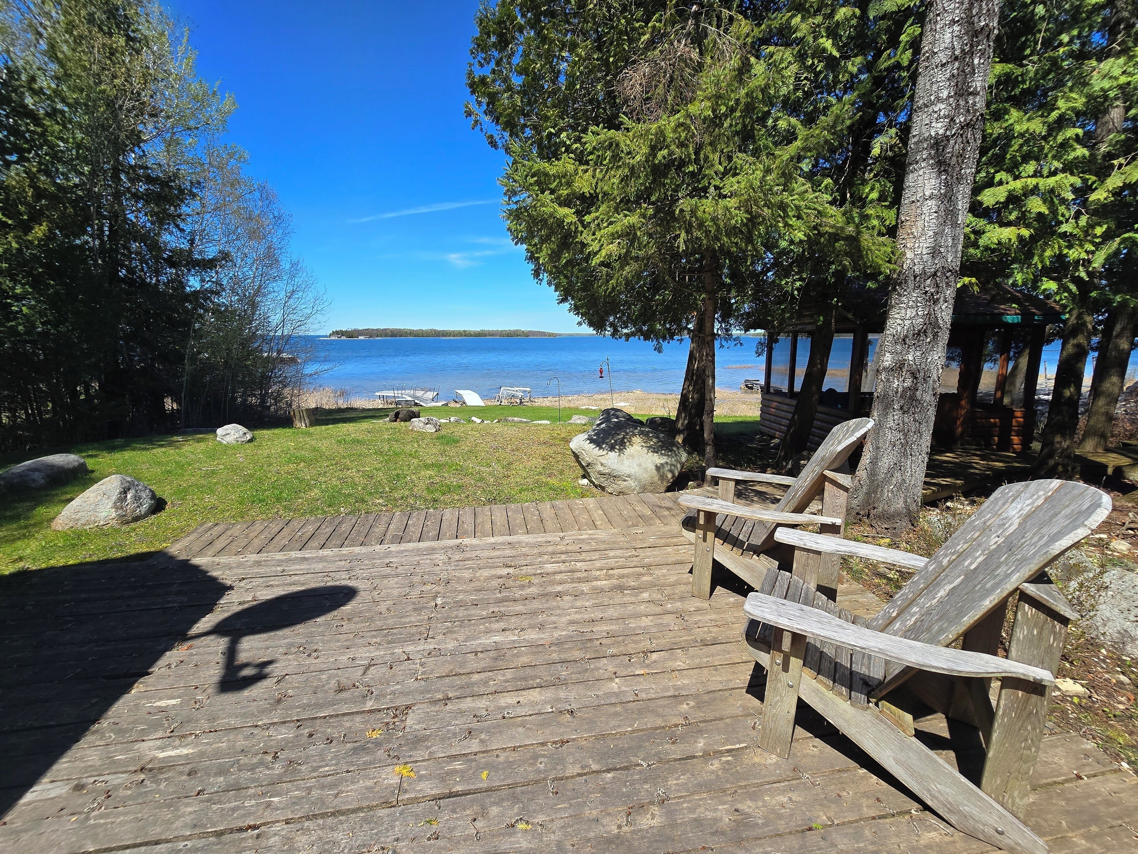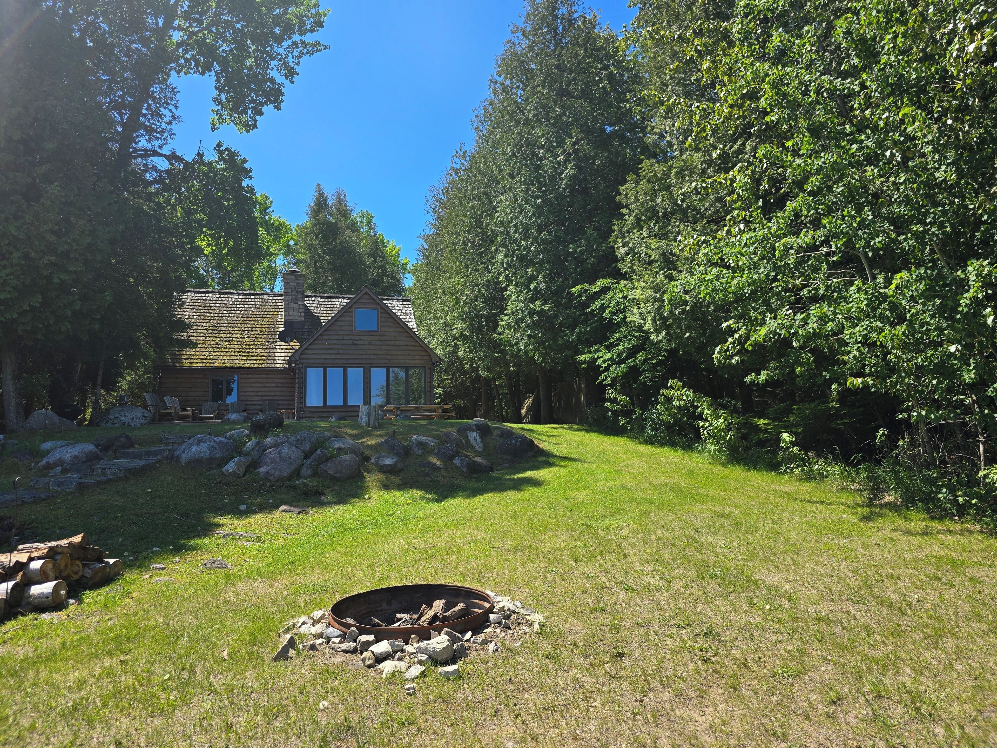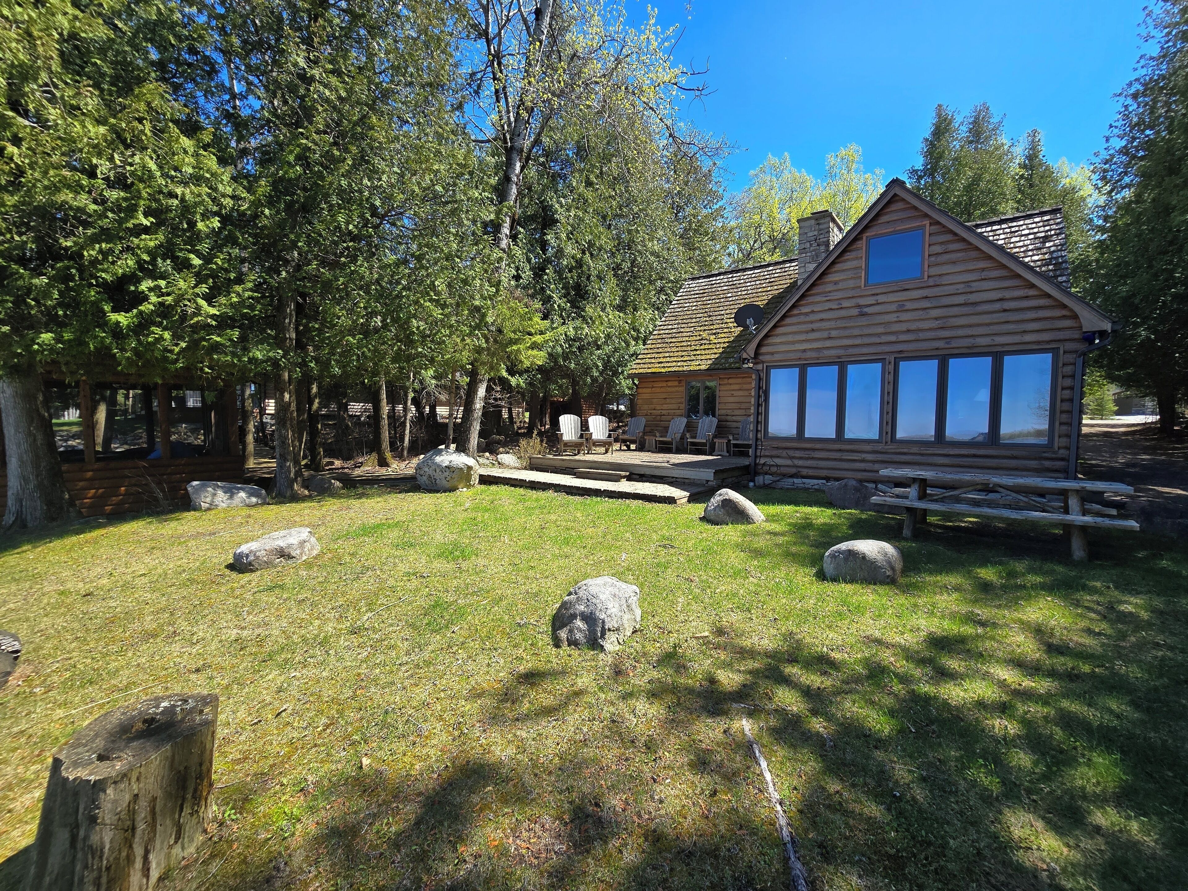 Drummond Island Hotel & Vacation Homes - Camp McGinnis Cedar shake shingles will catch your eye the moment you pull into the drive. A beautiful limestone fireplace will warm the hearth on those cool evenings as well as refresh the soul after a long day of play. The hardwood floors and wide pine tongue and groove paneling adds to the nostalgia this home offers. The screened gazebo is the perfect p...