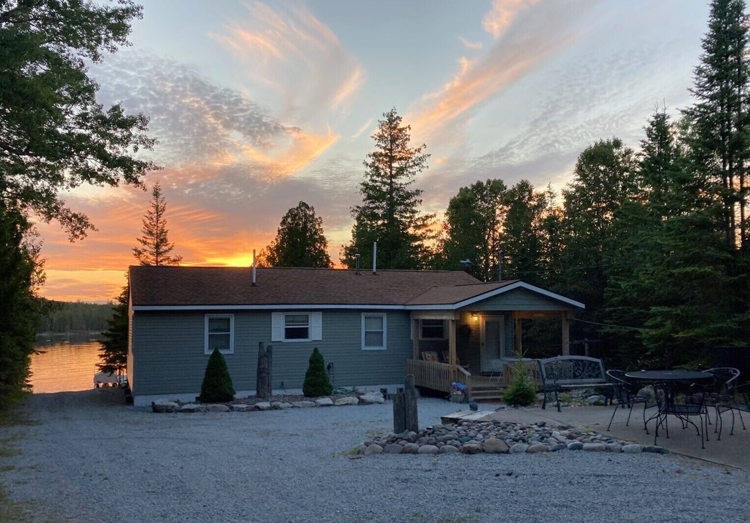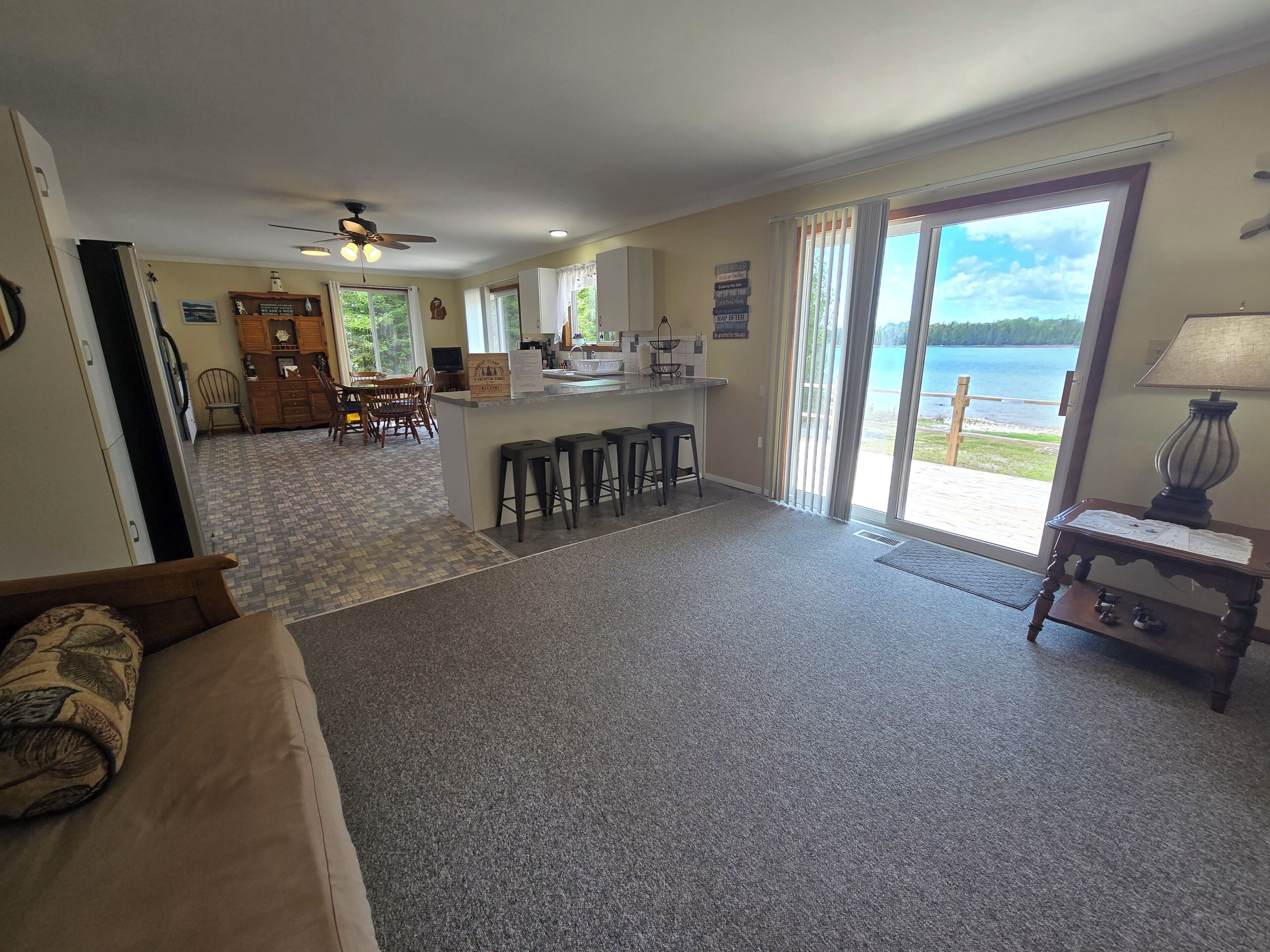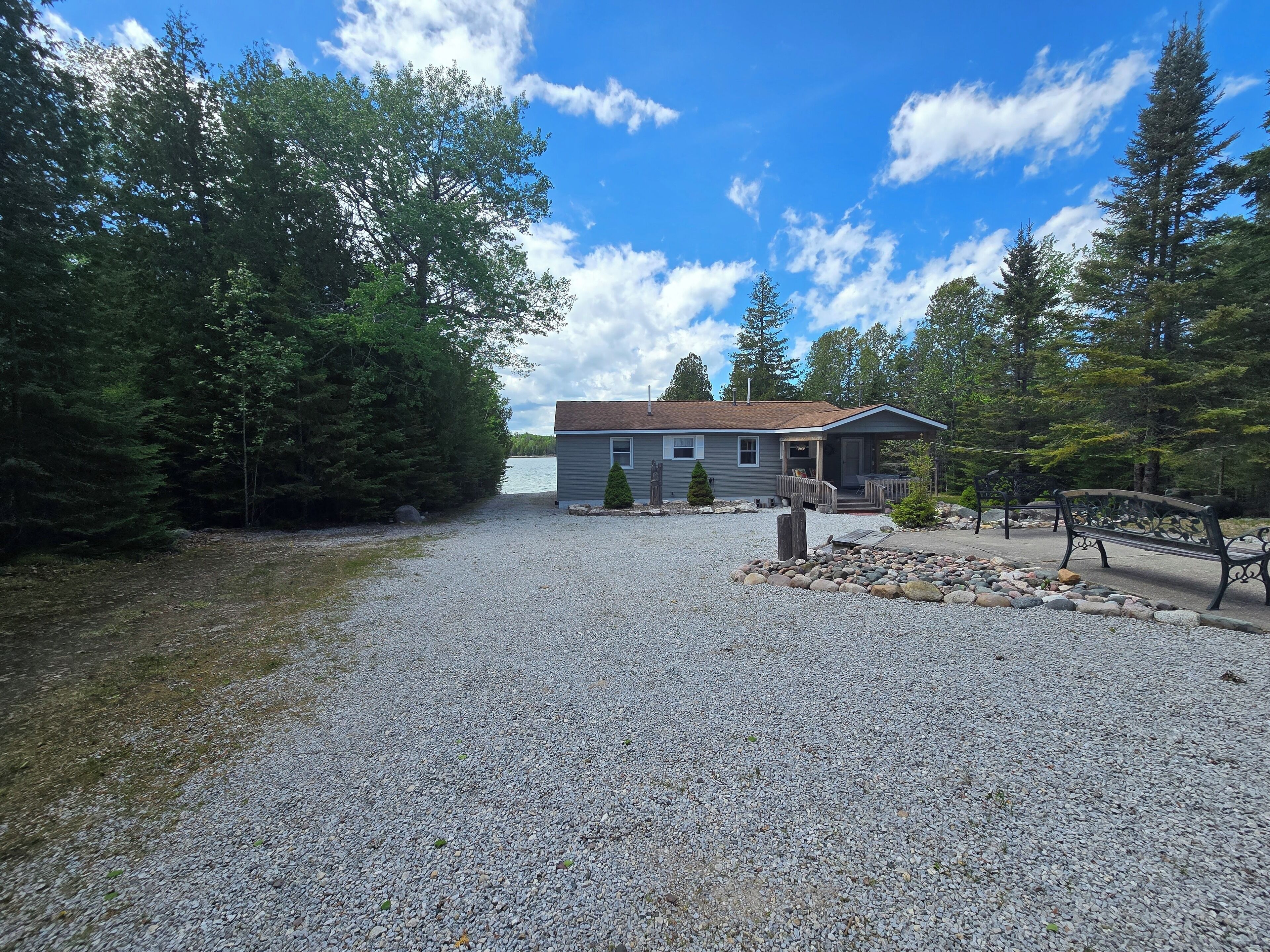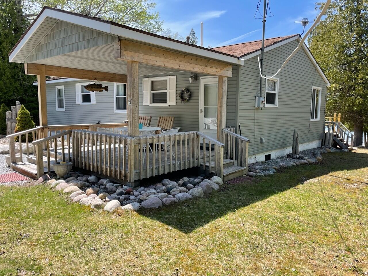 Drummond Island Hotel & Vacation Homes - Memory Maker Bay Sunsets, Freighter views & Relaxation Drummond Island is all about Making Memories that last lifetimes and often for generations. Such is the case with Memory Maker Bay this home is located in beautiful Fairview Cove. Amazing sunsets, freighter views and relaxation are the name of the game.This is a 2 bedroom, 1.5 Bathroom home. Bedroom 1 has a Queen bed, Bedroom 2 also has a queen bed. There are 2 futons in the living room. Allowing this house to sleep 8. The kitchen is expansive and perfect for lots of people gathering for a meal. The kitchen and living room look out to the water. The house has a deck across the entire front for lots of outdoor relaxing.There is a large front yard and a dock that would accommodate a small fishing boat or pontoon due to shallow water (2-3 feet at the end of the dock). This home also has 2 kayaks to explore the bay. There is a firepit on the water side. If it happens to be windy or rainy you can enjoy the outdoors on the covered porch on the back of the home.If you have a larger group the home next door – Fairview Cove, sleeps 10 and is also in our rental programIf you are coming to Drummond Island to ride the trails, you will need to trailer to the trailhead from this home. Side x Side’s and ATV’s are NOT permitted on M134/Channel Road. AT A GLANCE: Bedrooms:2 Bedrooms, Sleeps 8Bedroom 1 = 1 QueenBedroom 2 = 1 QueenLivingroom = 2 FutonsBathrooms:1.5 Bathrooms · If you are making this reservation within 24 hours of arrival please call for check in instructions.· Check-In after 4 PM. Check-Out by 9 AM. Check in at Drummond Island Hotel & Vacation Homes at 34834 S Townline Road. We will provide you with keys & directions.· Any fees associated with processing a credit card will NOT be refunded if you cancel your reservation.· This home is NOT Pet Friendly
