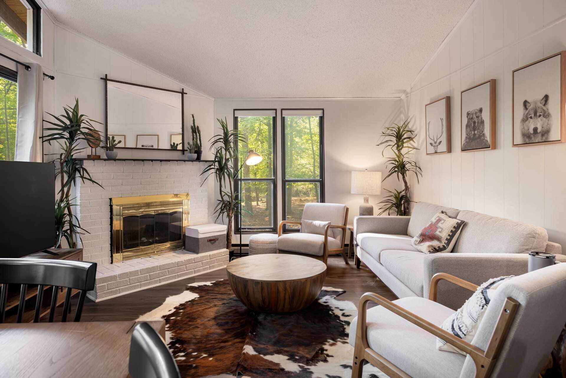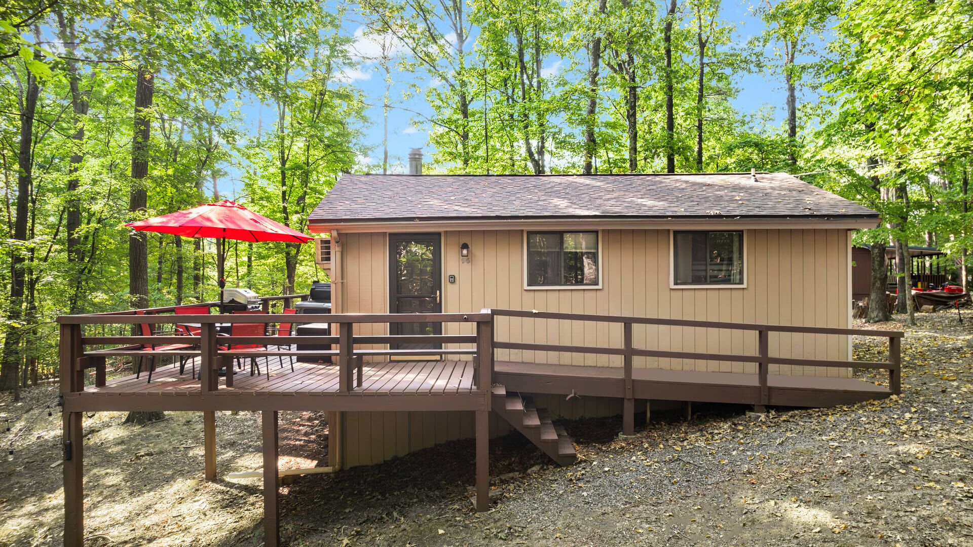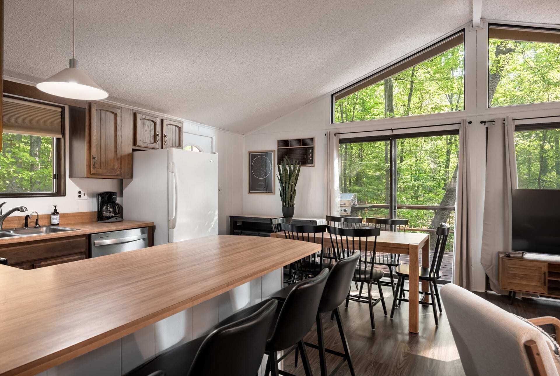 Hot Tub, Fire Pit, Deck, Grill w Resort Amenities Summary:Golden Pines, a bright and cozy chalet with modern touches throughout. Nestled in The Woods Resort - you’re sure to enjoy the amenities. Explore Berkeley Springs and the WV mountains at this unique getaway! The highlights: - Enjoy views from the large great room - Relax or grill on the wraparound deck - Cozy up by the fire pit - Stream movies or take video calls on fast WiFi (100 Mbps) - Drive 15 mins to Berkeley Springs or Cacapon State Park for trails, golfing, fishing, and more.The Space:Golden Pines, updated fully stocked kitchen, large great room with wood burning fireplace, 2 spacious bedrooms, large wraparound porch with grill and access to the Woods Resort (golf, tennis, swimming, and more) - the perfect home away from home for your family, friends or small group. We’re also dog-friendly!The chalet includes: - Open living and dining area - 2 bedrooms (Bedroom 1 - Queen bed, Bedroom 2 - Queen and Twin Combo) - Newly renovated, fully-stocked modern kitchen - 1 Full bathroom with bathtub - Baseboard heat and AC units - Large deck for grilling - Smart TV where you can quickly sign-in to your favorite streaming service - Fast, reliable WiFi that’s more than enough to stream movies and hold video calls Outside you’ll find: - Brand new hot tub! - Fire pit with seating for the whole group - Deck & propane grill - Plenty of parking - Games to enjoy!Our cabin is located in The Woods Resort, a private community with an 18-hole golf course (with low green fees), spa, a restaurant and pub, and miles of walking/hiking trails. It’s considered the best course in the area, and the pub food is pretty great too!Beyond The Woods Resort, there’s plenty to do just a short drive away: - Love the outdoors? Berkeley Springs State Park is home to a mineral spa that has been in use since colonial times. The park is renowned for its warm spring water, which flows at a constant temperature of 74.3 degrees. (15 min drive away) - A little further away is Cacapon State Park a 6,000 + acre nature park great for hiking and exploring (about 25 minutes away) - Looking for good restaurants & shopping? A short drive to Berkeley Springs Brewery, wineries, tea room, cafes, donut shop, art galleries - lots of local favorites - In the summer, head out for a day of fishing, hiking, a round of golf or get on the water – you’ll find a little something for everyone (about 20 mins away) We often take our three little kids and dog to the cabin with us, so we're very family- and dog-friendly. Unfortunately we don't allow cats (we're allergic).This area of West Virginia has so much to offer, and Canary Point is the perfect place – whether you want to explore the area, or just cozy up around the fire and take in the sites. We’d love to host you!