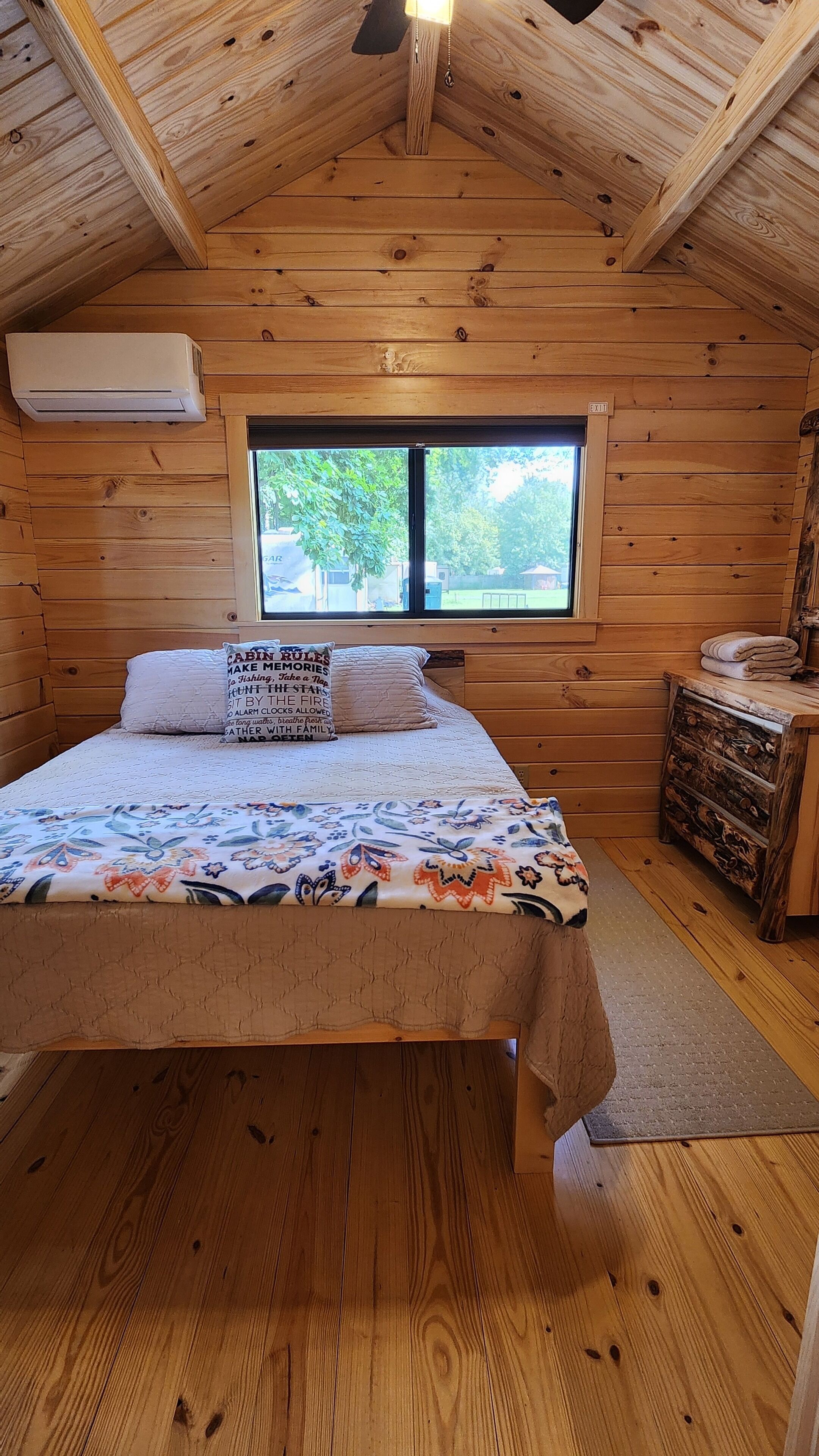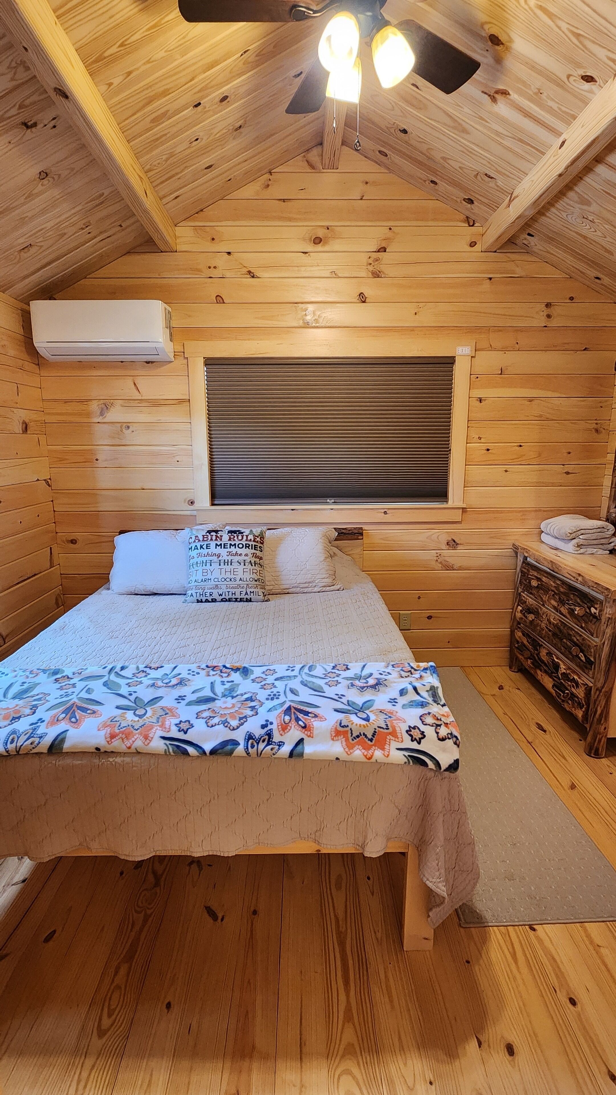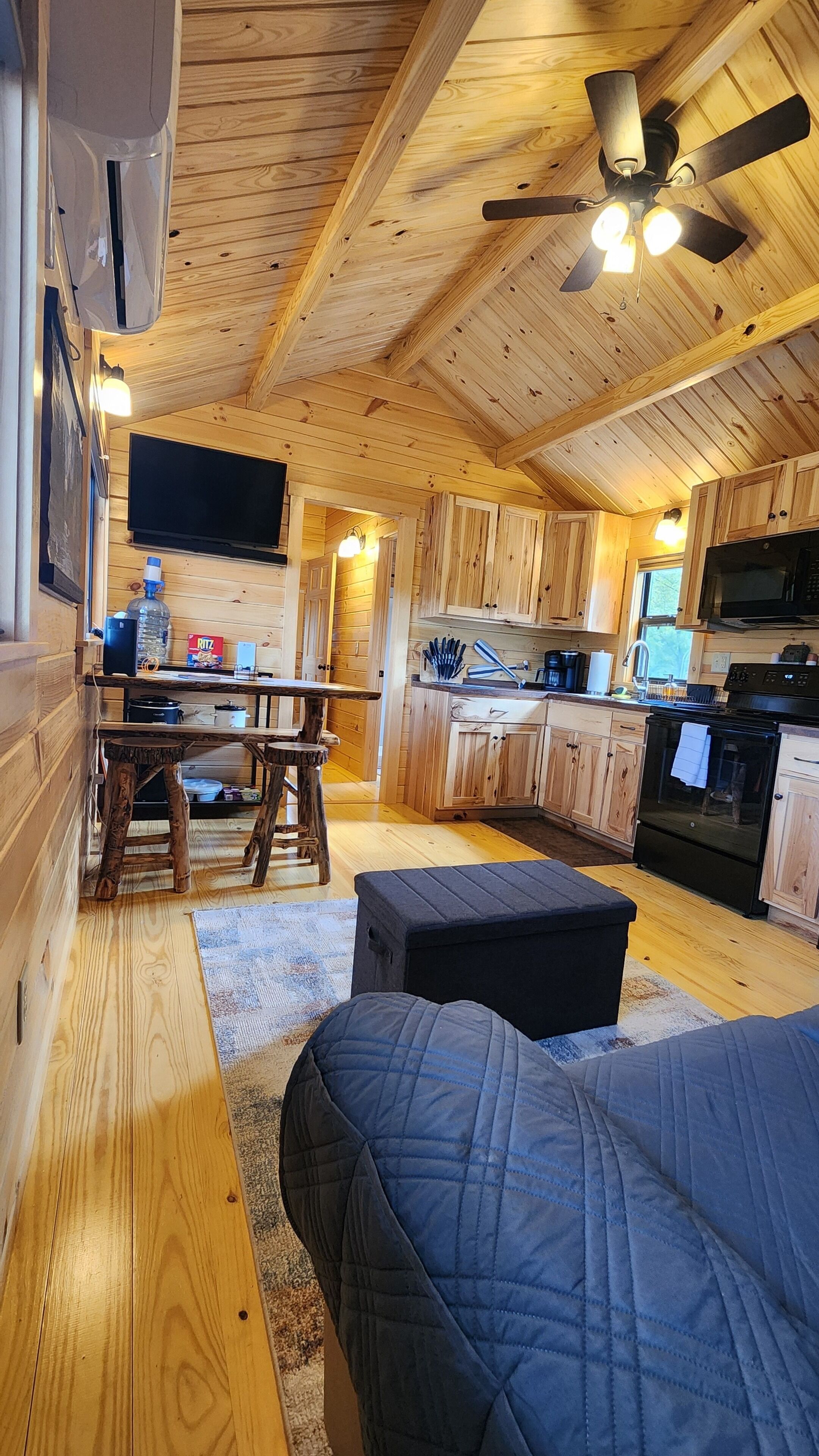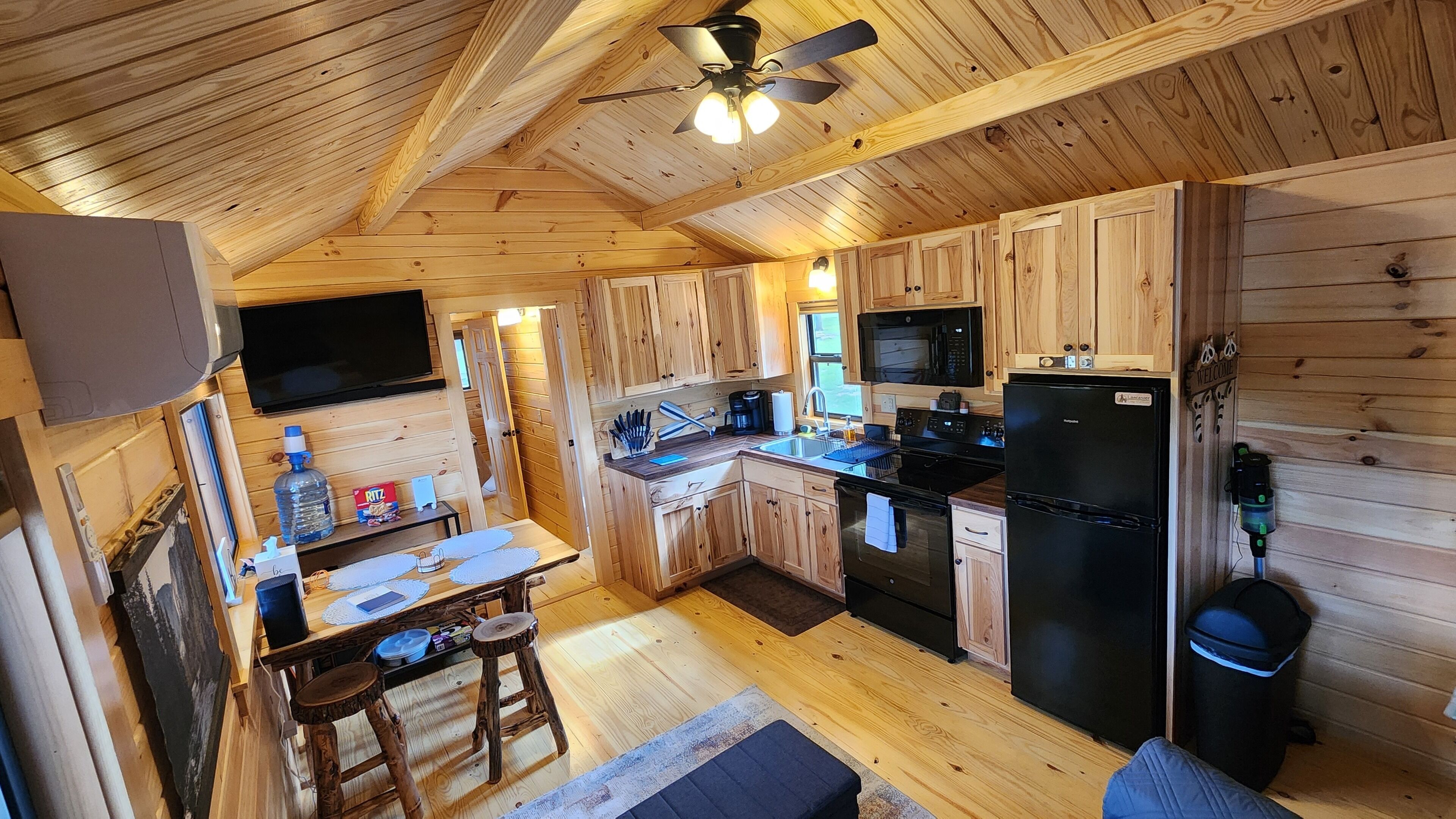Brand New Riverfront Cabin on the Potomac River - Sure to WOW you Discover the some of Gods beauty in Hedgesville at this really cool cabin facing the water. This cozy retreat features 1 queen bed and 1 bunk bed, perfect for a small group of guests. With AC, heating, and WiFi, you'll stay comfortable and connected. You're sure to make fantastic memories with a stay at our place.Our New Log Cabin is located right on the shallow end of the Potomac River w/ direct access to swim, fish, float, kayak, or just sit in the water. It brings such peace and serenity. Read a book? Take a nap? Have some wine? Smell the fresh cut wood as you enter the door. Take it easy at this unique getaway. The nature watching is quite entertaining. (Don't leave trash or food out) or the nature isn't so entertaining lol Camping at its finest. There is another vacation rental on this property as well, you may book the entire property, perfect for a larger family or gathering. I can message you the link.Fully furnished and stocked with everything you may need.Sit on the deck and watch the birds, there is an Eagle and some Hawks & Herrings you may get to see dive down to feast. The Nature watching is quite entertaining. Perfect relaxing camping here folks. Grill outside after a long day in the water or cook inside with the full kitchen. Two smart Vizio TVs with surround systems to kick back on the reclining loveseat and enjoy a movie. Listen to music, sing with the portable Monster Bluetooth Radio.Summer - Fall go get in the river. Sit, Swim, float, Kayak, Fish and live your best life.Very private November - March. Come for the peace, watch the snow fall on the trees around the river. Our cabin does have 6 seasonal RV lots (April - October) and is surrounded by other families camping and enjoying the outdoors, so you may hear music. Everyone is super friendly and will not bother you but welcome you to hang out if you choose. The deck and steps to the river is the access point for our friends and family that have the RV spots as well. We have a place there we sometimes stay at as well. Our goal for this property is to be able to share the blessing and for others spend time in Gods creation as well.This property is off the beaten path and the water is hard. We do have the best filtration systems, water softener and a uv light to kill bacteria but rarely when the Cabin hasn't been used you "could" smell a sulfur smell that goes away with running the water.A 25-30 minute drive will lead you to Berkeley Springs, Wv. Aka "America's First Spa," check out the natural springs, distinctive shops, dining, theater, live music, and holiday festivities. Berkeley Springs is known to have some of the best spas around. Or take a Hike to Harpers Ferry.You must wear a life jacket while Kayaking and have a fishing license to fish as required by law.There is no lifeguard and you enter the Potomac River at your own risk.Guest accessParking is right behind the cabin in the gravel. Your area is the deck and gravel space in front with the fire pit. This entire area is yours. The Deck and stairs to the river are a shared access point.Other things to notePlease bring your own Queen size sheets. The set that is on, is a secondary mattress protection.The wood floors are still so very soft and dent and scratch easily. Please be very careful and don't roll heavy things across them.We ask you to remove shoes at the door to help keep it as clean as possible.Absolutely no smoking or pets. Ashtrays are provided outside.The wood absorbs smells. If there is smoking of anything, including weed inside there will be an additional $500 cleaning fee to have it removed.Smoke OUTSIDE