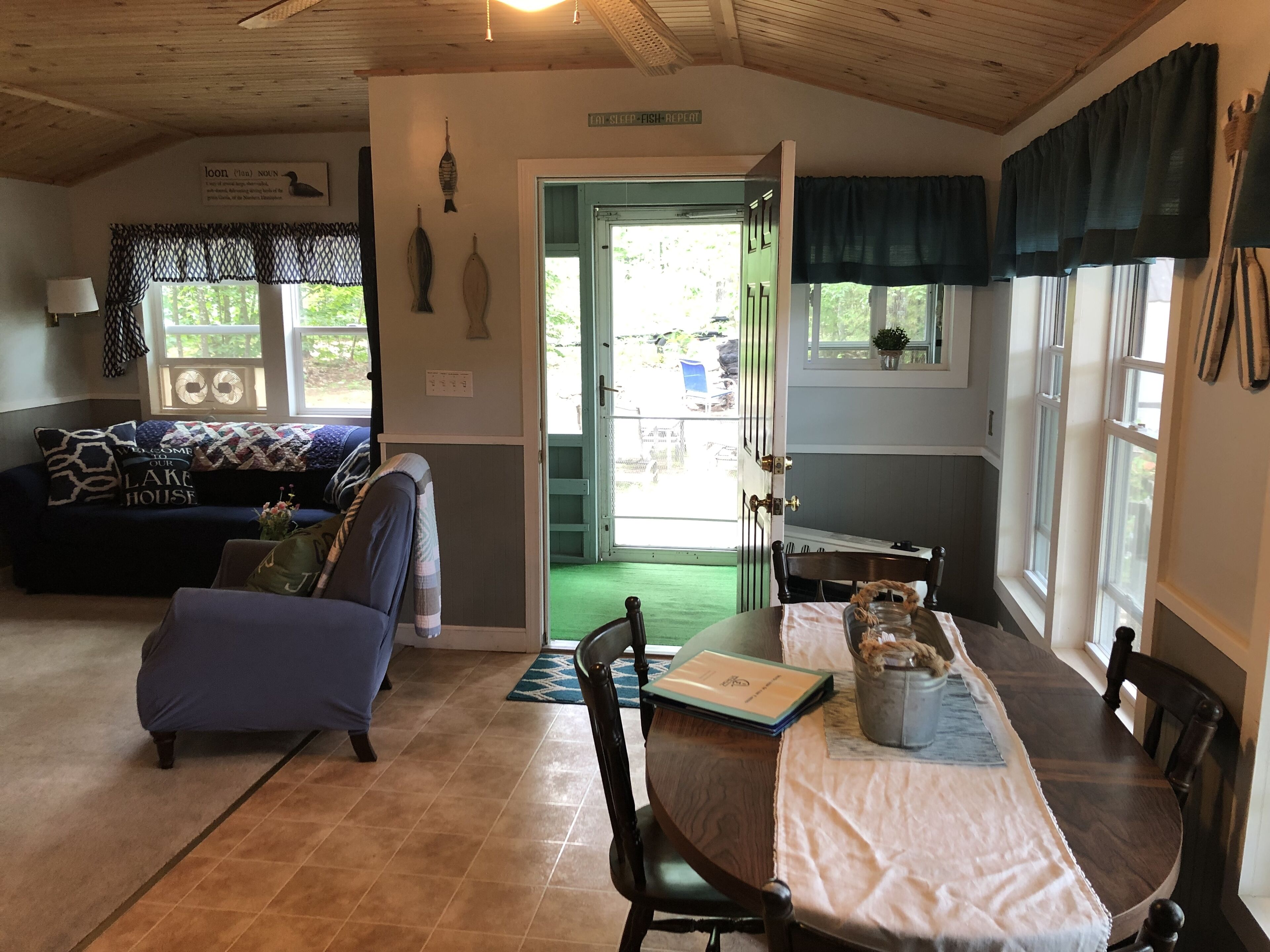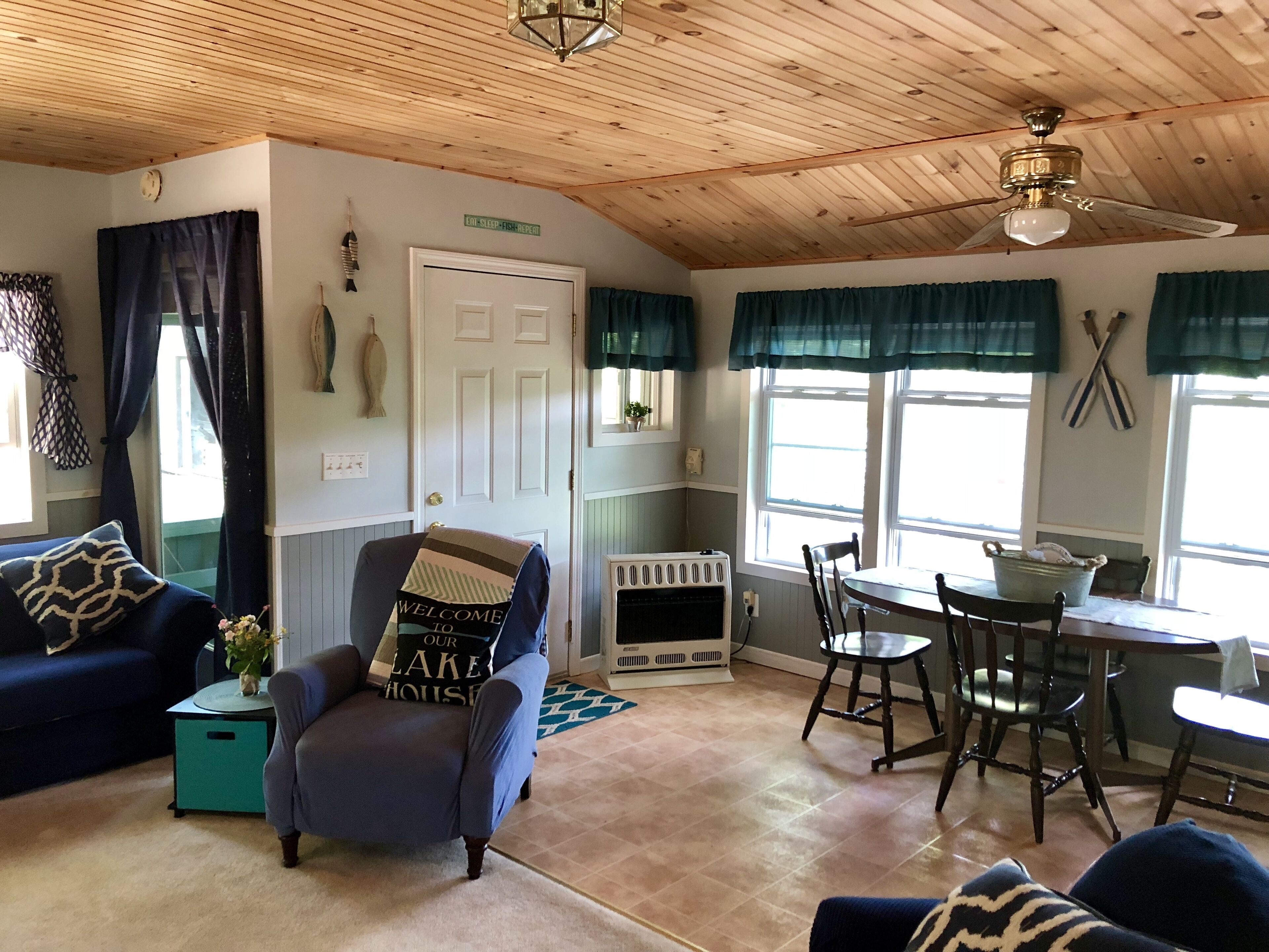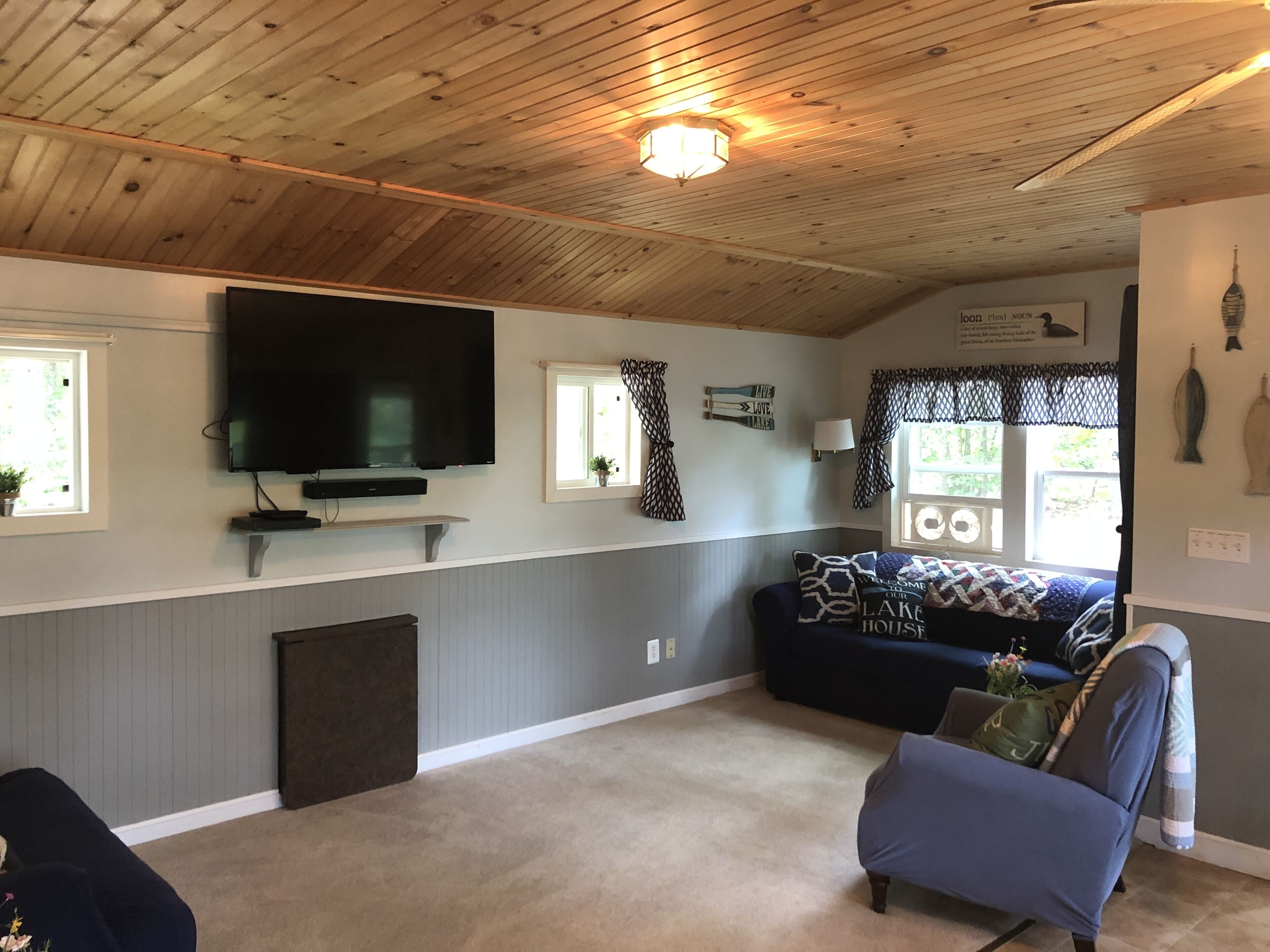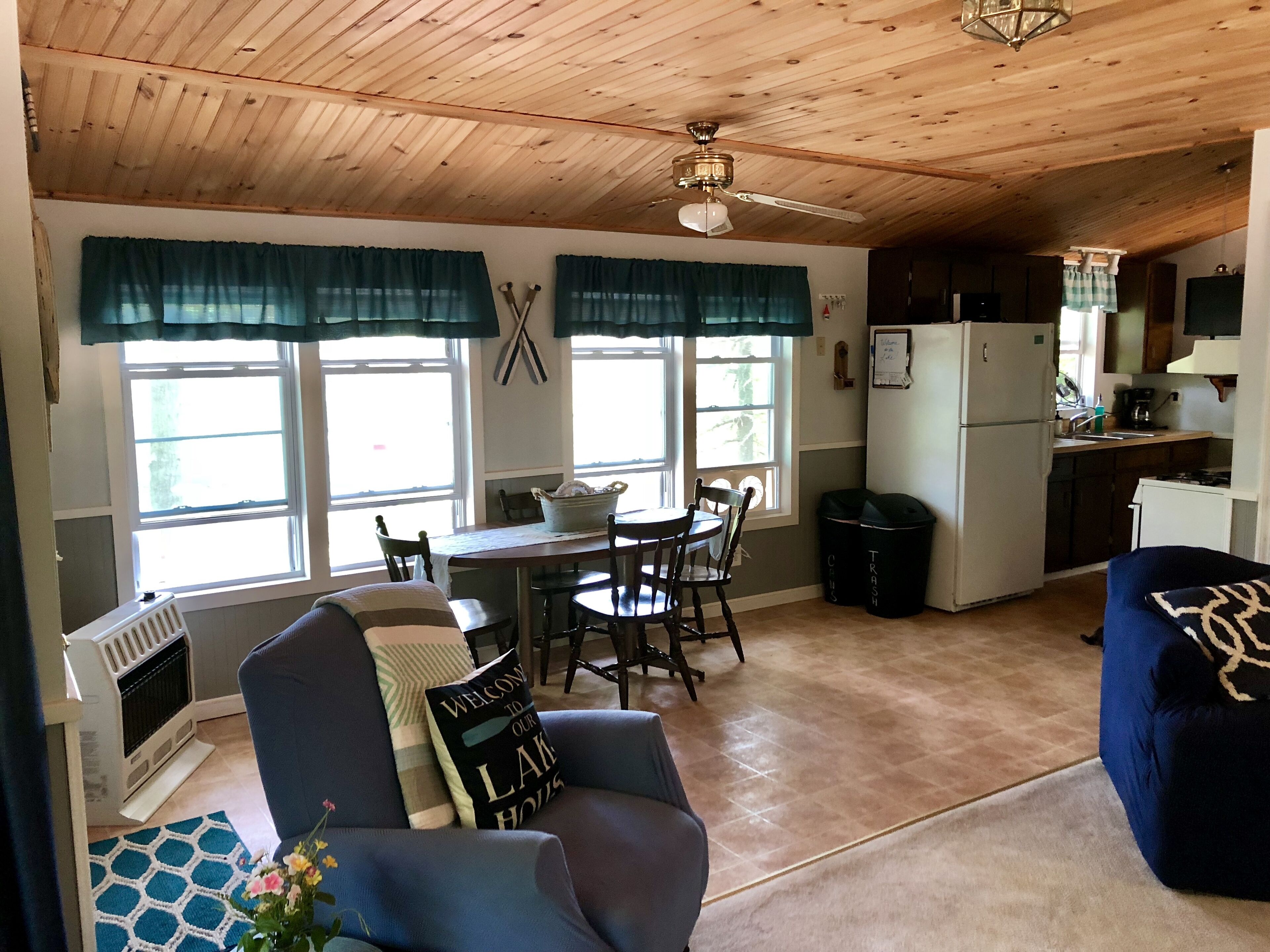 Waterfront camp on beautiful Great East Lake We have a two bedroom, full bath camp for rent that comfortably sleeps 4. One bedroom with a queen bed, second has bunkbeds (twin on top, double on bottom).Both bedrooms have a smart TV and a 55” flat screen is in the open concept living/ dining room area. There is no cable tv but you will have WIFI- so all TV’s will have the ability to stream from your netflix, Hulu, etc. accounts. The bathroom has a stand up shower and washer/dryer. Directly outside you have a patio area to grill and a stone firepit.You’ll need to take the stairs down to the water. Once you reach the bottom, you have your own 115’ of sandy water front. Located in the first basin which is a no wake zone- so it’s always calm! The beach area is perfect for your children to play and there is also a dock to keep your boat.*****Please note, we do not provide any linenes. We are asking that you bring your own linens. Including, dish towels, bath towels, blankets, pillows and sheets. We would also recommend you bring your own paper plates, bowls, plasticware, etc. as there is no dishwasher. ******