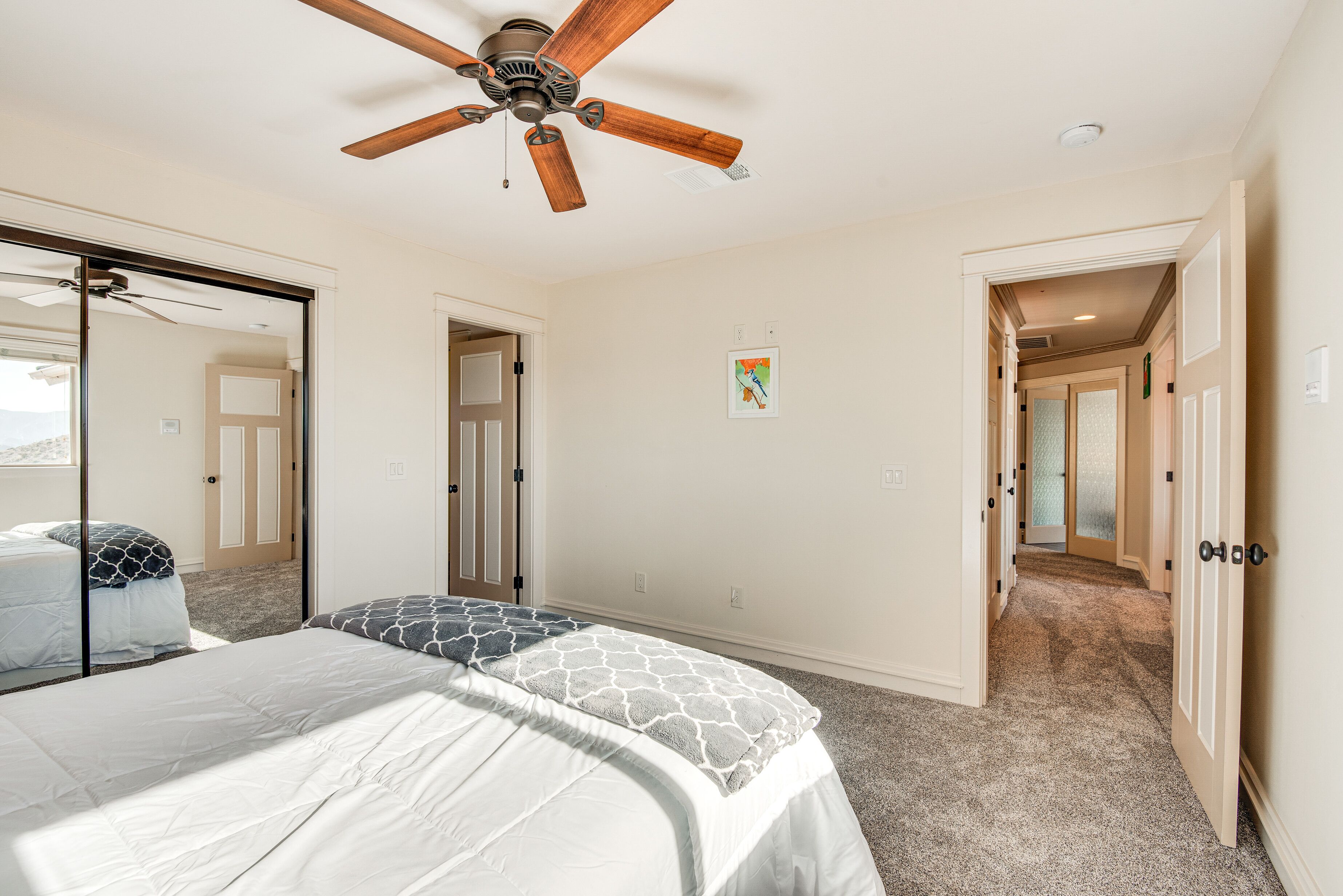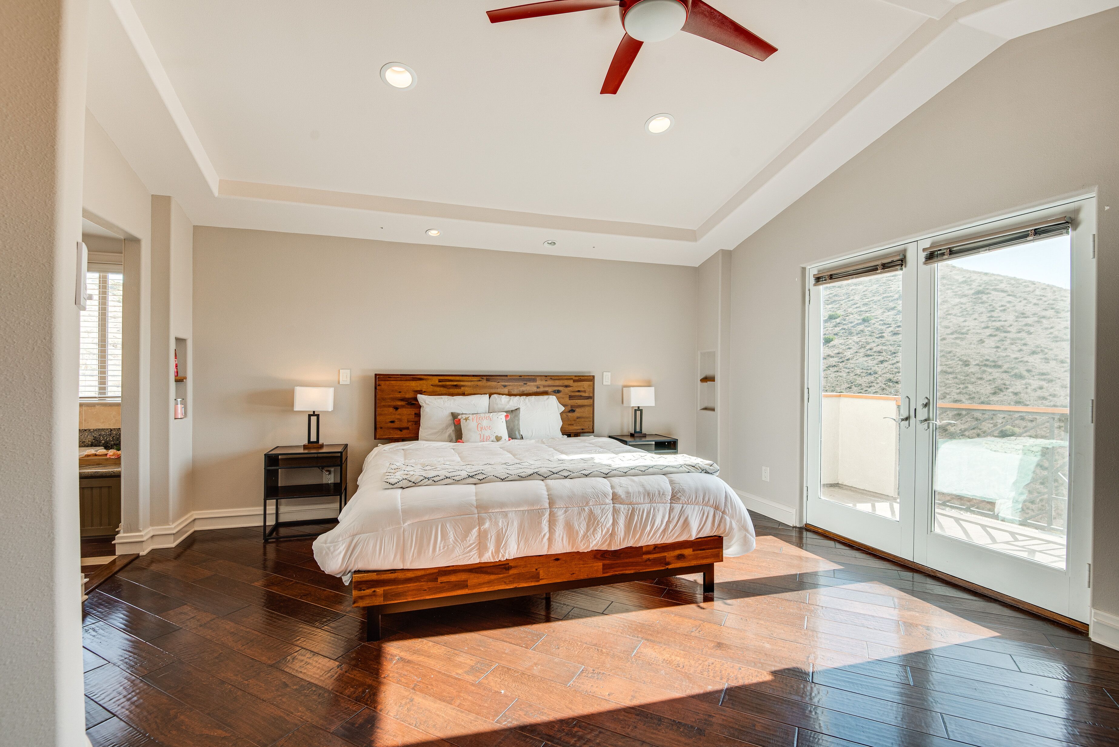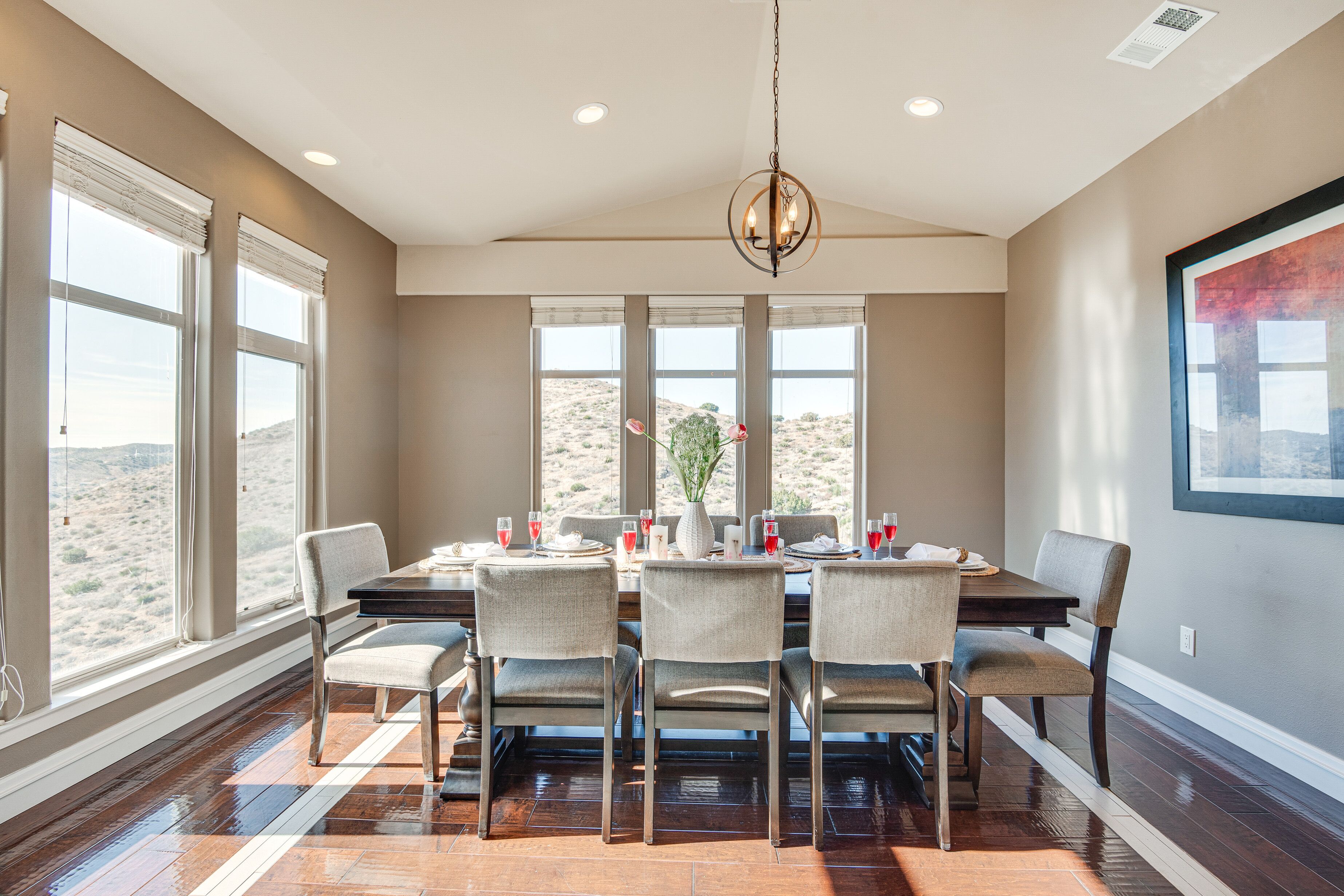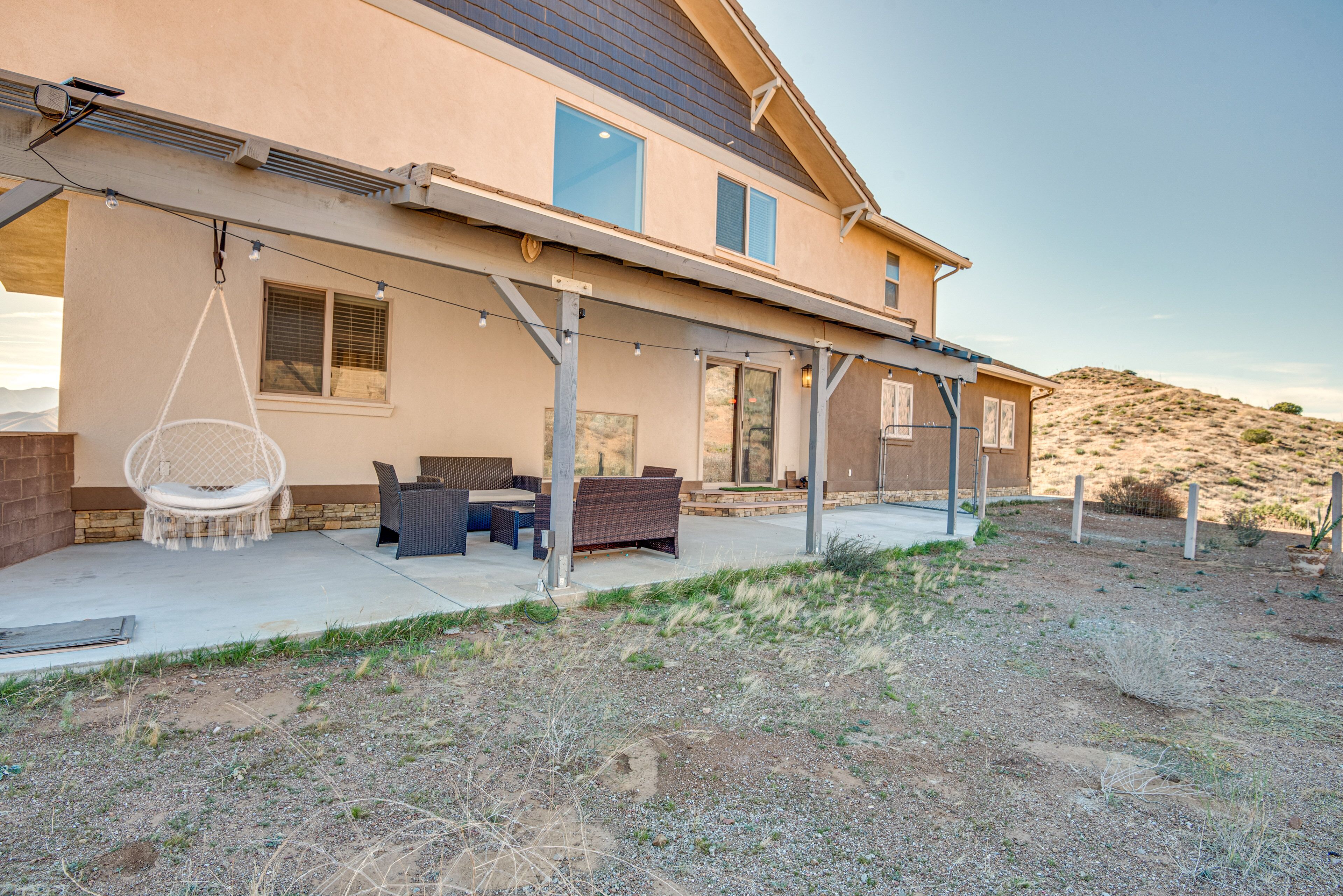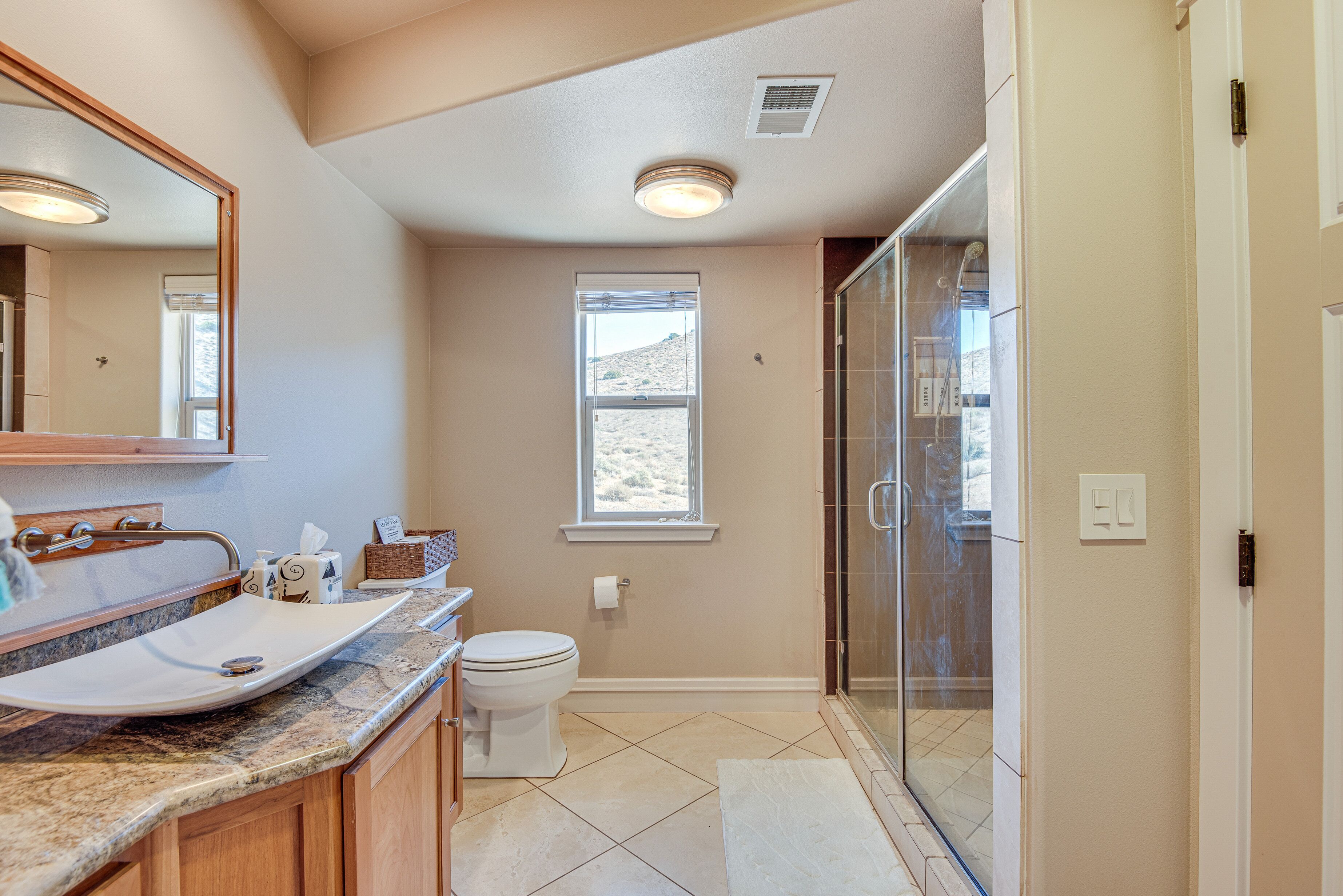 Expansive Mountain Retreat: 3 Mi to Acton! A peaceful escape awaits at this Acton vacation rental! Nestled in a secluded, mountainous area, this 4-bedroom, 3-bathroom home offers ample living space and breathtaking views throughout the property. Stay on-site to hike the private trail, venture out to explore Angeles National Forest, or take a day trip to Six Flags Magic Mountain. After active days, relax on the patio before heading inside to cozy up by the fireplace in the modern living room.-- THE PROPERTY --3,300 Sq Ft | Unobstructed Mountain Views | Private Hiking Trail On-Site | 20-Acre PropertyBedroom 1: California King Bed | Bedroom 2: California King Bed | Bedroom 3: Queen Bed | Bedroom 4: Queen Bed | Additional Sleeping: Queen Air MattressOUTDOOR LIVING: Private yard, private balconies, patio w/ seatingINDOOR LIVING: Smart TVs w/ cable, fireplaces, game room w/ pool table, electric keyboard, guitar, chess set, board games, books, yoga mats, dining table, en-suite bathrooms, state-of-the-art bathrooms w/ heated floors, aromatherapy air bathKITCHEN: Chef's kitchen, expansive island, built-in/high-end appliances, solid cherry cabinets, Keurig coffee maker, dishwasher, microwave, stove/oven, refrigerator, cooking basics, walk-in pantryGENERAL: Free WiFi, central A/C & heating, linens/towels, Smart combination washer/dryer, hair dryer, iron/board, complimentary toiletries, keyless entry, laundry detergent, trash bags/paper towelsFAQ: 4 exterior security cameras (facing out)ACCESSIBILITY: Multi-story home, exterior staircase required to enter, 1 bedroom & 1 full bathroom on main levelPARKING: Garage (4 vehicles), driveway (5 vehicles)-- THE LOCATION --OUTDOOR RECREATION: Acton Park (3 miles), Santa Clara River (3 miles), Ritter Ranch Park (9 miles), Angeles National Forest (15 miles), Marie Kerr Park (17 miles), Castaic Lake State Recreation Area (32 miles), Mountain High Resort (39 miles), Topanga State Park (42 miles)AREA HIGHLIGHTS: Lockheed Martin Aeronautics Co (16 miles), Nethercutt Museum (27 miles), Six Flags Magic Mountain (27 miles), Universal Studios Hollywood (41 miles), The Getty (42 miles), Hollywood Walk of Fame (43 miles), Guinness World Records Museum (43 miles), Rose Bowl Stadium (49 miles), Pacific Park on the Santa Monica Pier (50 miles)TOWNS & CITIES: Acton (3 miles), Santa Clarita (24 miles), San Fernando (30 miles), Pasadena (51 miles), Los Angeles (51 miles)AIRPORT: Los Angeles International Airport (54 miles)-- REST EASY WITH US --Evolve makes it easy to find and book properties you’ll never want to leave. You can relax knowing that our properties will always be ready for you and that we’ll answer the phone 24/7. Even better, if anything is off about your stay, we’ll make it right. You can count on our homes and our people to make you feel welcome--because we know what vacation means to you.-- POLICIES --- No smoking- No pets allowed- No events, parties, or large gatherings- Must be at least 25 years old to book- Additional fees and taxes may apply- Photo ID may be required upon check-in- NOTE: This multi-story home requires using an exterior staircase to enter. While it offers 1 bedroom and 1 full bathroom on the main level, additional interior stairs are required to access bedrooms on the upper level- NOTE: The property sleeps 8 guests in 4 beds with room for 10 guests total by using the queen air mattress- NOTE: Your safety matters. This property features 4 exterior security cameras: 1 camera is located on the main door facing the front outdoor entry, 1 camera is located on the back door facing the back outdoor entry, 1 camera is located outside the garage facing the parking area, and 1 camera is on the 2nd-floor balcony facing the gate entrance. The cameras are outward facing and do not look into interior spaces. The cameras display video and sound when activated by motion, but do not record