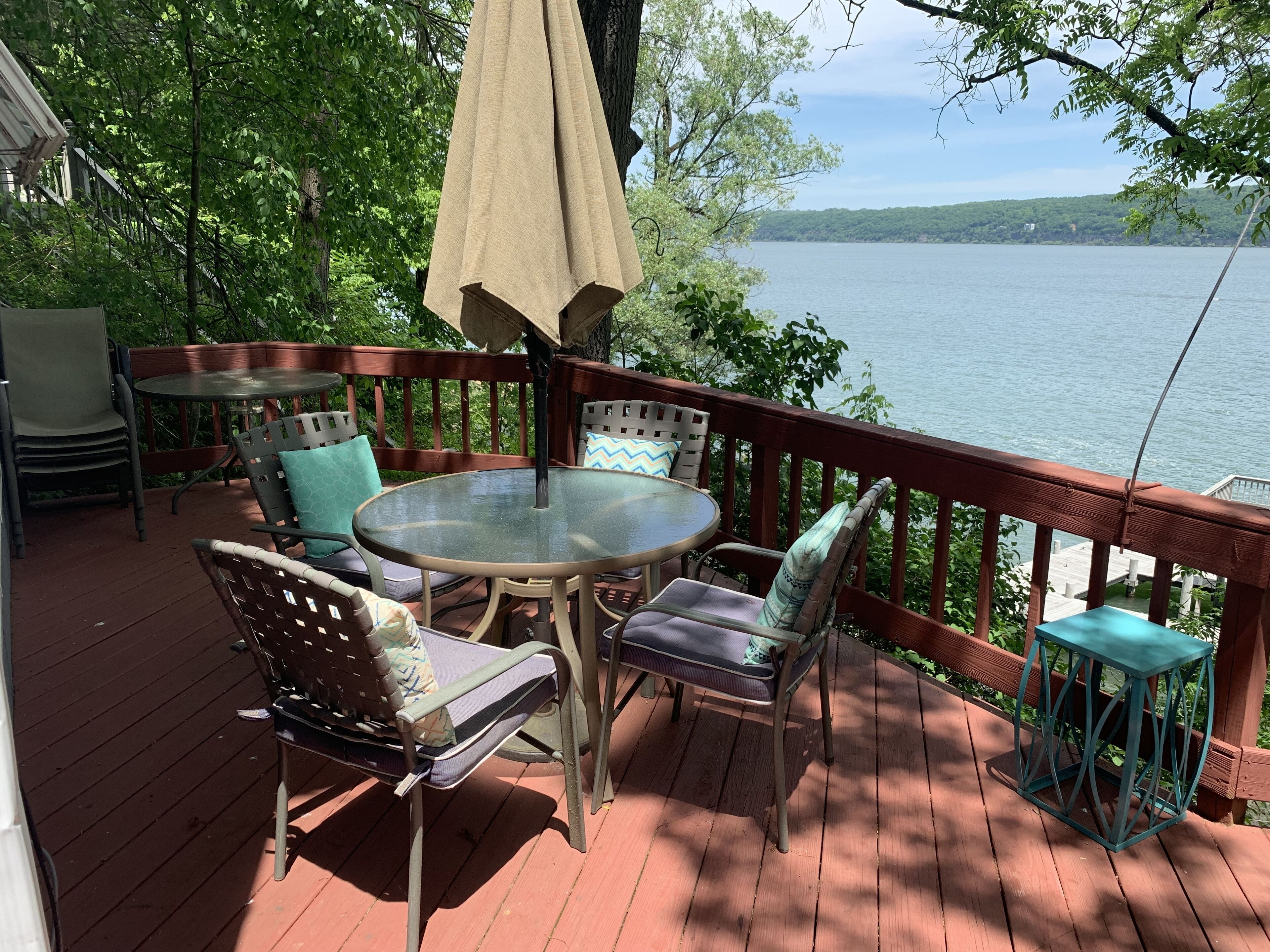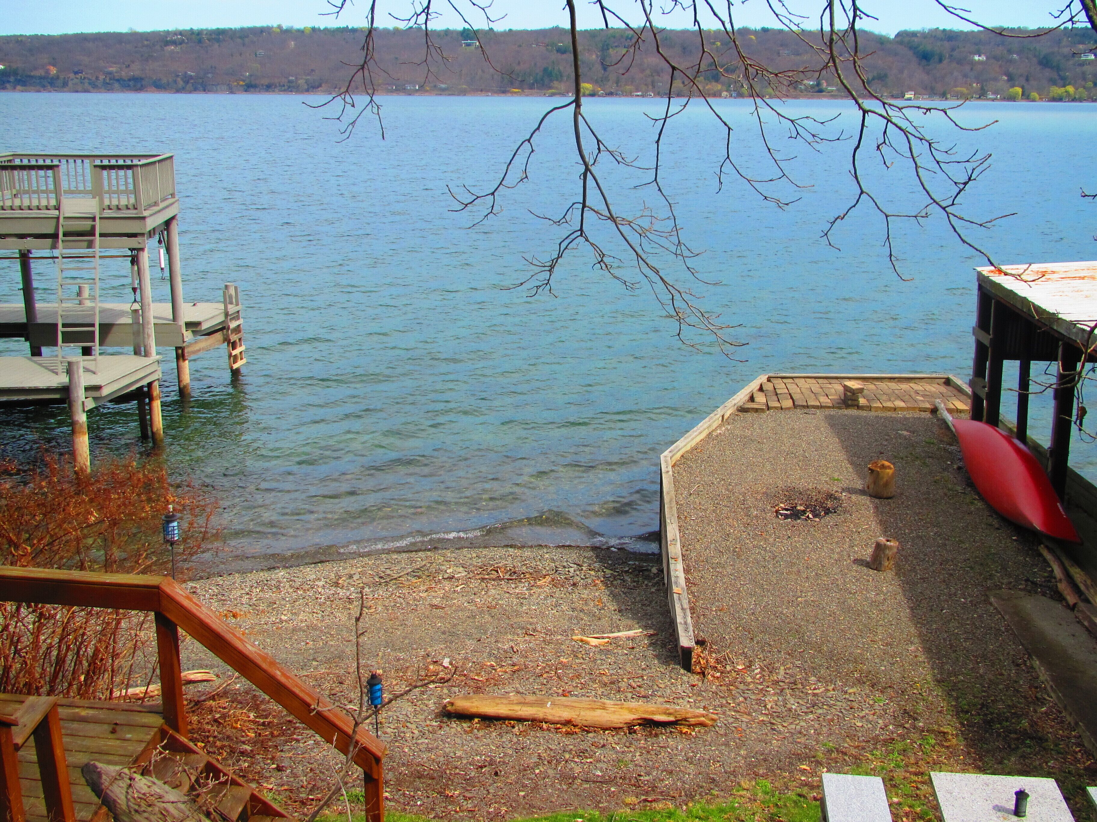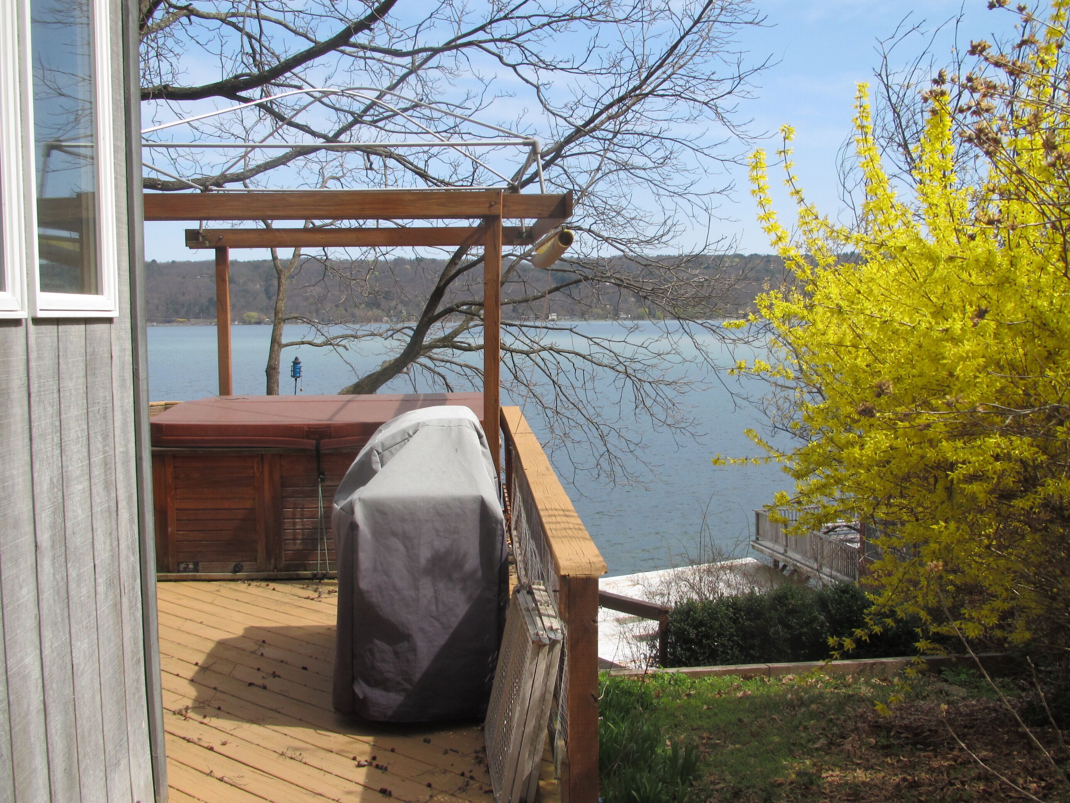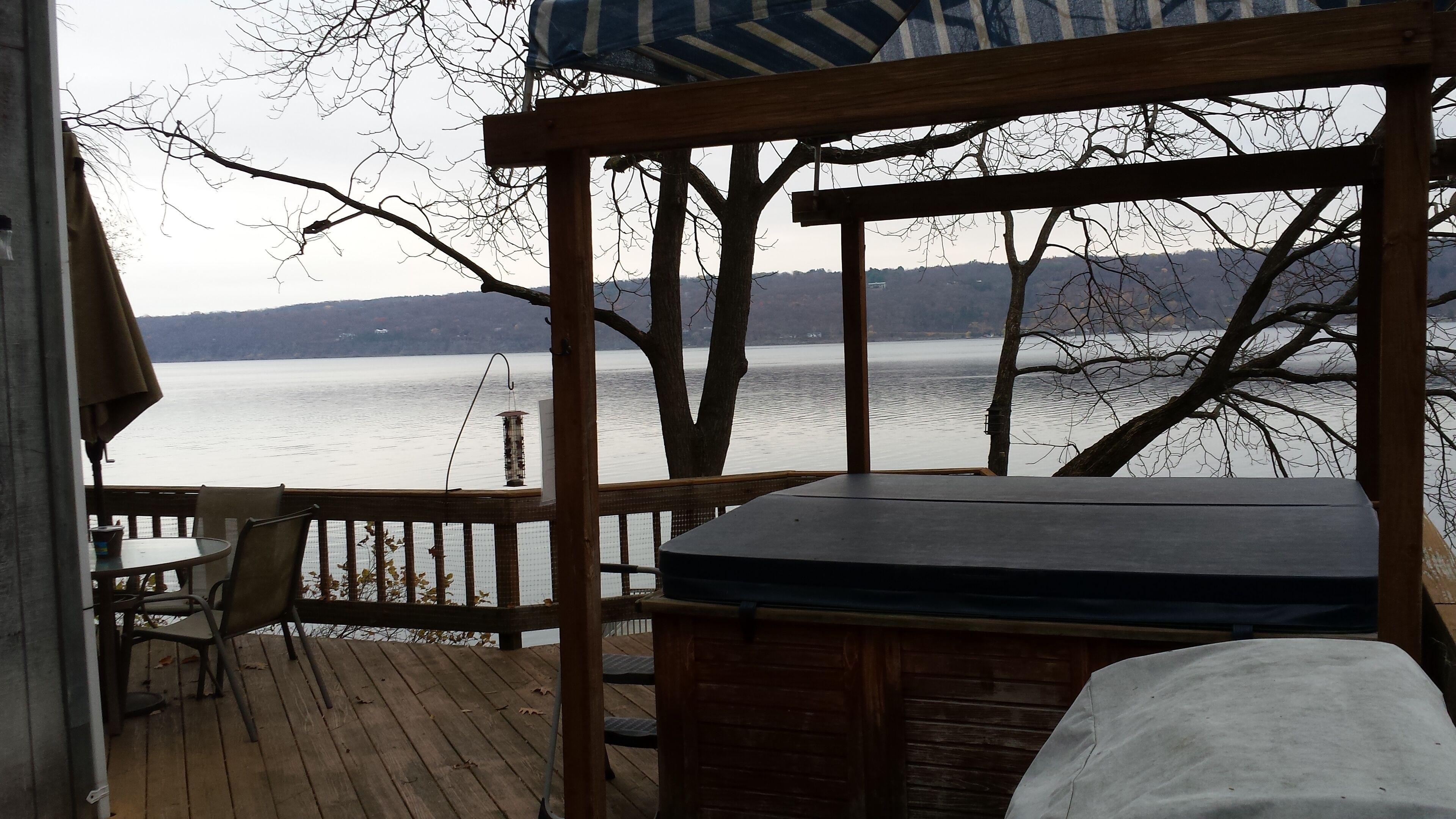 Beautiful Cayuga Lake Beautiful Cayuga Lakehouse available for weekly rentals in July and August, three night minimum in June and two night minimum in the off season. Off-season (after Labor Day and before Memorial Day) the house is available for long-term rental or short stays. The house is fully furnished. We are conveniently located 2 miles from Ithaca, N.Y. in a nice private, relaxing setting. We are located on the west shore of Cayuga Lake on Taughannock Blvd. just 3.5 miles from the Ithaca Commons and 5 miles from Cornell Campus and Ithaca College. This house has a large deck featuring a hot tub overlooking Cayuga Lake. The hot tub accommodates 3-4 people very comfortably. There is a patio table that seats six and lounge chairs for relaxing outside. This house has 2 bedrooms, a fully equipped kitchen with a Jenn Air stove, 2 full bathrooms, central air conditioning, and a spiral staircase.The master bedroom has a queen sized bed, the second bedroom has a queen bed and a twin bed, and there is a queen sized pull-out couch in the living room. There are large closets in the bedrooms with hangers for your clothes as well as large dressers. You can hear the water lapping on the lake shore from the bedrooms. The master bedroom has beautiful lake views. The living room has a comfy chair with ottoman, couch, and recliner. There are bookcases with books for your use and a DVD library and board and card games for your enjoyment. The dining table is located in front of the large windows facing the lake. There is a built in oak desk. The kitchen features a high ceiling, large counter tops for cooking, microwave, toaster oven, 4 slice toaster, drip coffee maker, A Keurig single cup Coffee machine, electric hot water kettle, blender, cook and bakeware, dishwasher, ice trays, spices, and other staples. There is a mudroom for hanging up jackets and taking off wet shoes. The bathroom on the main floor off the living room has a stand up shower and a heat blower. The bathroom on the second floor has a full tub/shower, washer/dryer, and a heat lamp. There are four kayaks and an old canoe with paddles and life jackets available for tenant use. There is a small covered boathouse that is rustic and just used for storage with some rafts, a mini fridge, and campfire wood. The pier has a fire pit for nighttime fun. There are several chairs for relaxing by the lake. We have WiFi high speed internet access and over 190 channels of cable TV and a DVR for pausing, rewinding, or recording your favorite shows during your stay. There is a 42' flat screen TV with DVD player. This is a family oriented neighborhood so no large parties or excessive noise allowed. Please contact us with any questions or if you would like to see more pictures of the house. Please note: The access to the bedrooms on the second floor is via a narrow spiral staircase. This may be difficult to navigate with large suitcases, infants, elderly, and/or pets. The house is at the bottom of a steep driveway. In the winter the driveway is plowed as soon as possible. The driveway is paved. Steps to the house and deck are cleared of snow prior to your stay. During the stay if it snows, shoveling is required. The driveway leads to a small shared parking area where we have two designated parking spots. Additional parking is available at the top of the driveway. *IMPORTANT!* No trailers or boats are to be driven down the driveway. Trailers and boats can be parked in the parking area adjacent to the road at the top of the driveway. Off season rates are for 2 night minimum. Thanks!IMPORTANT: Summer July and August rentals are one week minimum. Rates start at $3150 from Saturday to Saturday. Cornell and Ithaca College graduation weekend rates are $900 per night for 3 night minimum. Additional nights are $900 and discounts apply for full weeks including these graduation weekends. June is three night minimum.Fall, Spring, and Winter are $400 per night for 2 night minimum.