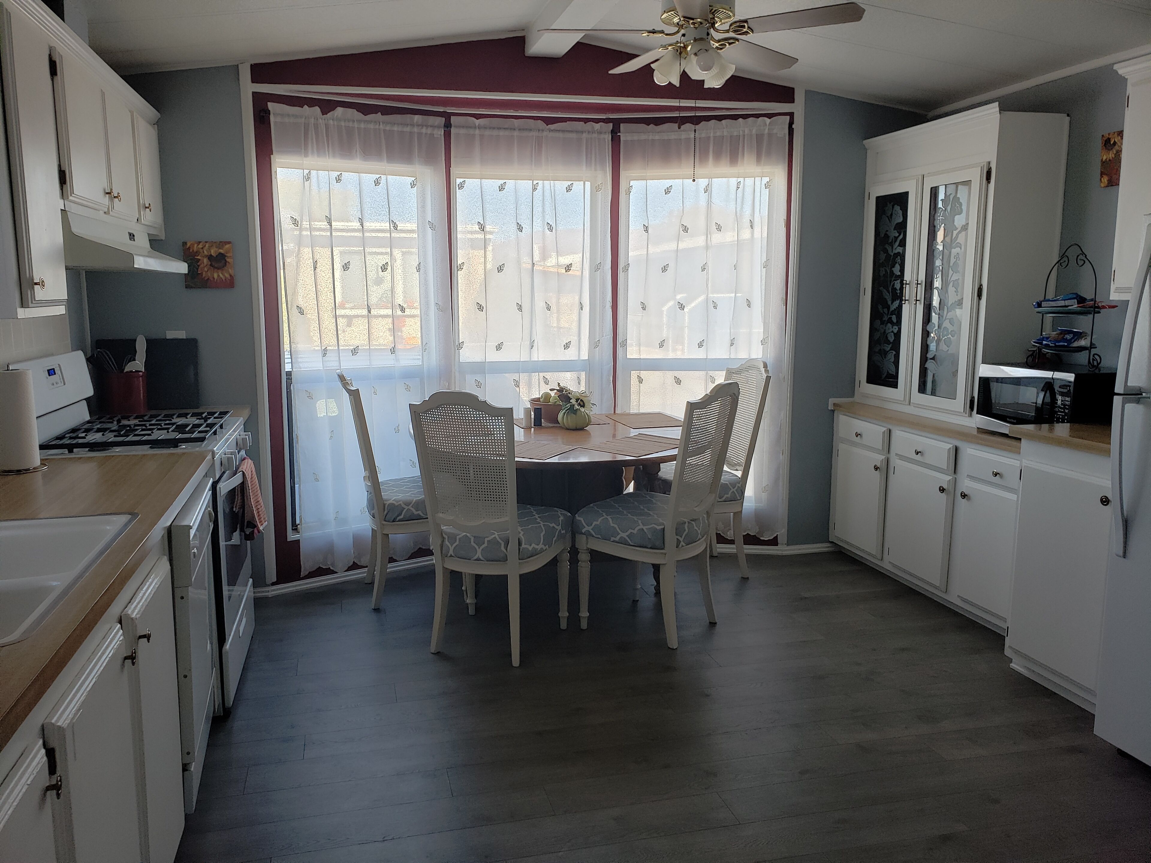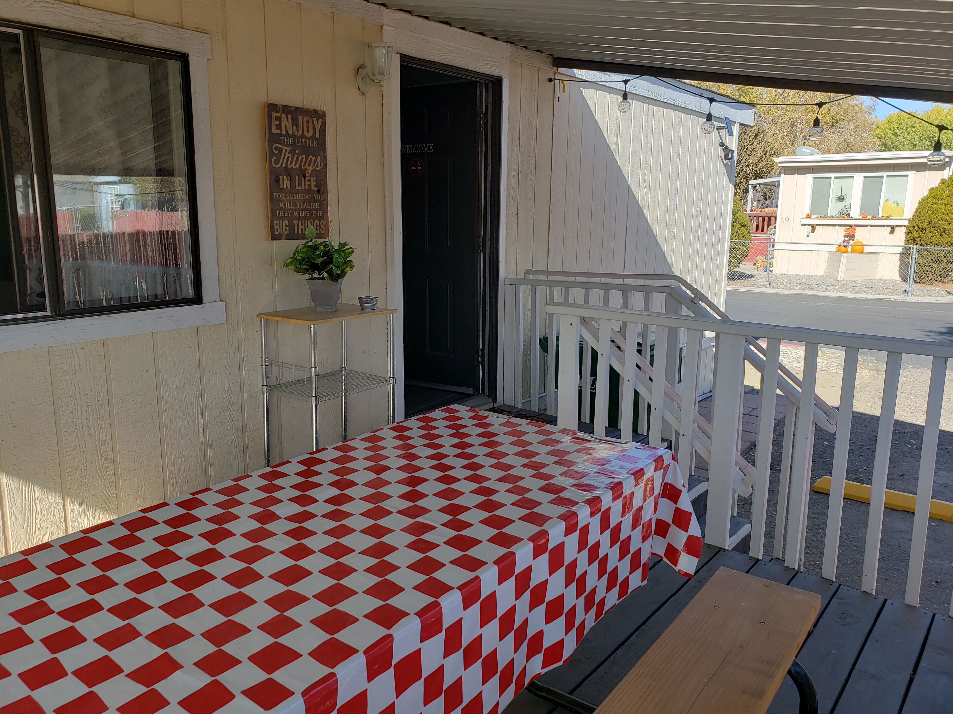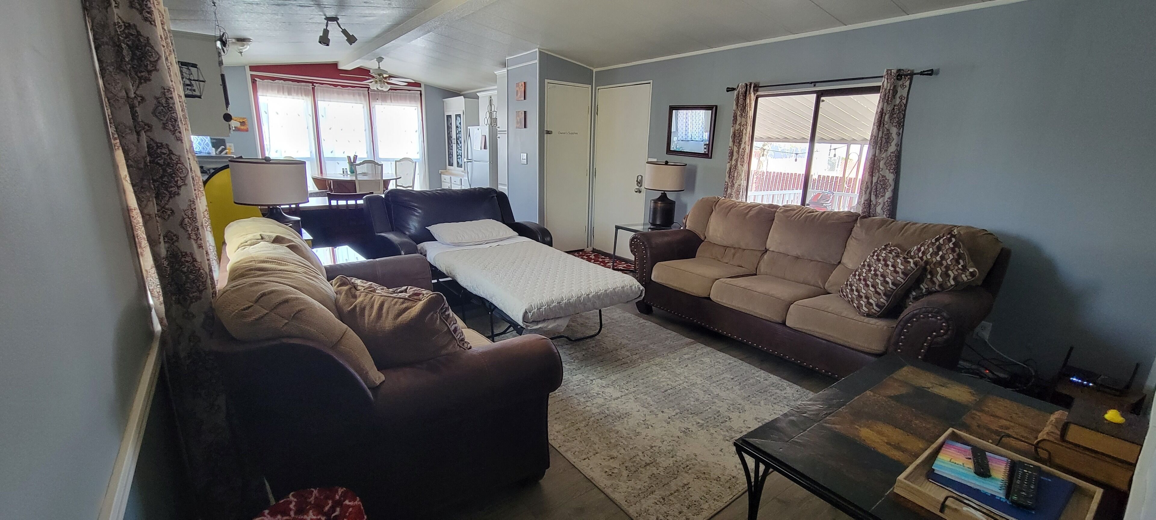 Porch house 2 bedroom and 1 bathroom home with fenced yard. Home is clean and safe. Located inside Rancho Eastetes mobile-home park next to the community garden. Park also offers playground, and basketball hoop. Home has a large porch, washer and dryer.