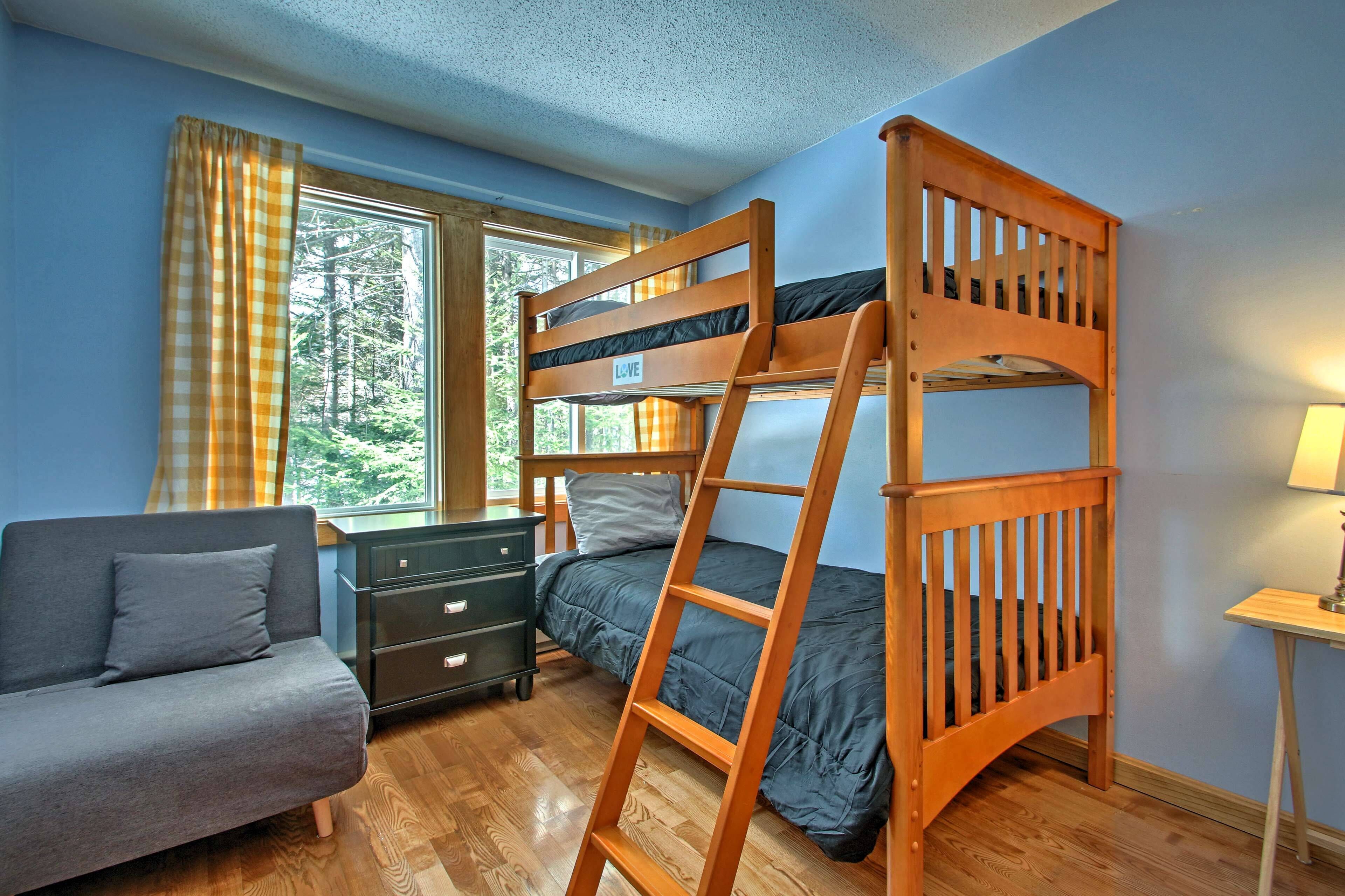 Waterville Valley Condo near Town Square & skiing! Experience the beautiful white mountains of New Hampshire from the comfort of this 2-bedroom, 1.5-bathroom condo in the heart of Waterville Valley. Located just a stone’s throw from Town Square and the Waterville Valley Ski Area, ‘Sunnyside’ is the perfect home base for all of the Granite State adventures that await you. Whether you spend your days hiking, fishing, golfing, or skiing, you’ll look forward to ending each day unwinding in this cozy condo with wooded views and remote gas fireplace.You and your group will also enjoy a fully equipped kitchen for a variety of meal preparations and a cozy dining area, as well as outdoor deck during warmer seasons.The condo is across the street from Packard's Field and within walking distance to most activities in the Valley including Town Square, Corcoran Pond, and White Mountain Athletic Club. Whether you’re looking to fish, hike, bike, golf, or snowshoe, you won’t be more than a few minutes from the action during your stay at ‘Sunnyside.’ If you are looking to ski, Waterville Valley Ski Area is located less than 10 minutes from the property and Loon Mountain is approximately a 30-minute drive. Home to over 60 trails of varying difficulties and a shuttle bus, Waterville Valley Ski Resort is sure to have the perfect slope for you. There is also an extensive network of cross-country trails, hiking, and biking trails nearby. A free shuttle to the Waterville Valley Ski Resort is located just outside the condo. When you need a break from high-octane adventures, take a 5-minute walk to the Town Square at Waterville Valley and peruse the local businesses. Whether you choose to update your wardrobe, hang out at the arcade or grab a bite to eat, this local hot spot is the place to be.The property includes a Master Bedroom with Queen Bed. Bedroom 2 includes Twin-over-Twin Bunk Beds and Futon. In addition, there is a sleeper Sofa in the living room, all sheets and bedding are included, as well as bath and hand towels.Other things to noteFor an additional fee, this property comes with access to the White Mountain Athletic club where our guests can access the fitness center, hot tubs, pools, splash pad, and tennis courts at the club for a fee. Please contact White Mountain Athletic Club for current guest fees.*Note this rental does not include a "freedom pass".*No pets Allowed. Please note the owners do have a dog, please plan accordingly for guests with allergies.*No smoking allowed.*No on-site washer or dryer, but nearby laundry facility in Town Square for a fee.