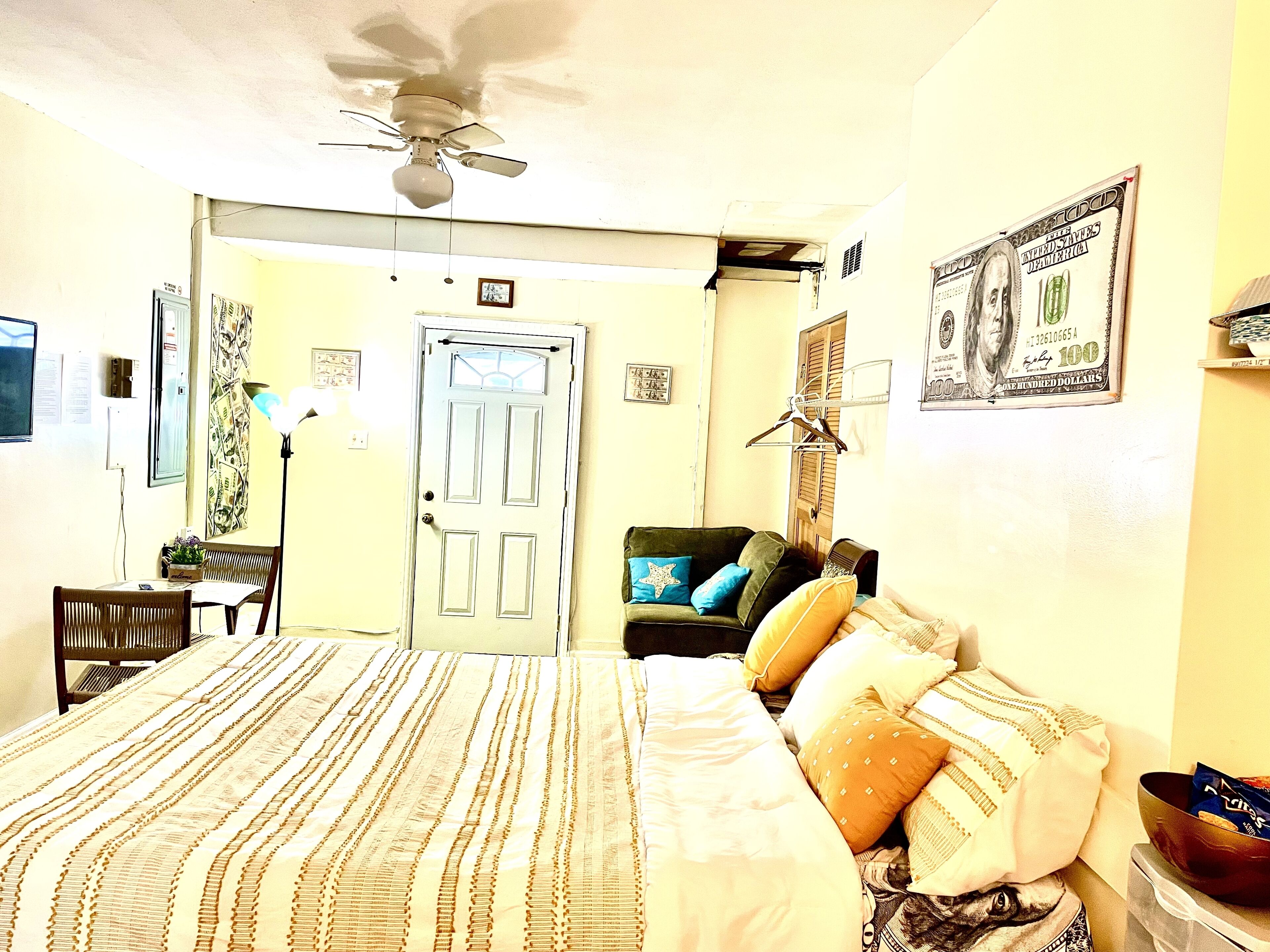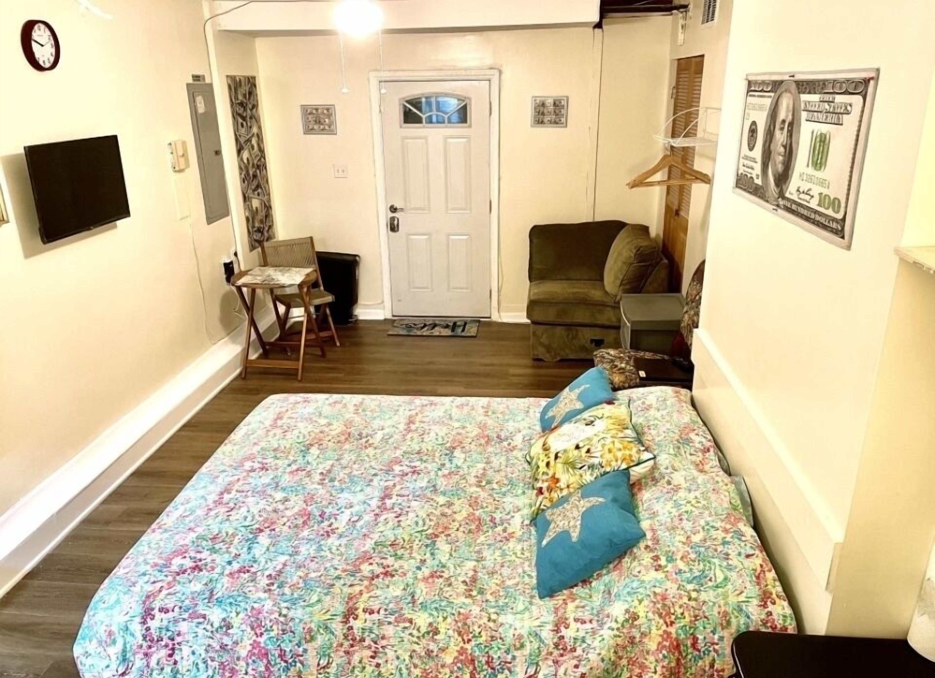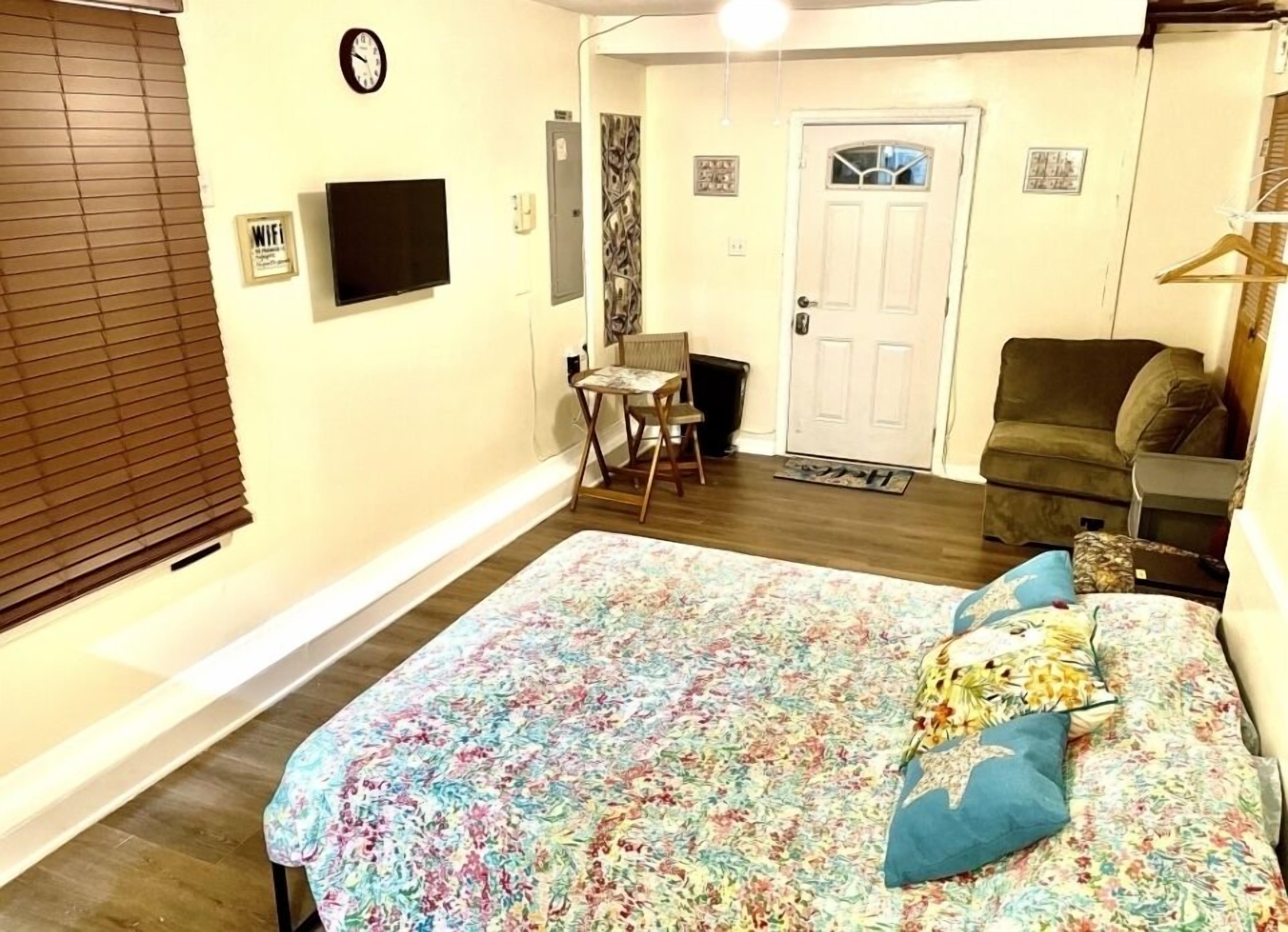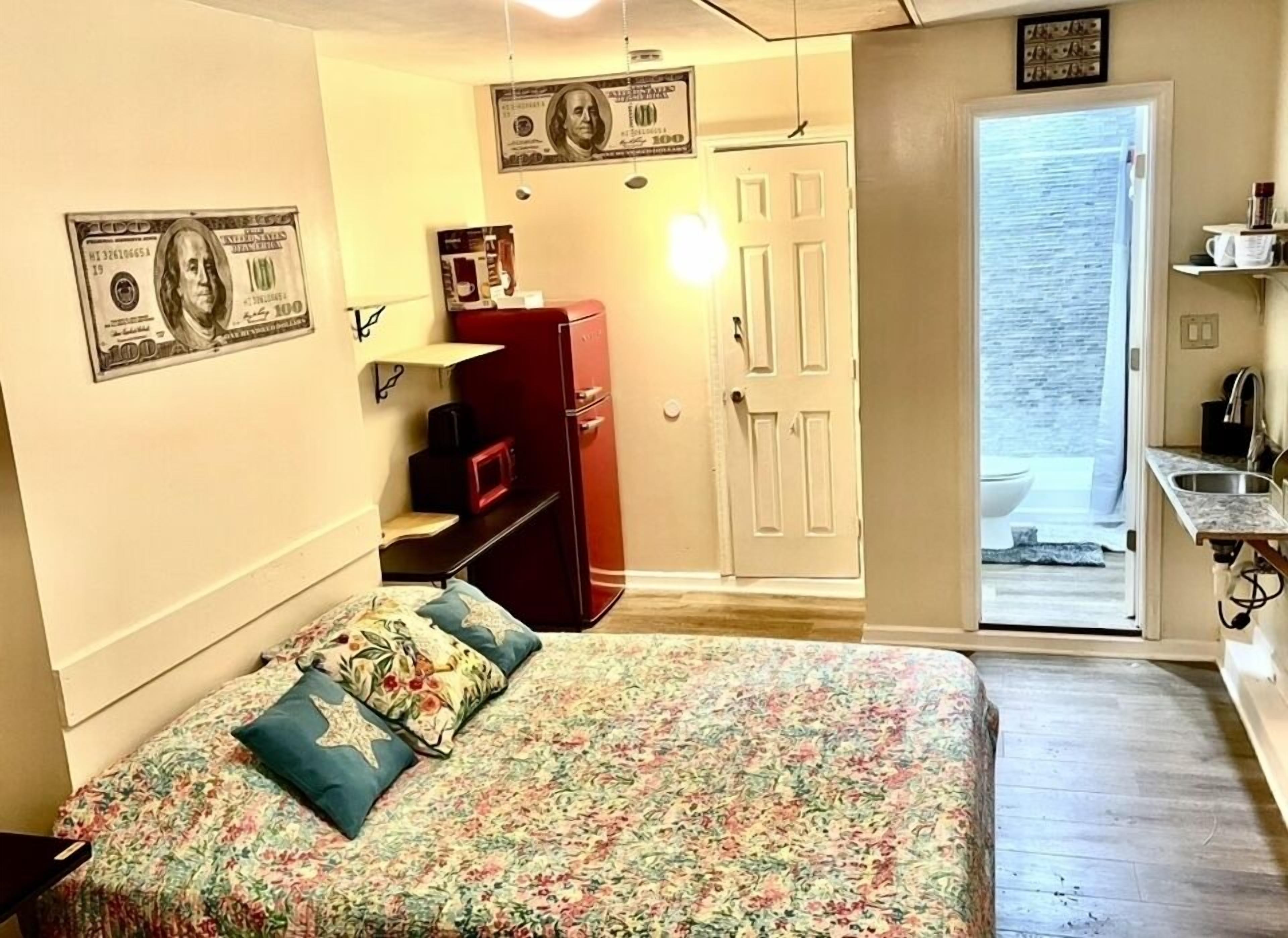 The Money House Welcome to the Money house! The energy of money is everywhere in this quiet studio apartment with full bathroom, kitchenette (Air-fryer, microwave full-size refrigerator, all kitchen utensils), sleep in area, sitting area, Roku TV and Wi-Fi/Internet access. Enjoy the backyard and use of grill. Please note that smoking or vaping is NOT permitted within the apartment. You may smoke...