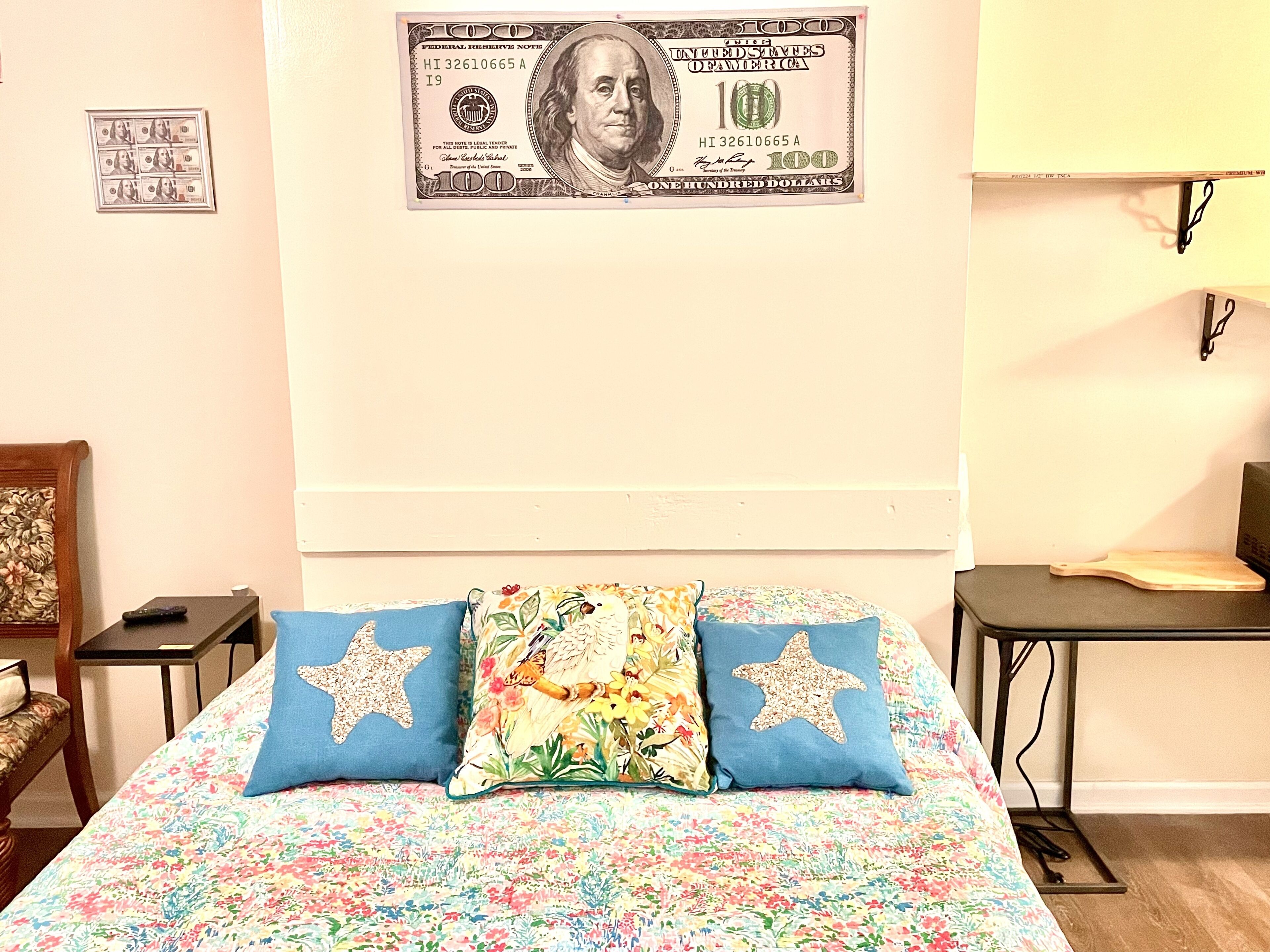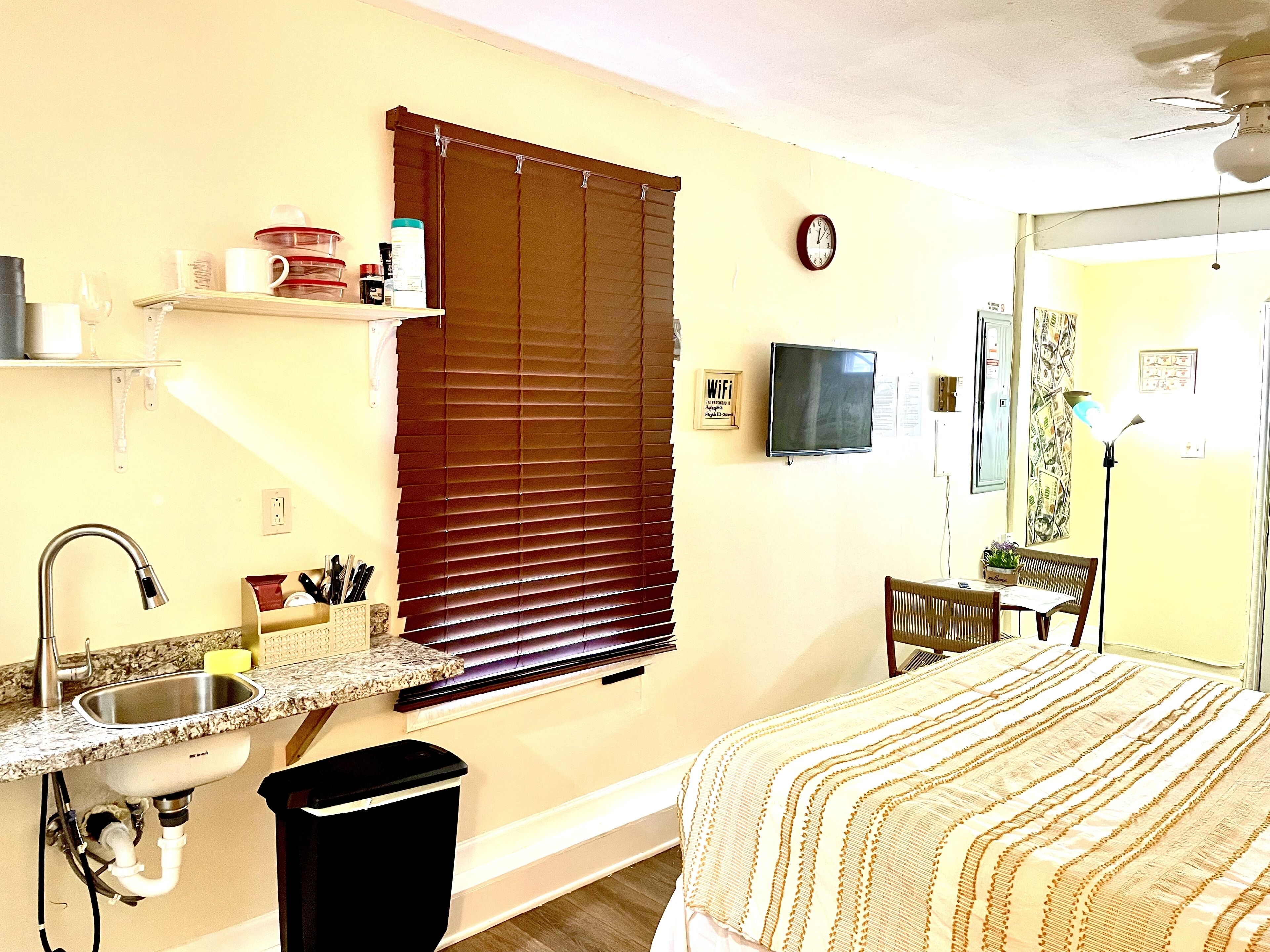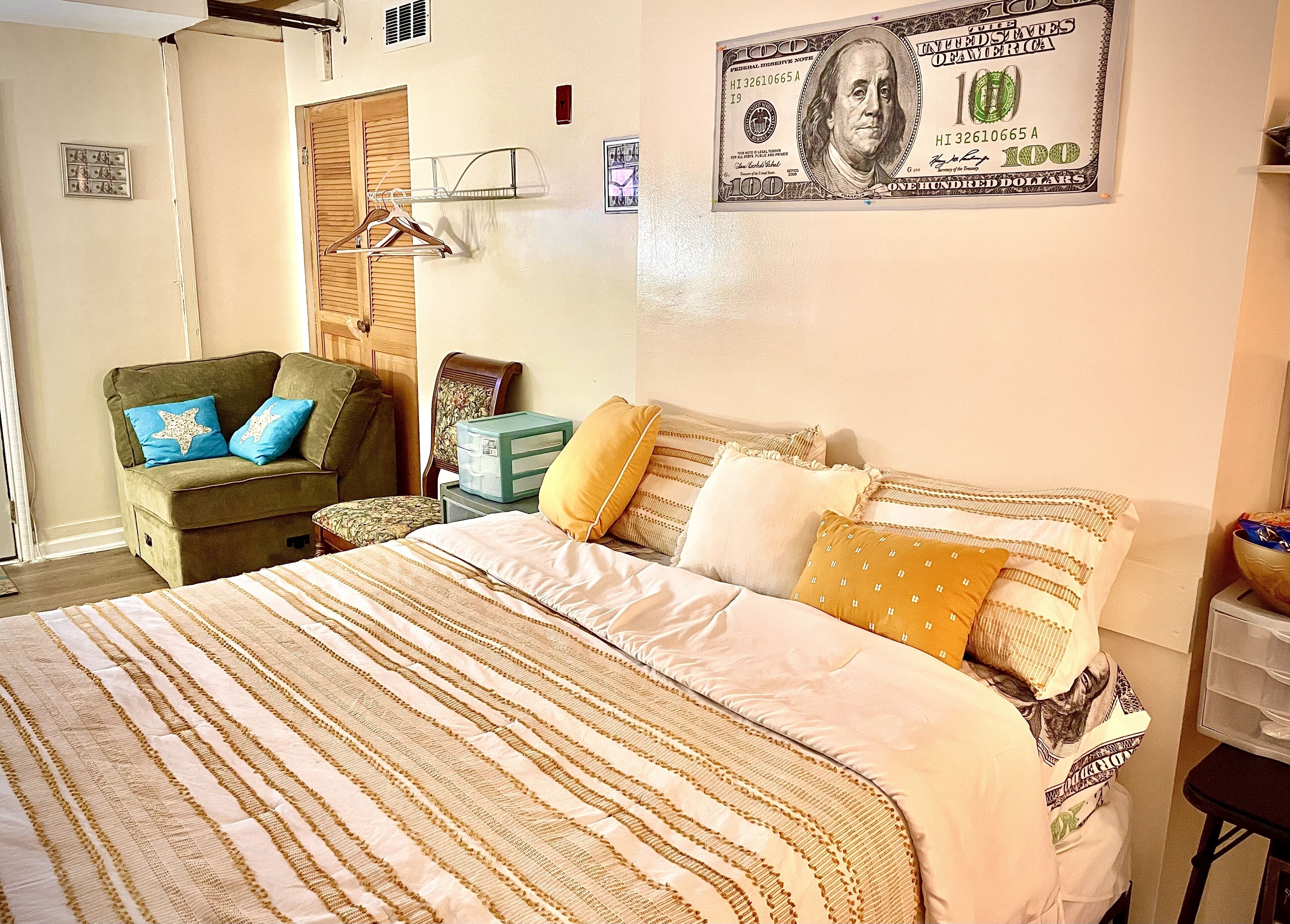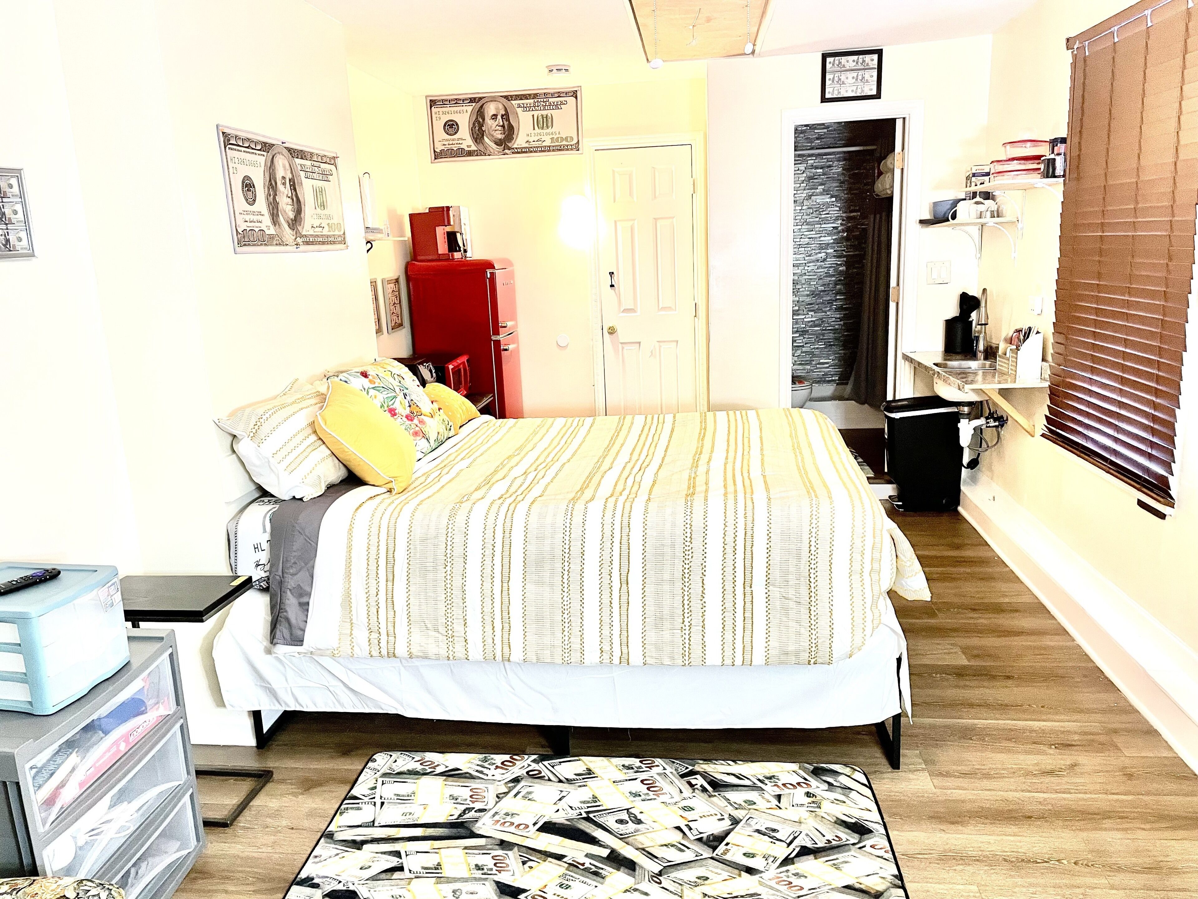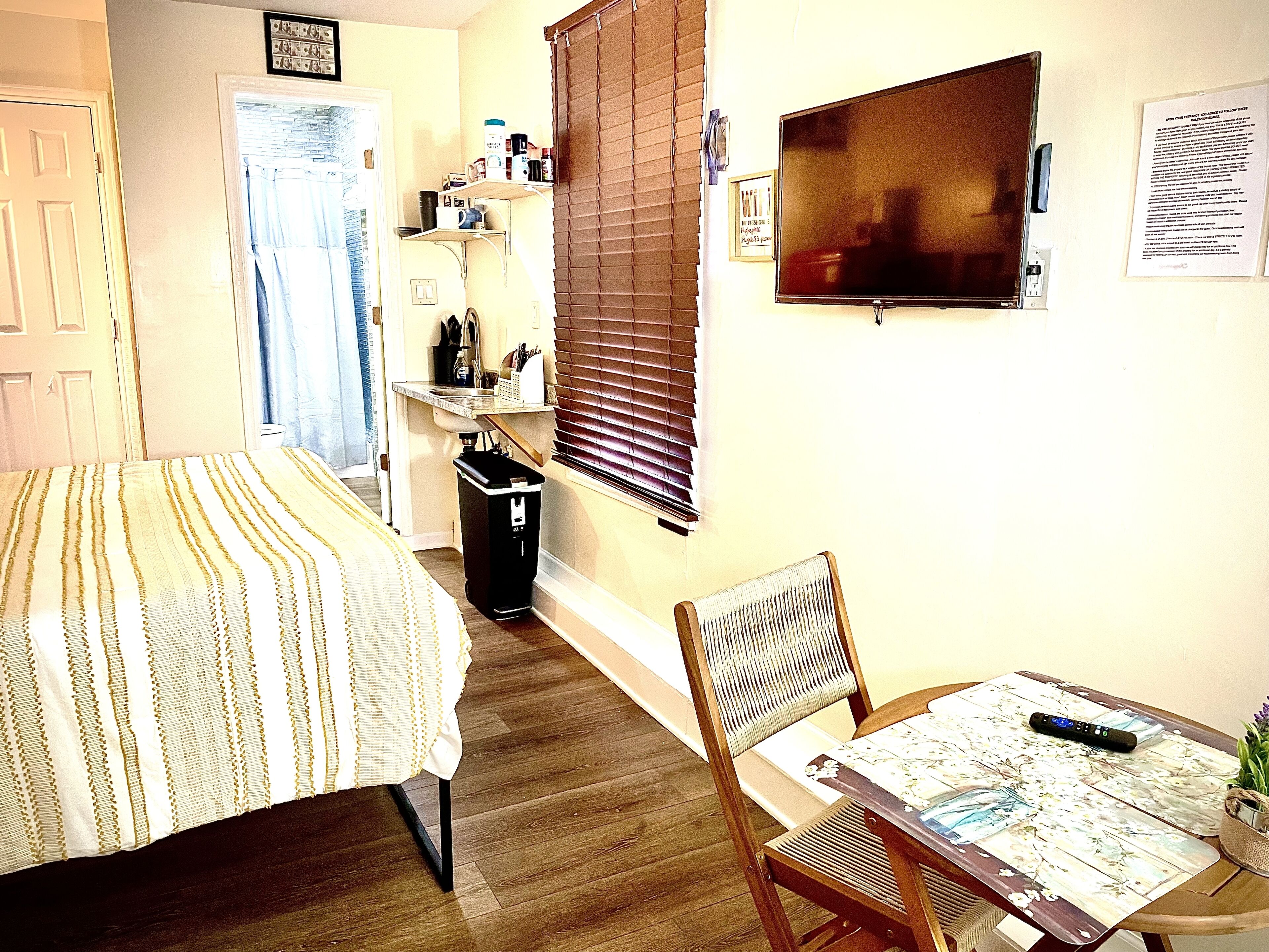The Money House Welcome to the Money house! The energy of money is everywhere in this quiet studio apartment with full bathroom, kitchenette (Air-fryer, microwave full-size refrigerator, all kitchen utensils), sleep in area, sitting area, Roku TV and Wi-Fi/Internet access. Enjoy the backyard and use of grill. Please note that smoking or vaping is NOT permitted within the apartment. You may smoke...