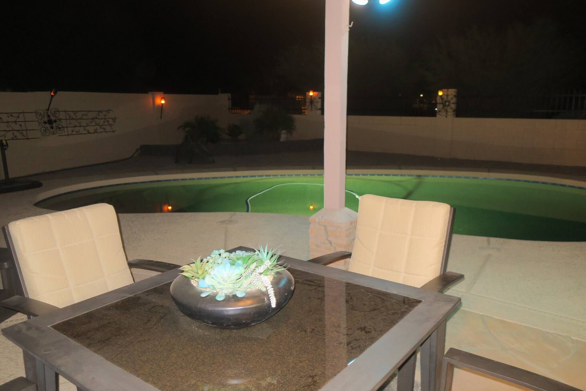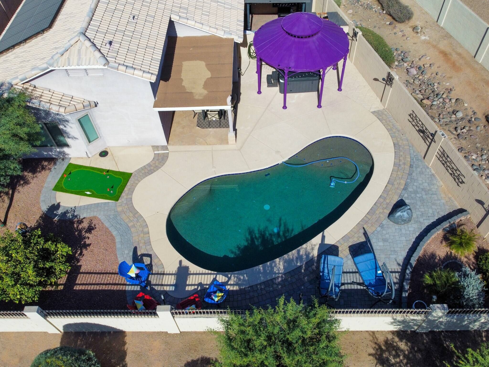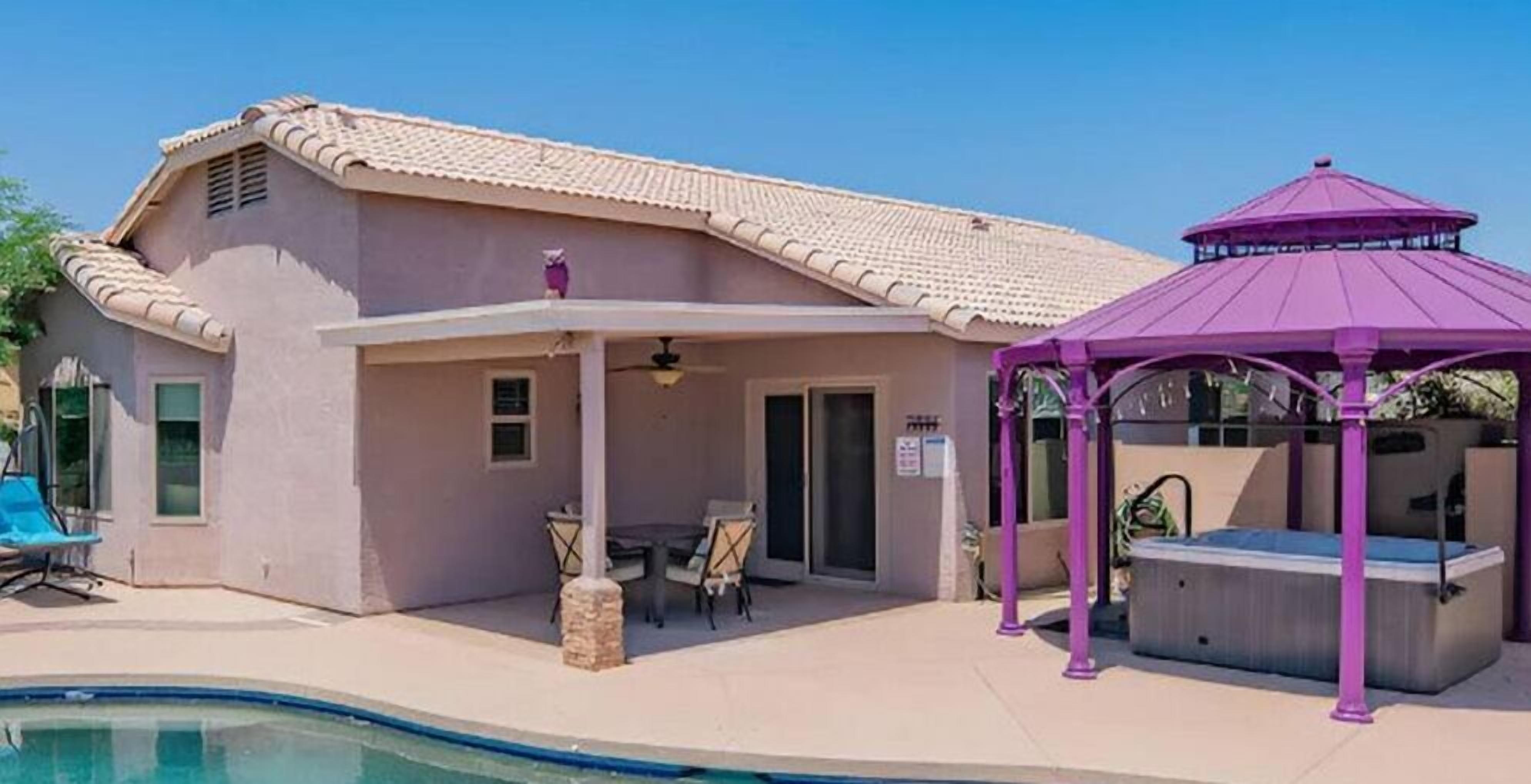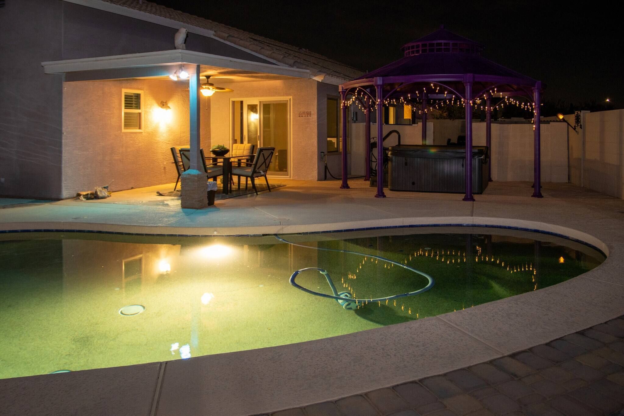 Chic Villa - Pool/hot Tub/hammock/king Bed/wi-fi Rental basis: Entire house or apartmentNumber of bedrooms: 3; Number of other rooms with beds: 0Number of bathrooms: 2Come and enjoy the best Casa Grande has to offer! Combining an excellent location, impeccable outdoor area and a spacious interior with an elegant appeal, we have designed a sophisticated holiday spot for you, your family and friends to fully enjoy.Sedate charm, ample space, classic style and bespoke amenities in one plate of flavors will reveal the beauty of the Southern hospitality offered with gracious warmth to everyone.You're welcome!Discover an irresistible value and elevate your vacation experience with StayShores, our premier vacation company, offering the best rates and availability for an unforgettable getaway.An hour drive from both Tucson and Phoenix and 30 min. from upscale Scottsdale, this calm oasis is located in picturesque Casa Grande town, only a 15-minute drive to the center and 10 min. to Dave White Golf Course.Outside, the sights and sounds of the verdant garden with a private swimming pool, 300 Gallon - 6 seater Hot Tub with 51 Jets, greenbelt next to the house, loungers, extended patio, pergola cover and grill area seek to meet the value and the volume of an ultimate holiday spot to host effectively every member of your group.Stepping inside, the house enchants with a smart design, soothes with toned and calm space, and features thoughtful decor, ensuring pleasing sights are also to be had within.Three bedrooms, two bathrooms, a kitchen, a laundry room with a washer & dryer, central Ac and heat, well all the technology you’ll need to support You during your stay with us. ♦Living essentials: Iron & ironing board, clothes hangers for each closet, trash can in each room. Free toiletries, towels and pool towels, linen, two garage spaces.♦Family amenities: High-chair, Pack 'n Play. ♦ Kitchen / Dining AreaA practical and fully equipped kitchen offers everything to try on some of the local dishes, make your own, or your first, Chimichanga. Open space flows to the dining area with a seating arrangement for six people and views on the picturesque garden that graces this lovely area. Store a bottle of local Dos Cabezas Aguileon at full-height fridge freezer and enjoy it indoors or outdoors at the poolside dining, a perfect scene to indulge in your prepared delicacies. Over at the kitchen, marble countertops and wood accents prevail with top-of-the-line appliances, a countertop doubling as a breakfast bar, a dishwasher, an oven, slow cooker, Keurig, kettle and toaster. Dole out pre-stocked glassware and dinnerware and get ready for an Arizona feast!♦ Living RoomSink into the sofa in the large living room proud of its fine collection of thoughtful touches, clean lines, neutral notes with a spark of lively orange as the centerpiece of this design.Plenty of seating options; whether you choose to glance at the 65-inch Smart Android TV, gather over a chat, play board games, enjoy quiet time alone contemplating tomorrow’s itinerary, or simply relax and hashtag the best photos of the day.♦ Bedrooms You'll be in the lap of comfort the entire time in our tastefully decorated three bedrooms, generously proportioned with plenty of space and wardrobe space. The master bedroom has a king-size bed with a memory foam Bedstory mattress, and a 50" TV, a Victorian-style armchair and a leg rest. Extending further is a living area with a sofa-bed for additional two people that easily converts back, freeing up space again.The second bedroom in soft tones and textures is tastefully appointed with a queen-size bed and Hybrid / Pressure Relief / Pocket Innersprings for Motion Isolation Zinus mattress that will provide undisturbed restorative sleep.The third bedroom with two single beds, each with a Twin Hybrid - Bamboo Charcoal and Aloe Vera Infused Memory Foam Lucid mattress, is white & blue harmony well suited for the children.There is a pullout queen bed under the sofa that can sleep another 2 people. ♦ BathroomsFollowing the style throughout the house, two indulgent bathrooms are clean and fresh with plenty of space to get ready for Your ventures of the day.The En-Suite bathroom in the master bedroom is equipped with a shower, a vanity area, providing all the amenities, free toiletries, towels and pool towels.The second Jack & Jill bathroom, in subtle earth tones, is equipped with a bathtub and a shower should you opt-in for a relaxing bubble bath. ♦ Outdoor areaThe outdoor area is the centerpiece of this villa. Set amidst a lovely garden, enhanced by a unique, large greenbelt extending at the backyard. Here you'll find an eclectic collection of nothing less than a private 12,000 Gallon swimming pool, sun loungers and a covered patio. Chic cocktail evenings or beloved barbecue nights, lazy poolside afternoon or fun splashing, active or relaxed, the choices are numerous are all yours to make.Update 9/18/22We have added the following amenities:✔ Level 2 Ev Charger✔ Safe for your Valuables✔Hammock for 2!✔baby Monitor✔ Child Safety Gate to the Pool Area✔ Standing Fan for those that like to sleep with one!Please Note: The Pool is not heated. The best time to make use of the Pool is between the months of April and November. During November and April feel free to relax in our Delicious Hot Tub. Replete with Mood Lighting, 51 Neck, Shoulder, Calf & Foot Jets you are sure to get that much-needed relaxation!It’s all yours! You will have the whole house to yourself. Indoors and outdoors and two garage spaces.Please note this is a self-check-in property, but we are a phone call or a message away if you need us and will fully support you during your stay with any questions you may have.Getting around is easily done on foot. Should you like to explore further a car is mandatory. Walk Score 40Please Note: The Pool is not heated. The best time to make use of the Pool is between the months of April and November.