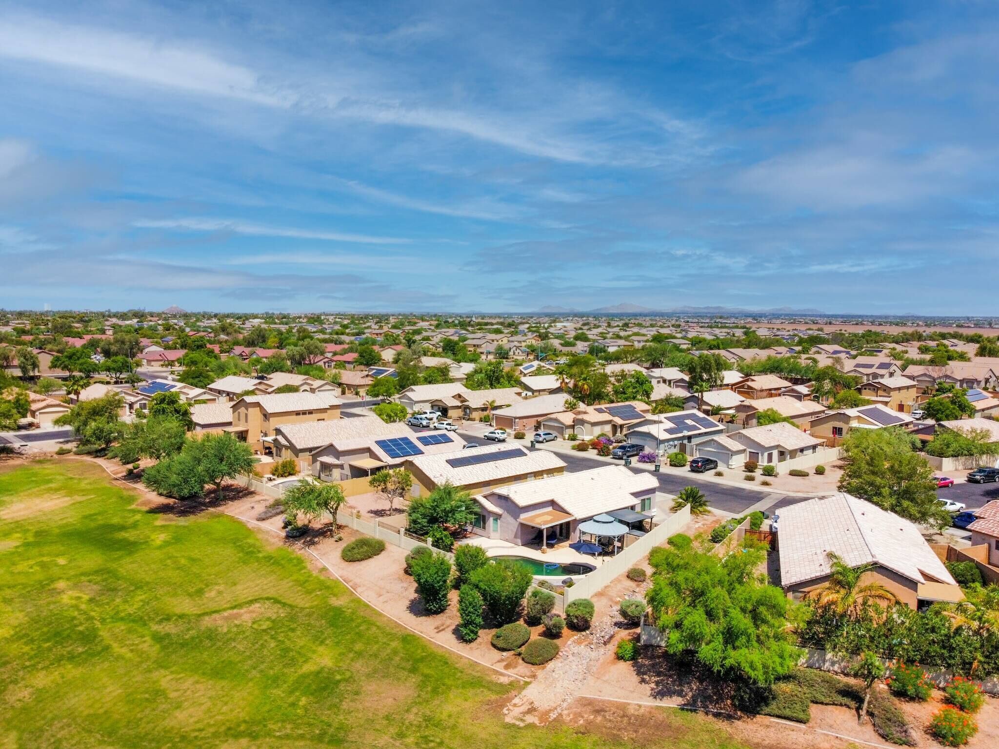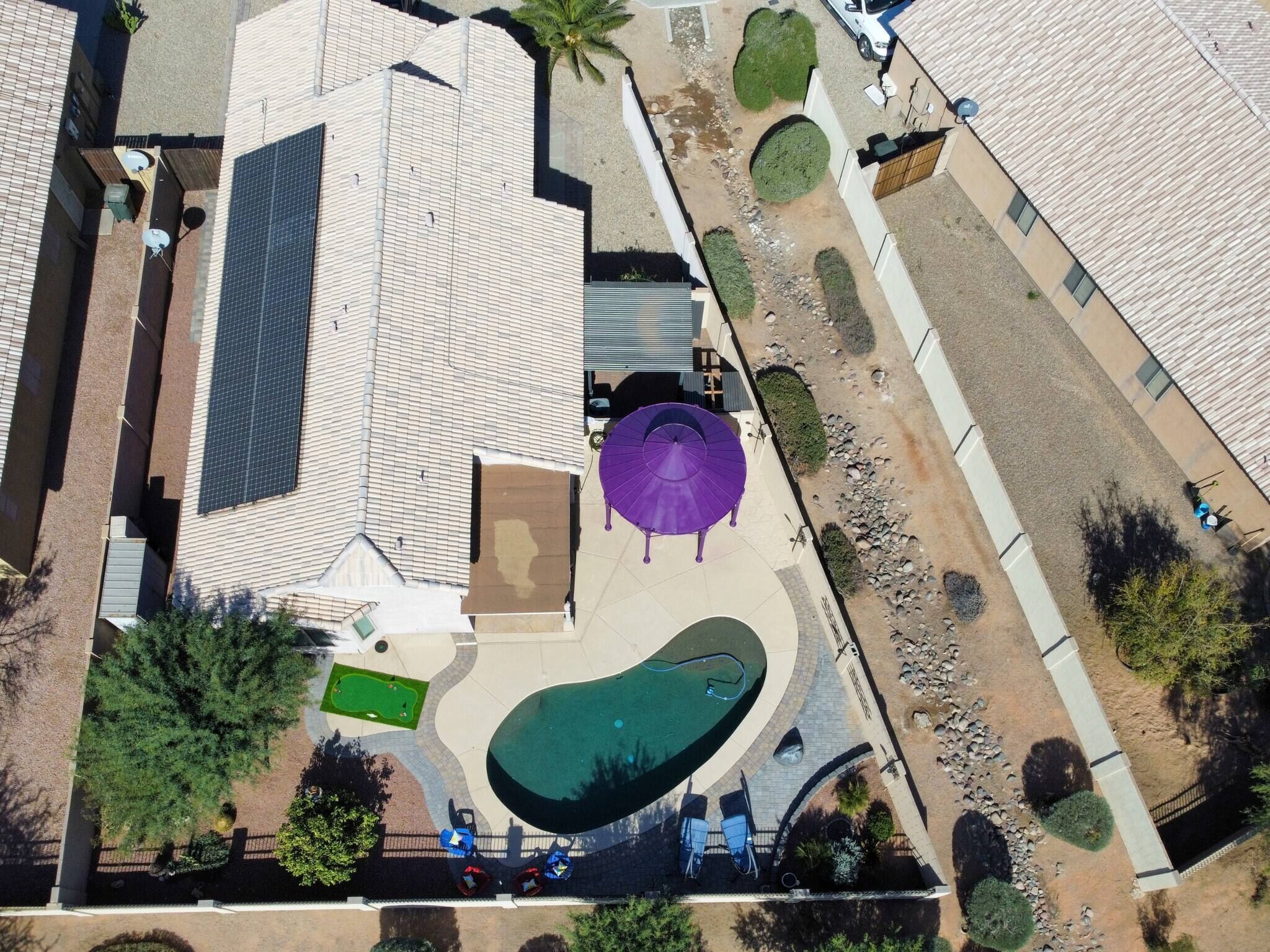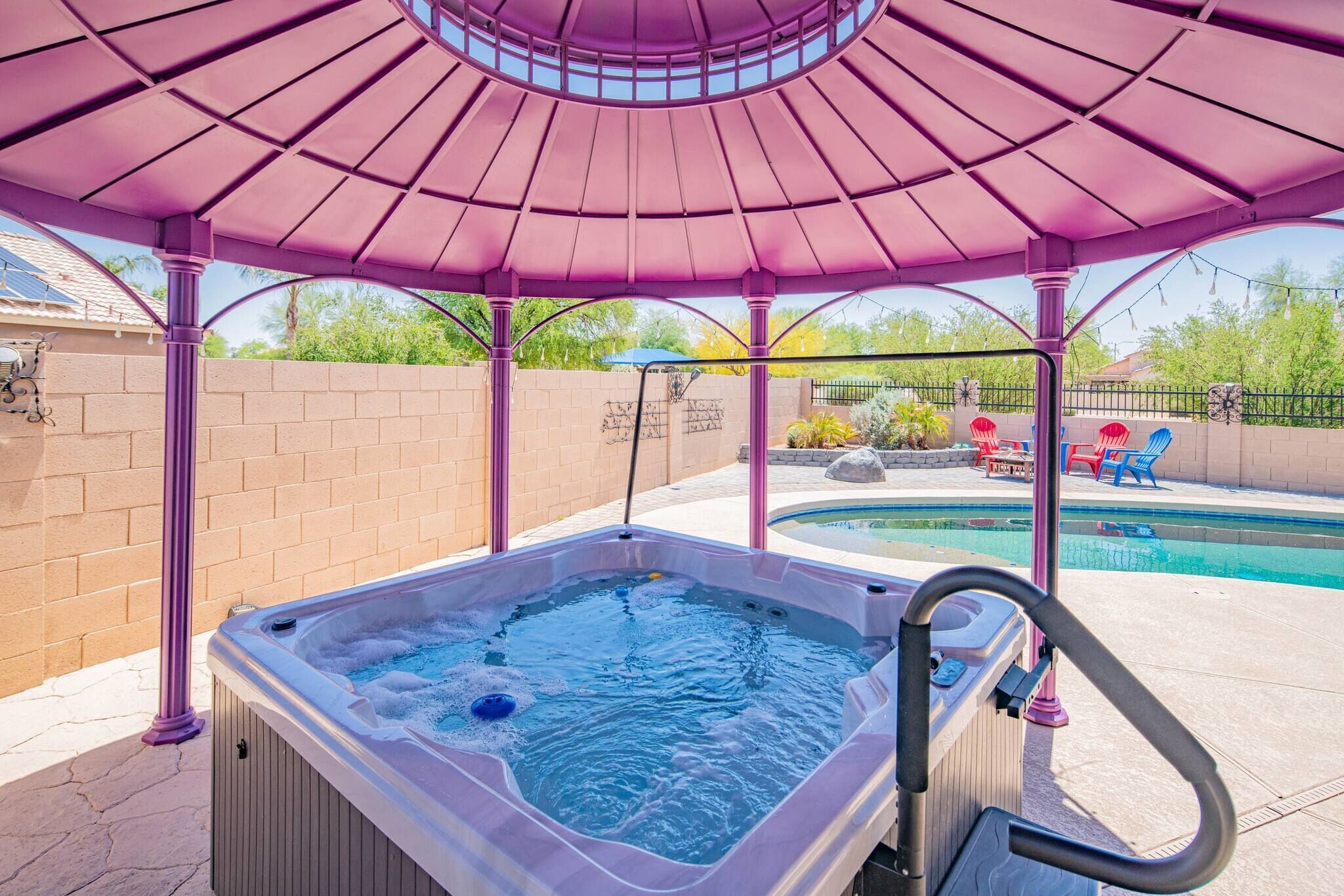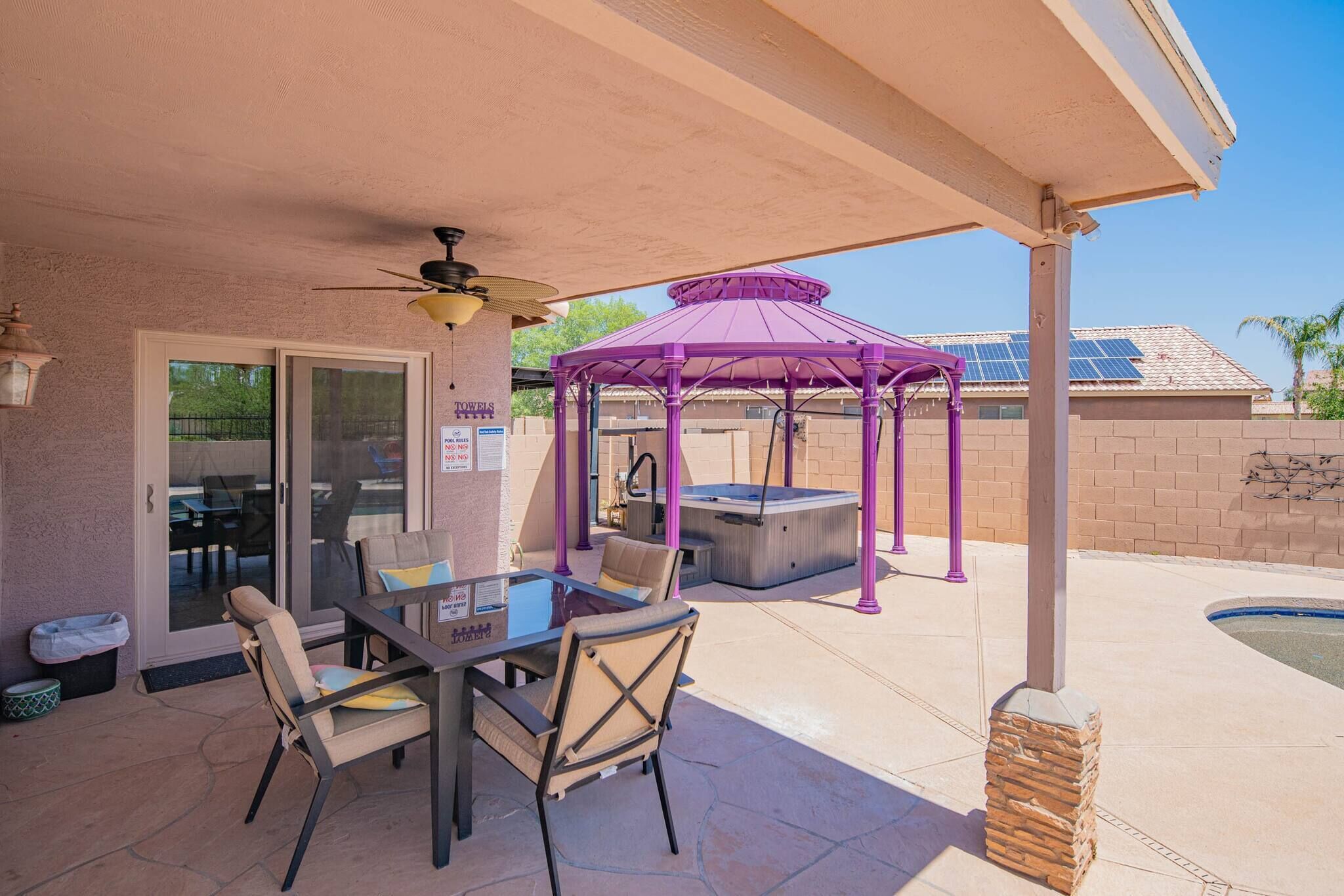 Chic Villa - Pool/hot Tub/hammock/king Bed/wi-fi Rental basis: Entire house or apartmentNumber of bedrooms: 3; Number of other rooms with beds: 0Number of bathrooms: 2Come and enjoy the best Casa Grande has to offer! Combining an excellent location, impeccable outdoor area and a spacious interior with an elegant appeal, we have designed a sophisticated holiday spot for you, your family and friends to fully enjoy.Sedate charm, ample space, classic style and bespoke amenities in one plate of flavors will reveal the beauty of the Southern hospitality offered with gracious warmth to everyone.You're welcome!Discover an irresistible value and elevate your vacation experience with StayShores, our premier vacation company, offering the best rates and availability for an unforgettable getaway.An hour drive from both Tucson and Phoenix and 30 min. from upscale Scottsdale, this calm oasis is located in picturesque Casa Grande town, only a 15-minute drive to the center and 10 min. to Dave White Golf Course.Outside, the sights and sounds of the verdant garden with a private swimming pool, 300 Gallon - 6 seater Hot Tub with 51 Jets, greenbelt next to the house, loungers, extended patio, pergola cover and grill area seek to meet the value and the volume of an ultimate holiday spot to host effectively every member of your group.Stepping inside, the house enchants with a smart design, soothes with toned and calm space, and features thoughtful decor, ensuring pleasing sights are also to be had within.Three bedrooms, two bathrooms, a kitchen, a laundry room with a washer & dryer, central Ac and heat, well all the technology you’ll need to support You during your stay with us. ♦Living essentials: Iron & ironing board, clothes hangers for each closet, trash can in each room. Free toiletries, towels and pool towels, linen, two garage spaces.♦Family amenities: High-chair, Pack 'n Play. ♦ Kitchen / Dining AreaA practical and fully equipped kitchen offers everything to try on some of the local dishes, make your own, or your first, Chimichanga. Open space flows to the dining area with a seating arrangement for six people and views on the picturesque garden that graces this lovely area. Store a bottle of local Dos Cabezas Aguileon at full-height fridge freezer and enjoy it indoors or outdoors at the poolside dining, a perfect scene to indulge in your prepared delicacies. Over at the kitchen, marble countertops and wood accents prevail with top-of-the-line appliances, a countertop doubling as a breakfast bar, a dishwasher, an oven, slow cooker, Keurig, kettle and toaster. Dole out pre-stocked glassware and dinnerware and get ready for an Arizona feast!♦ Living RoomSink into the sofa in the large living room proud of its fine collection of thoughtful touches, clean lines, neutral notes with a spark of lively orange as the centerpiece of this design.Plenty of seating options; whether you choose to glance at the 65-inch Smart Android TV, gather over a chat, play board games, enjoy quiet time alone contemplating tomorrow’s itinerary, or simply relax and hashtag the best photos of the day.♦ Bedrooms You'll be in the lap of comfort the entire time in our tastefully decorated three bedrooms, generously proportioned with plenty of space and wardrobe space. The master bedroom has a king-size bed with a memory foam Bedstory mattress, and a 50" TV, a Victorian-style armchair and a leg rest. Extending further is a living area with a sofa-bed for additional two people that easily converts back, freeing up space again.The second bedroom in soft tones and textures is tastefully appointed with a queen-size bed and Hybrid / Pressure Relief / Pocket Innersprings for Motion Isolation Zinus mattress that will provide undisturbed restorative sleep.The third bedroom with two single beds, each with a Twin Hybrid - Bamboo Charcoal and Aloe Vera Infused Memory Foam Lucid mattress, is white & blue harmony well suited for the children.There is a pullout queen bed under the sofa that can sleep another 2 people. ♦ BathroomsFollowing the style throughout the house, two indulgent bathrooms are clean and fresh with plenty of space to get ready for Your ventures of the day.The En-Suite bathroom in the master bedroom is equipped with a shower, a vanity area, providing all the amenities, free toiletries, towels and pool towels.The second Jack & Jill bathroom, in subtle earth tones, is equipped with a bathtub and a shower should you opt-in for a relaxing bubble bath. ♦ Outdoor areaThe outdoor area is the centerpiece of this villa. Set amidst a lovely garden, enhanced by a unique, large greenbelt extending at the backyard. Here you'll find an eclectic collection of nothing less than a private 12,000 Gallon swimming pool, sun loungers and a covered patio. Chic cocktail evenings or beloved barbecue nights, lazy poolside afternoon or fun splashing, active or relaxed, the choices are numerous are all yours to make.Update 9/18/22We have added the following amenities:✔ Level 2 Ev Charger✔ Safe for your Valuables✔Hammock for 2!✔baby Monitor✔ Child Safety Gate to the Pool Area✔ Standing Fan for those that like to sleep with one!Please Note: The Pool is not heated. The best time to make use of the Pool is between the months of April and November. During November and April feel free to relax in our Delicious Hot Tub. Replete with Mood Lighting, 51 Neck, Shoulder, Calf & Foot Jets you are sure to get that much-needed relaxation!It’s all yours! You will have the whole house to yourself. Indoors and outdoors and two garage spaces.Please note this is a self-check-in property, but we are a phone call or a message away if you need us and will fully support you during your stay with any questions you may have.Getting around is easily done on foot. Should you like to explore further a car is mandatory. Walk Score 40Please Note: The Pool is not heated. The best time to make use of the Pool is between the months of April and November.