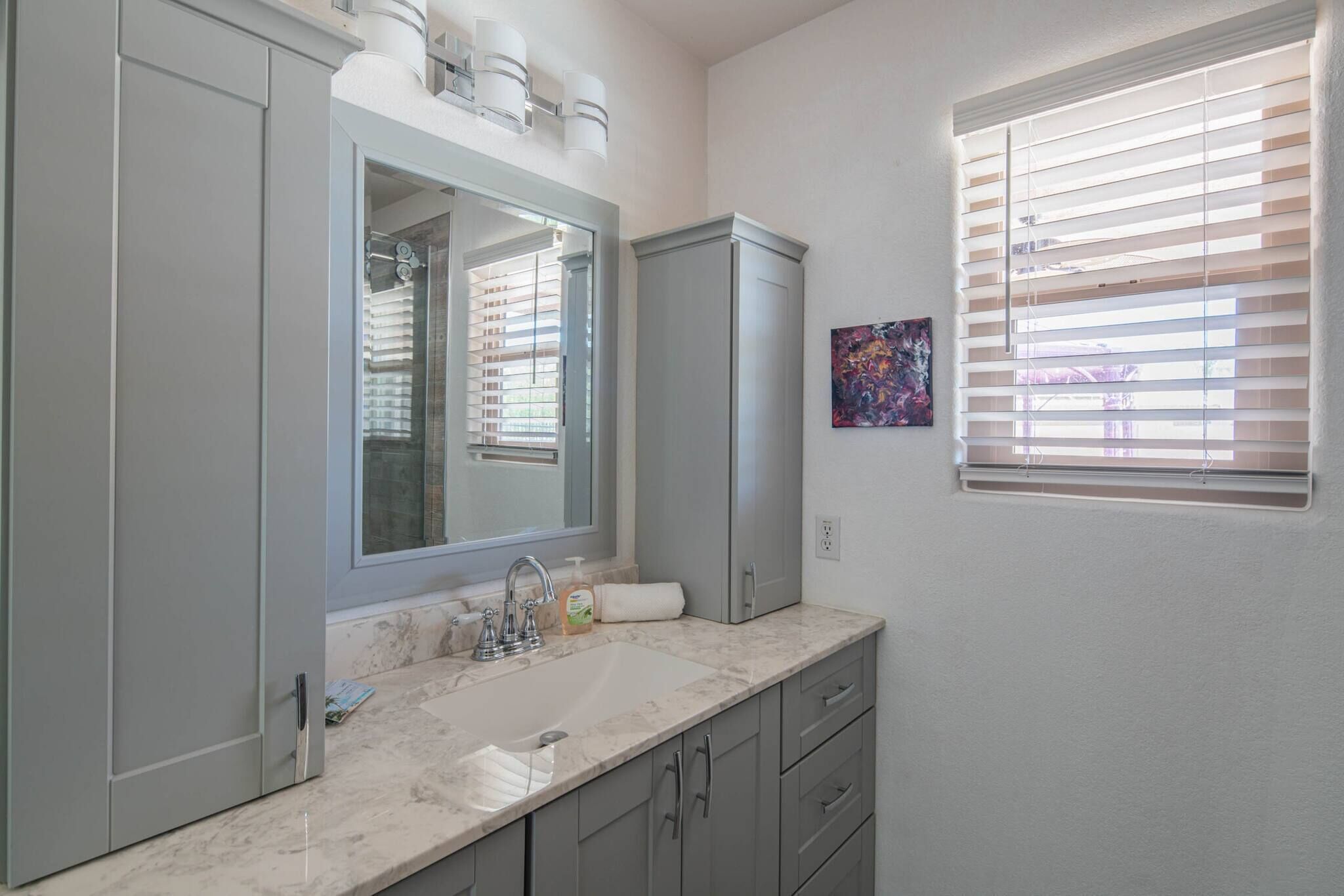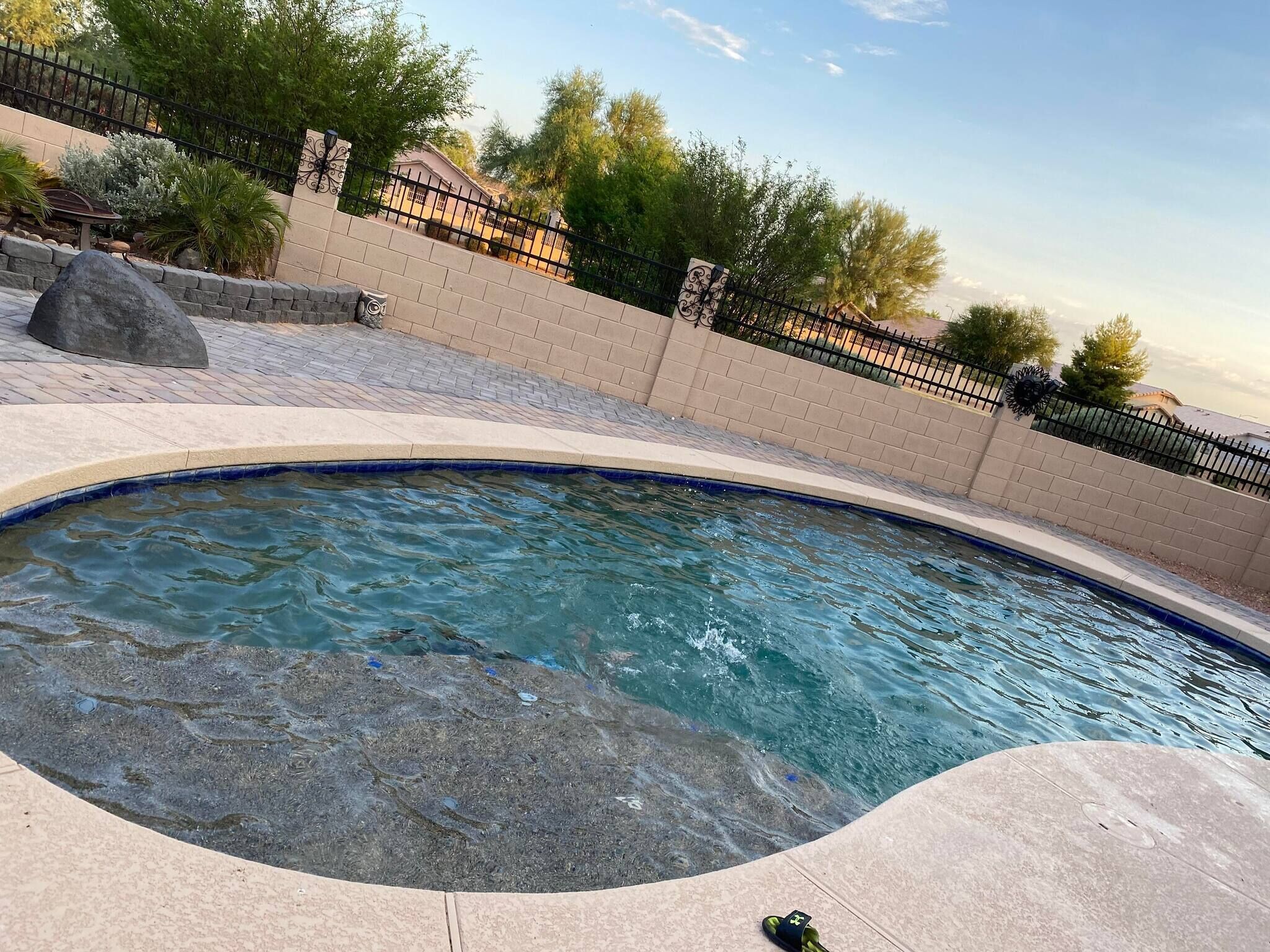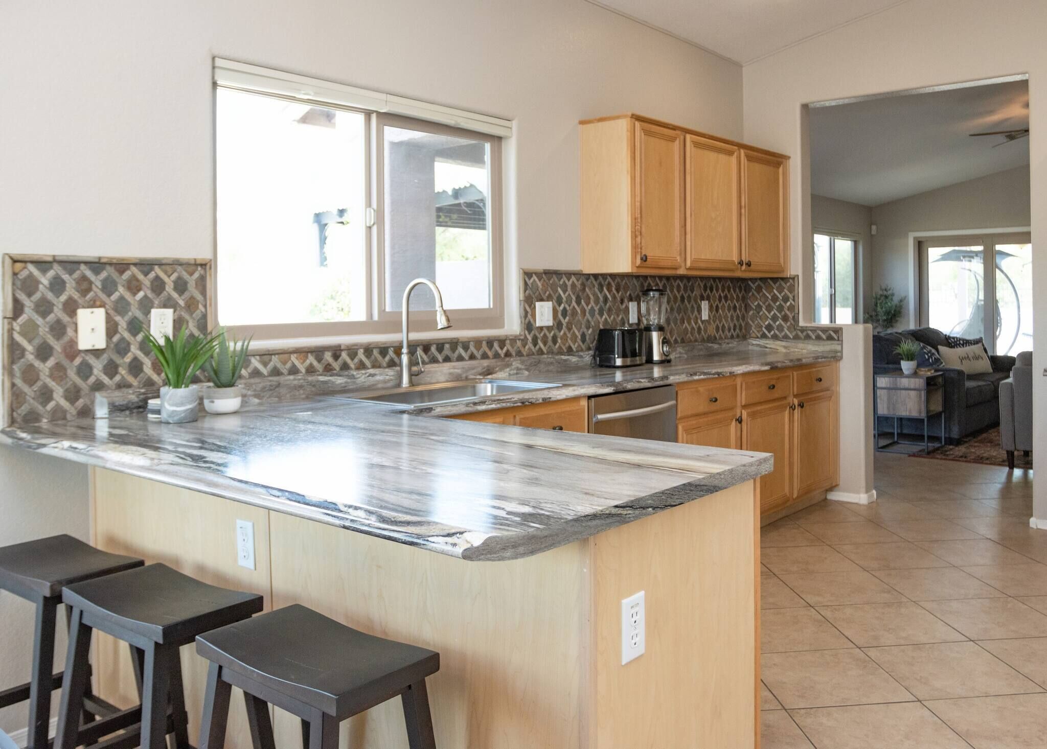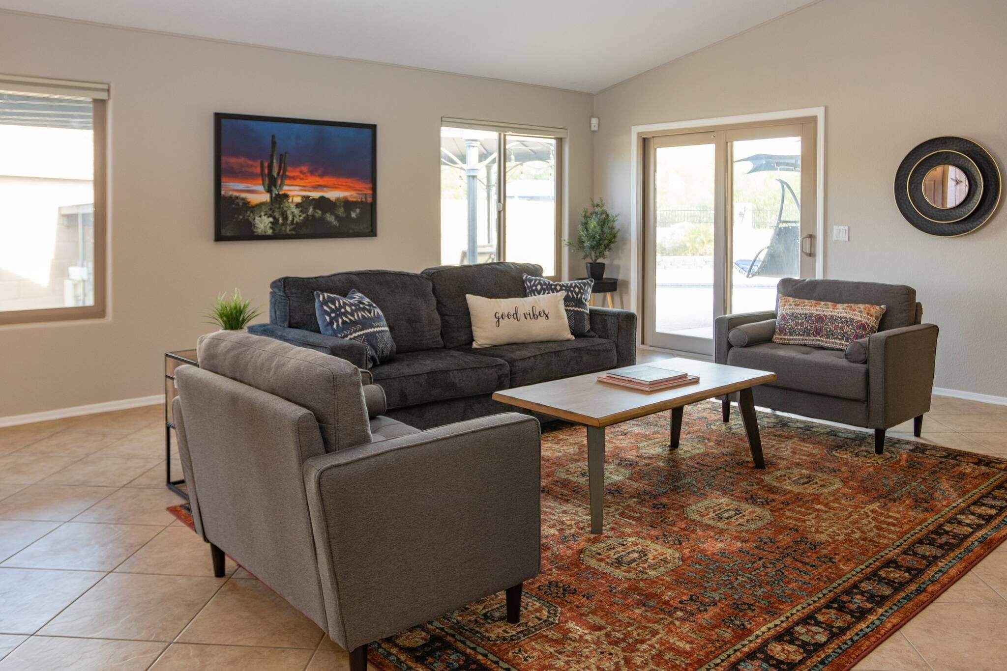 Chic Villa - Pool/hot Tub/hammock/king Bed/wi-fi Rental basis: Entire house or apartmentNumber of bedrooms: 3; Number of other rooms with beds: 0Number of bathrooms: 2Come and enjoy the best Casa Grande has to offer! Combining an excellent location, impeccable outdoor area and a spacious interior with an elegant appeal, we have designed a sophisticated holiday spot for you, your family and friends to fully enjoy.Sedate charm, ample space, classic style and bespoke amenities in one plate of flavors will reveal the beauty of the Southern hospitality offered with gracious warmth to everyone.You're welcome!Discover an irresistible value and elevate your vacation experience with StayShores, our premier vacation company, offering the best rates and availability for an unforgettable getaway.An hour drive from both Tucson and Phoenix and 30 min. from upscale Scottsdale, this calm oasis is located in picturesque Casa Grande town, only a 15-minute drive to the center and 10 min. to Dave White Golf Course.Outside, the sights and sounds of the verdant garden with a private swimming pool, 300 Gallon - 6 seater Hot Tub with 51 Jets, greenbelt next to the house, loungers, extended patio, pergola cover and grill area seek to meet the value and the volume of an ultimate holiday spot to host effectively every member of your group.Stepping inside, the house enchants with a smart design, soothes with toned and calm space, and features thoughtful decor, ensuring pleasing sights are also to be had within.Three bedrooms, two bathrooms, a kitchen, a laundry room with a washer & dryer, central Ac and heat, well all the technology you’ll need to support You during your stay with us. ♦Living essentials: Iron & ironing board, clothes hangers for each closet, trash can in each room. Free toiletries, towels and pool towels, linen, two garage spaces.♦Family amenities: High-chair, Pack 'n Play. ♦ Kitchen / Dining AreaA practical and fully equipped kitchen offers everything to try on some of the local dishes, make your own, or your first, Chimichanga. Open space flows to the dining area with a seating arrangement for six people and views on the picturesque garden that graces this lovely area. Store a bottle of local Dos Cabezas Aguileon at full-height fridge freezer and enjoy it indoors or outdoors at the poolside dining, a perfect scene to indulge in your prepared delicacies. Over at the kitchen, marble countertops and wood accents prevail with top-of-the-line appliances, a countertop doubling as a breakfast bar, a dishwasher, an oven, slow cooker, Keurig, kettle and toaster. Dole out pre-stocked glassware and dinnerware and get ready for an Arizona feast!♦ Living RoomSink into the sofa in the large living room proud of its fine collection of thoughtful touches, clean lines, neutral notes with a spark of lively orange as the centerpiece of this design.Plenty of seating options; whether you choose to glance at the 65-inch Smart Android TV, gather over a chat, play board games, enjoy quiet time alone contemplating tomorrow’s itinerary, or simply relax and hashtag the best photos of the day.♦ Bedrooms You'll be in the lap of comfort the entire time in our tastefully decorated three bedrooms, generously proportioned with plenty of space and wardrobe space. The master bedroom has a king-size bed with a memory foam Bedstory mattress, and a 50" TV, a Victorian-style armchair and a leg rest. Extending further is a living area with a sofa-bed for additional two people that easily converts back, freeing up space again.The second bedroom in soft tones and textures is tastefully appointed with a queen-size bed and Hybrid / Pressure Relief / Pocket Innersprings for Motion Isolation Zinus mattress that will provide undisturbed restorative sleep.The third bedroom with two single beds, each with a Twin Hybrid - Bamboo Charcoal and Aloe Vera Infused Memory Foam Lucid mattress, is white & blue harmony well suited for the children.There is a pullout queen bed under the sofa that can sleep another 2 people. ♦ BathroomsFollowing the style throughout the house, two indulgent bathrooms are clean and fresh with plenty of space to get ready for Your ventures of the day.The En-Suite bathroom in the master bedroom is equipped with a shower, a vanity area, providing all the amenities, free toiletries, towels and pool towels.The second Jack & Jill bathroom, in subtle earth tones, is equipped with a bathtub and a shower should you opt-in for a relaxing bubble bath. ♦ Outdoor areaThe outdoor area is the centerpiece of this villa. Set amidst a lovely garden, enhanced by a unique, large greenbelt extending at the backyard. Here you'll find an eclectic collection of nothing less than a private 12,000 Gallon swimming pool, sun loungers and a covered patio. Chic cocktail evenings or beloved barbecue nights, lazy poolside afternoon or fun splashing, active or relaxed, the choices are numerous are all yours to make.Update 9/18/22We have added the following amenities:✔ Level 2 Ev Charger✔ Safe for your Valuables✔Hammock for 2!✔baby Monitor✔ Child Safety Gate to the Pool Area✔ Standing Fan for those that like to sleep with one!Please Note: The Pool is not heated. The best time to make use of the Pool is between the months of April and November. During November and April feel free to relax in our Delicious Hot Tub. Replete with Mood Lighting, 51 Neck, Shoulder, Calf & Foot Jets you are sure to get that much-needed relaxation!It’s all yours! You will have the whole house to yourself. Indoors and outdoors and two garage spaces.Please note this is a self-check-in property, but we are a phone call or a message away if you need us and will fully support you during your stay with any questions you may have.Getting around is easily done on foot. Should you like to explore further a car is mandatory. Walk Score 40Please Note: The Pool is not heated. The best time to make use of the Pool is between the months of April and November.